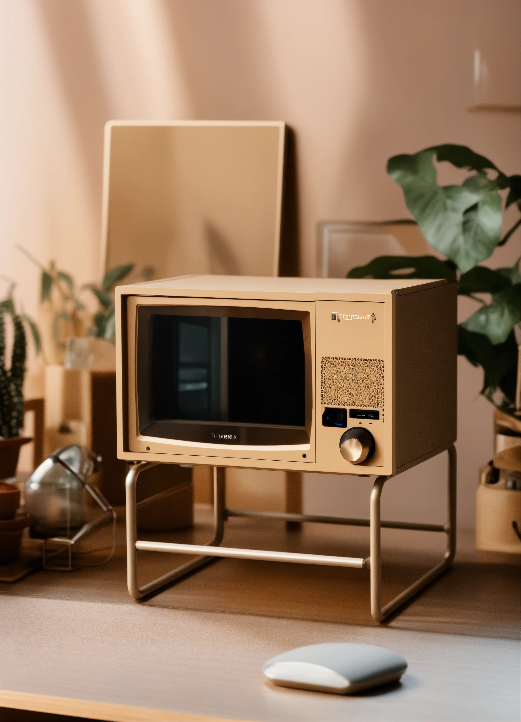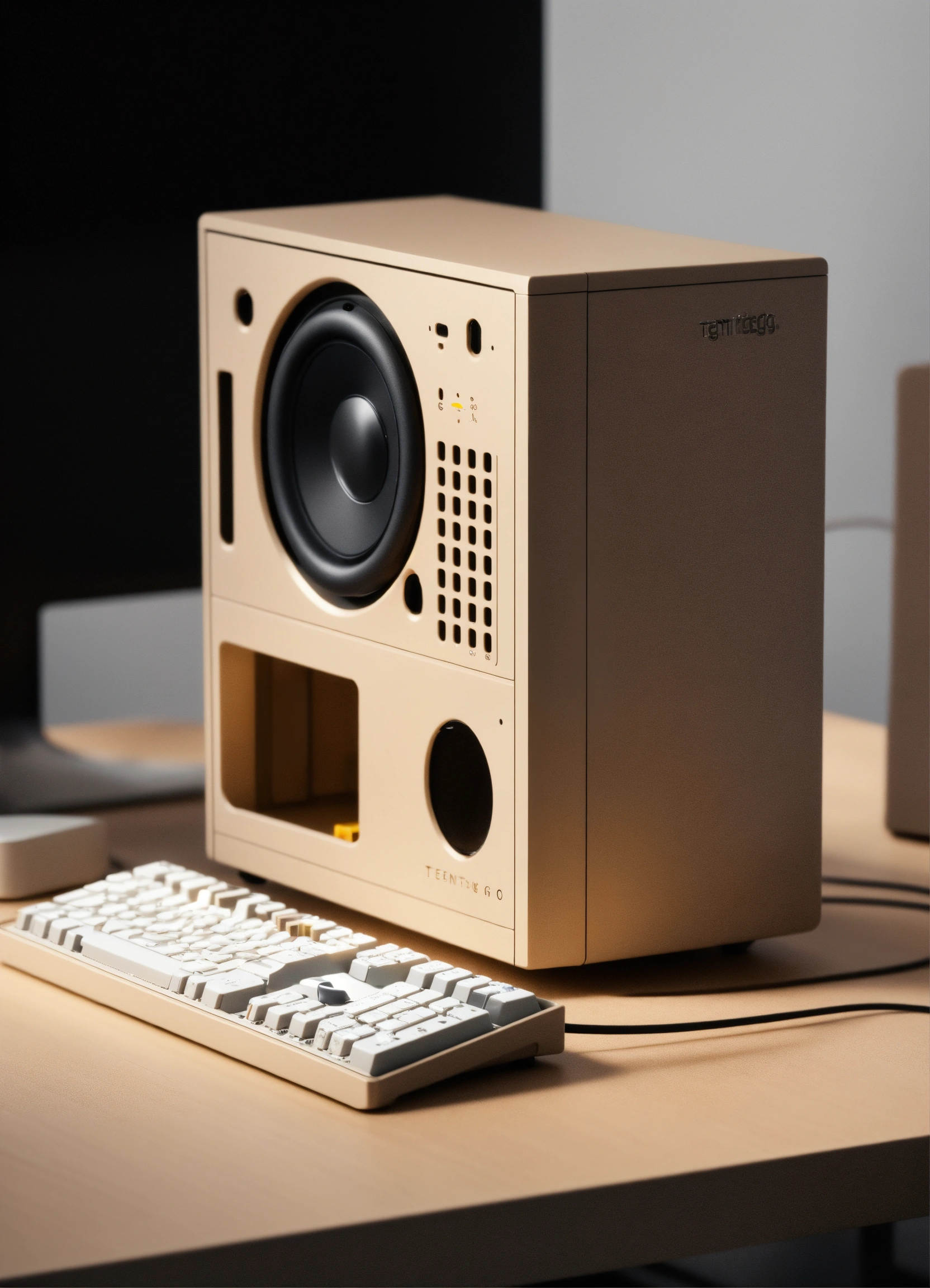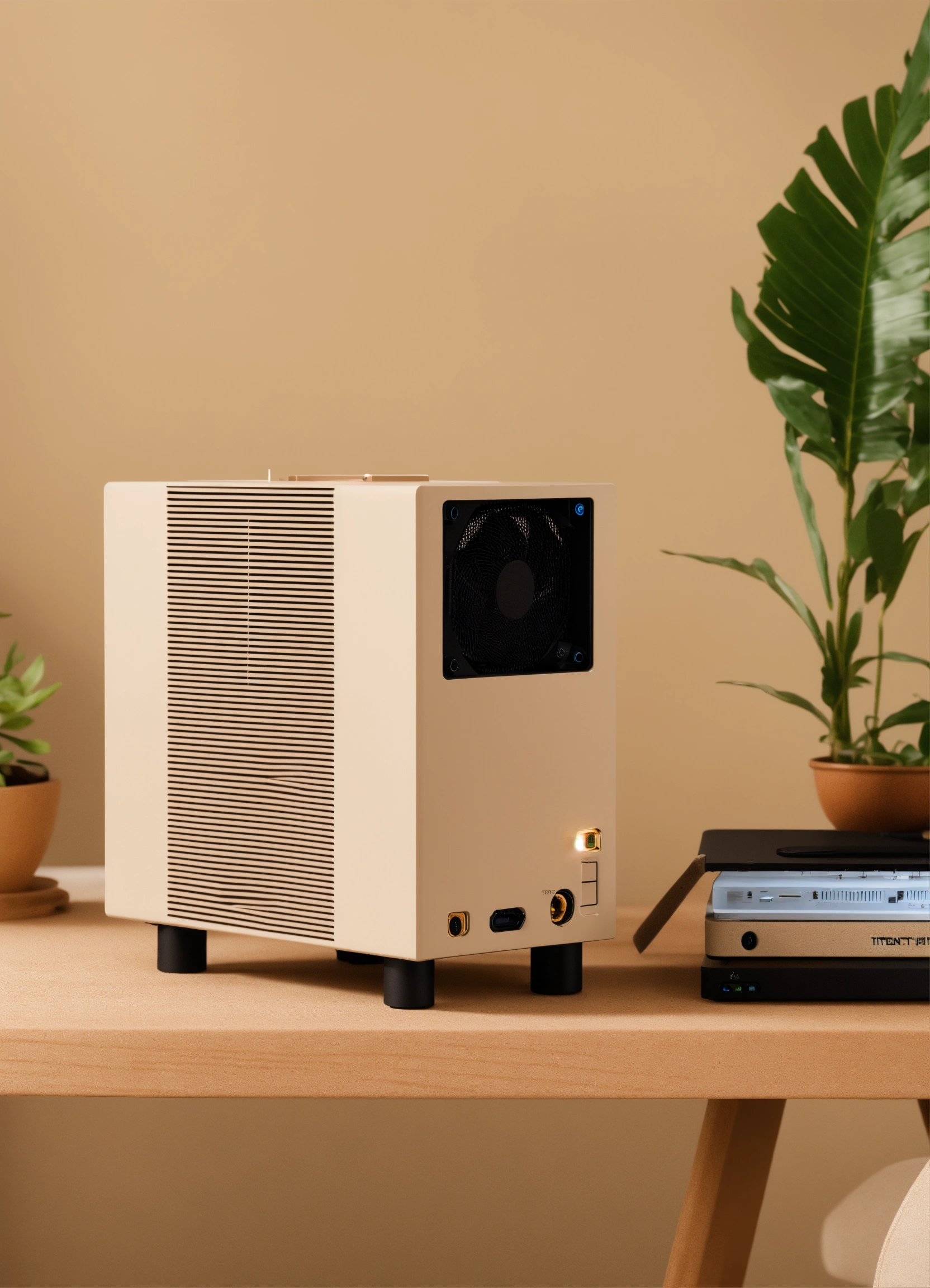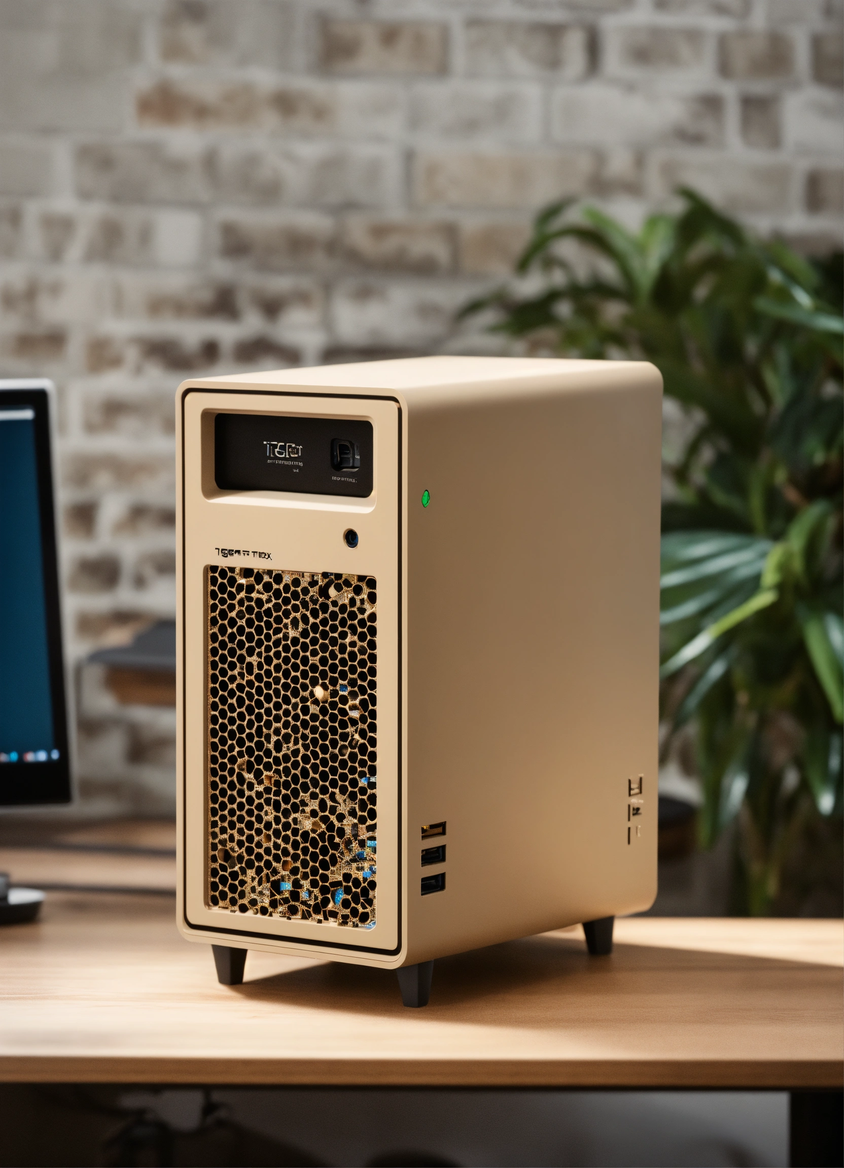 A stunning, minimalist beige micro itx case designed by teenage engineering. product ad retro. industrial design inspiration. unreal engine render, natural lighting, on desk, beautiful shot