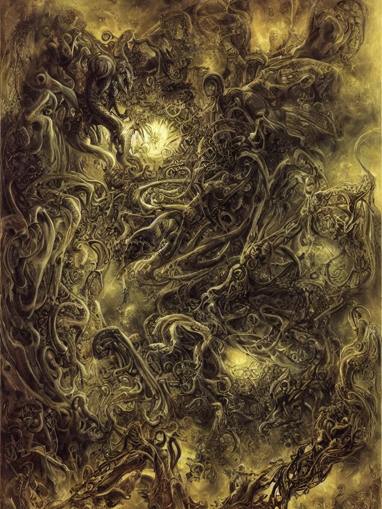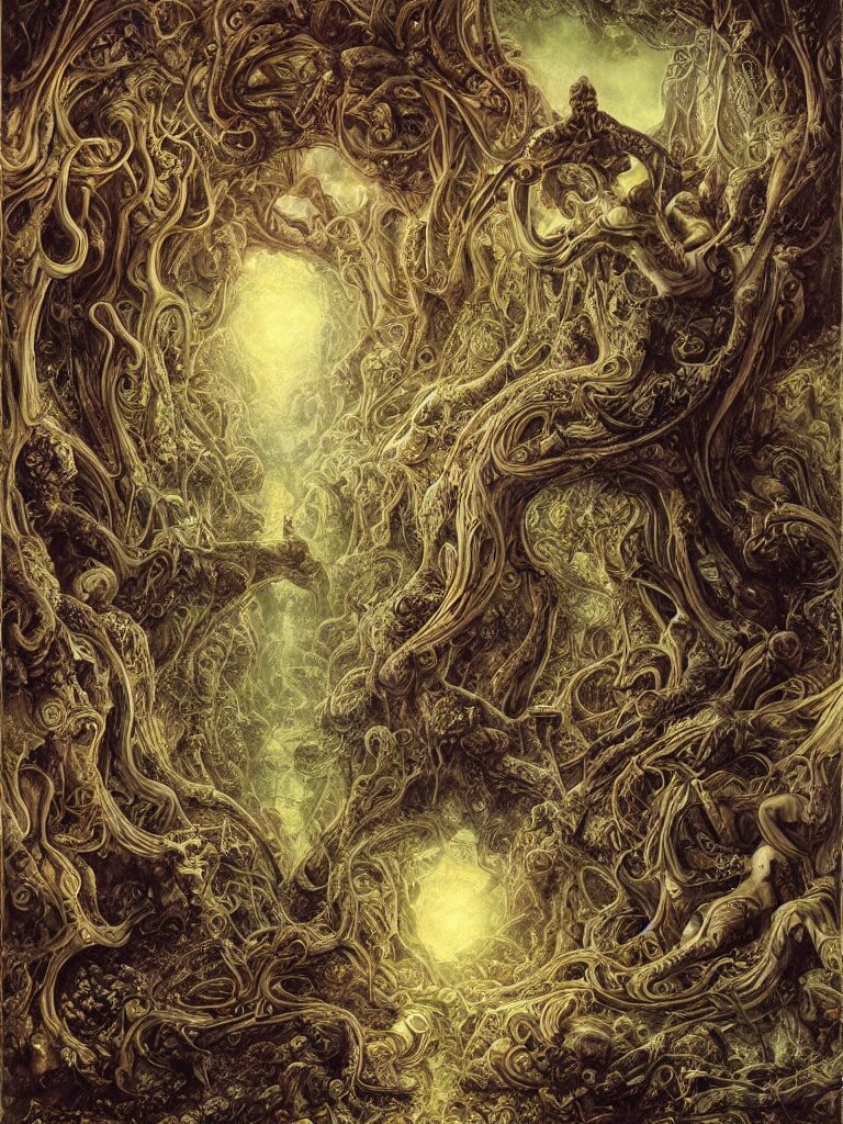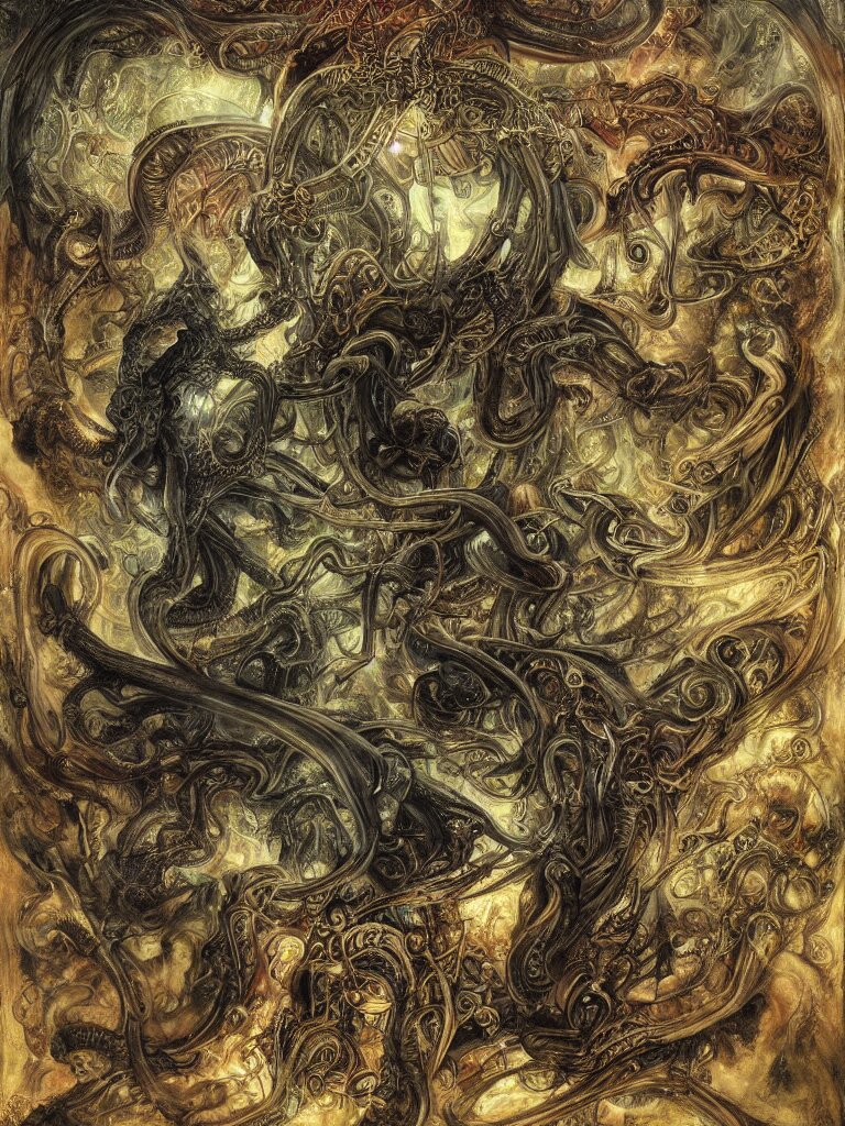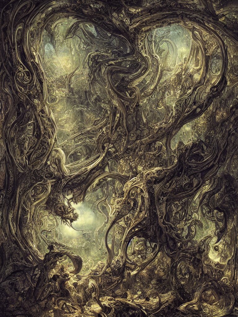Muscular eldritch radiating town fractal shimmering phantasm, by h. r. giger and esao andrews and maria sibylla merian eugene delacroix, gustave dore, thomas moran, pop art, chiaroscuro, biopunk, art nouveau