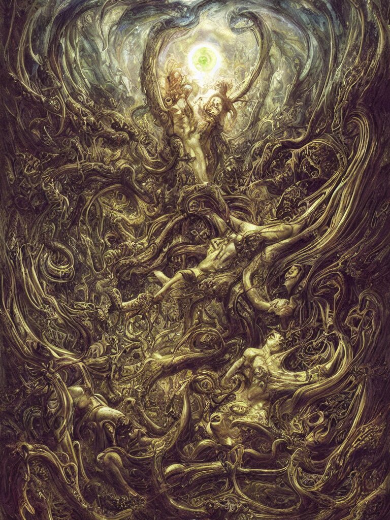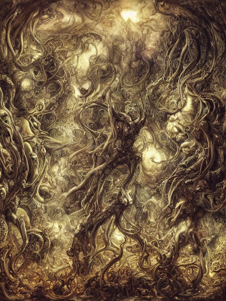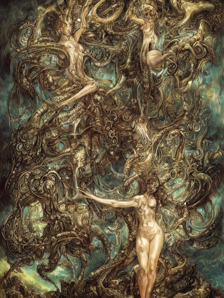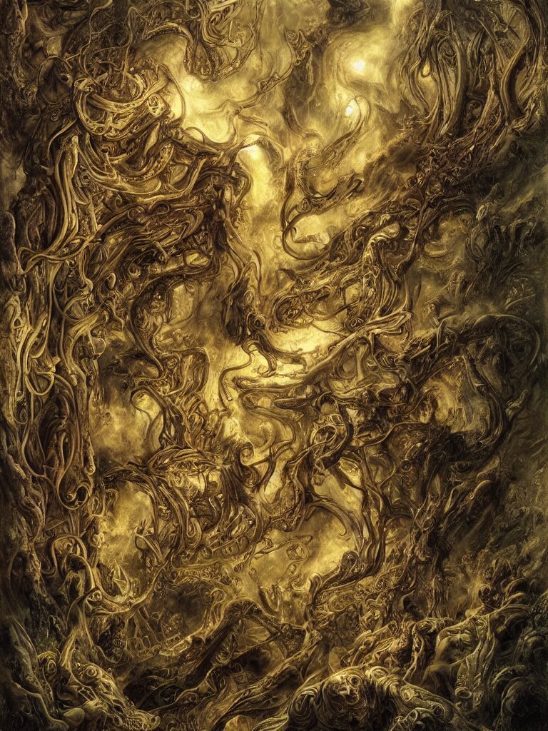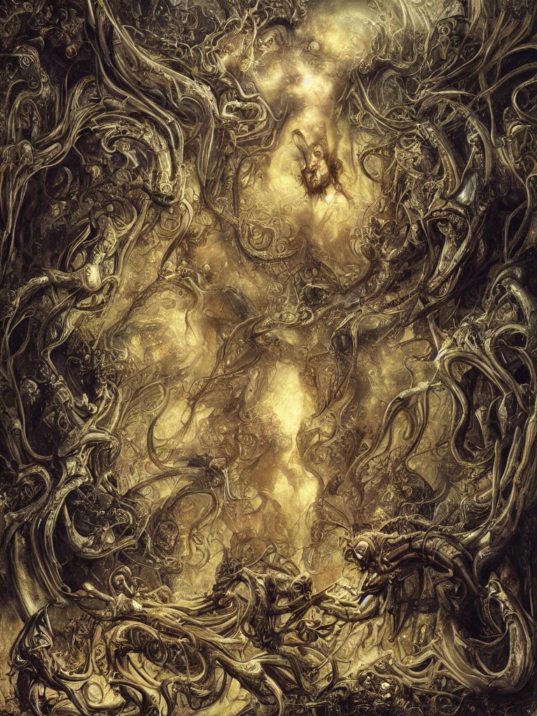 Muscular eldritch radiating town fractal shimmering phantasm, by h. r. giger and esao andrews and maria sibylla merian eugene delacroix, gustave dore, thomas moran, pop art, chiaroscuro, biopunk, art nouveau