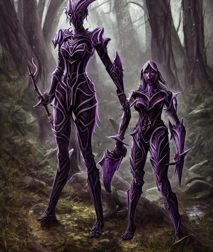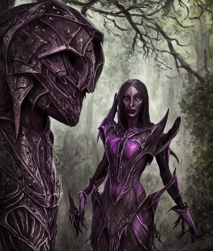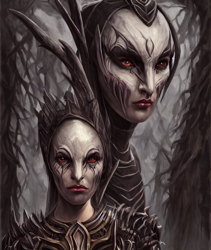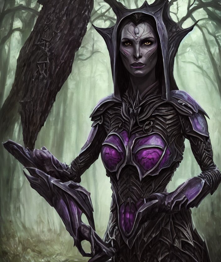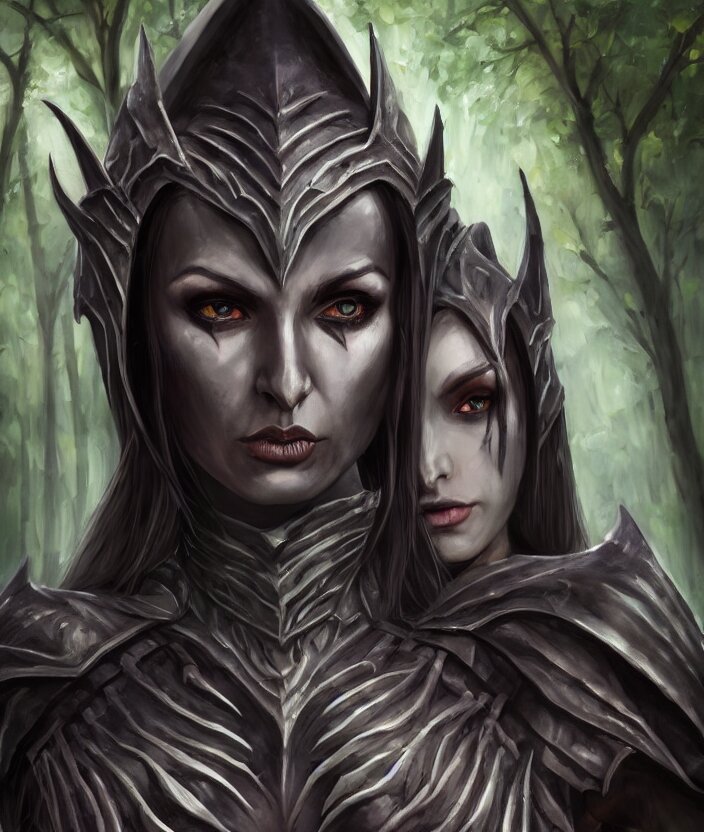 A dark elf woman removes her daedric armor and prepares to set up camp by a stream in the woods, oil painting, aesthetic face, symmetrical face, magic, dark, gloomy, portrait, character portrait, concept art, symmetrical, 4 k, macro detail, realistic shadows, bloom, cosplay, dviant art