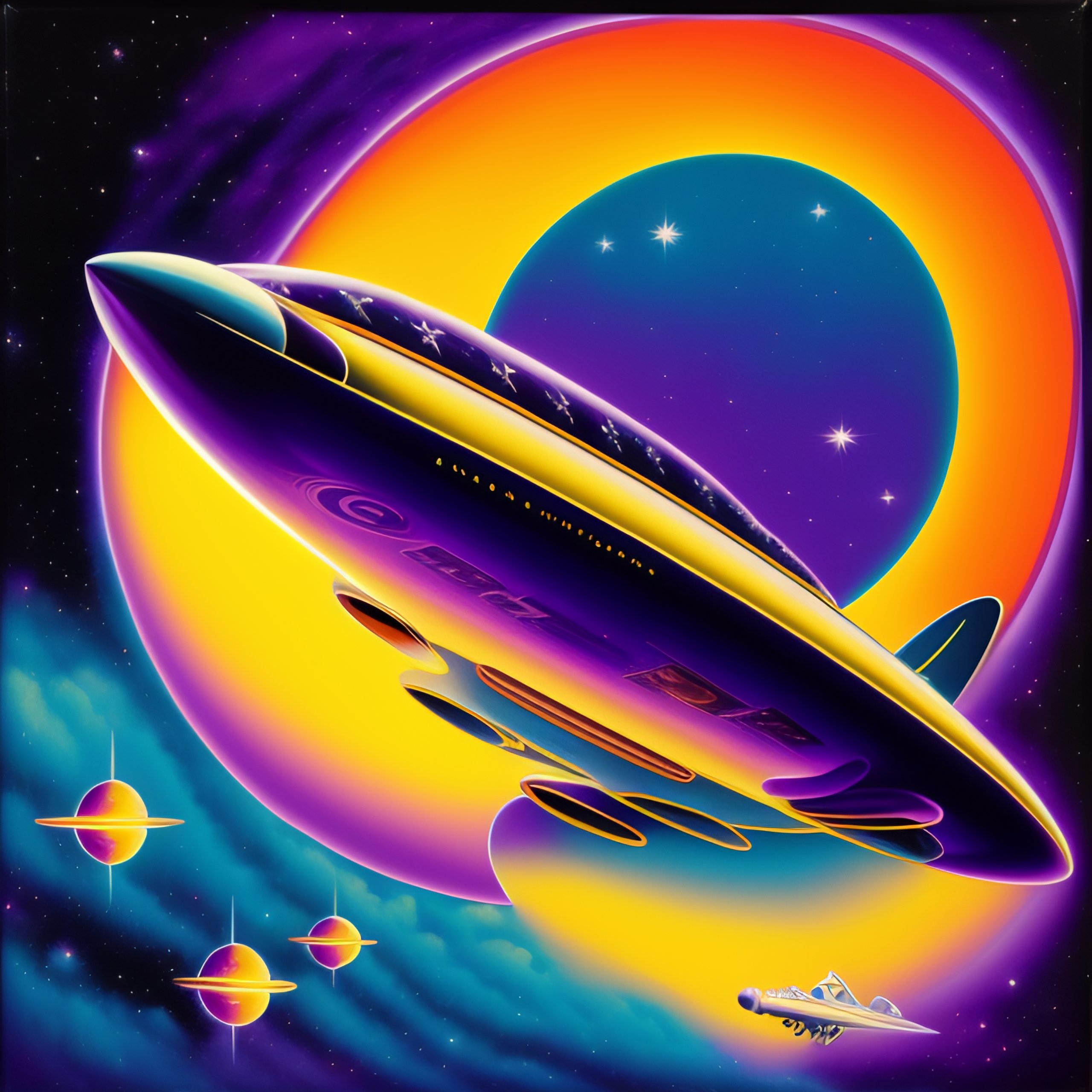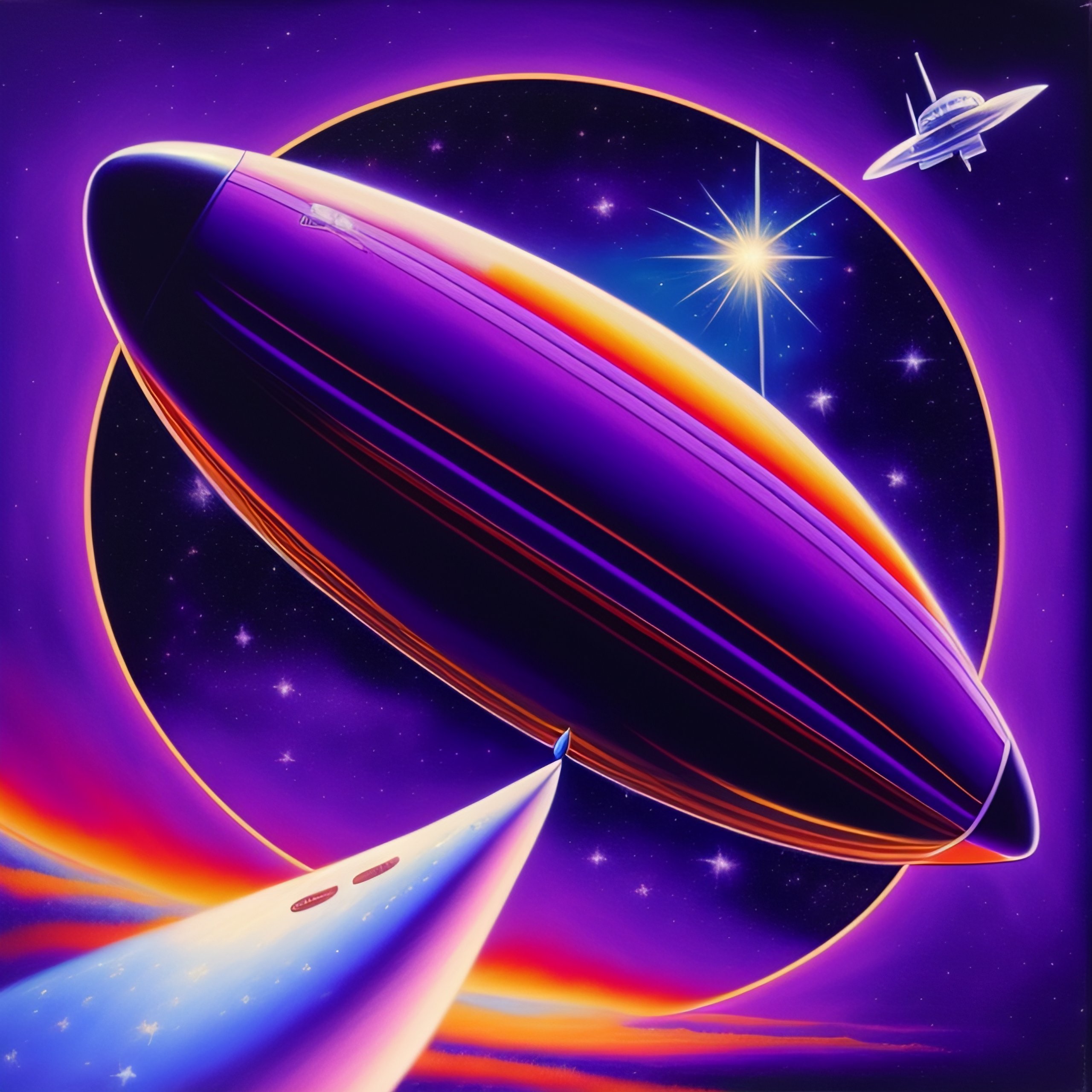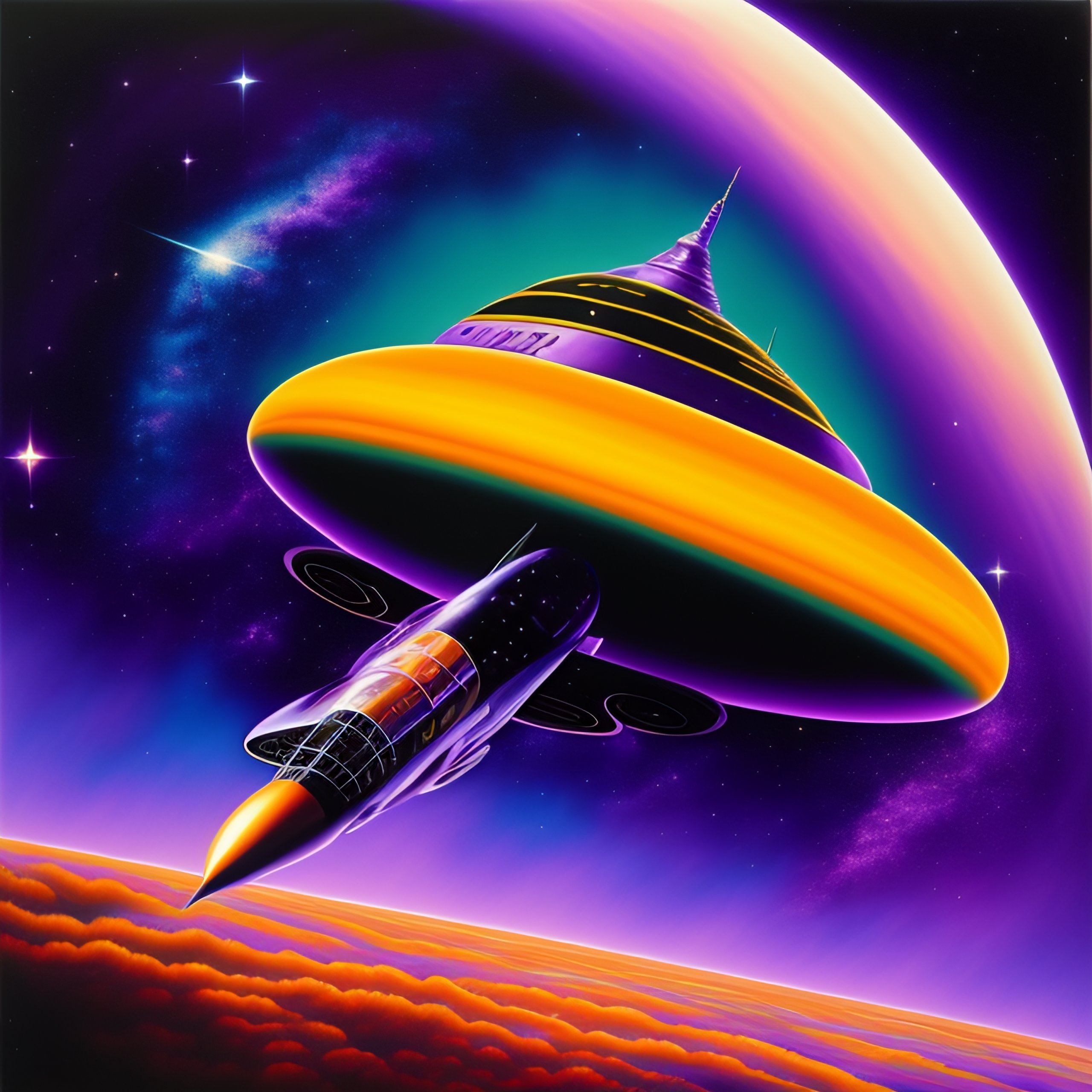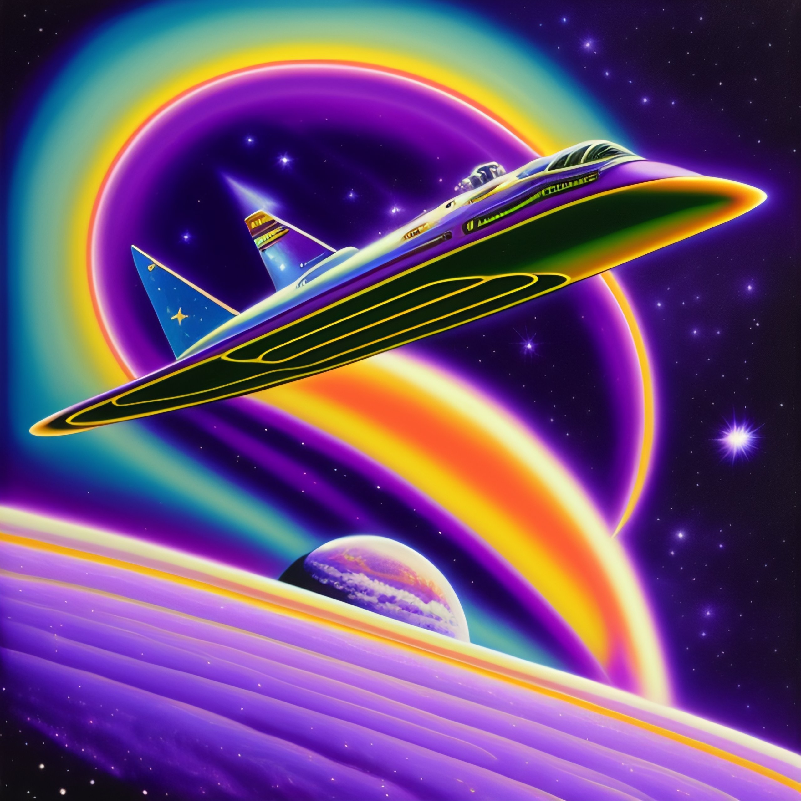 1980’s rock band album cover art, painted by stanley mouse, spaceship soaring through the galaxy, purple stars