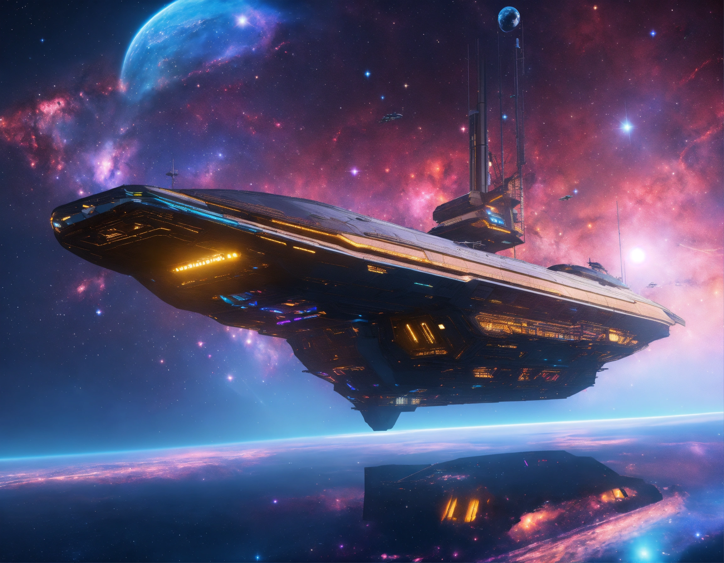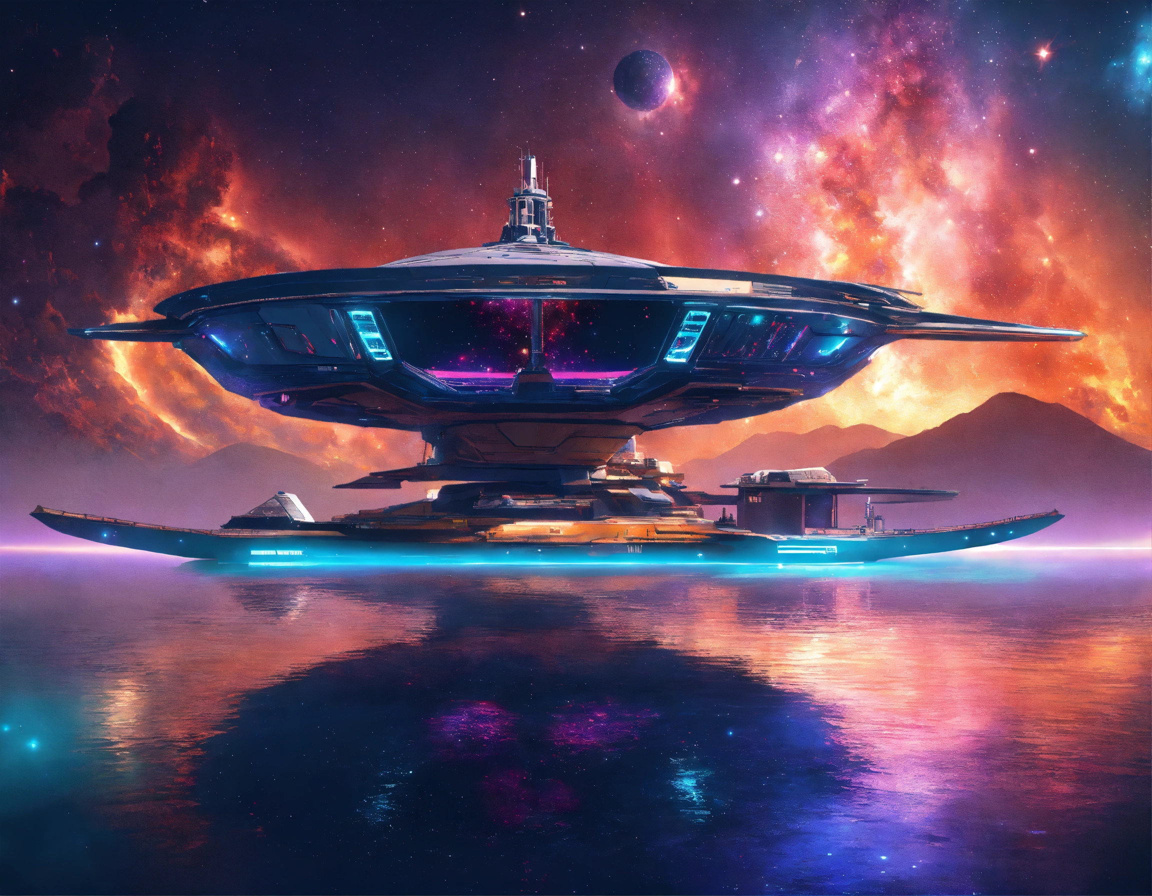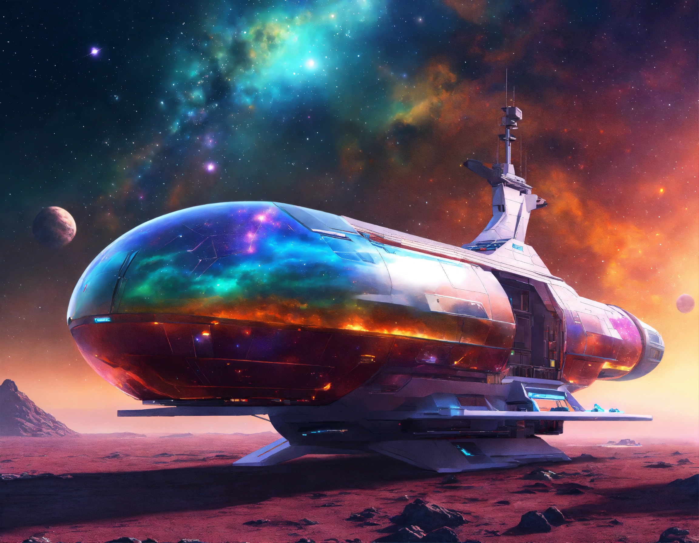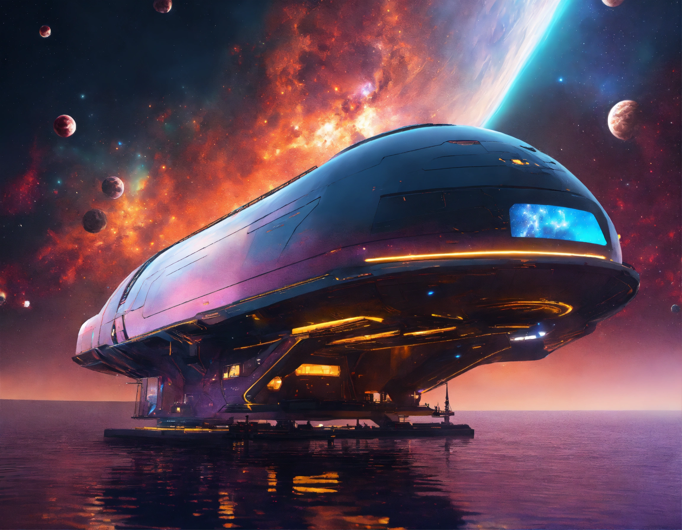 Futuristic space yacht docked at the outdoor star docks near a colorful star nebula, 9k, realistic, sci-fi