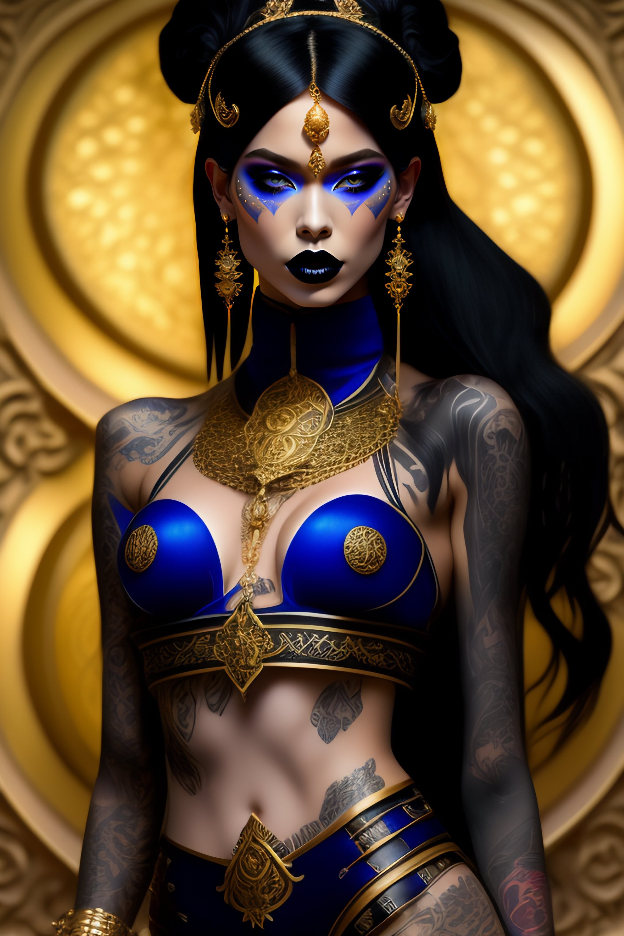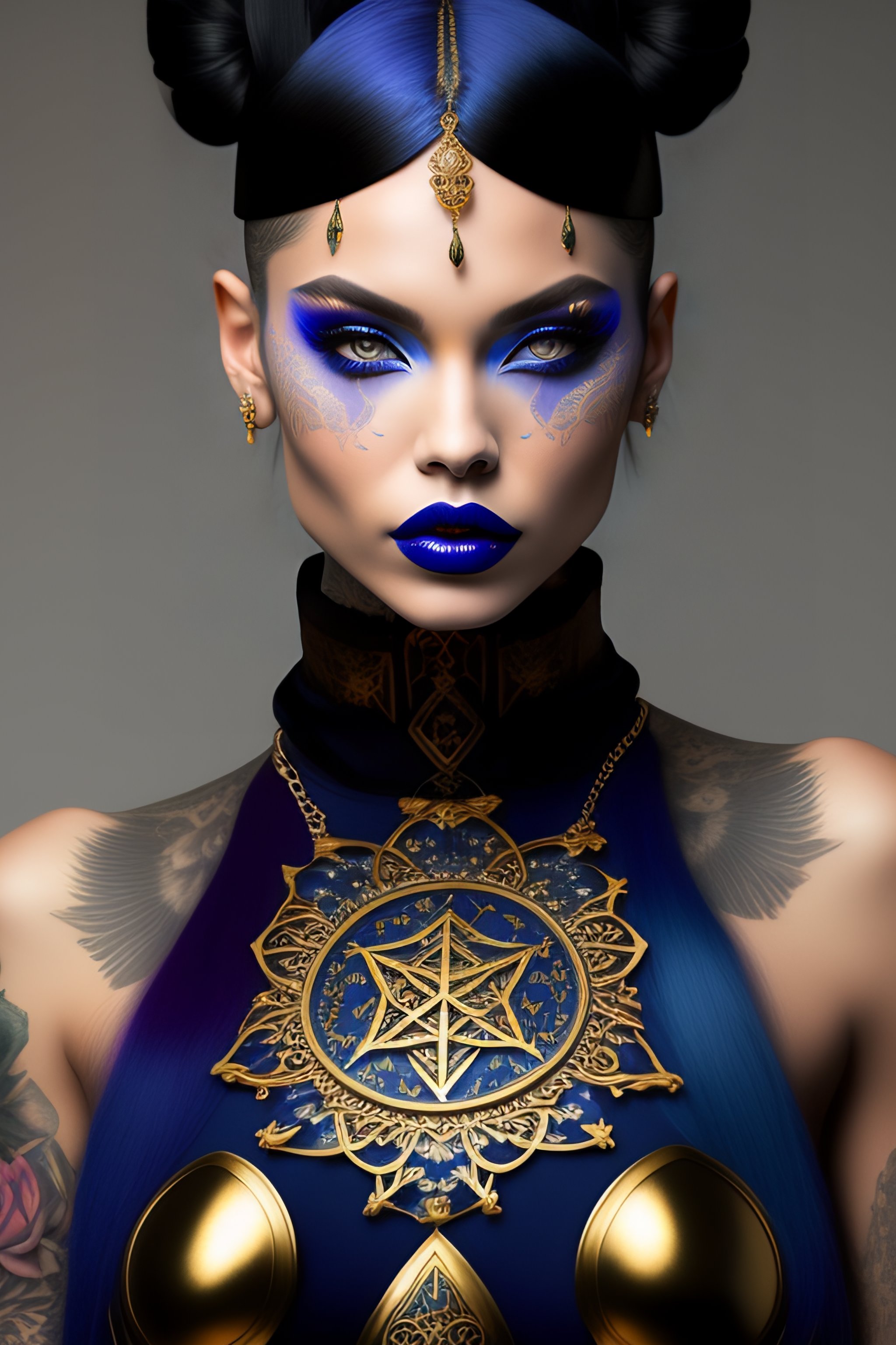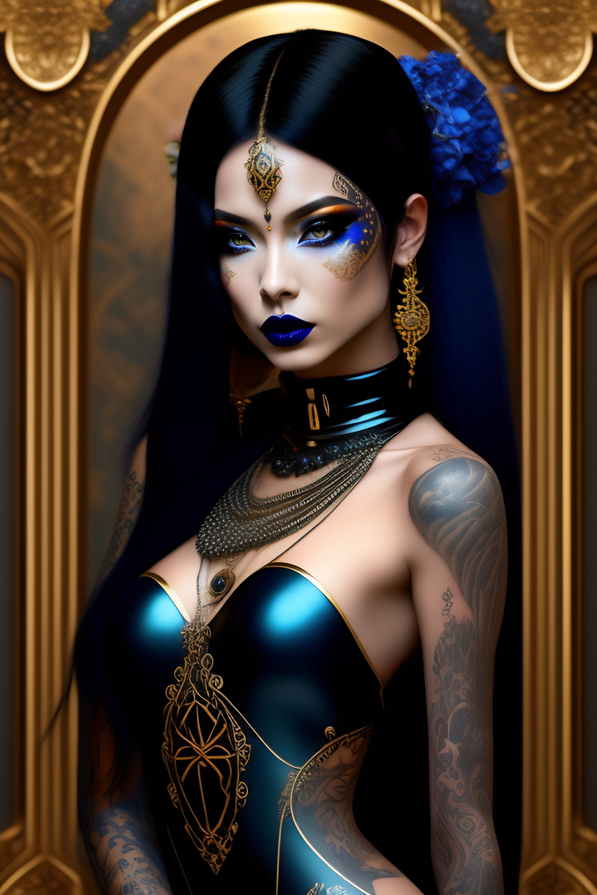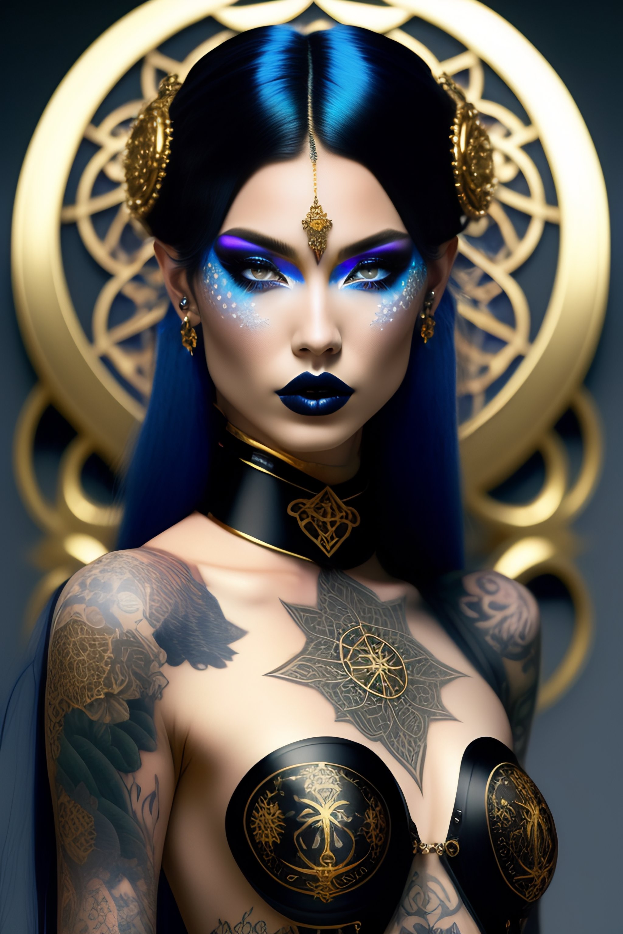 Cute goth girl, heavily tattooed with interlocked black pentagrams, blue lipstick, gold eyeshadow, septum ring. very thin glass tubes, beautiful body, detailed, intricate complexity, by moreau and ryden, sorayama. surrealism.