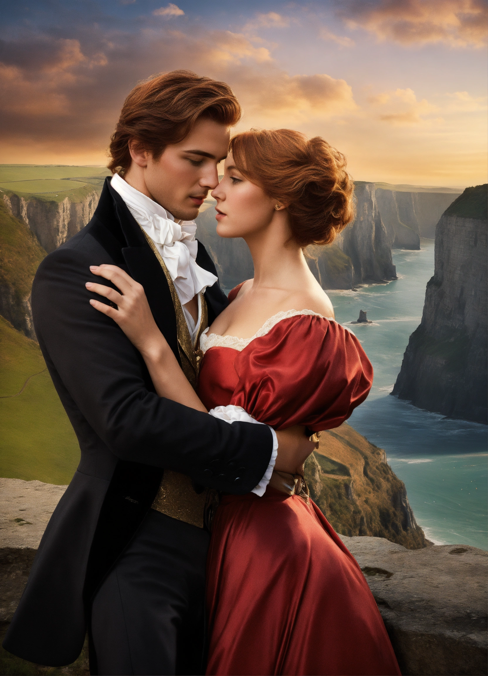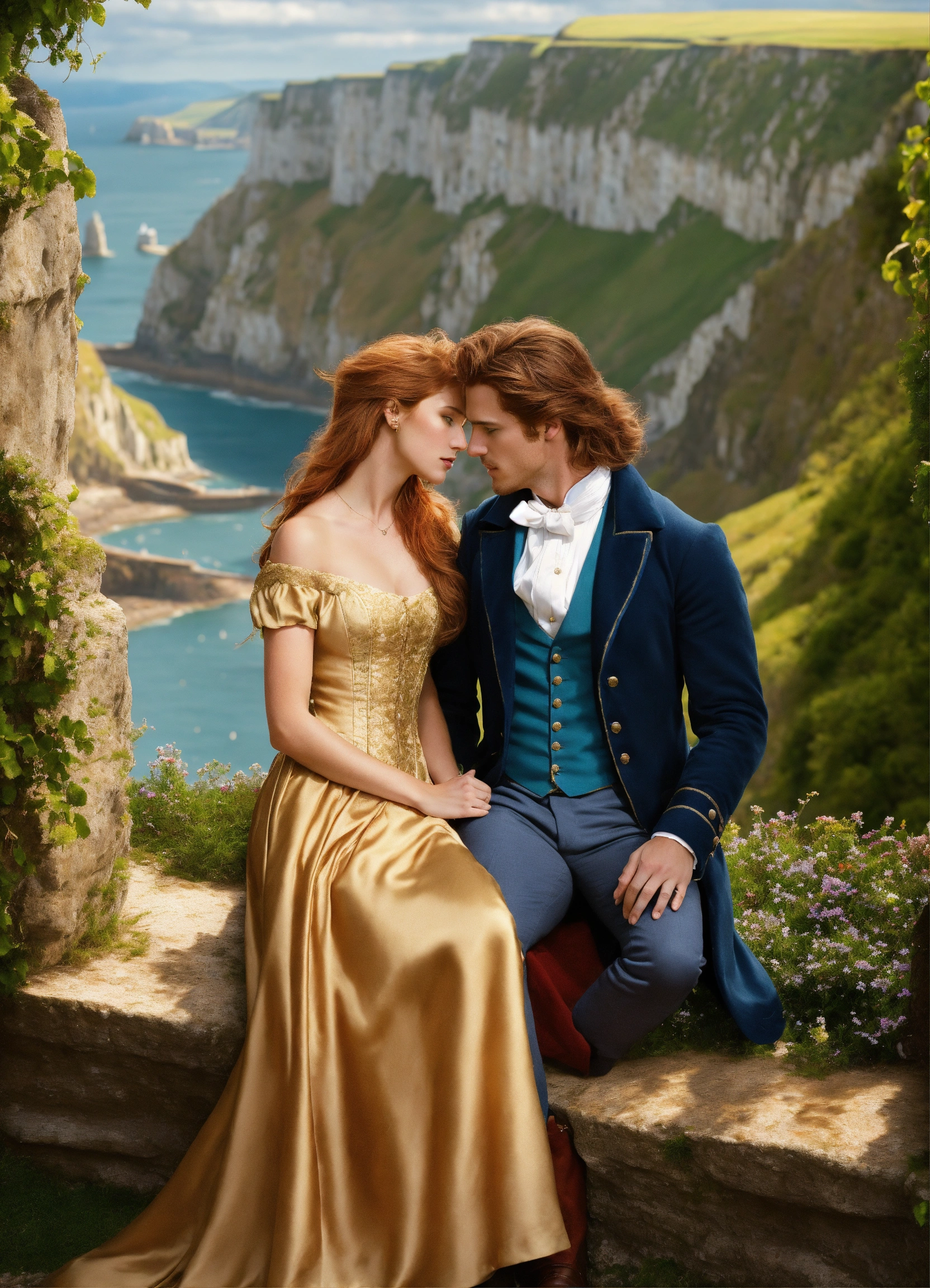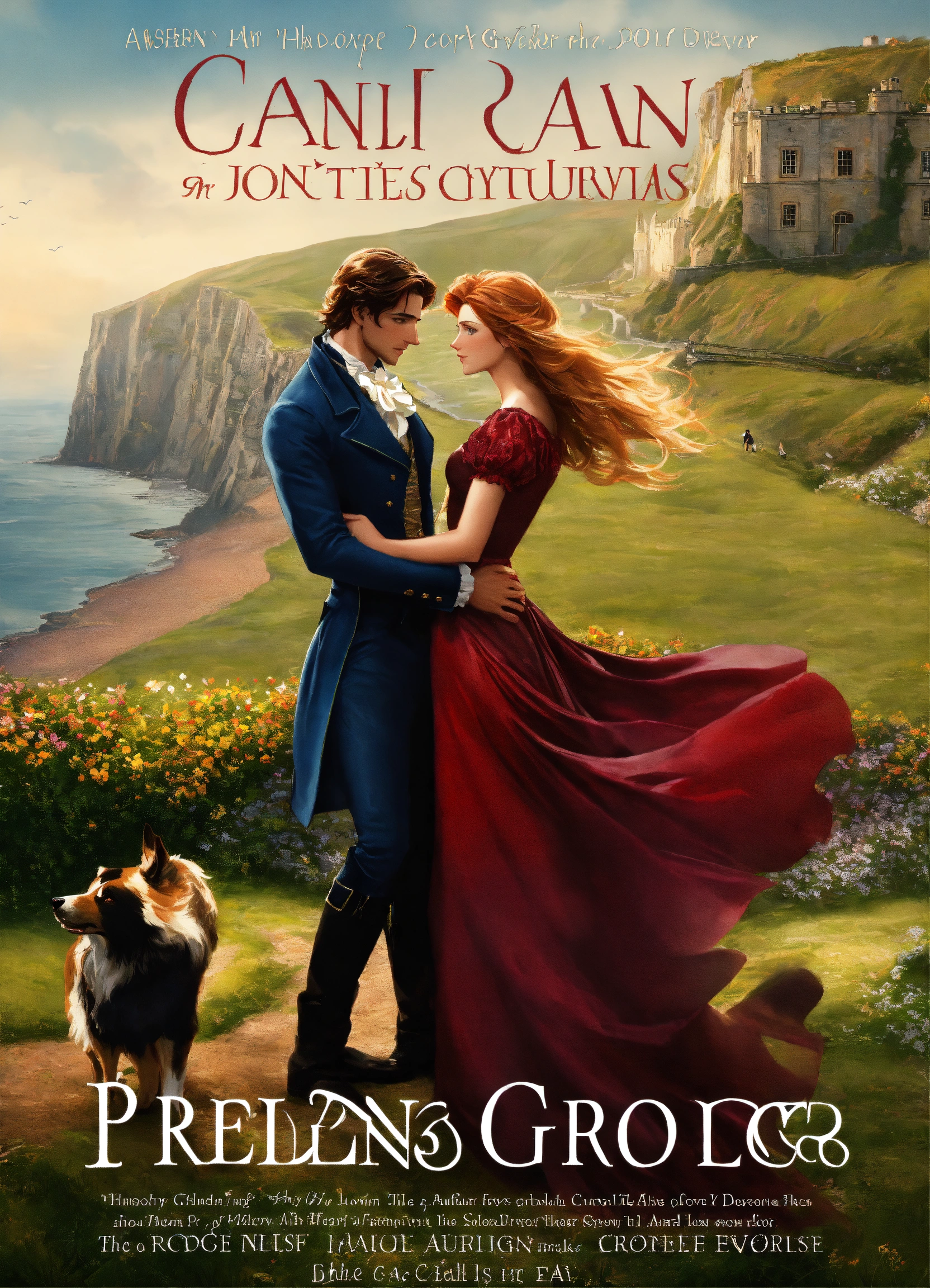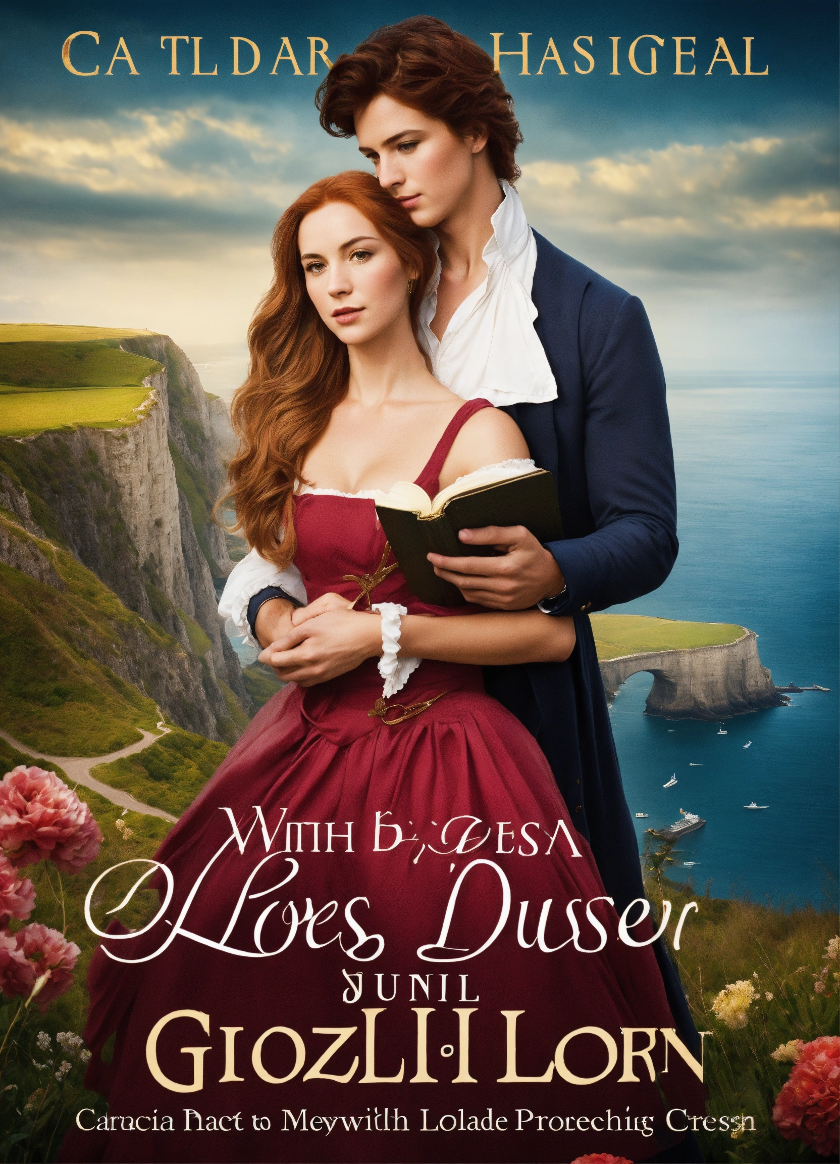 Create a captivating cover design that conveys the theme of romantic comedy, with the title of " loves many guises ", featuring a dashing regency gentleman with auburn hair embracing a slender woman with golden hair, a long face, and hazel eyes. again, the cliffs of dover and a sable collie could be in the background near their legs. photorealistic, photoreal, book cover style design, with shadows and effect that gives the design captivating, super detailed, extremely detailed, detailed hands, half body focus, with the cliffs of dover in their background, half body focus