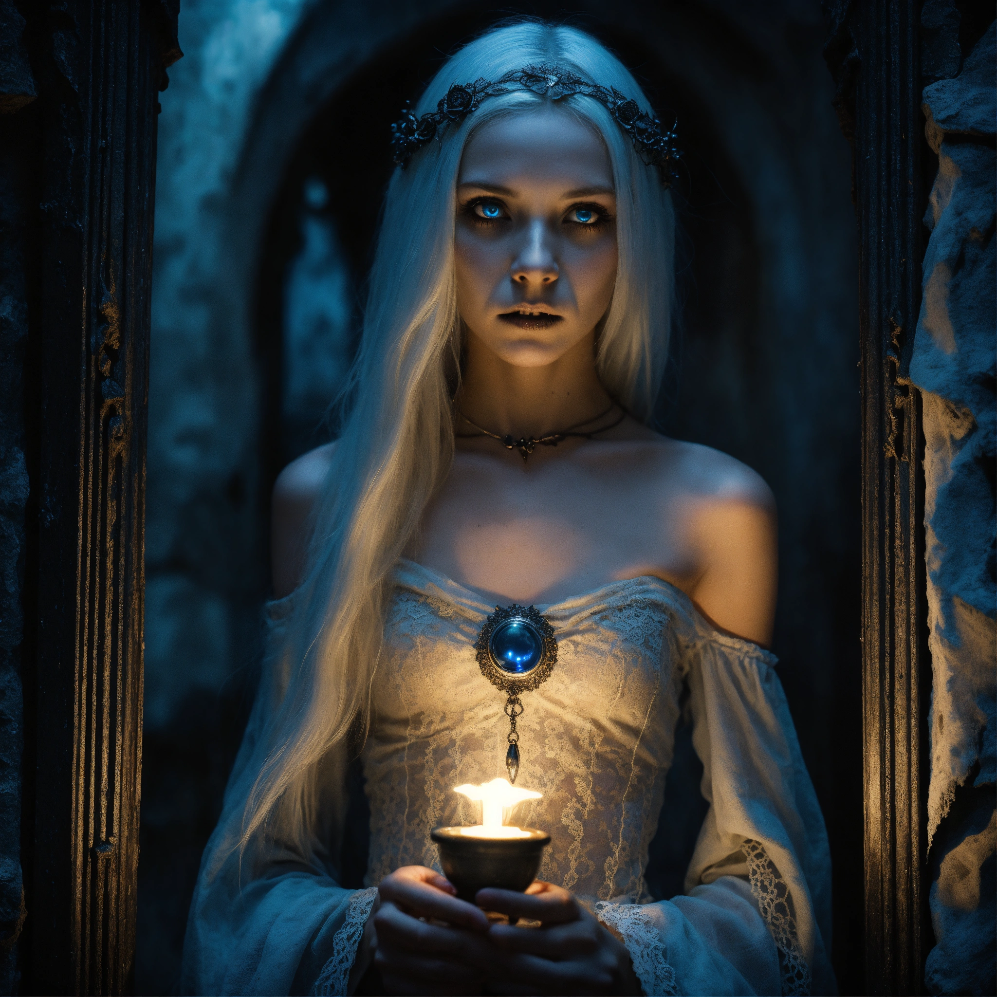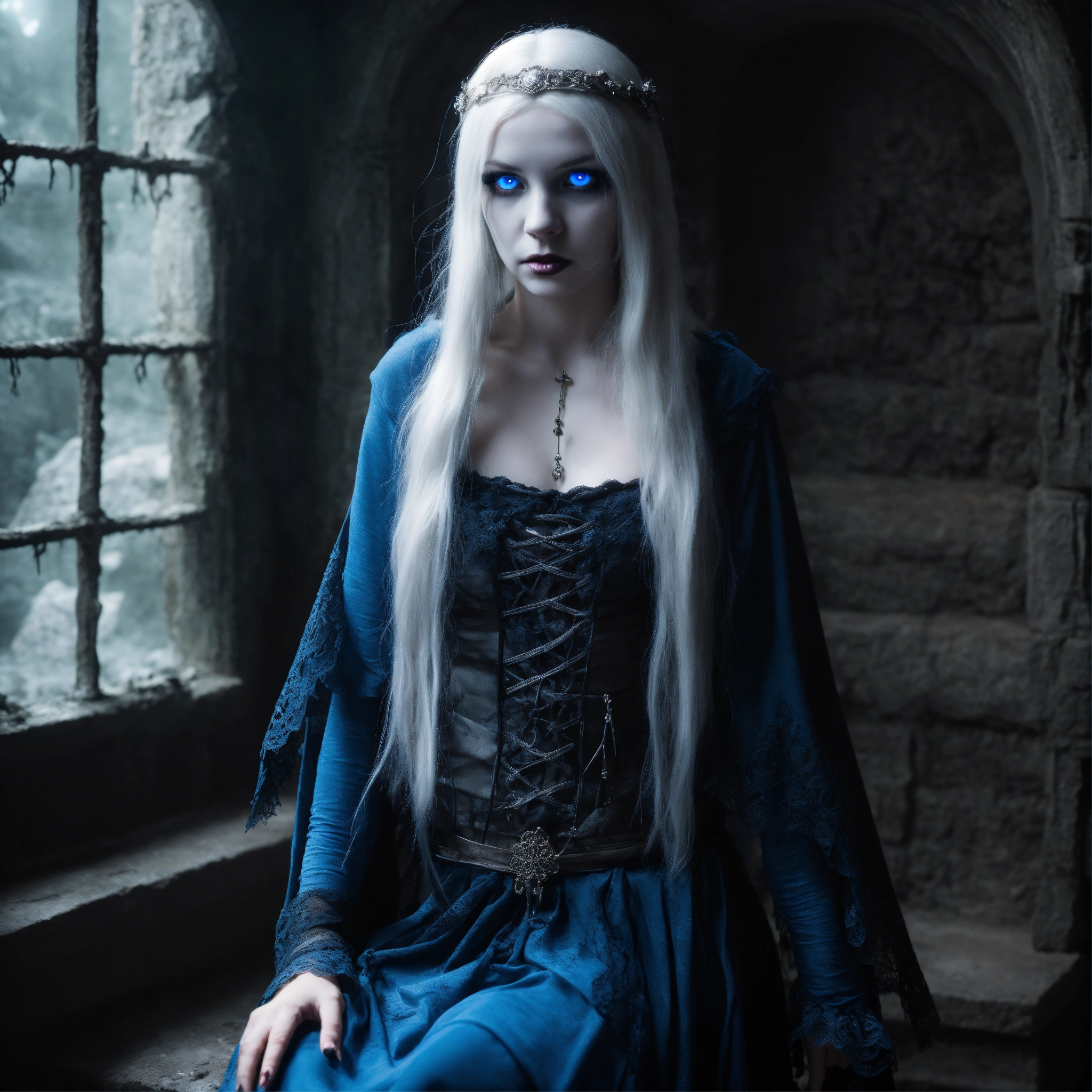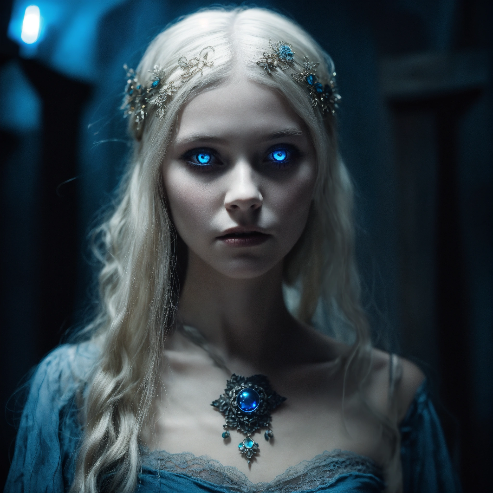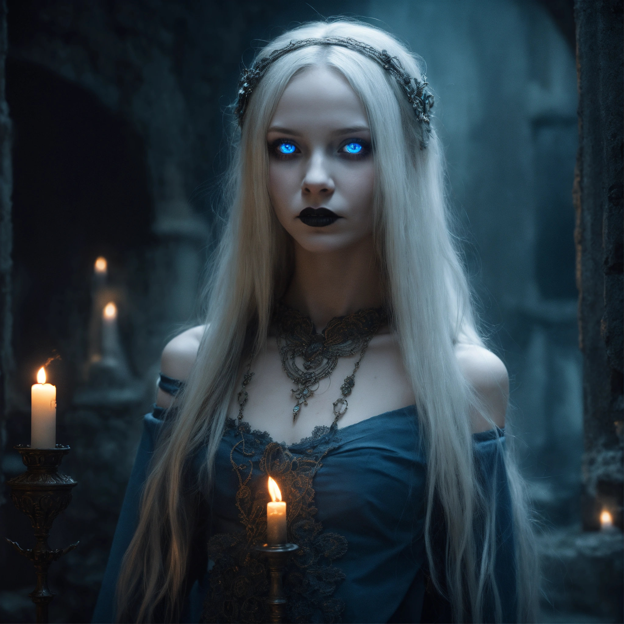 Body portrait, twelve year old childish female goth necromancer, very skinny and emaciated with long silverwhite hair and alabaster skin pale as a corpse and glowing blue eyes is overcome by darkness in a gloomy crypt, slim face, innocent looking, off-the-shoulder lace cropped corsett and skirt, lightly clad, childlike, juvenile, graceful, wispy, glowing blue eyes, ghostly, dead, evil, demonic, undead, darkness, grotesque, mysterious, dark, cold ambient lighting, extremely detailed, fantasy, medieval setting