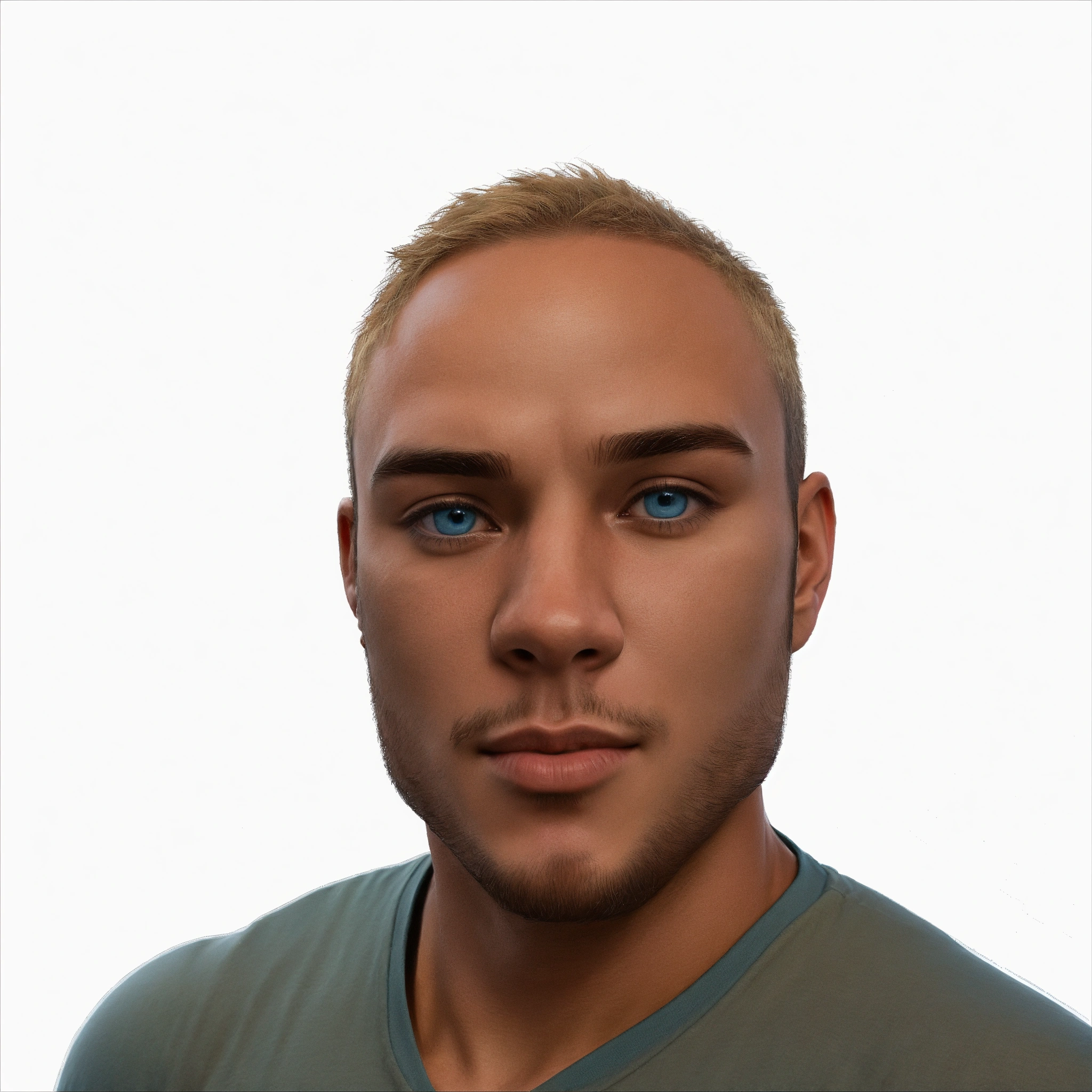 "use the uploaded image to produce an avatar that closely resembles a real human, mirroring the original's likeness. amplify the blonde hair with a more vivid tone and subtle waves for a natural, healthy look. adjust the eyes to a striking yet genuine shade of blue, maintaining their true expression. refine the skin to a flawless texture, ensuring it reflects the nuanced hues and lighting of actual skin. sculpt the physique subtly to represent an athletic build, clothed in a dark, fitted t-shirt that accentuates a realistic body shape. the avatar should embody the person's unique features and natural charisma, with enhancements that suggest the peak of their everyday appearance—someone approachable, yet remarkably handsome."