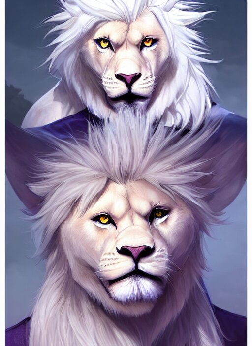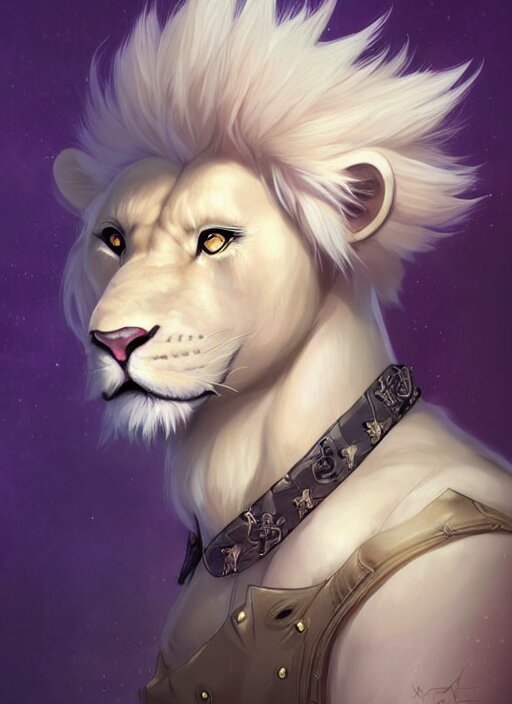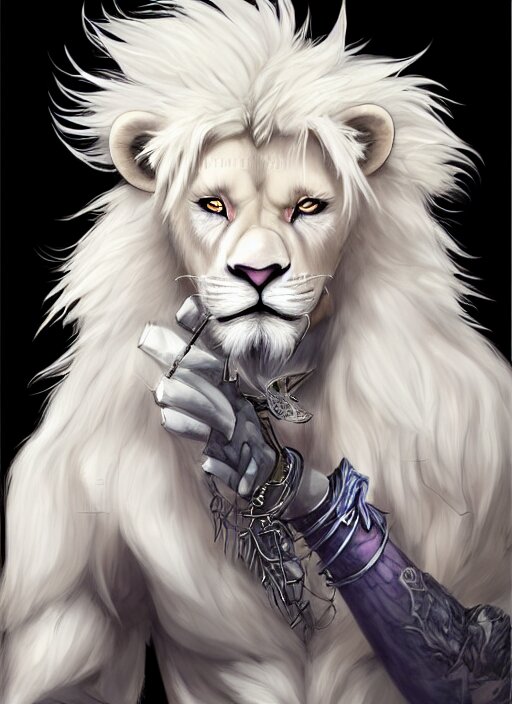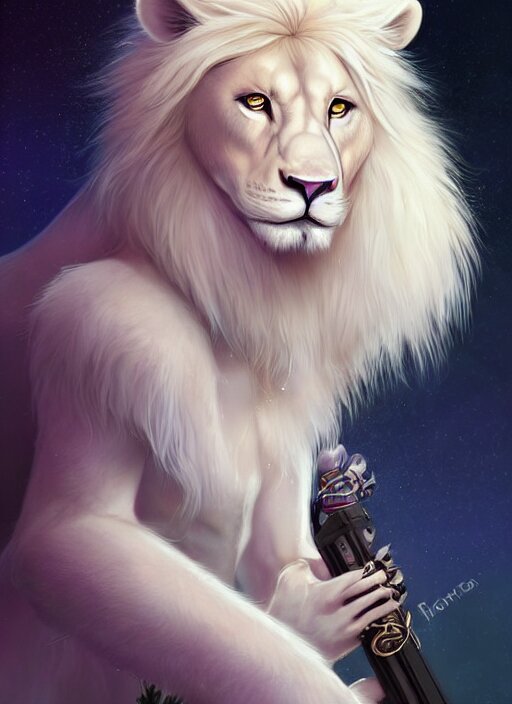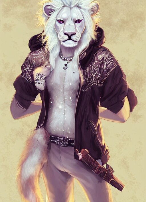 Award winning beautiful portrait commission of a male furry anthro albino lion fursona with a tail and a cute beautiful attractive detailed furry face wearing rockstar clothes on a live stage. character design by charlie bowater, ross tran, artgerm, and makoto shinkai, detailed, inked, western comic book art