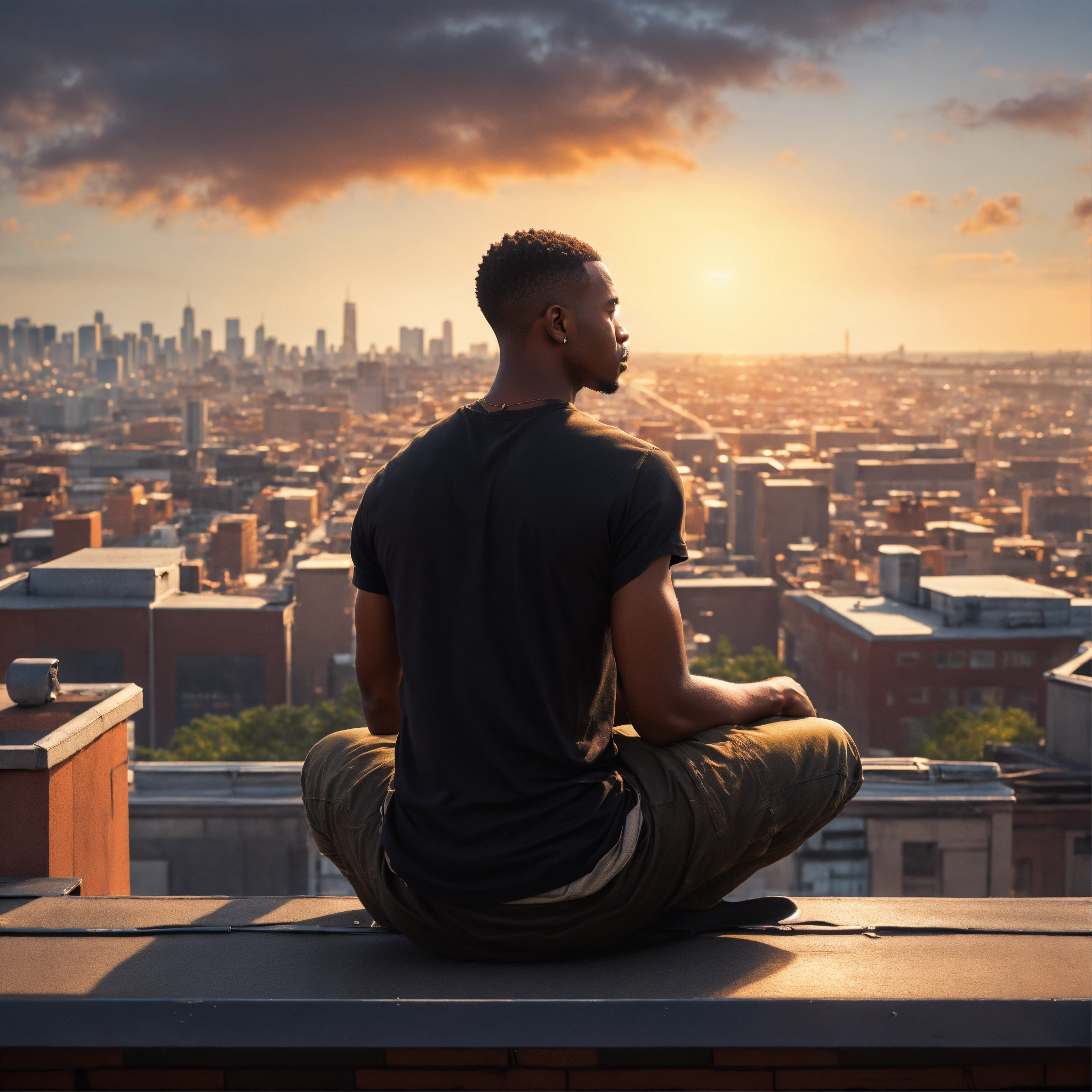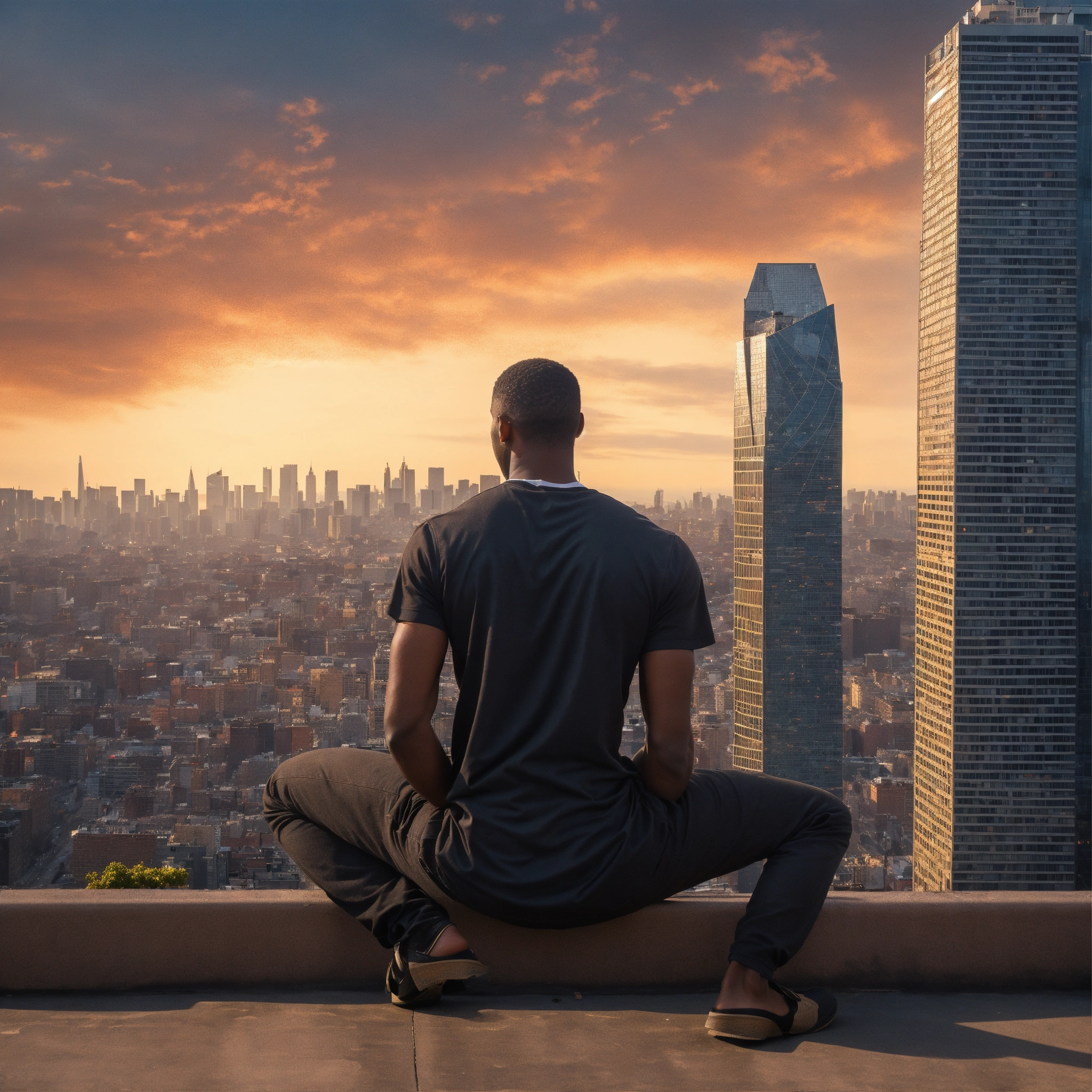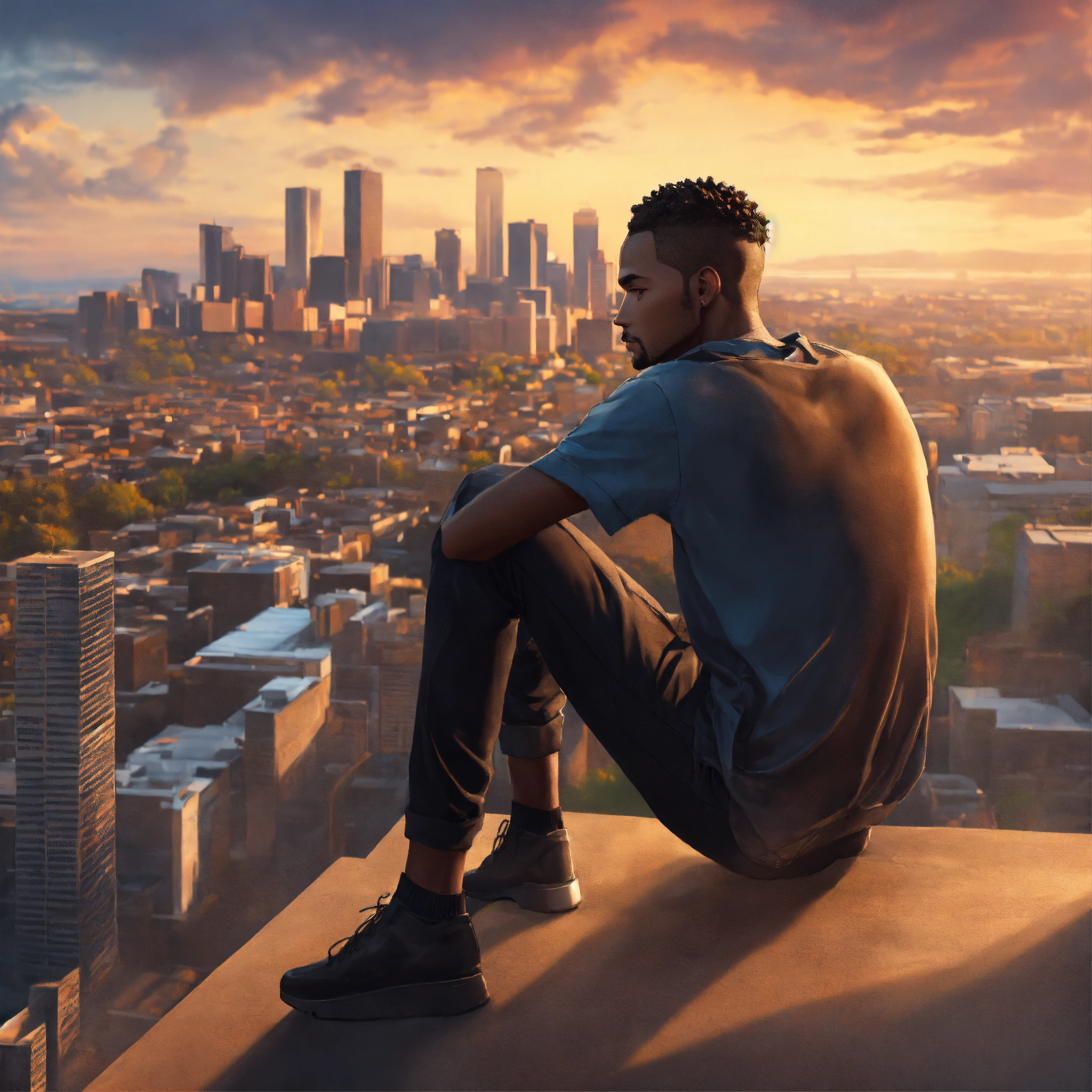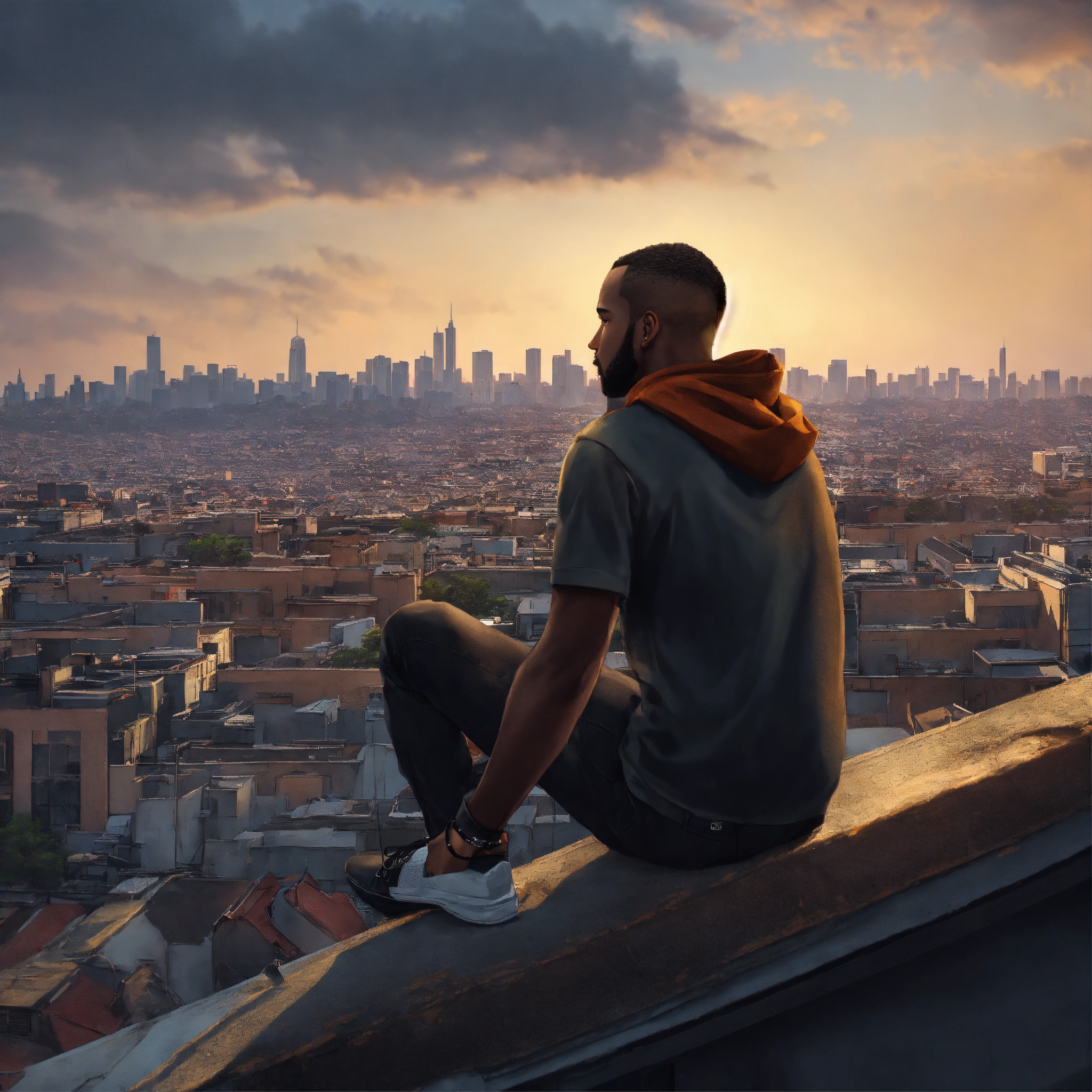 “ black man with low hair style sitting on a roof looking down at a city below, extremely detailed, good view of the city from far point focus more on the city