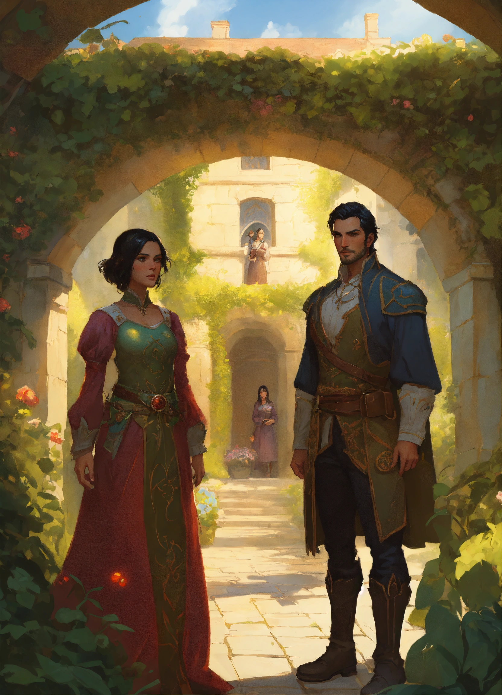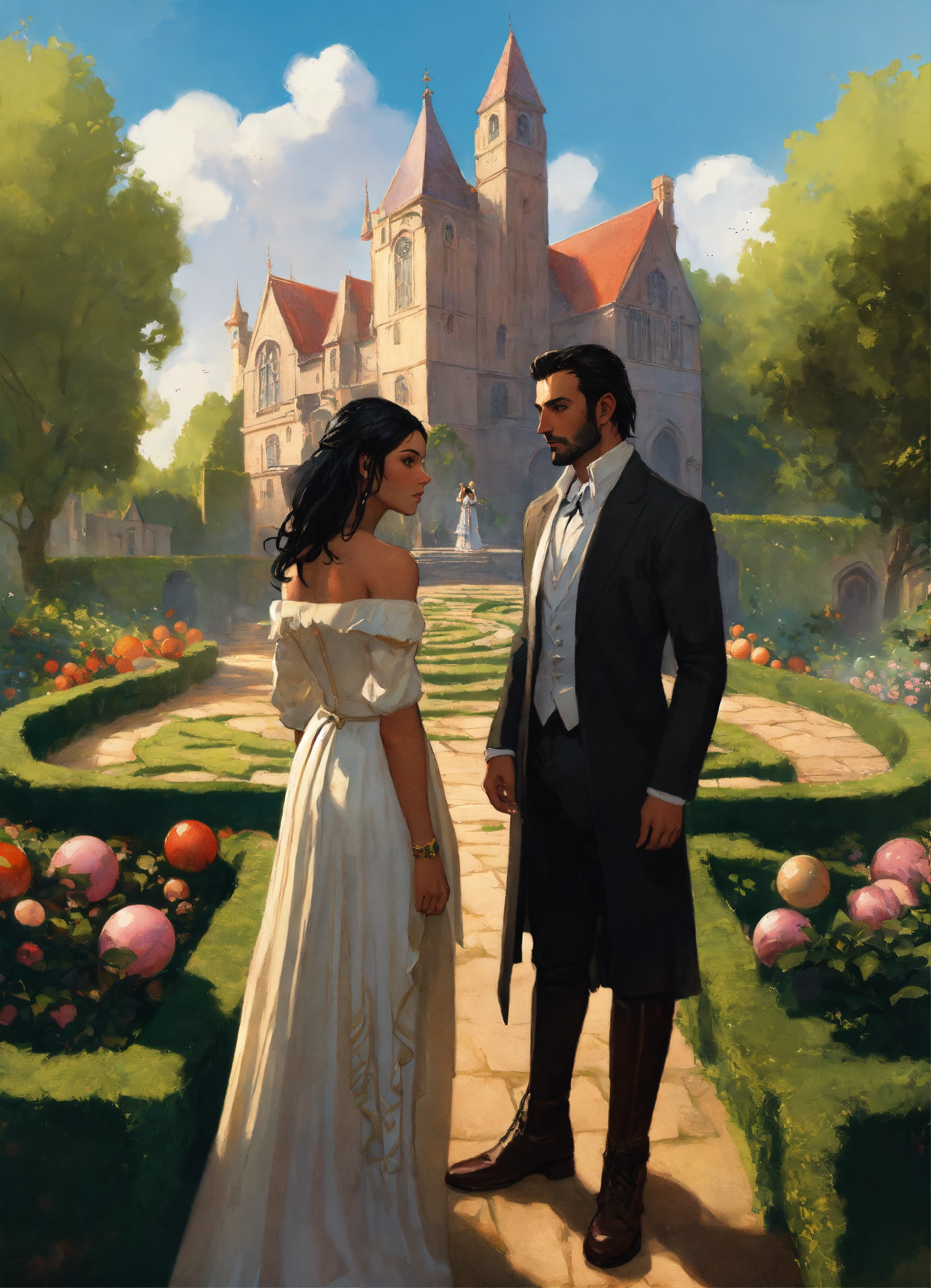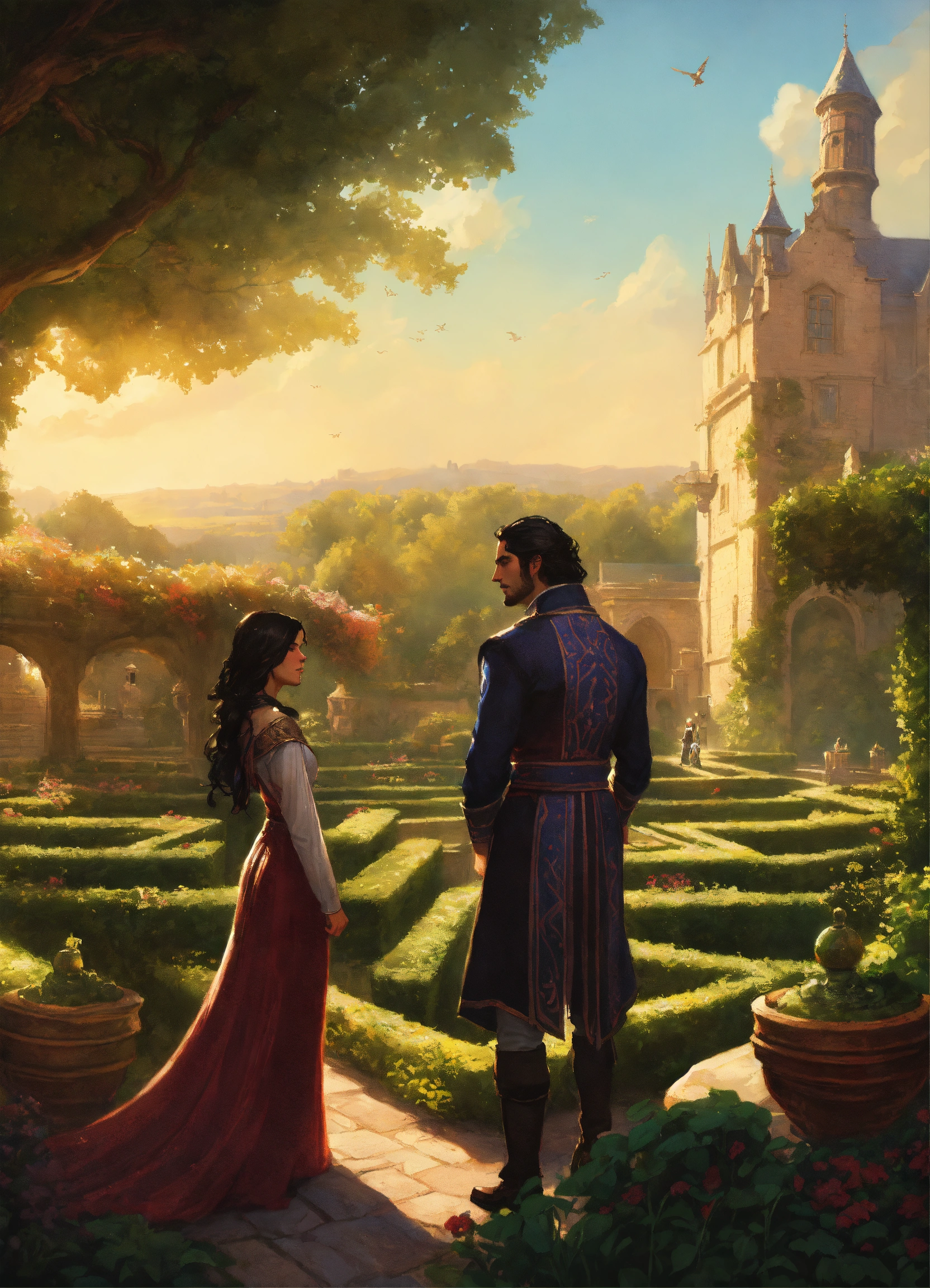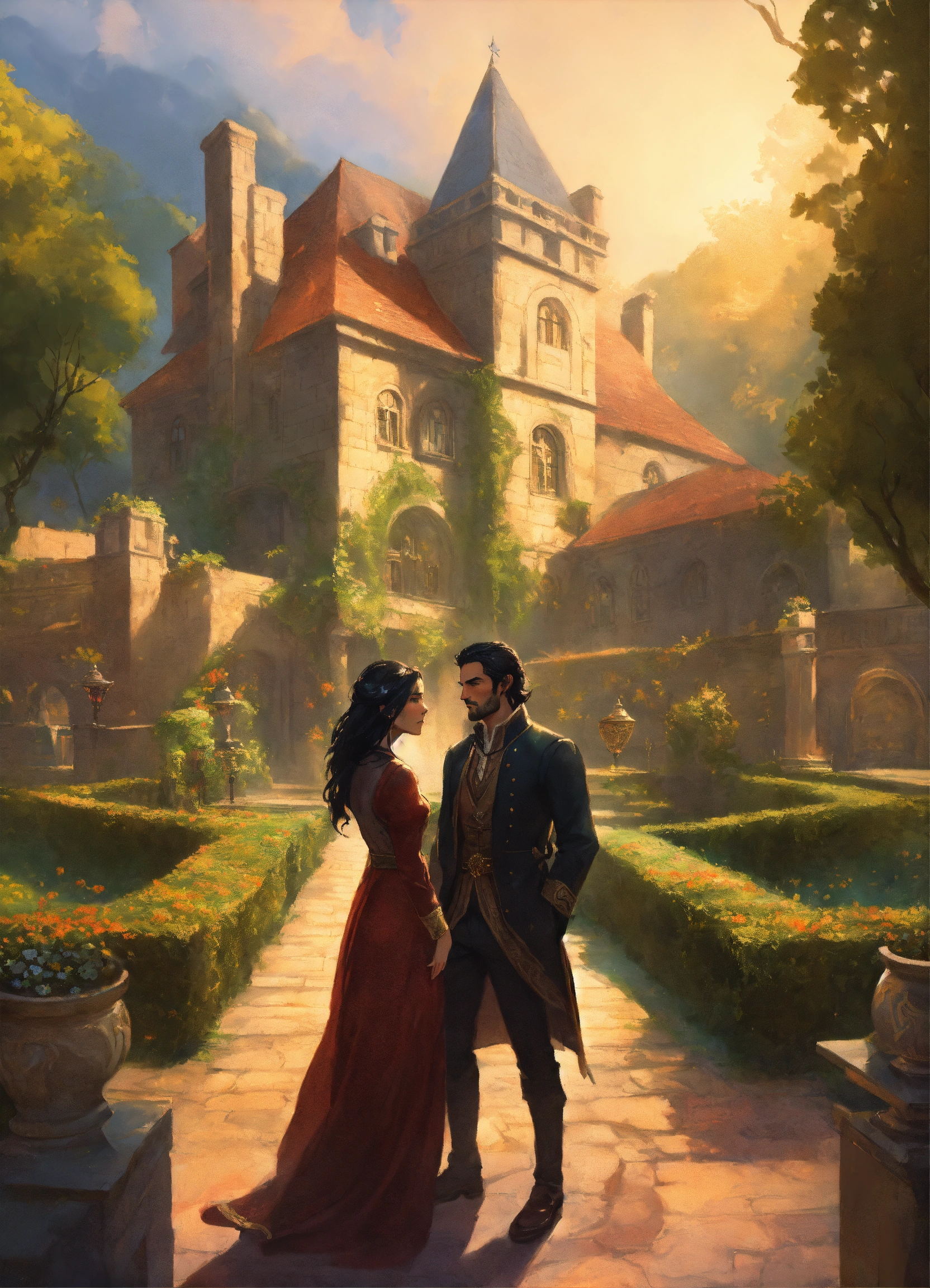 In the foreground is a man and woman, headshots, woman has black hair and villager attire, male is a dark handsome high lord, up close, beautiful, in a garden maze, in the background is a large stone manor, elegant, fantasy, magical floating orbs, archwood manor, labyrinth, light, realistic, highly detailed painting concept art style, jordan grimmer, greg rutkowski, marc simonetti