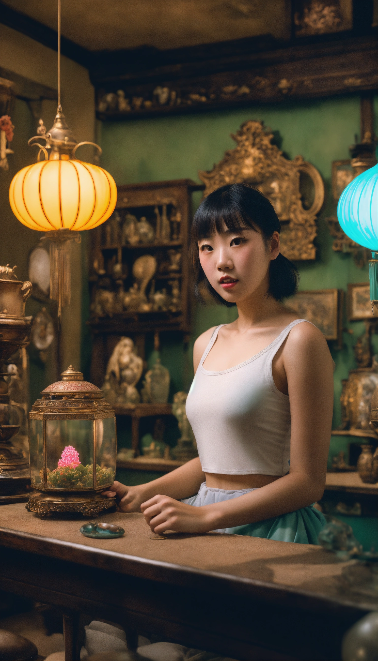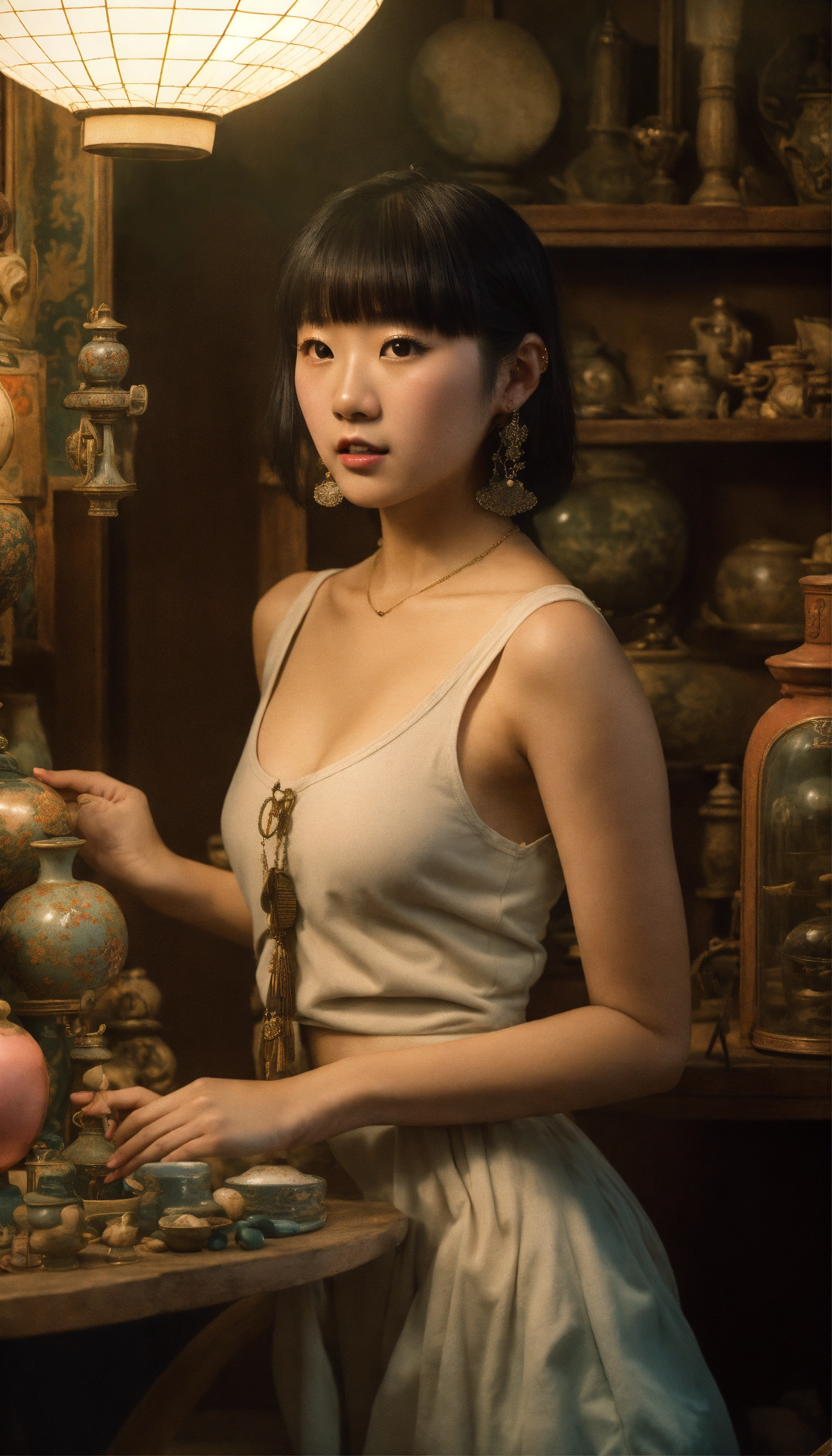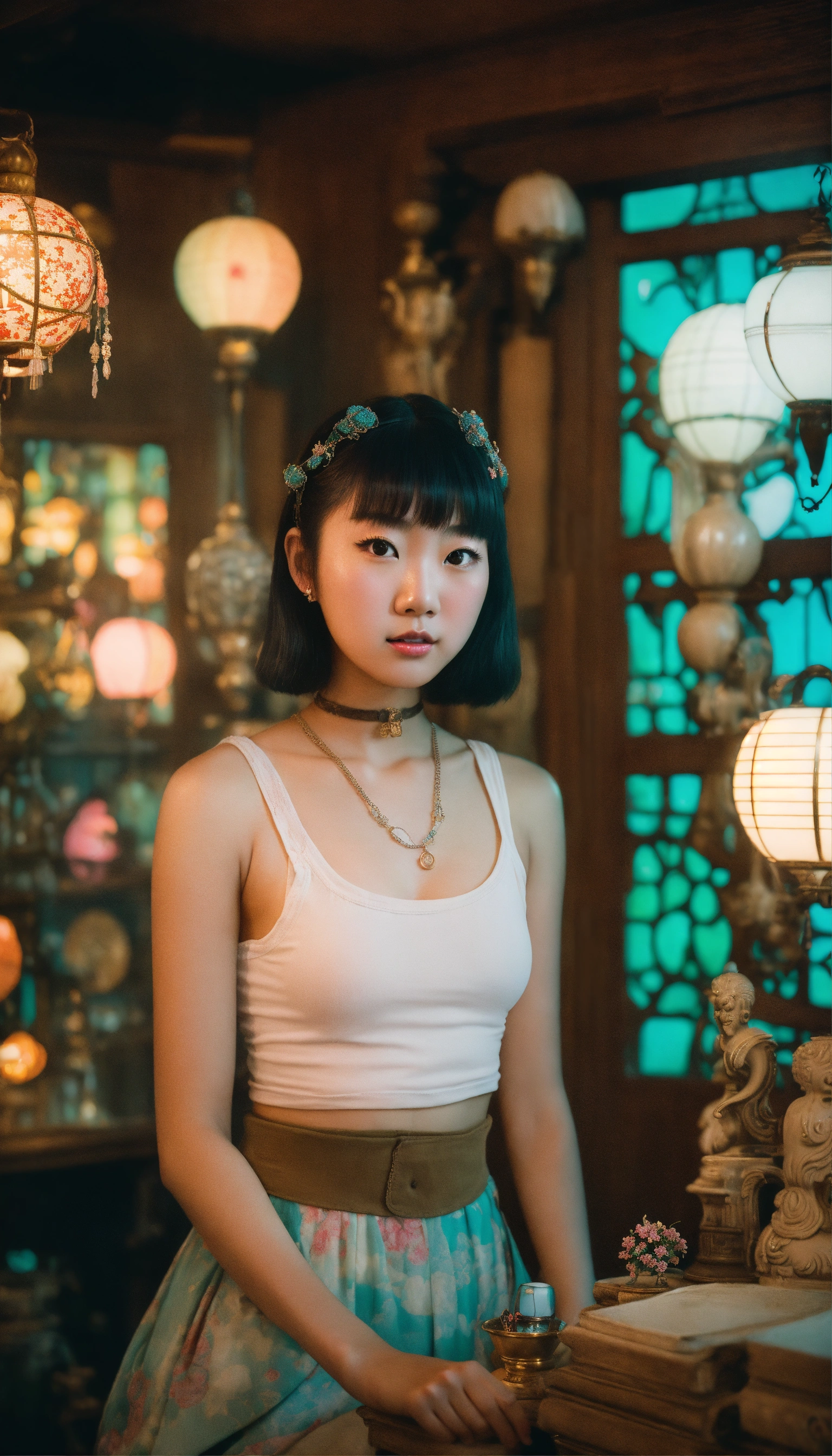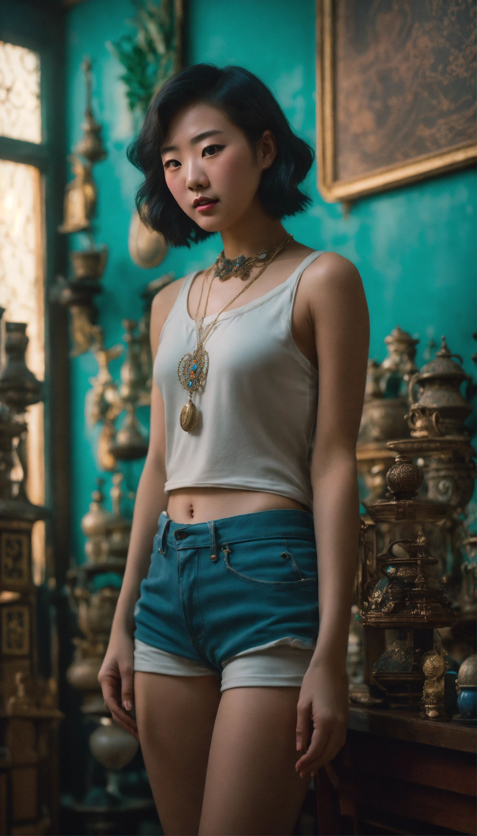 A hyper-realistic photograph of "within a medieval parlor, a mischievous poltergeist playfully rearranges antique curiosities, extremely cute and desirable japanese young woman with a white tank top and short, retro-futuristic vaporwave aesthetic." 64k, editorial shot, muted colors, silent colors