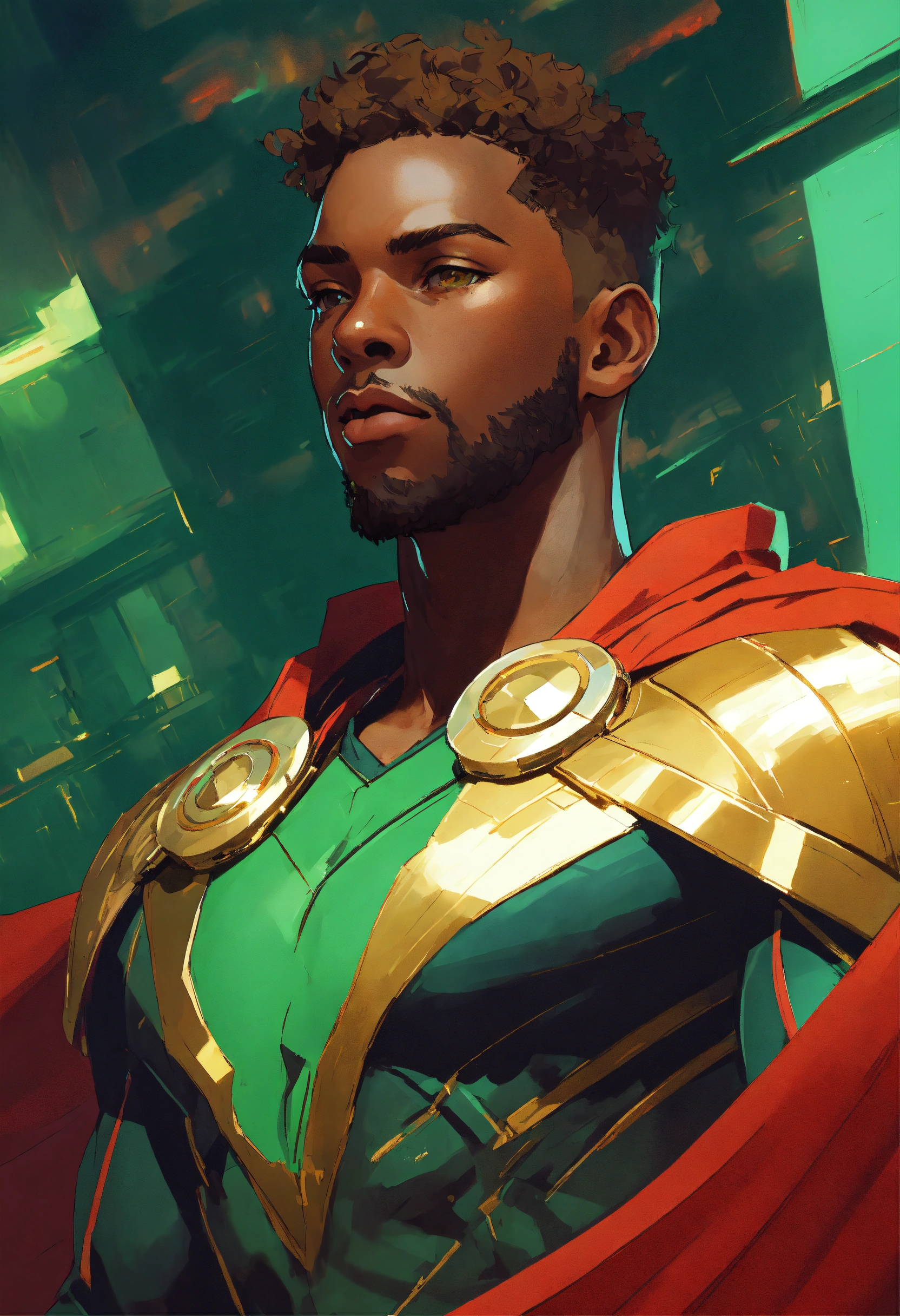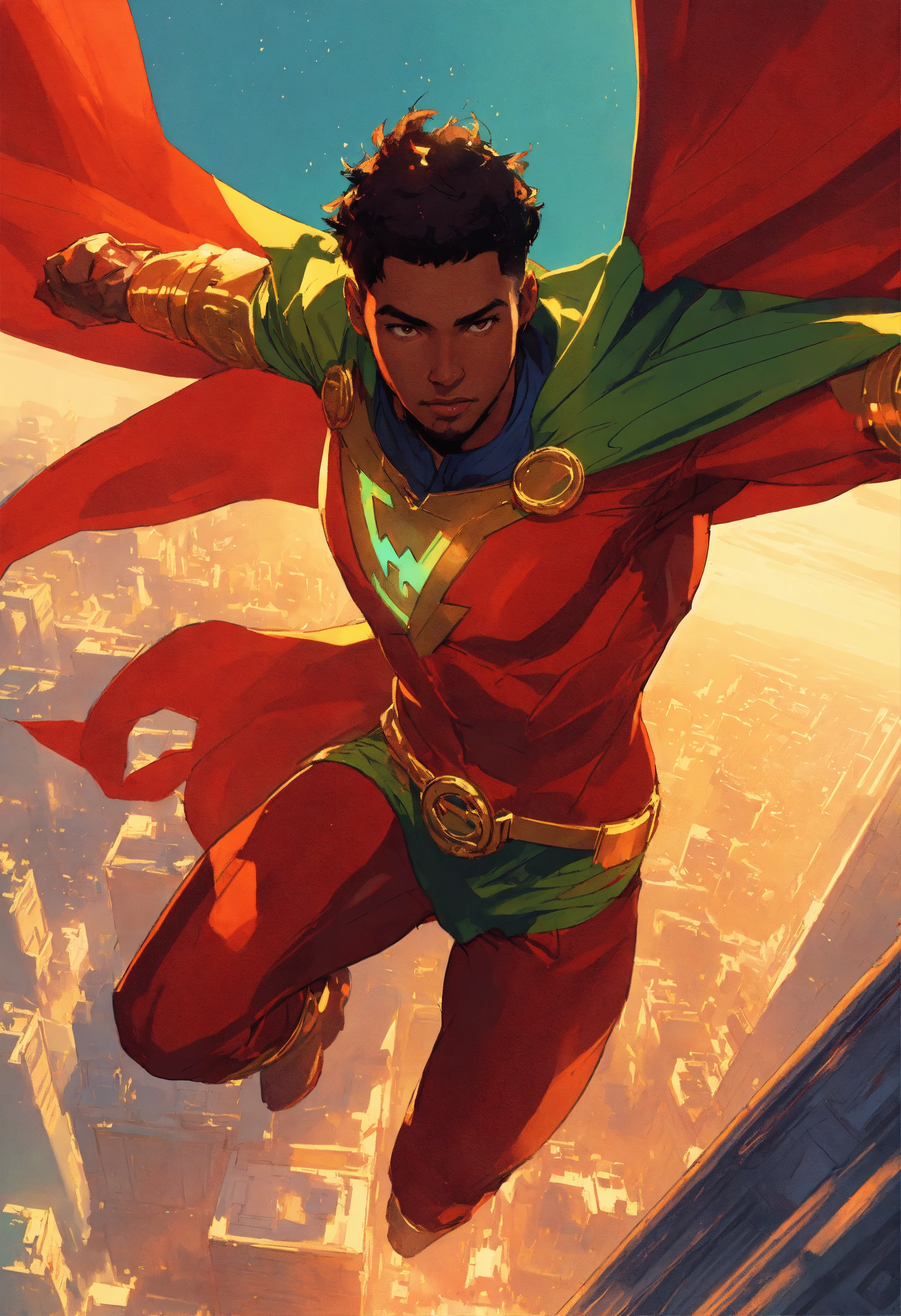 Top-down view, bird's-eye view, extreme close-up, [dc comics character augustus freeman (dakotaverse) icon1.0] middle age black man superhero, brown hair, red body suit, gold arm bands and leg bands, long flowing green cape, white eyes, flying in the sky, gold o ring on his chest, dynamic pose mid-flight, digital illustration, comic style, awesome background, focused, approaching perfection, dynamic, highly detailed, art station, concept art, sharp soft focus, global illumination, detailed and intricate environment, trending in pixiv fanbox, illustration, art by carne griffiths and wadim kashin, greg rutkowski, acrylic painting, trending in pixiv fanbox, palette knife and brush strokes, rhads, beeple, makoto shinkai and lois van baarle, ilya kuvshinov, rossdraws, tom bagshaw, alphonse mucha, jamie wyeth james gilleard edward hopper, studio ghibli genshin impact