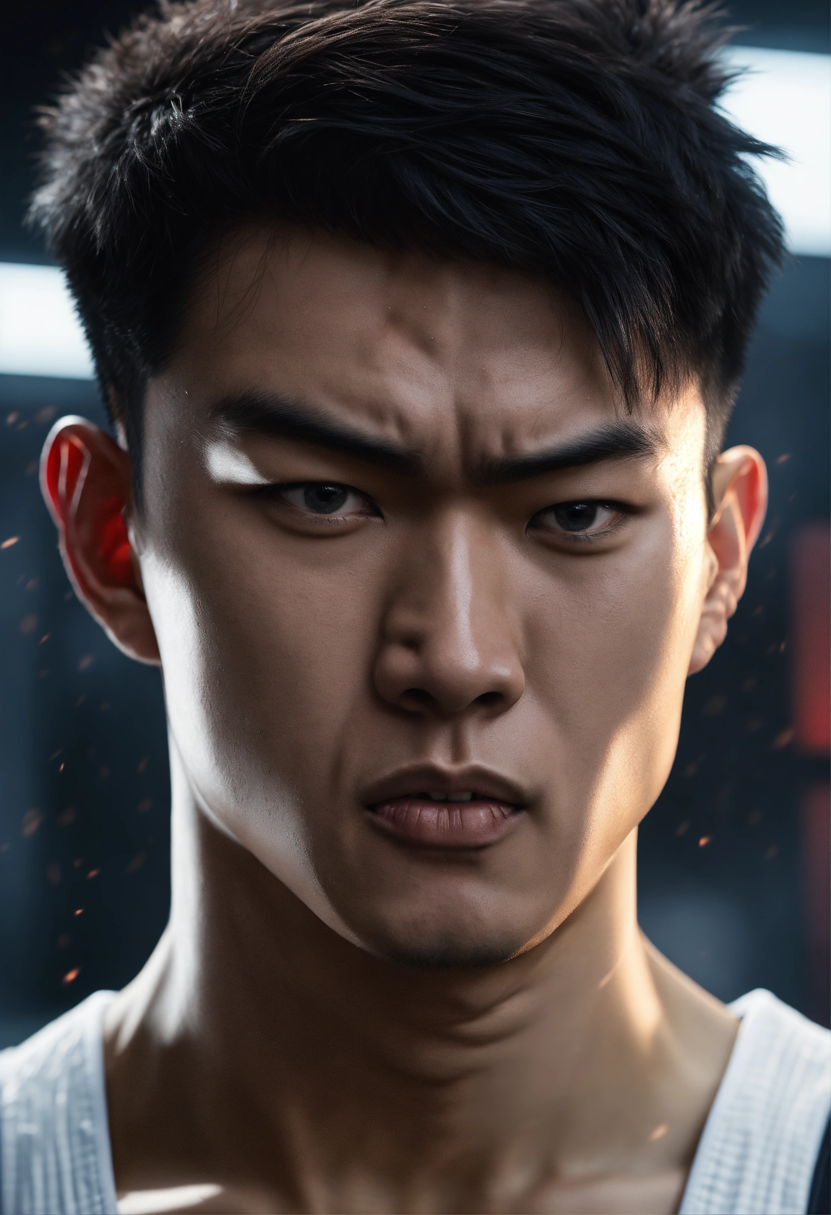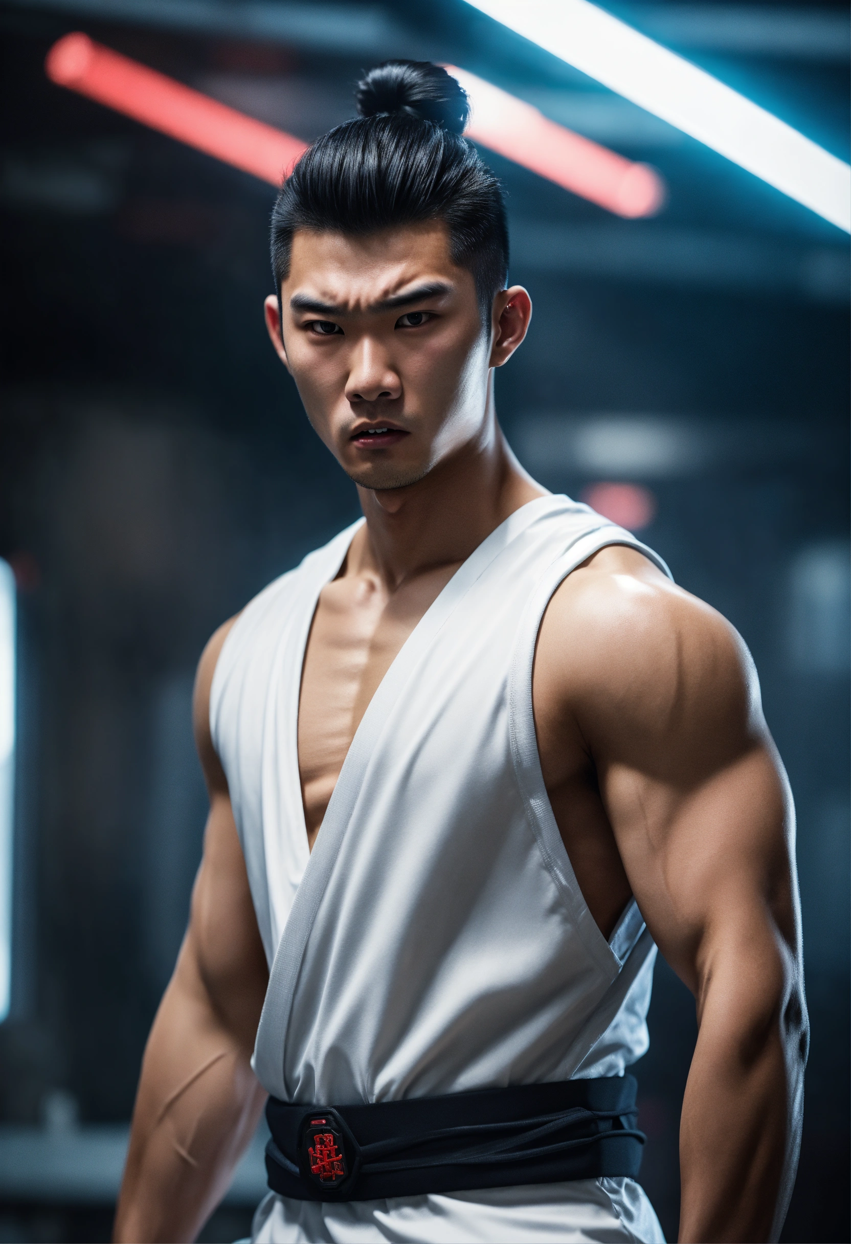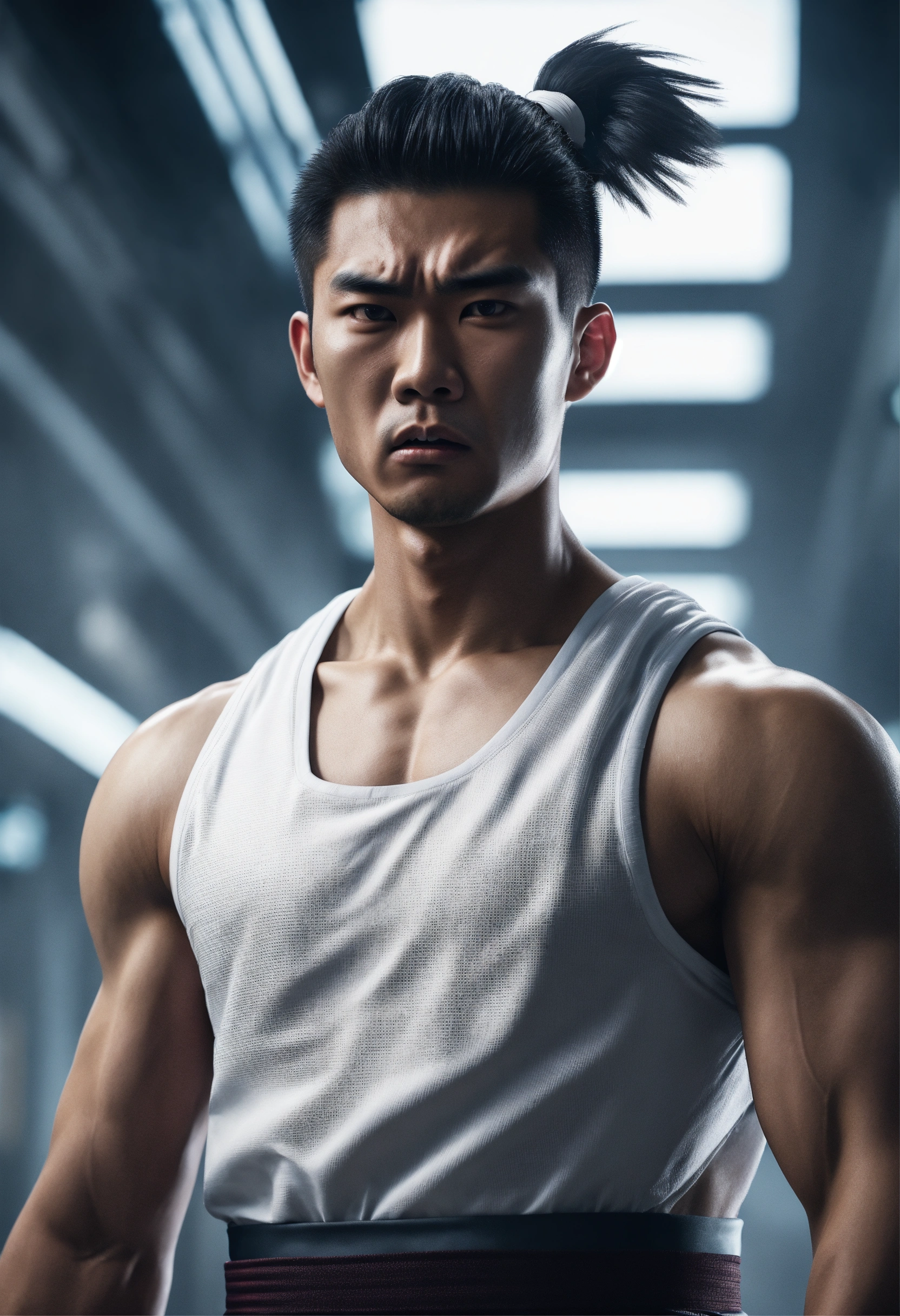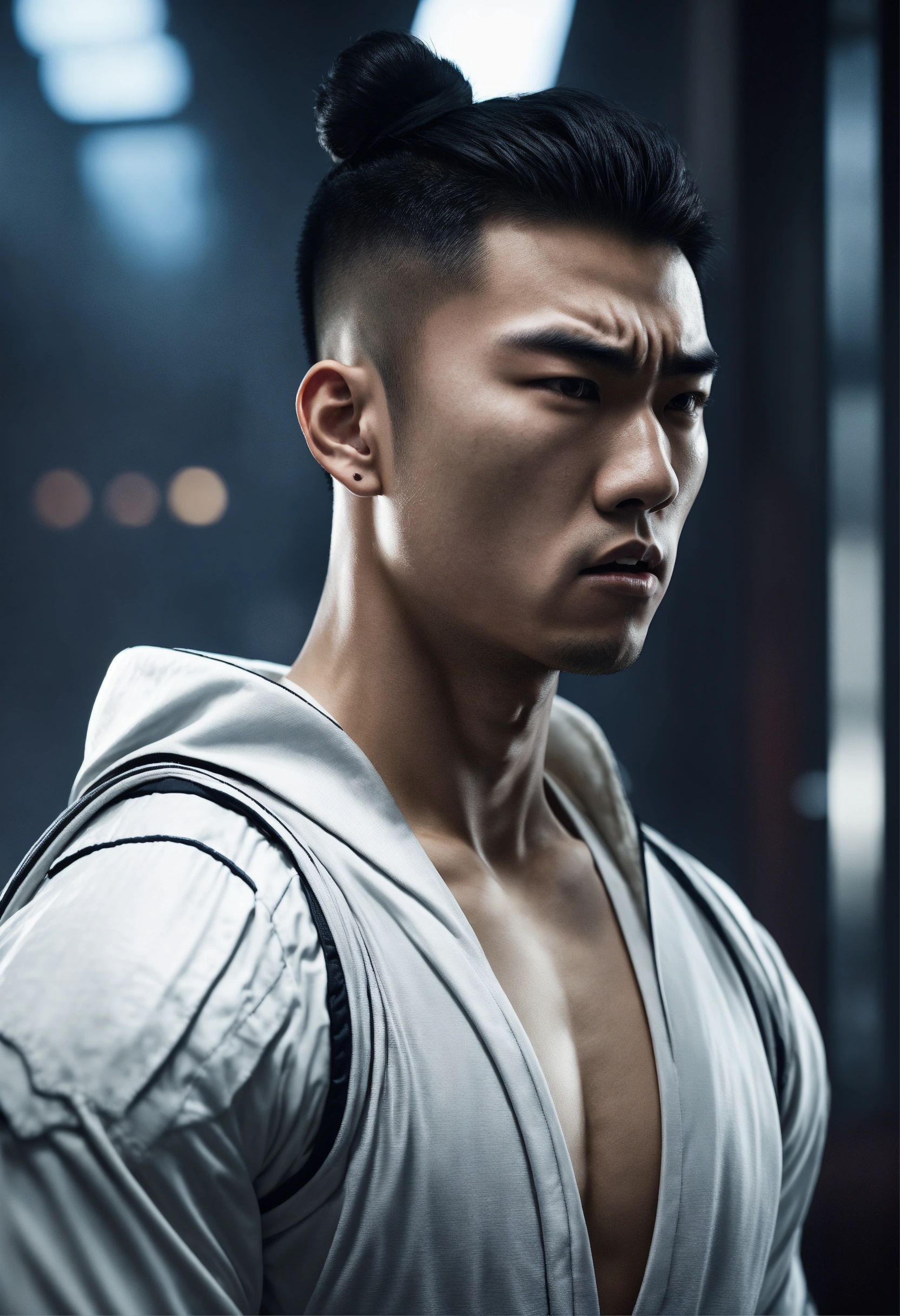 A realistic half body photo of an asian 20-year-old man with a very angry expression. thin fit muscled body, sharp nose, scary looking, with a samurai bun, wearing futuristic training clothing in a white sci-fi background. ultrarealistic, ultradetailed, 8k