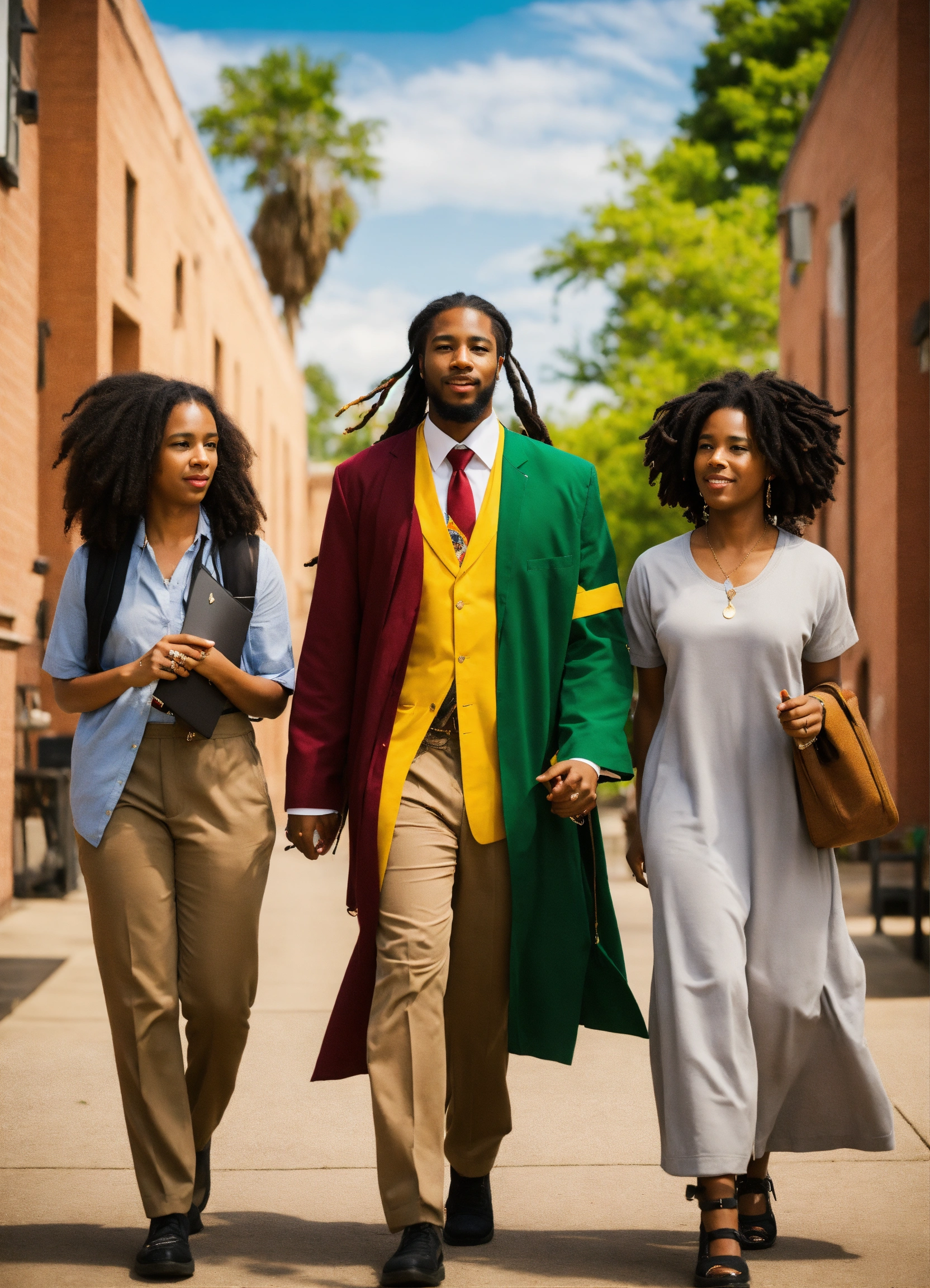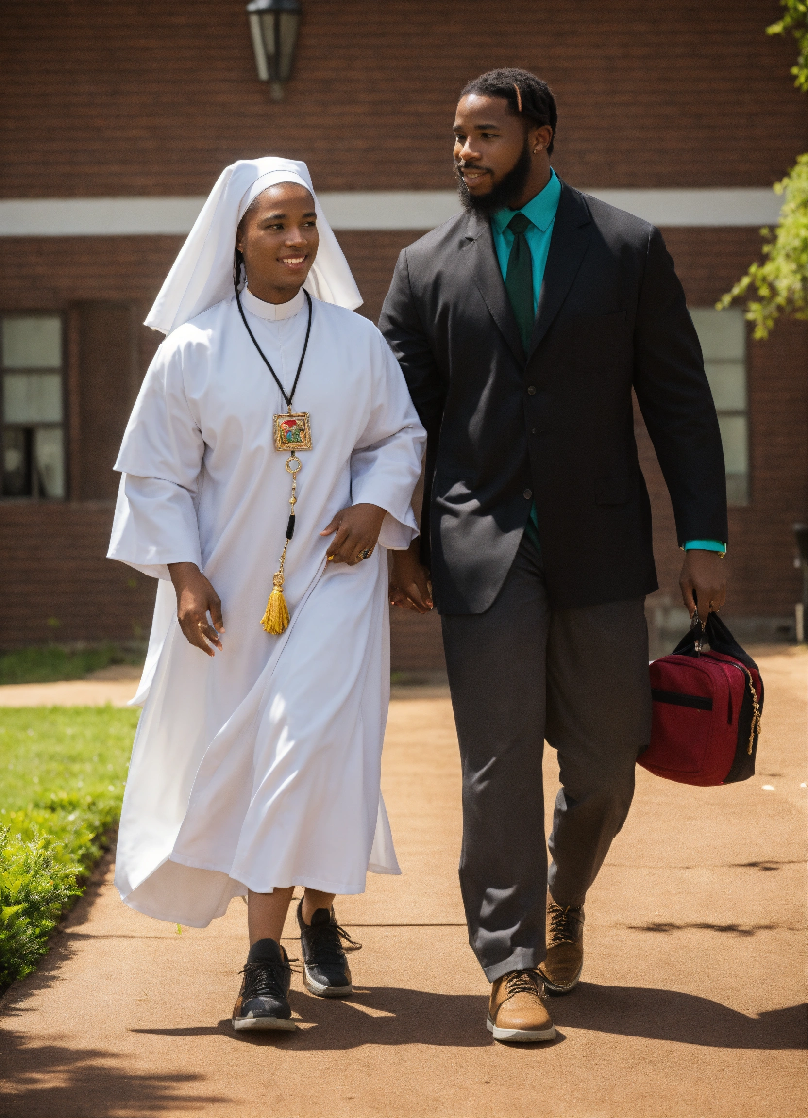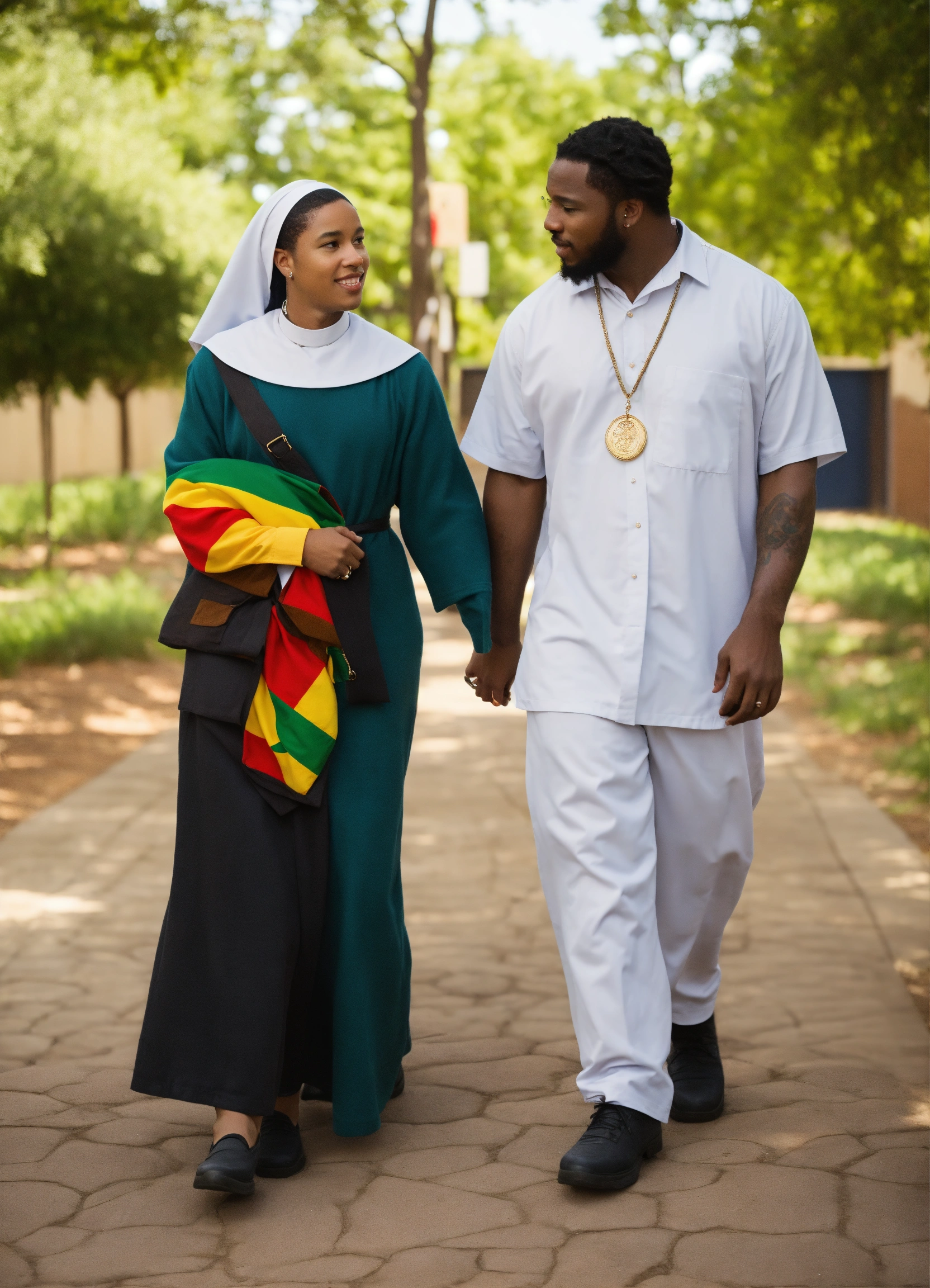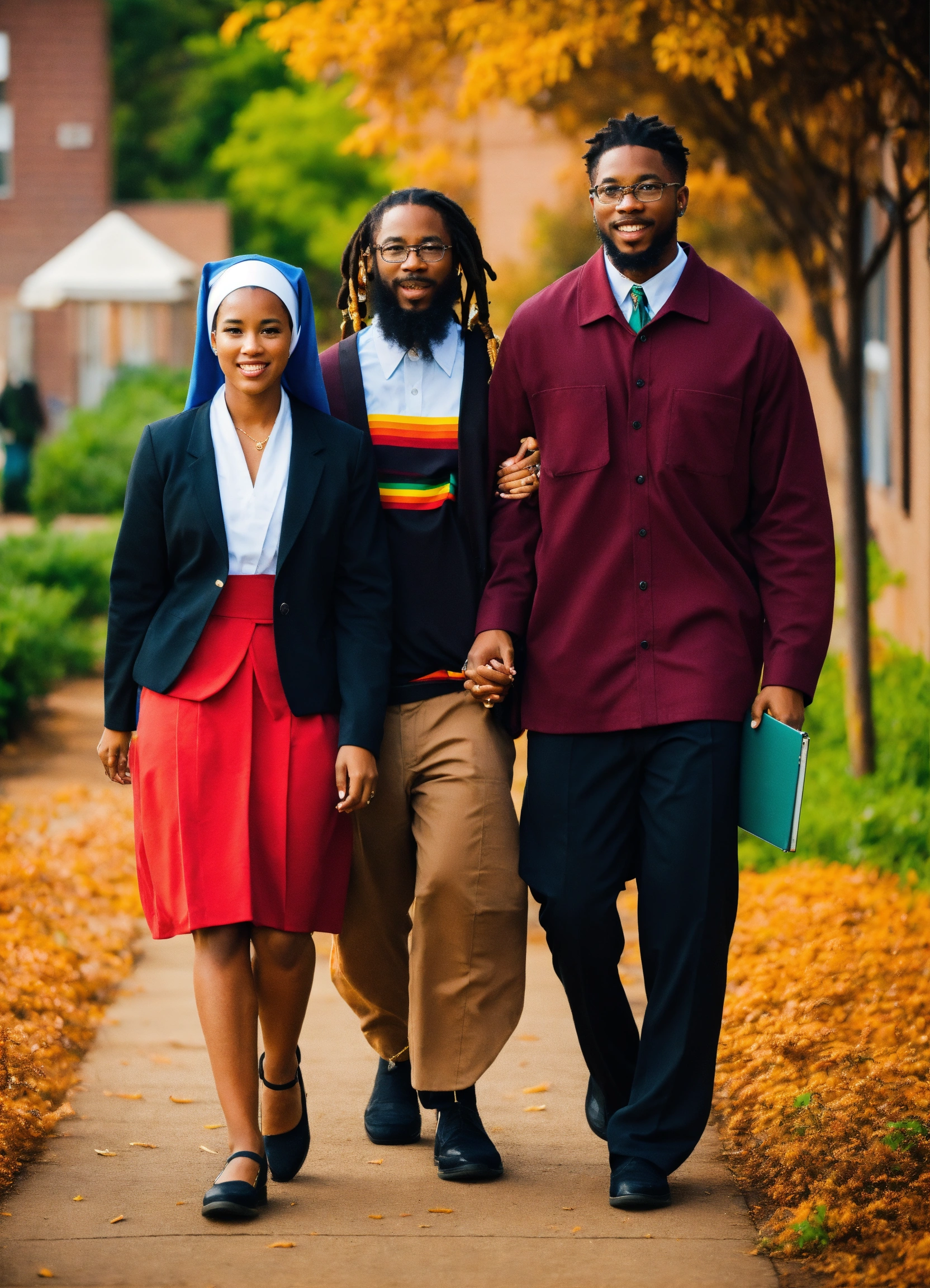 Biracial nun walking arm in arm with black male teacher and black female rastafarian teacher