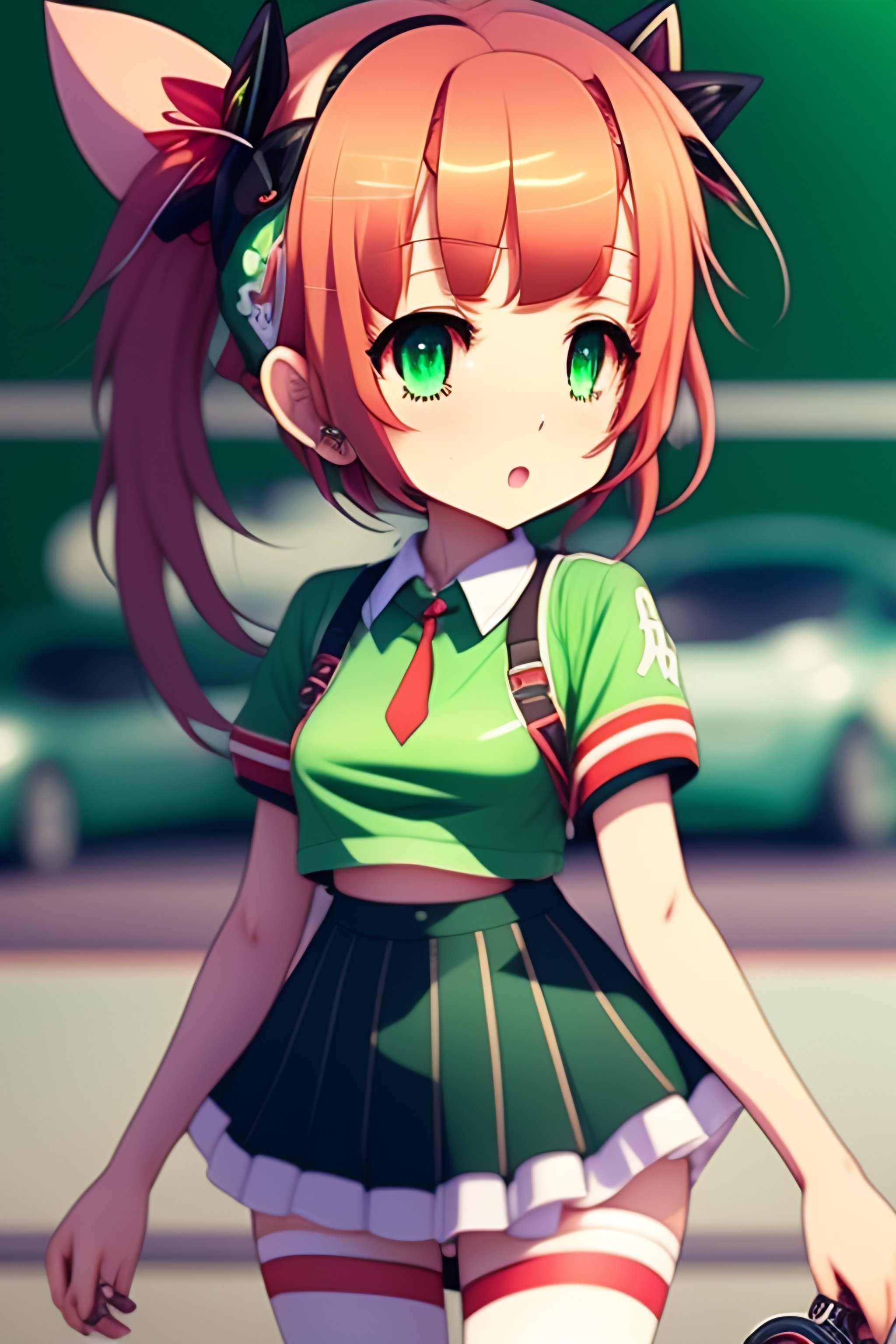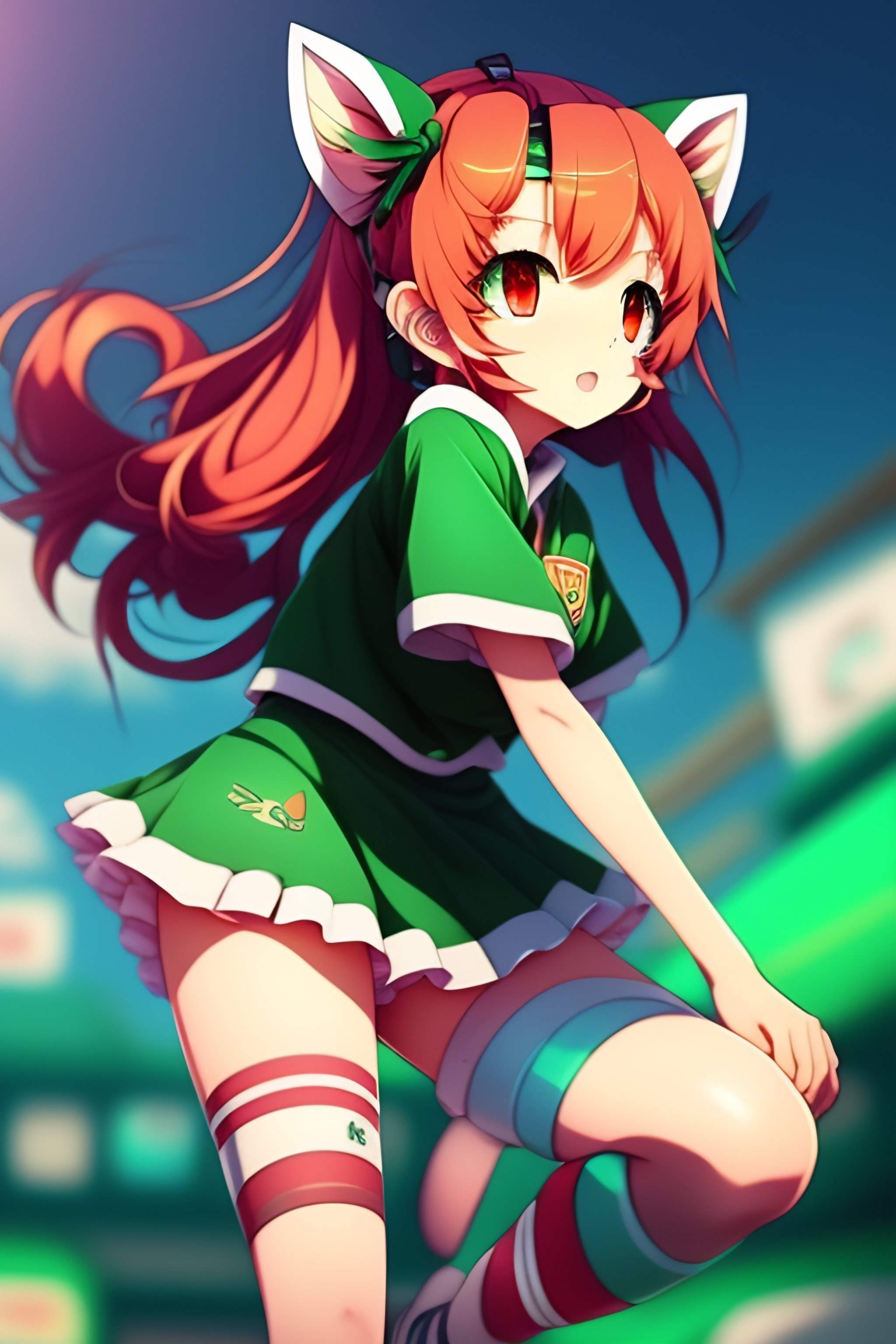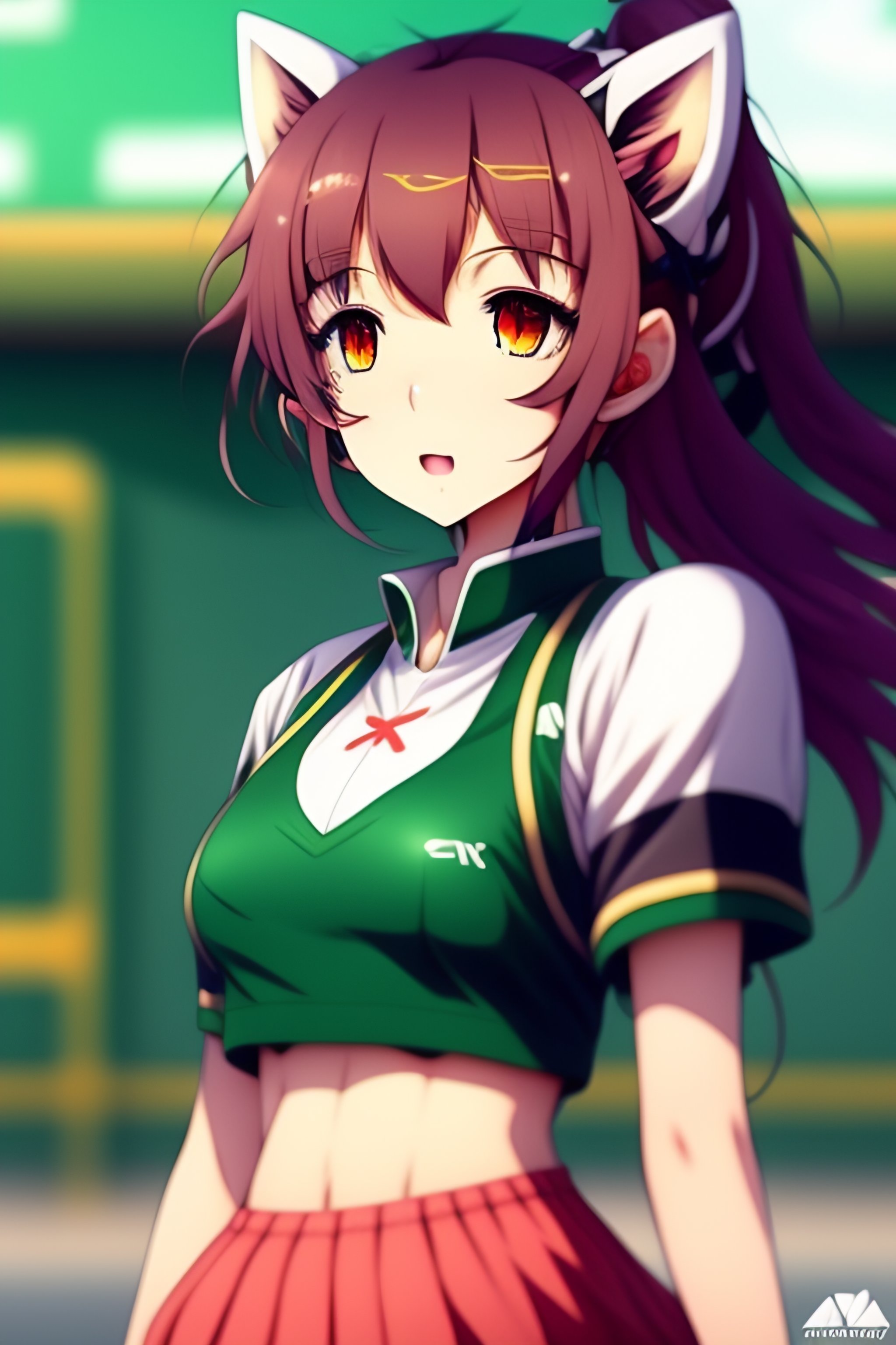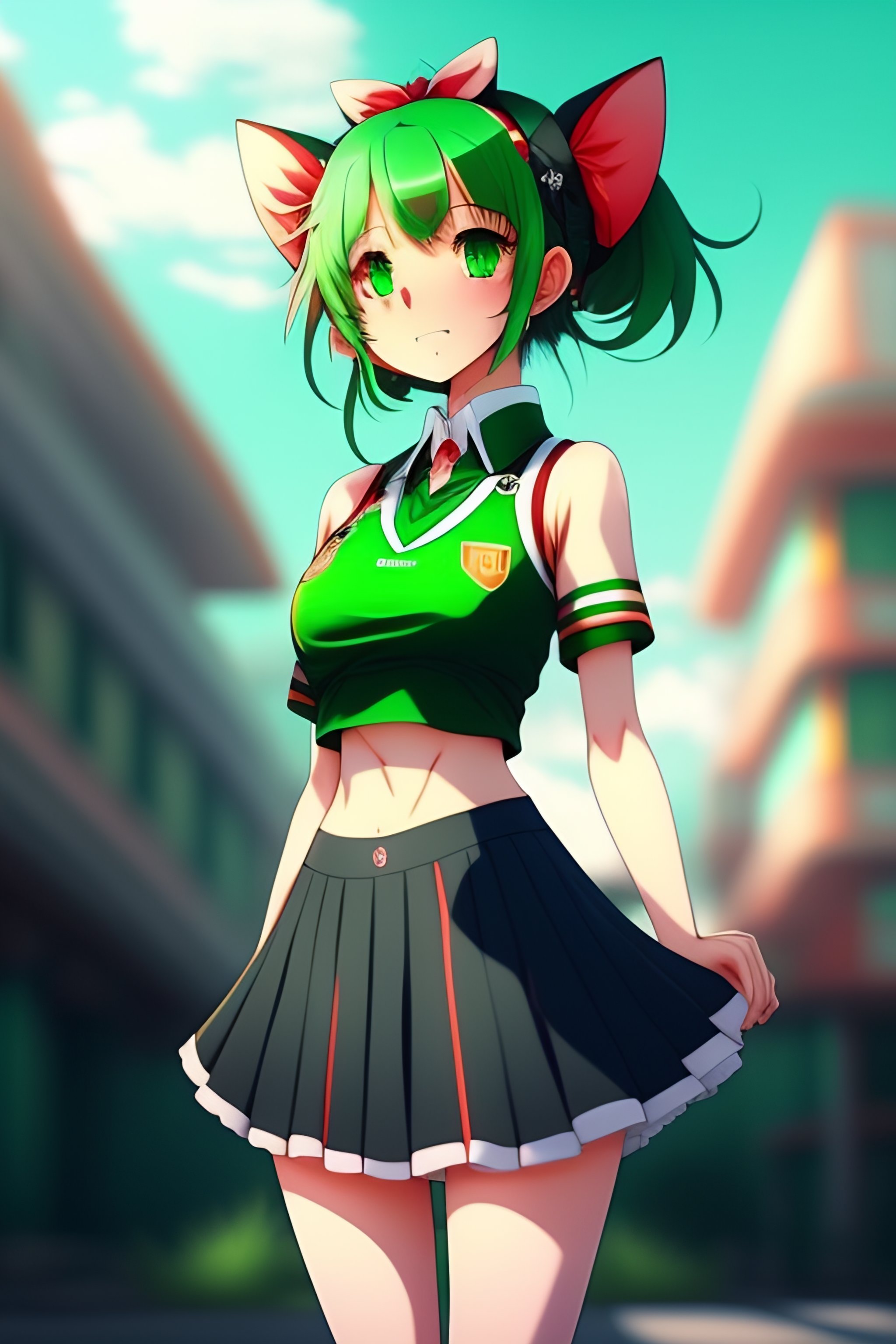 Cute anime girl, green hair, small cat ears, pale skin, sport clothing, legs, very coherent, eycollor red, short skirt, belly, collor, collar, school in background