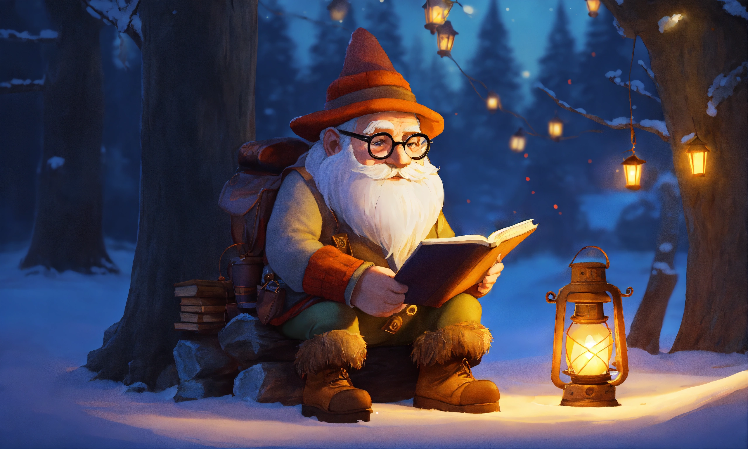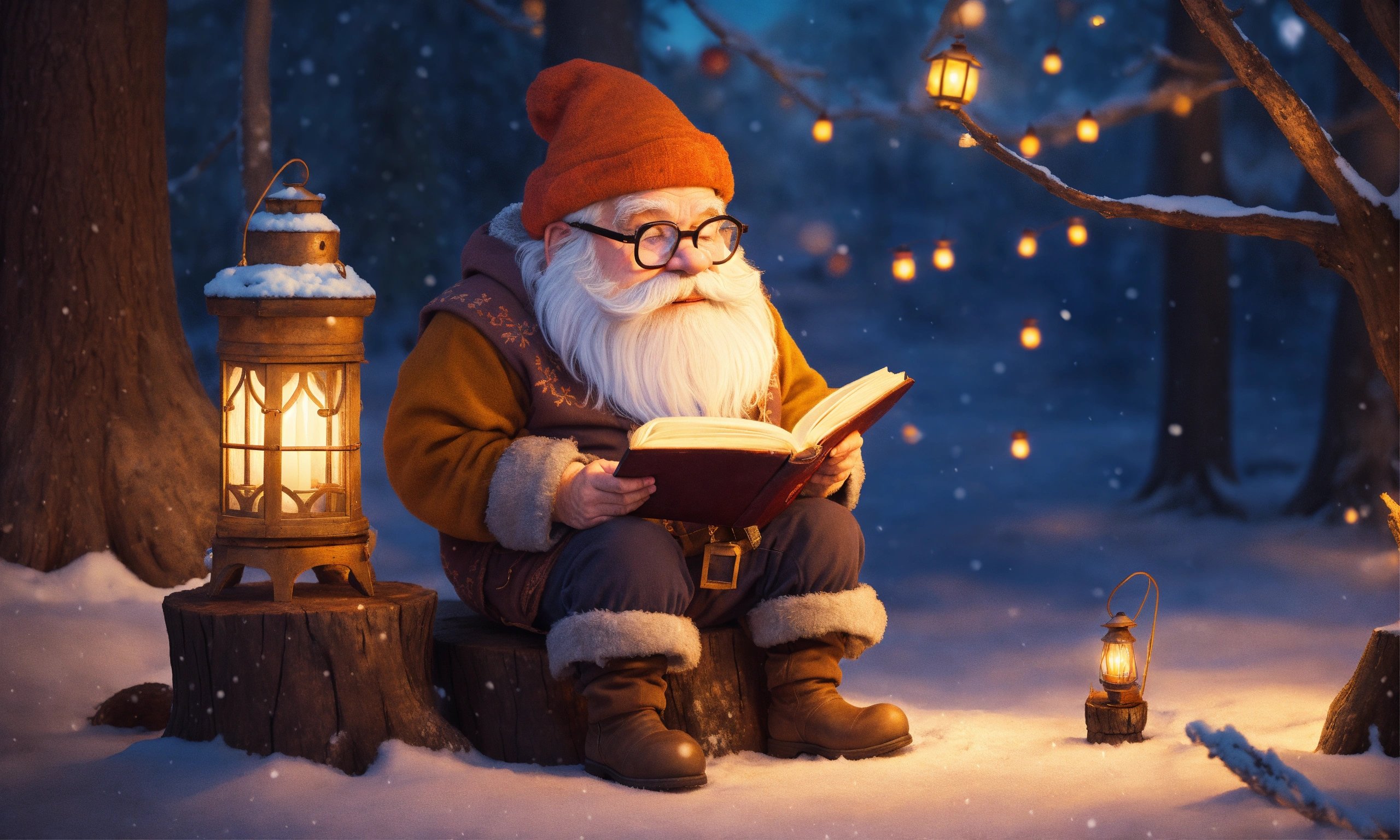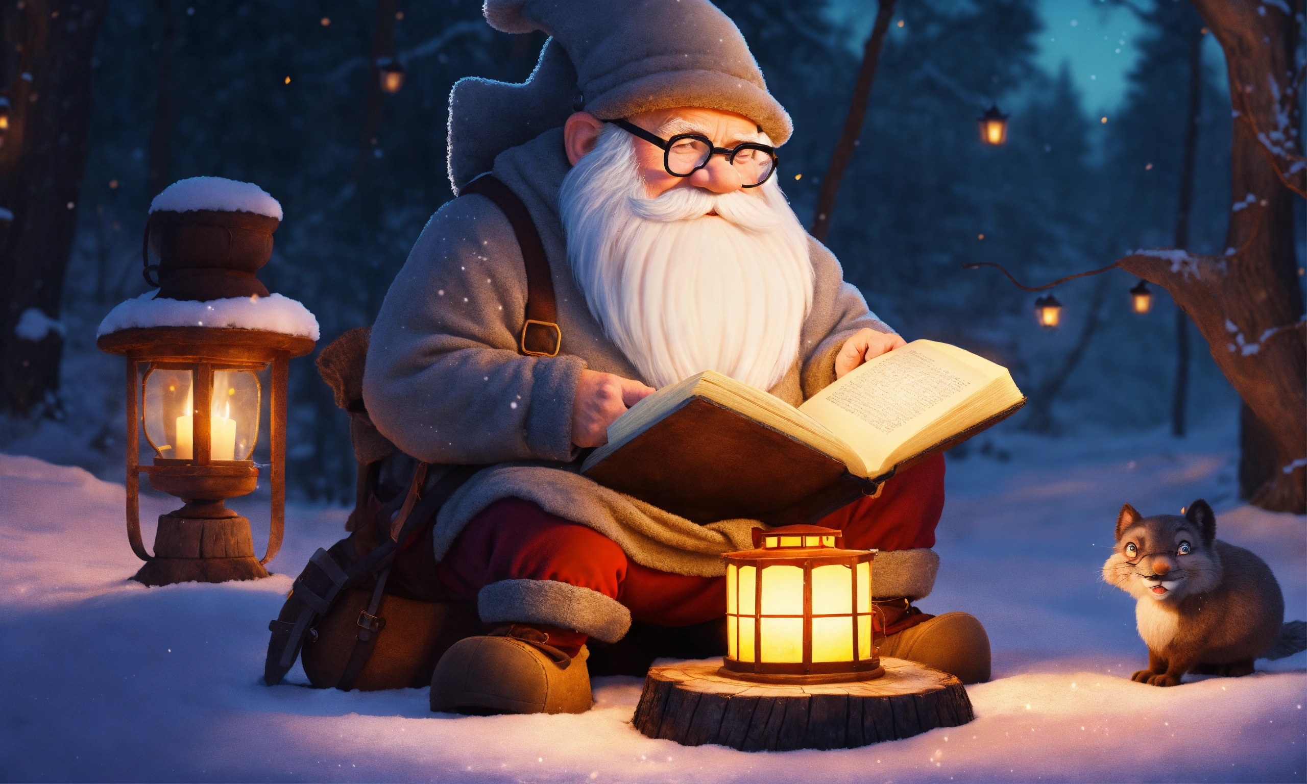 An old personage like dwarf with a gray beard and glasses sits on a stump and reads an old book, winter land with lanterns, pixar art style