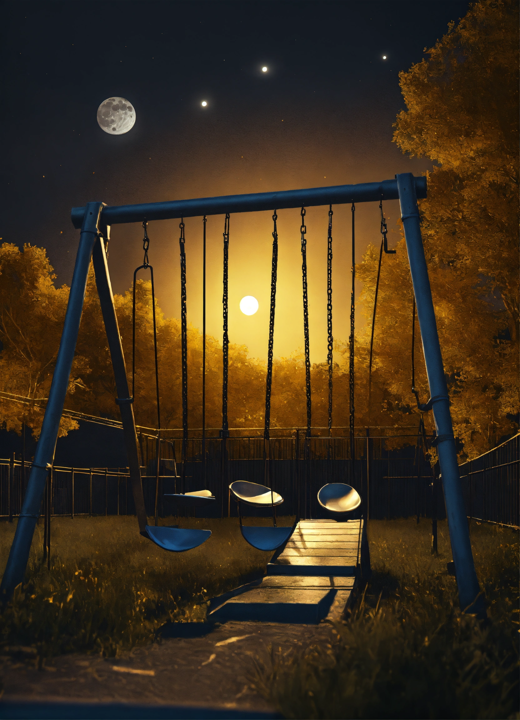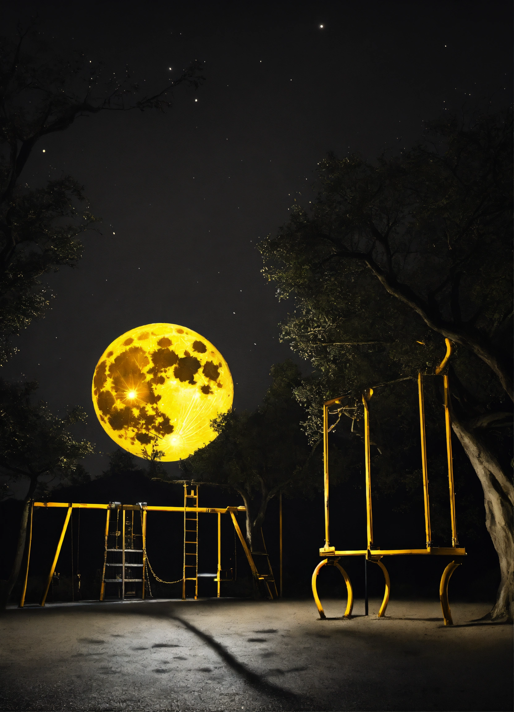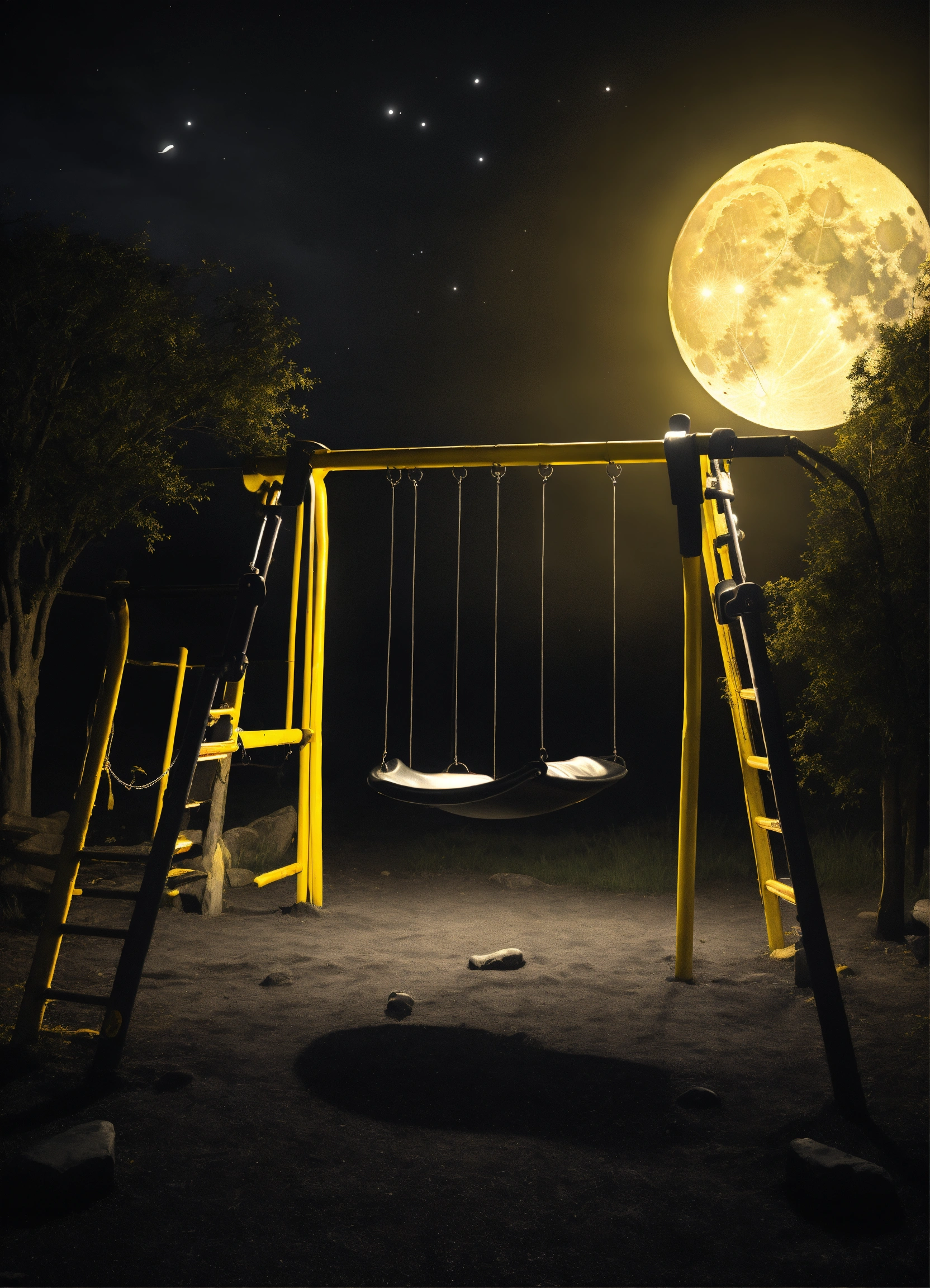Photorealistic, black and white, deep night, dark playground, fullmoon, spooky atmosphere, swing, slide, calm, dark shadows, yellow moon, highly detailed, 8k, q2