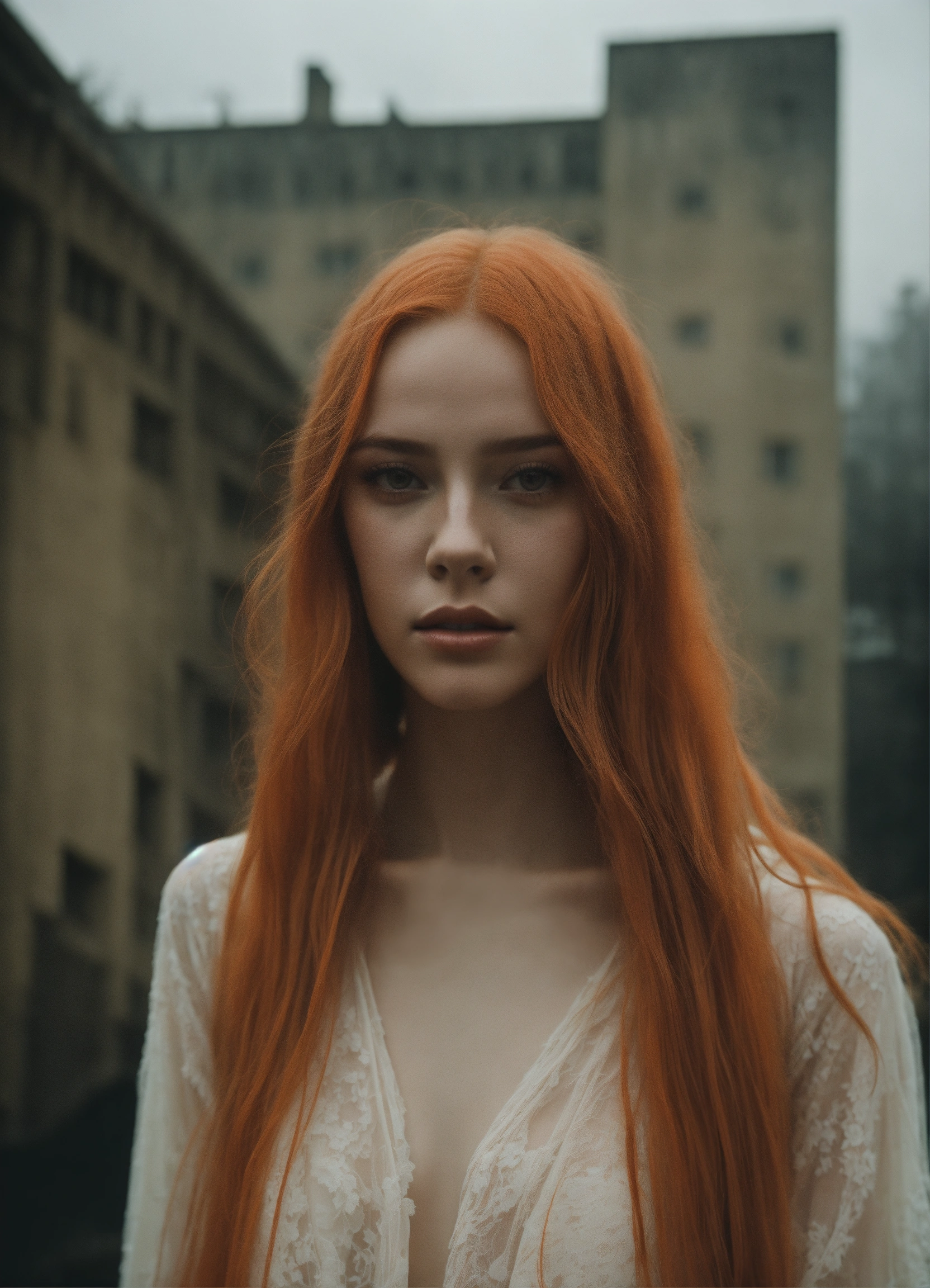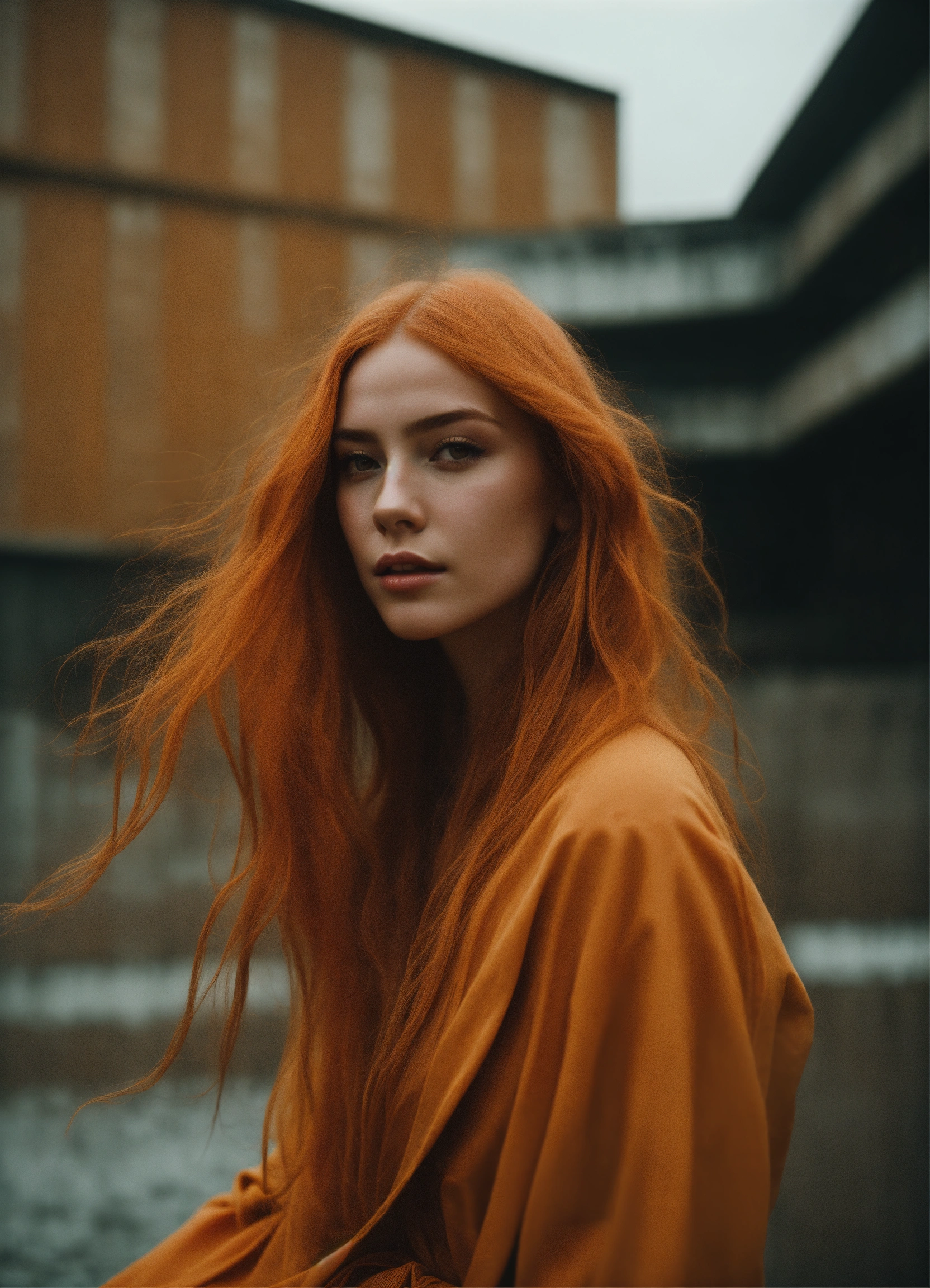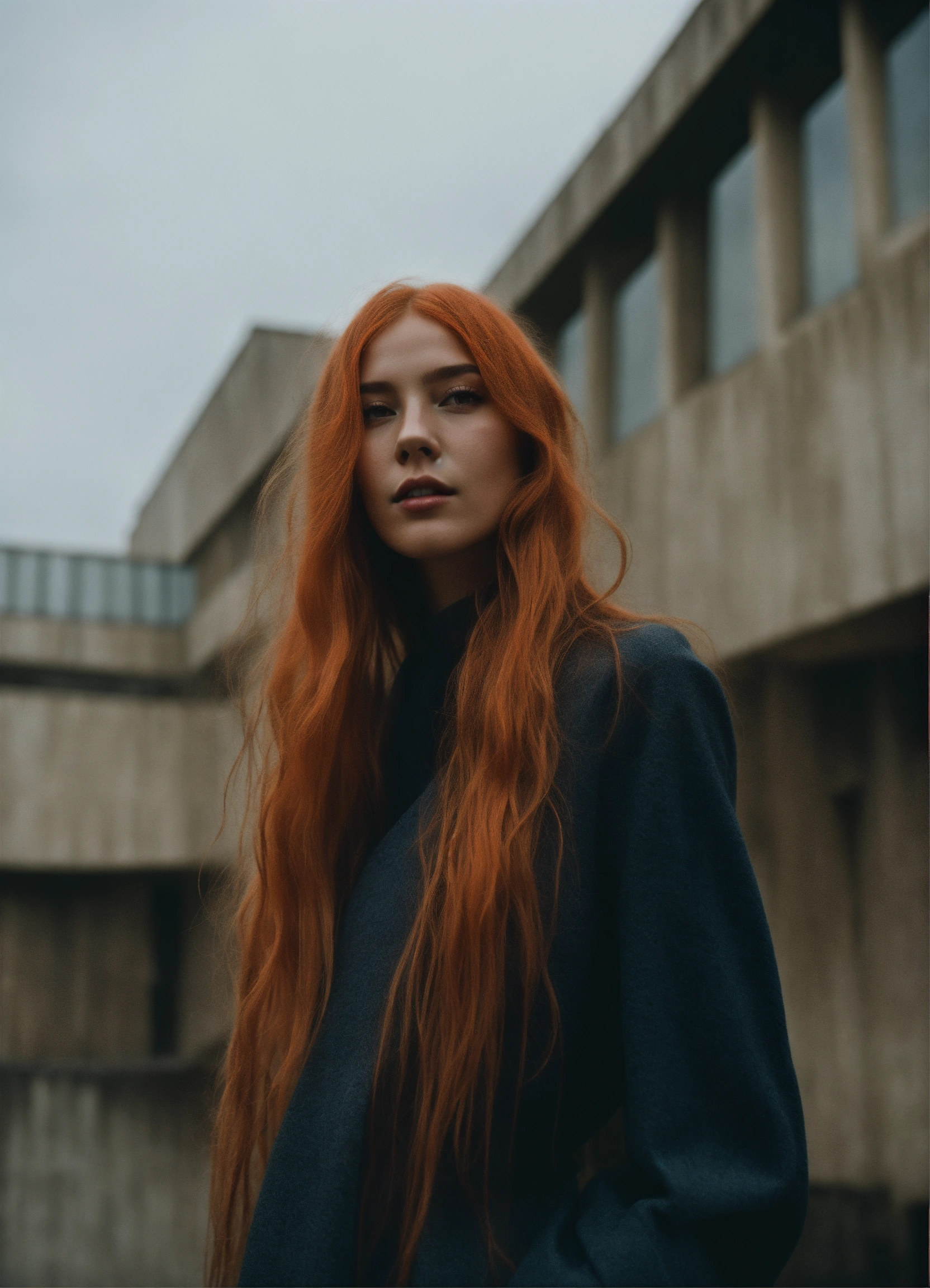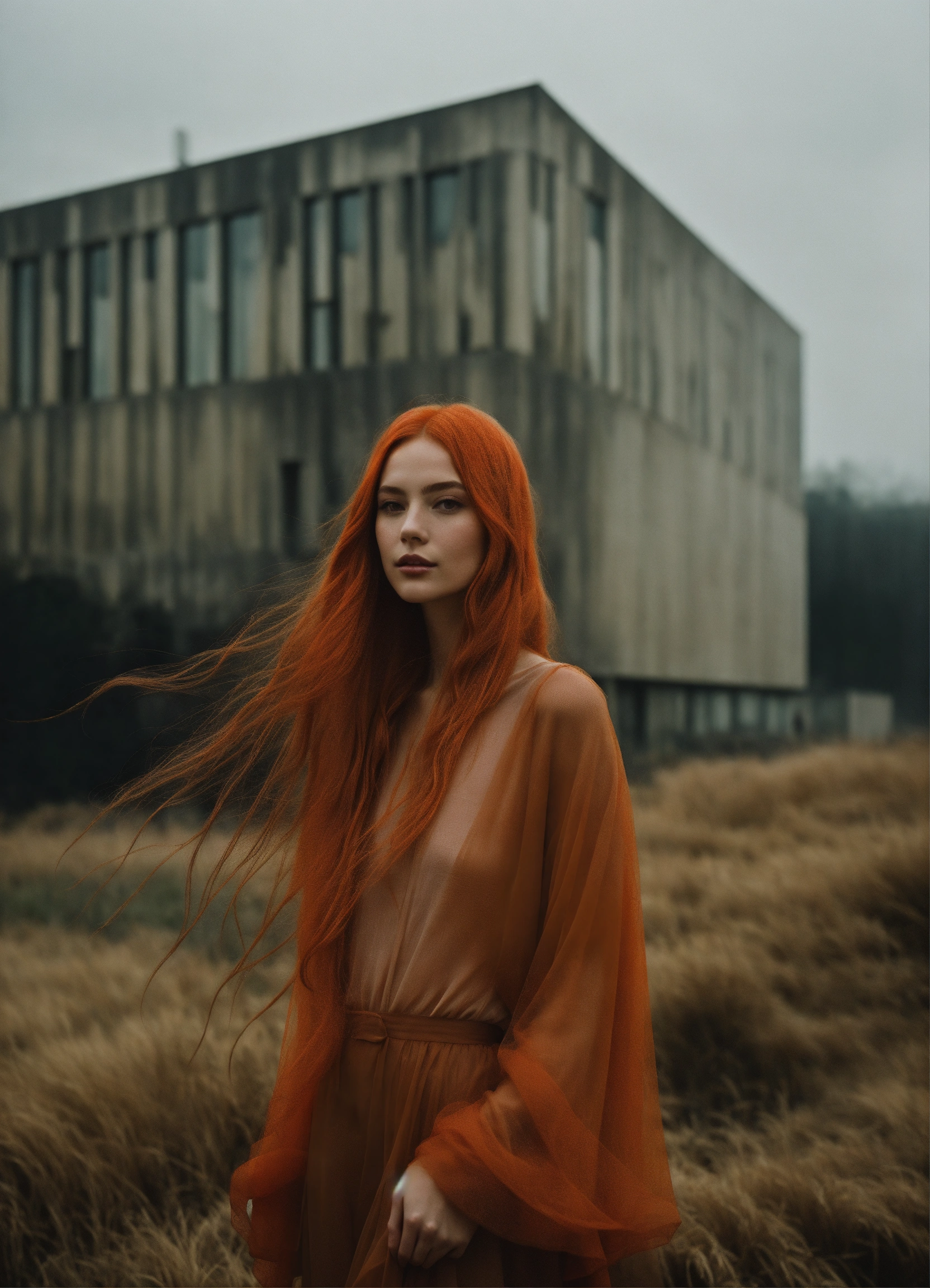 Portrait of haute couture beautiful fashion model with long orange hair, ethereal dreamy foggy, photoshoot by alessio albi, editorial fashion magazine photoshoot, fashion poses, in front of brutalist building architecture. kinfolk magazine. film grain. a soft smile