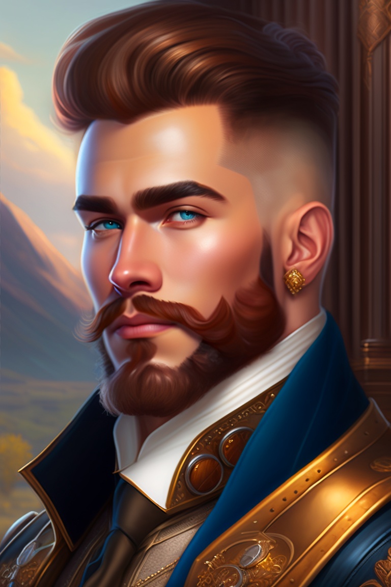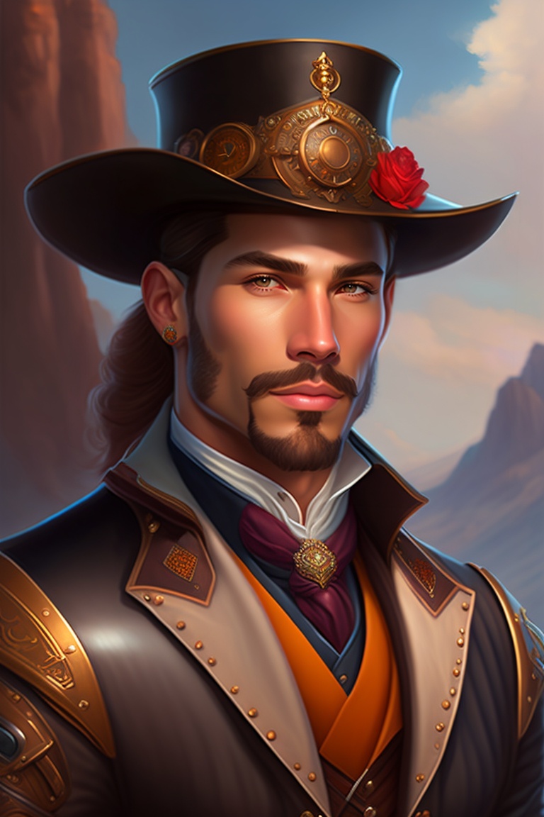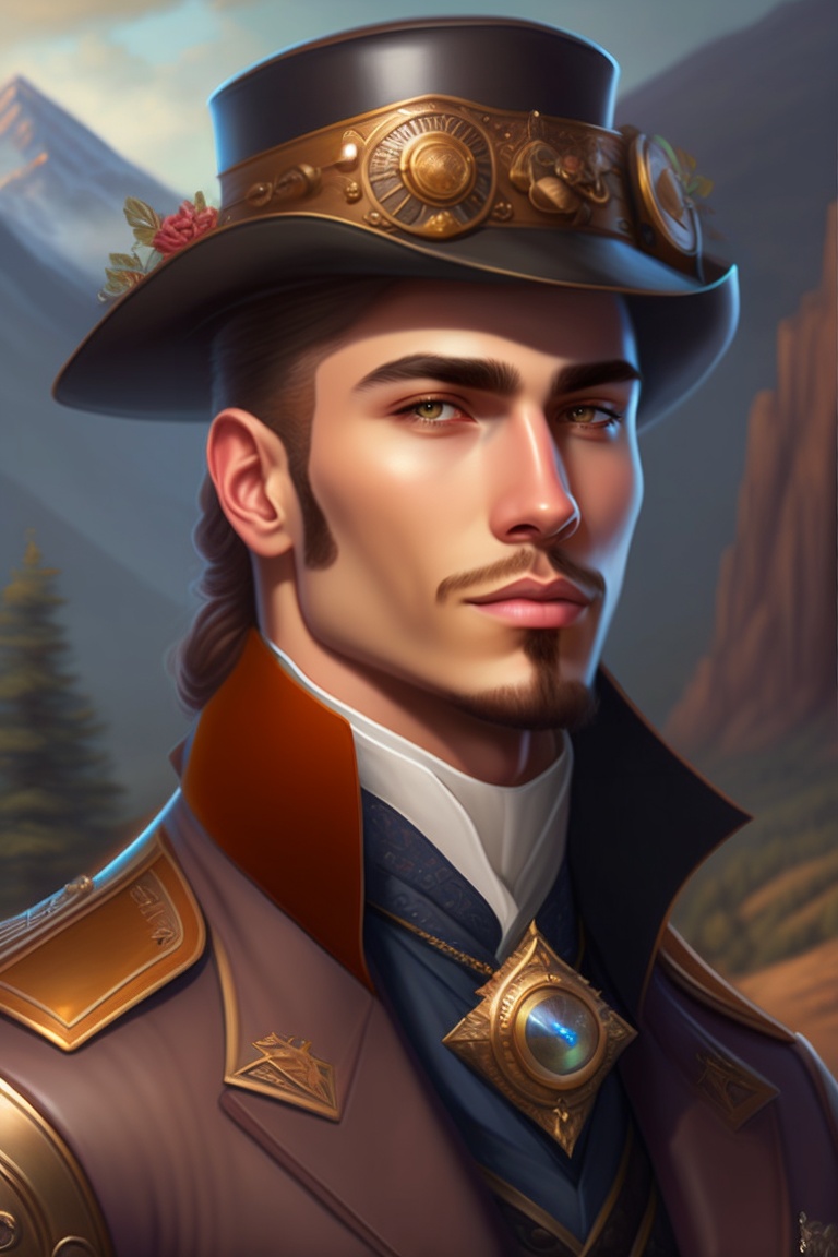 A portrait man in steampunk style clothes, oil painting, beautiful colors, body art, trending on artstation, sharp focus, studio shot, intricate detail, highly detailed, mountains in the background, by wlop, by greg rutkowski
