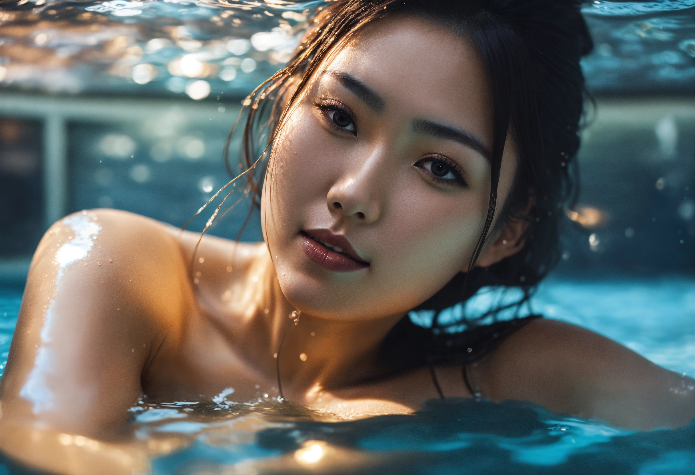Photo realistic gorgeous japanese woman swimming in hot tub