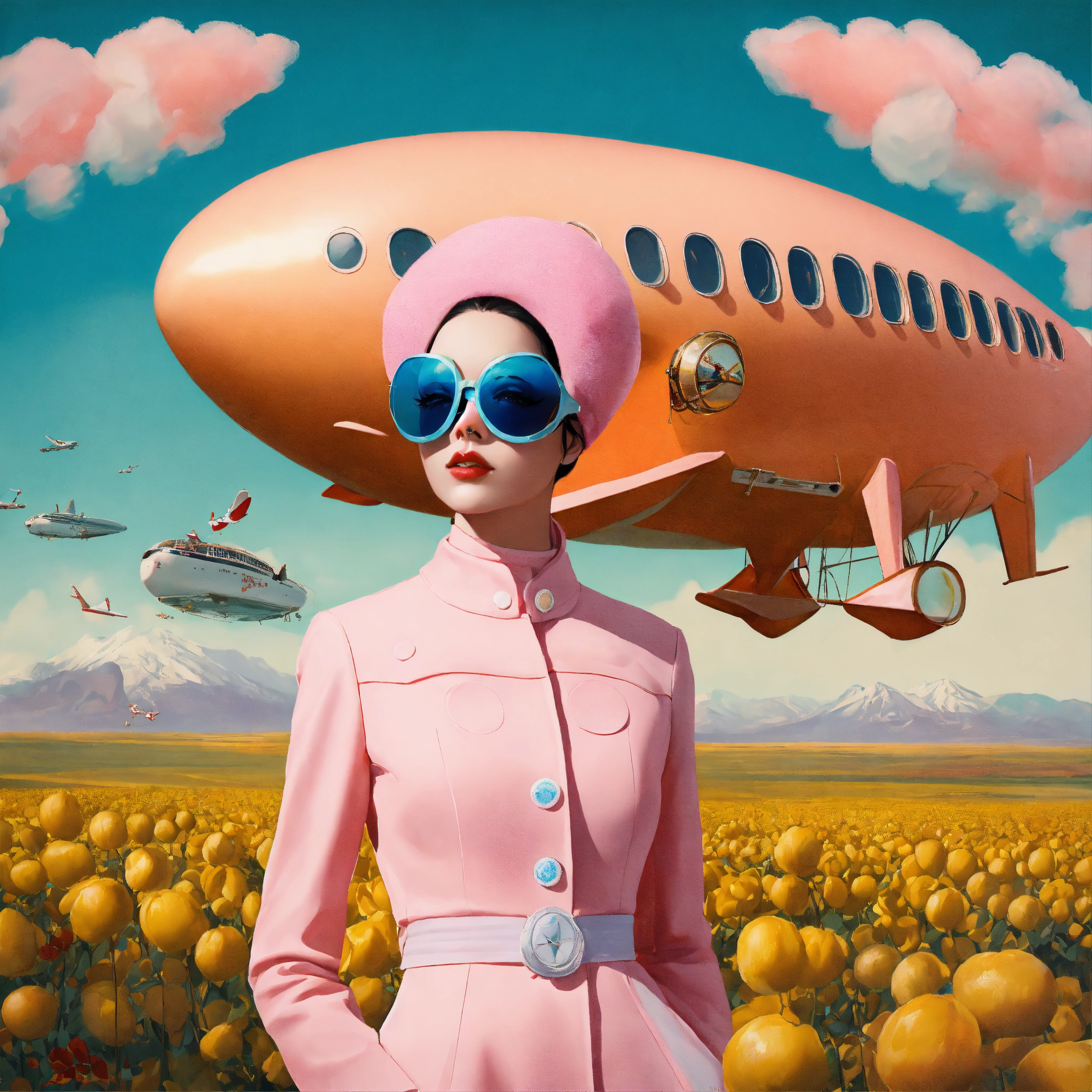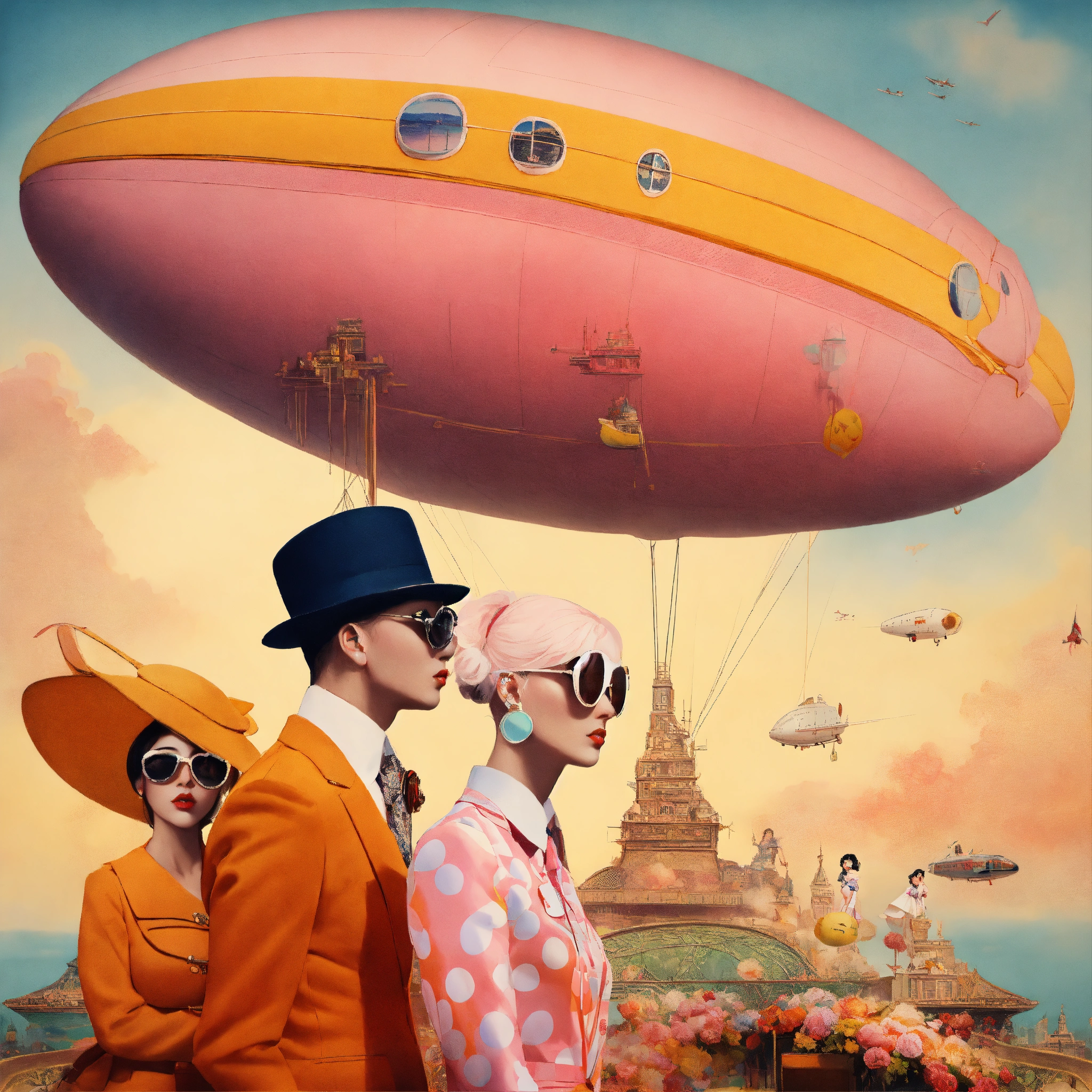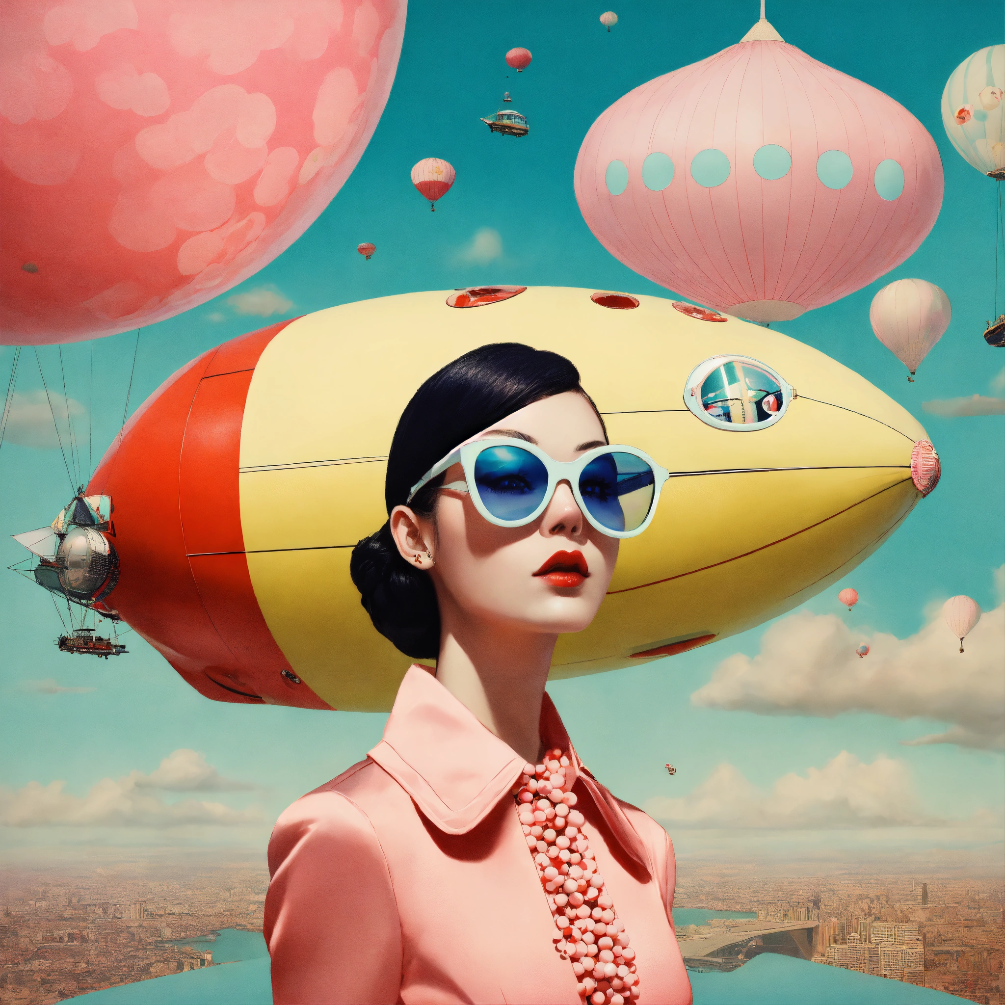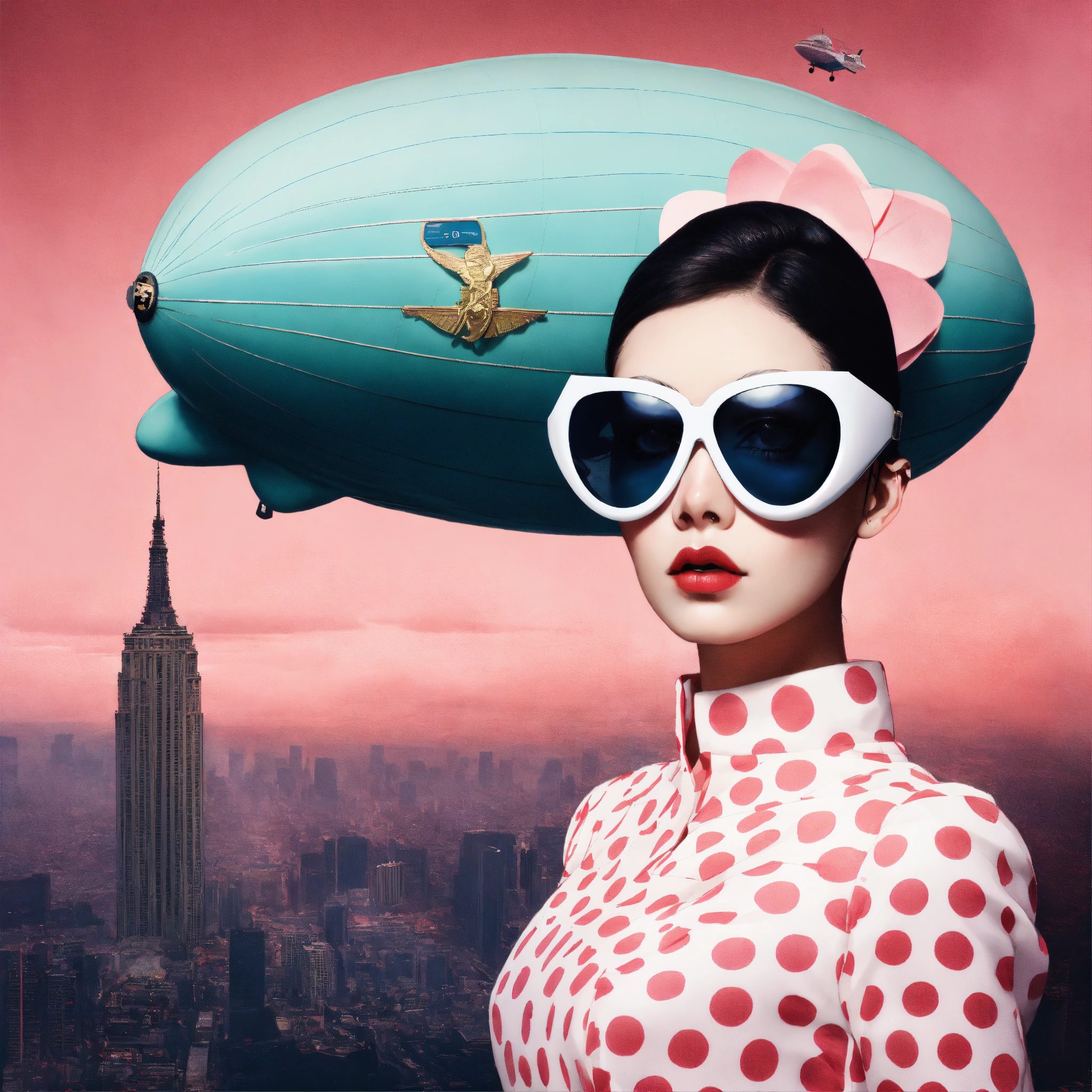 Front portrait photography, polkadot 60's pastels color, in front of a large flying zeppelin, 2 asian pop courreges attractive air hostess with large sunglasses mask, 80 degree view, art by sergio lopez, natalie shau, james jean and salvador dali
