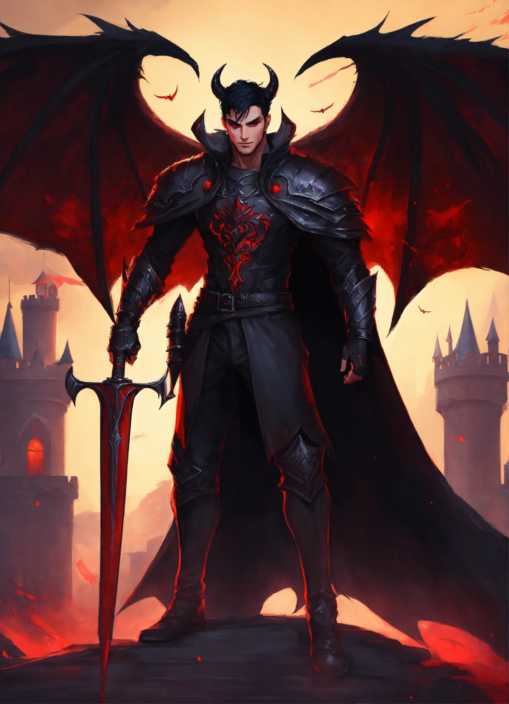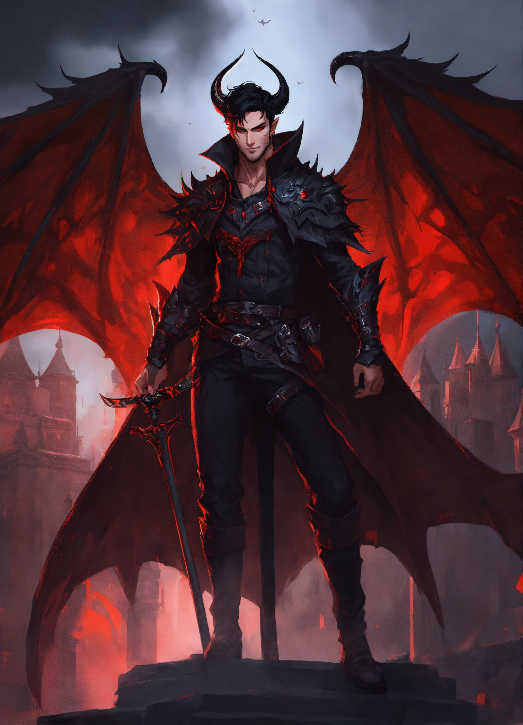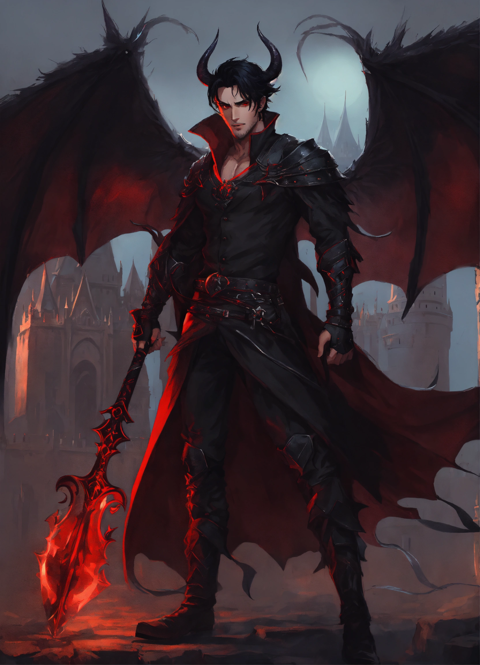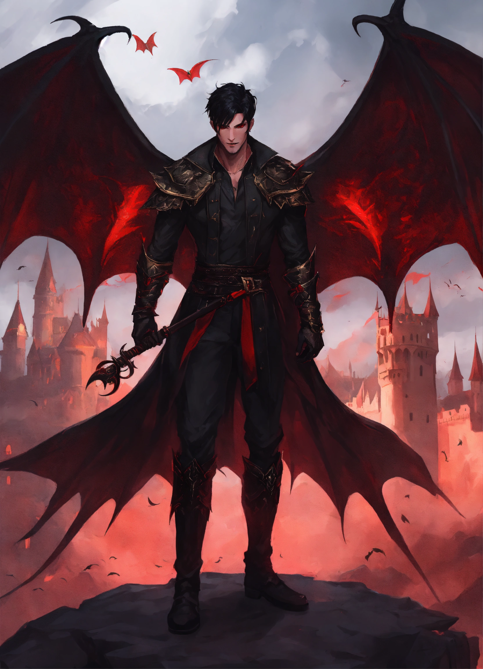 A handsome half demon man with huge bat wings, red eyes and short black hair, dnd character dangerous mystery dark clothing castle, king of hell