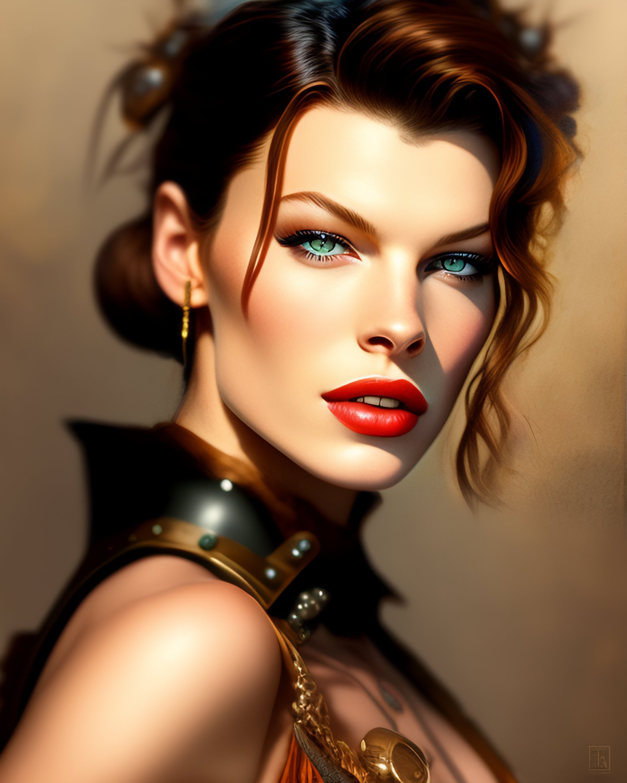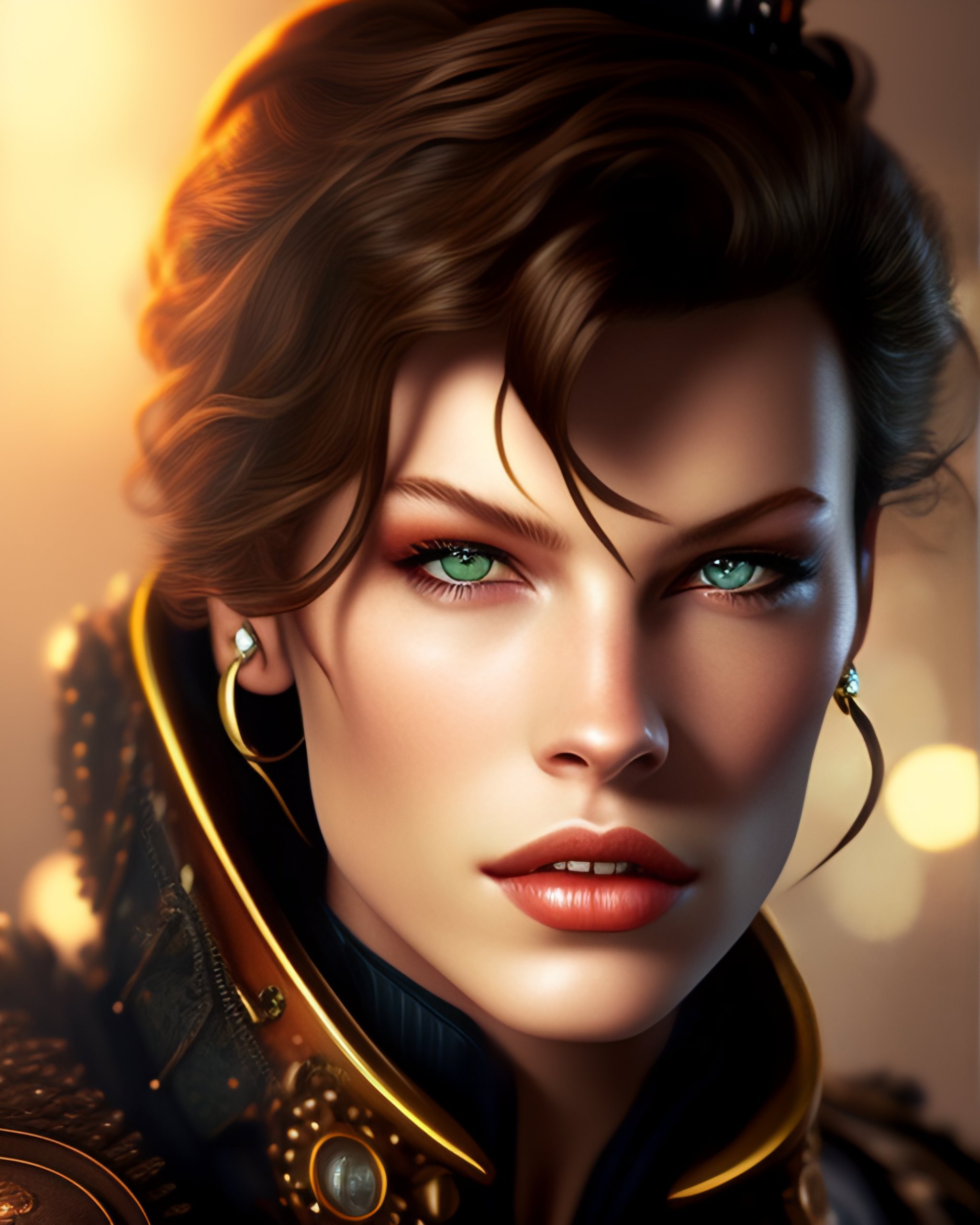 Young milla jovovich as a steampunk warrior, grungy, glowing eyes, photo realistic, radiant skin, perfect face, intricate, promotion still, trending on artstation
