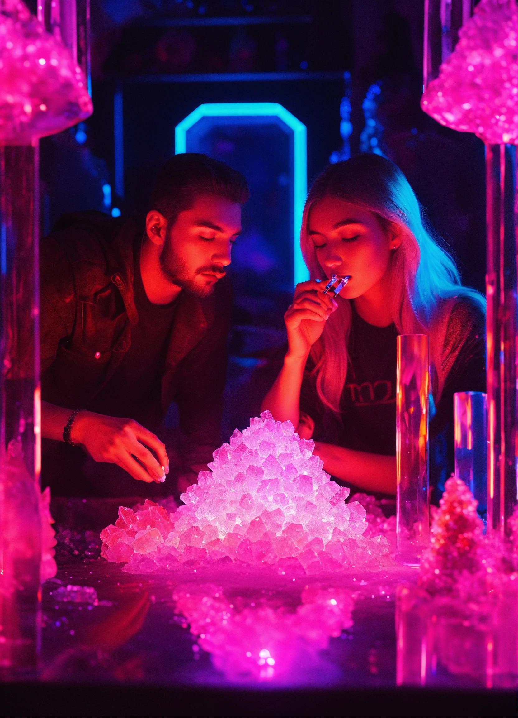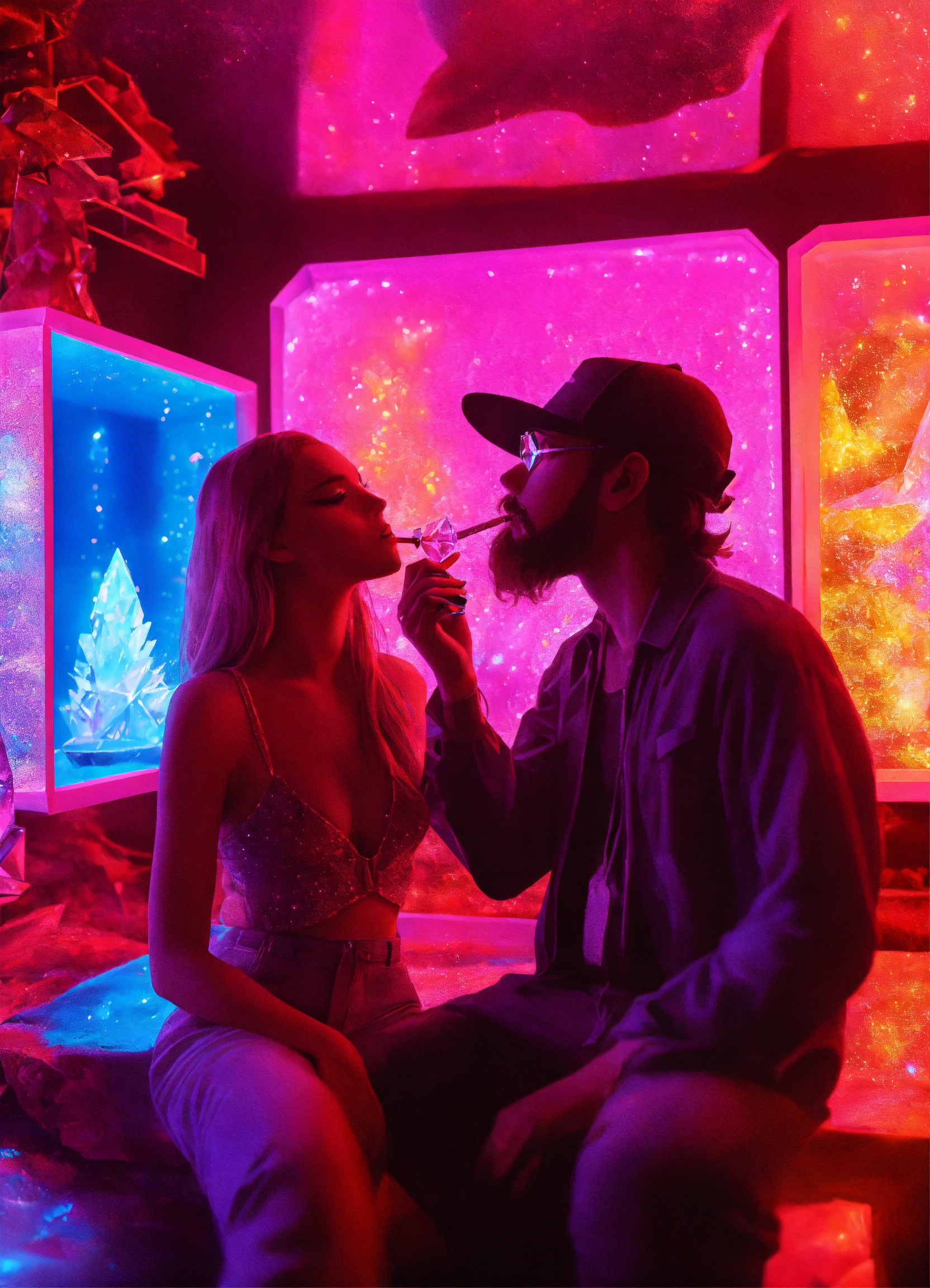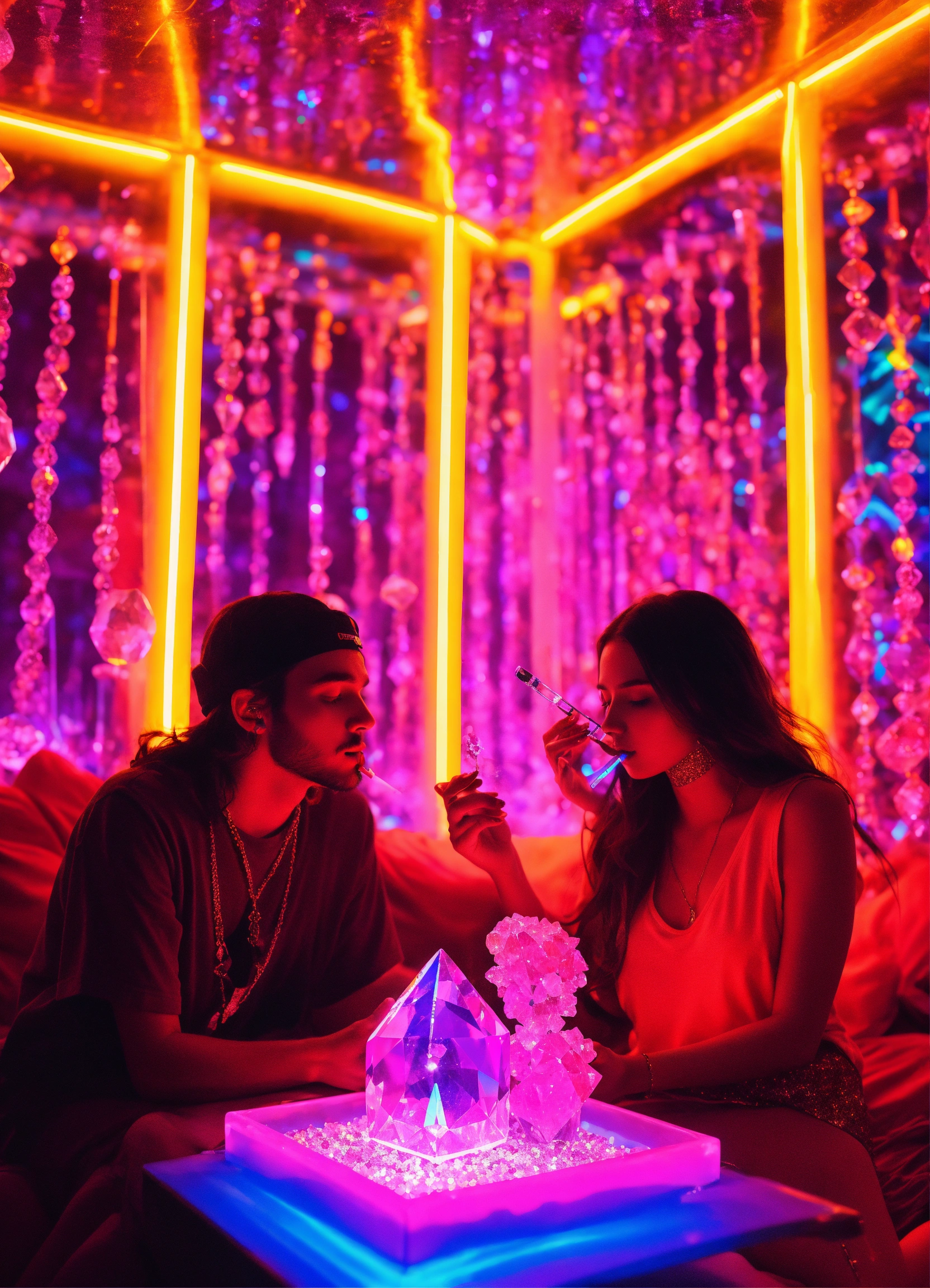 Photorealistic a crystal couple smoking crystals in crystal bongs in a dmt glitter neon room experiencing crystal dmt neon ascension