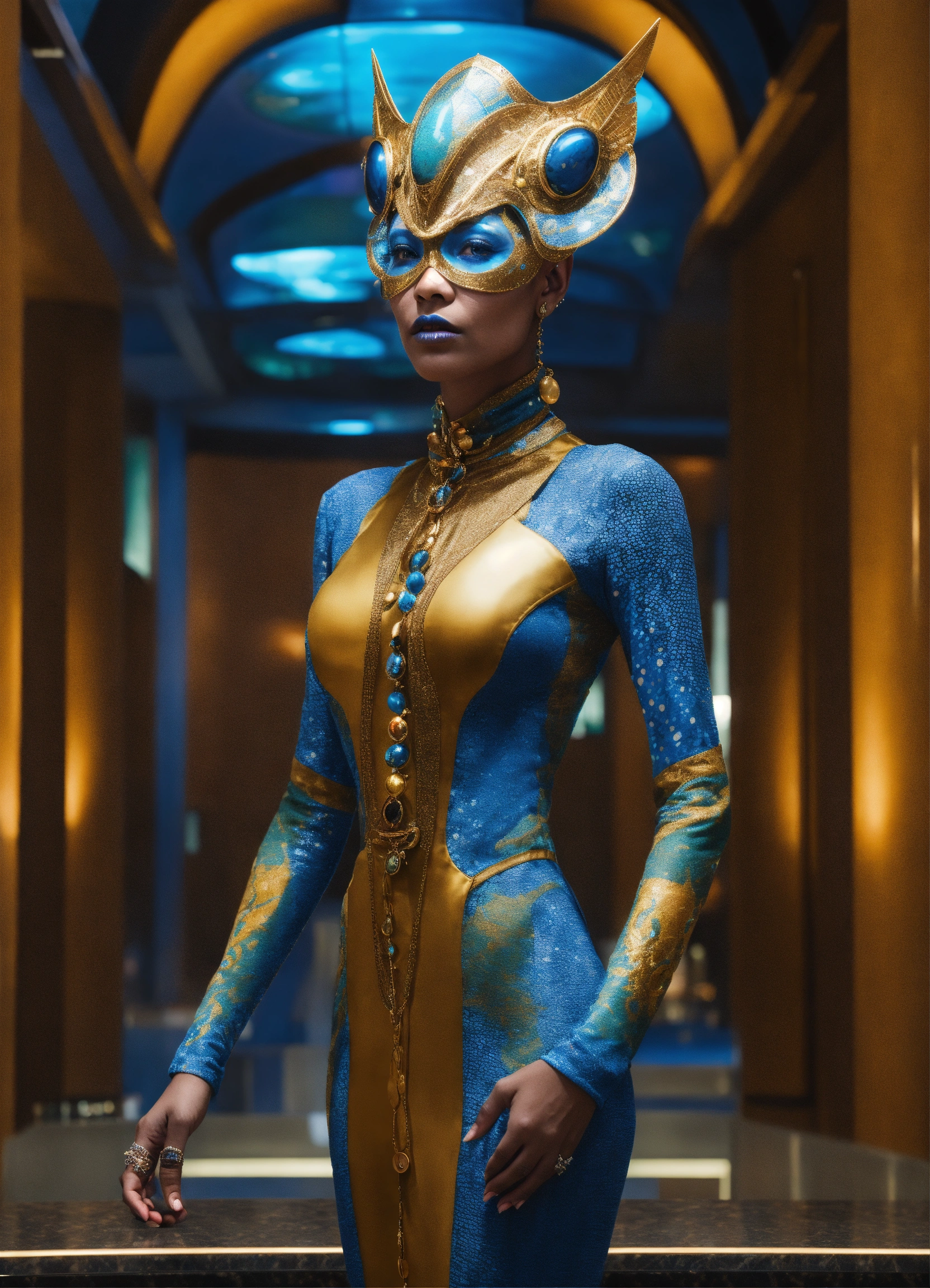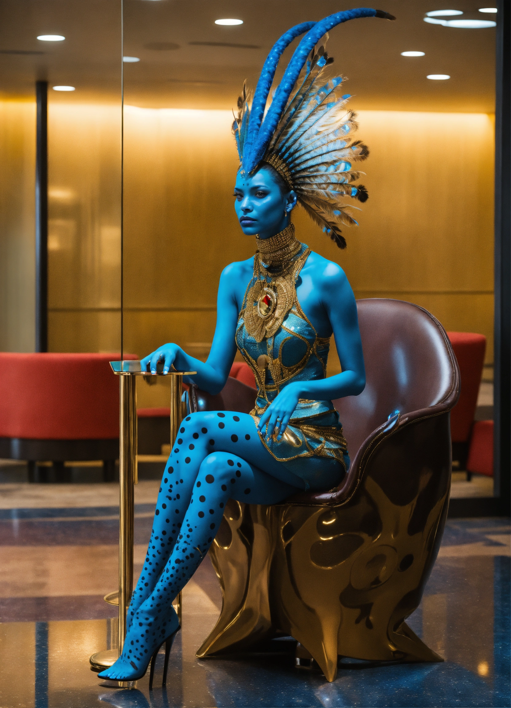 An indigenous alien female, with blue spotted skin. hour glass frame. dressed in formal wear. in lobby.