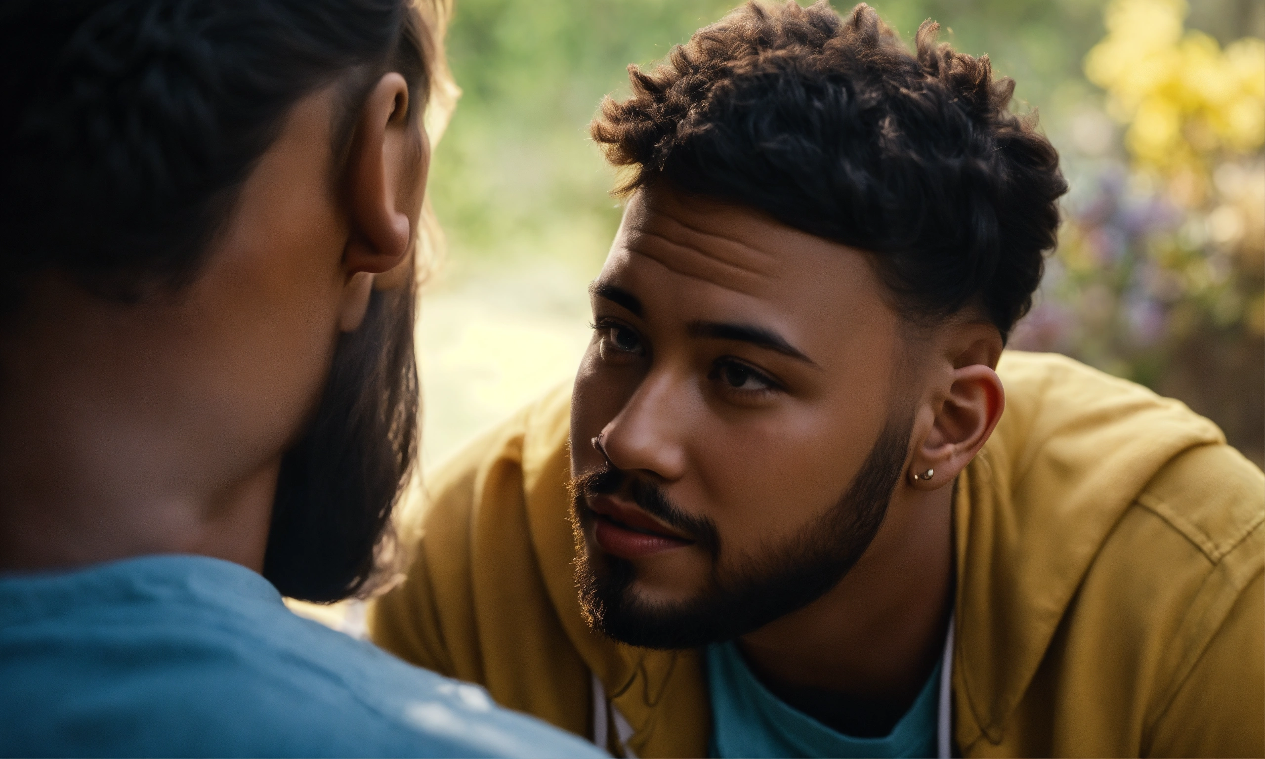 To celebrate the world mental health day generate a photo-realistic picture of a friend looking at another friend kindly listening and supporting him