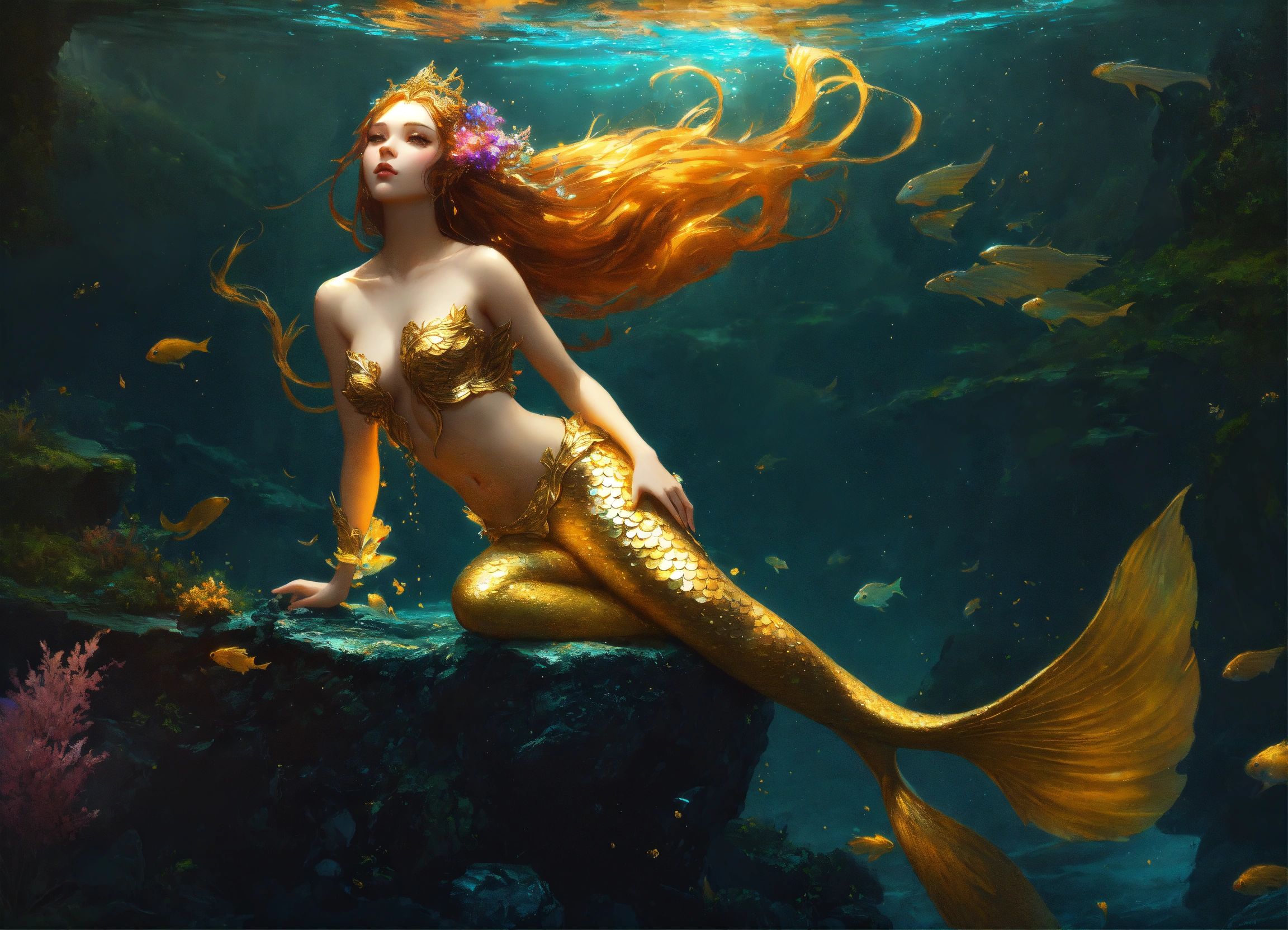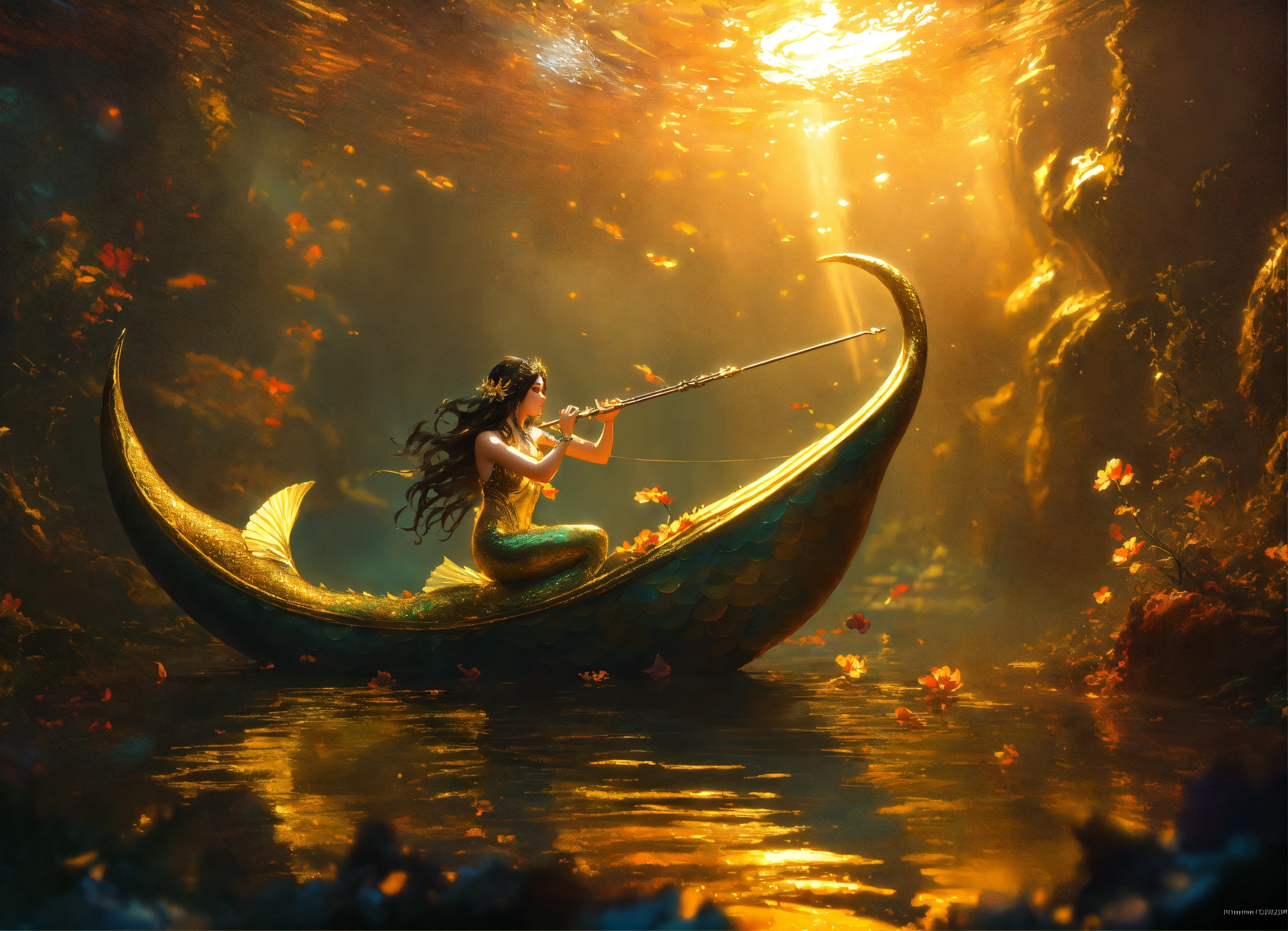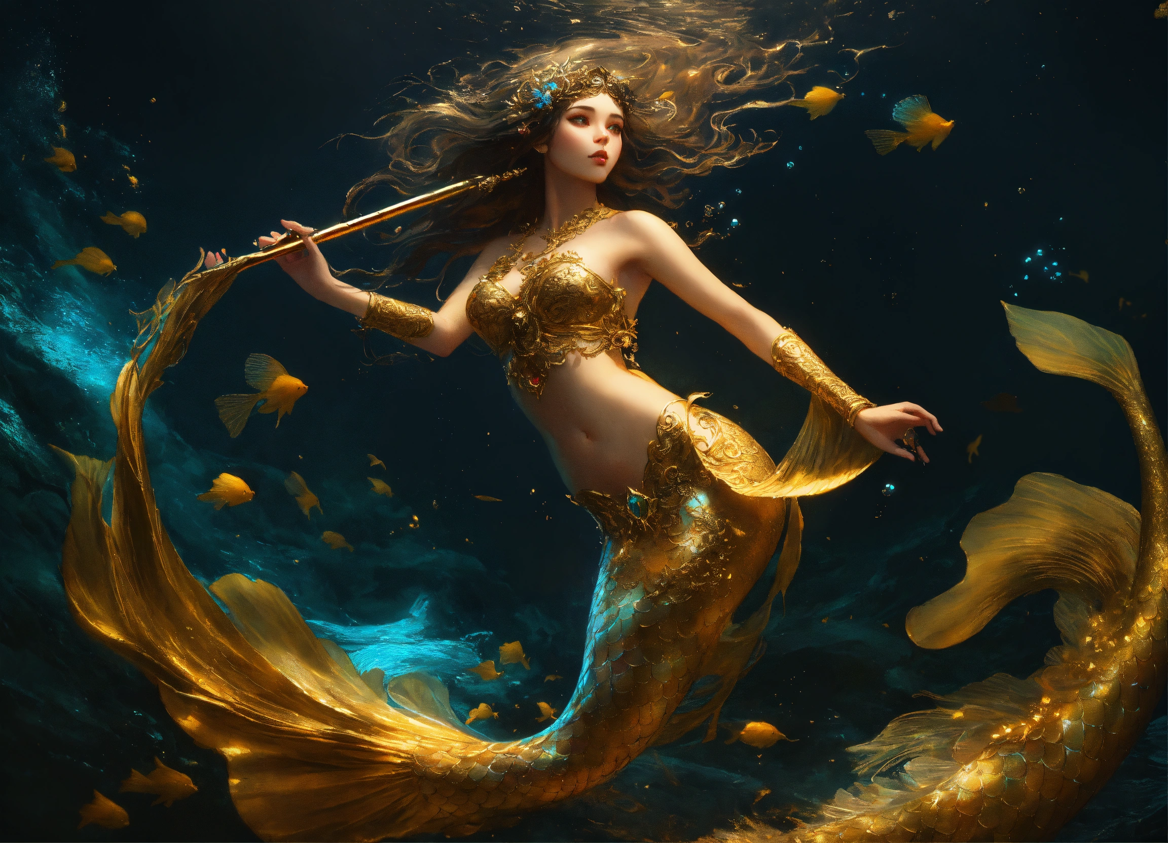 Insanely detailed illustration of a full body majestic mesmerizing mermaid playing a golden flute, flowing perfect mermaid tail, shimmering, black background, ethereal, intricate and hyperdetailed painting by ismail inceoglu, huang guangjian, cgsociety, zbrush central, fantasy concept art, 64 megapixels, 8k resolution, hdr, photorealistic, a masterpiece, ultra high quality