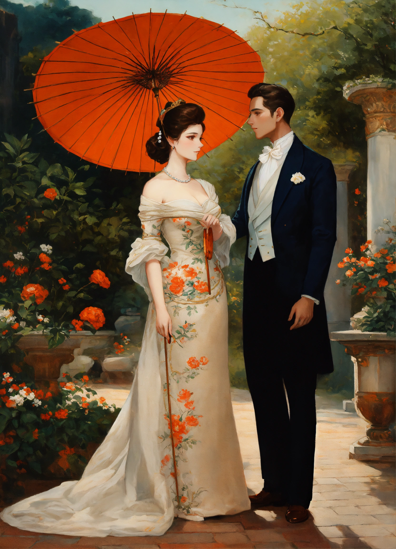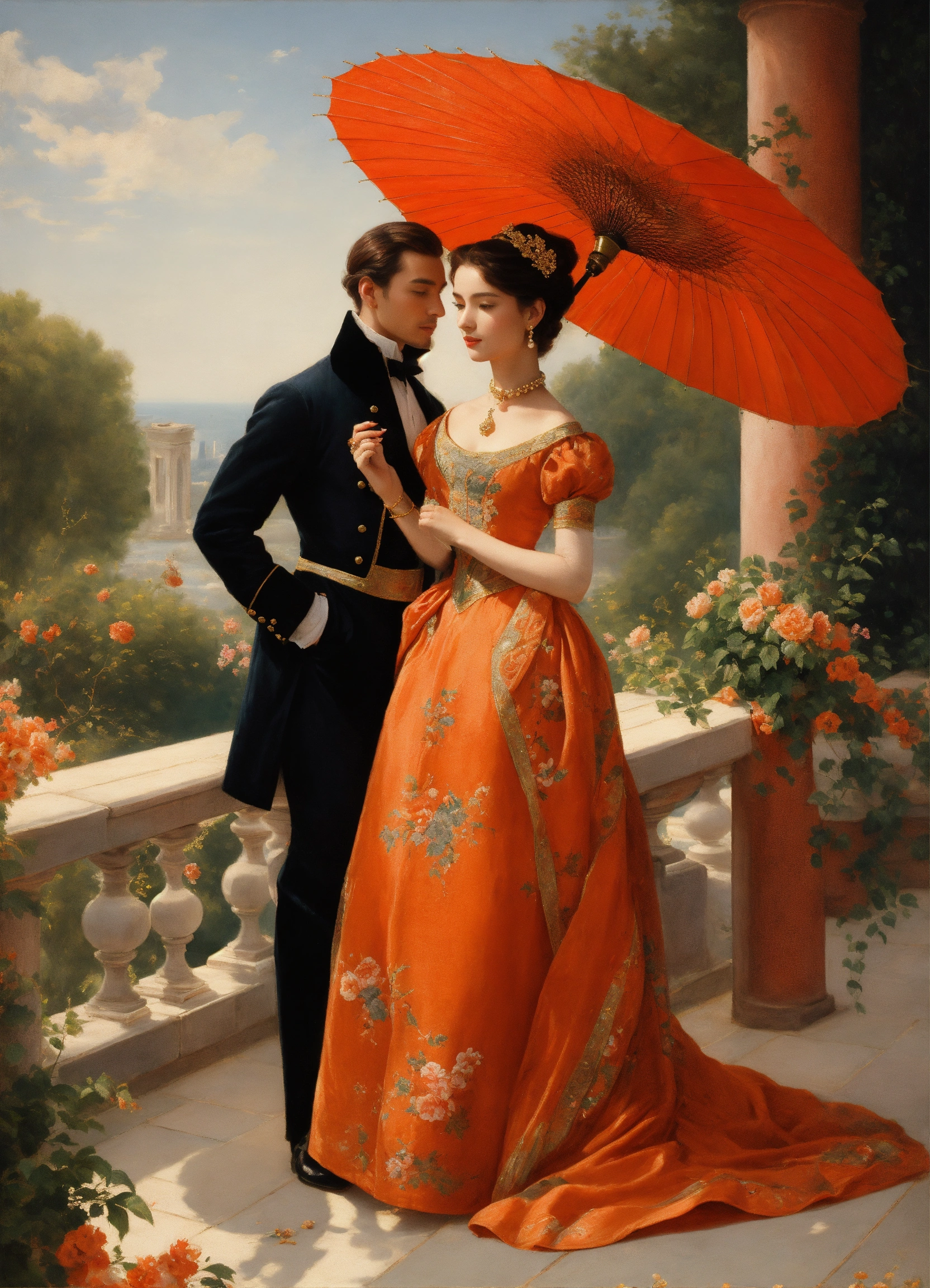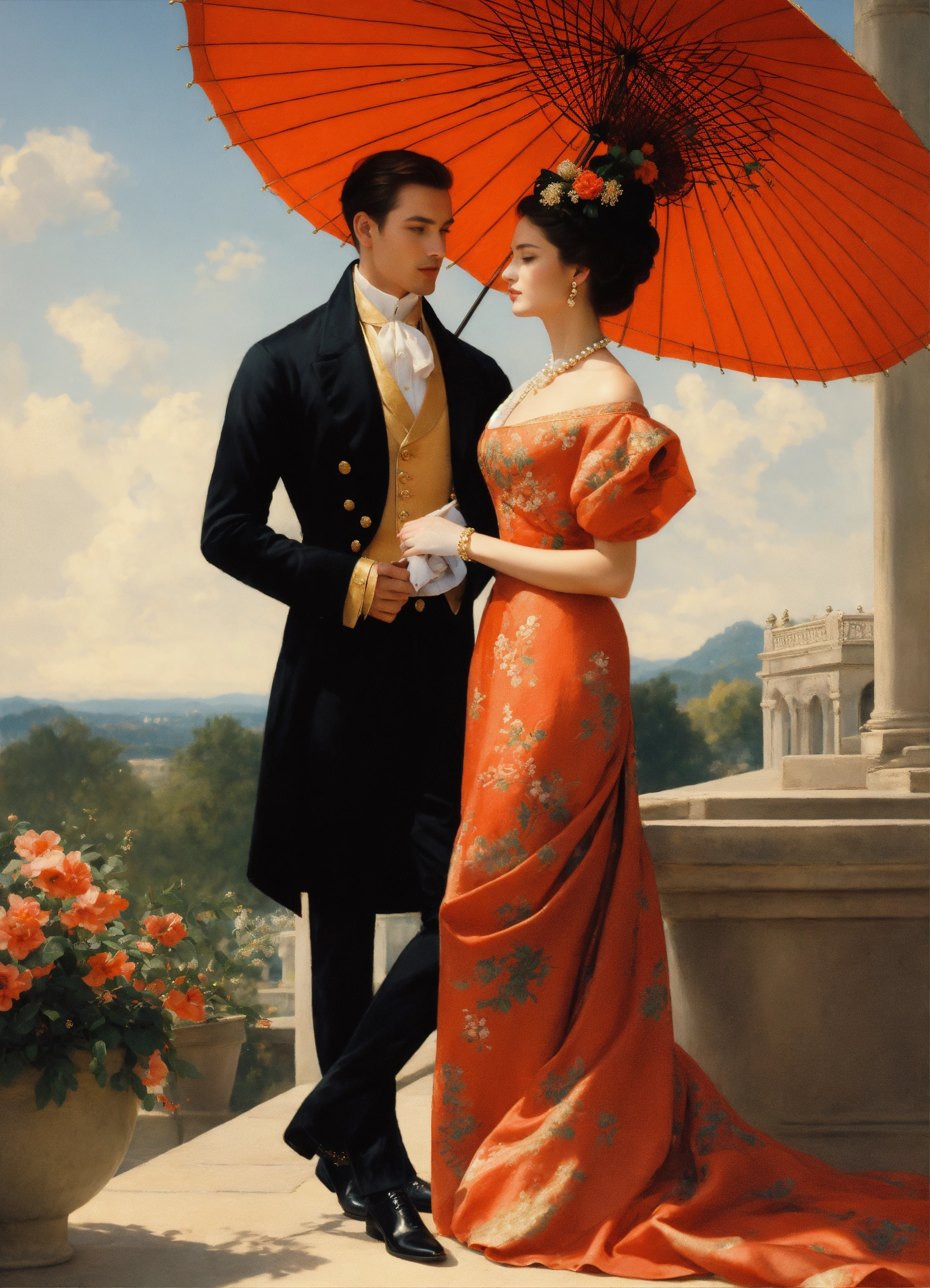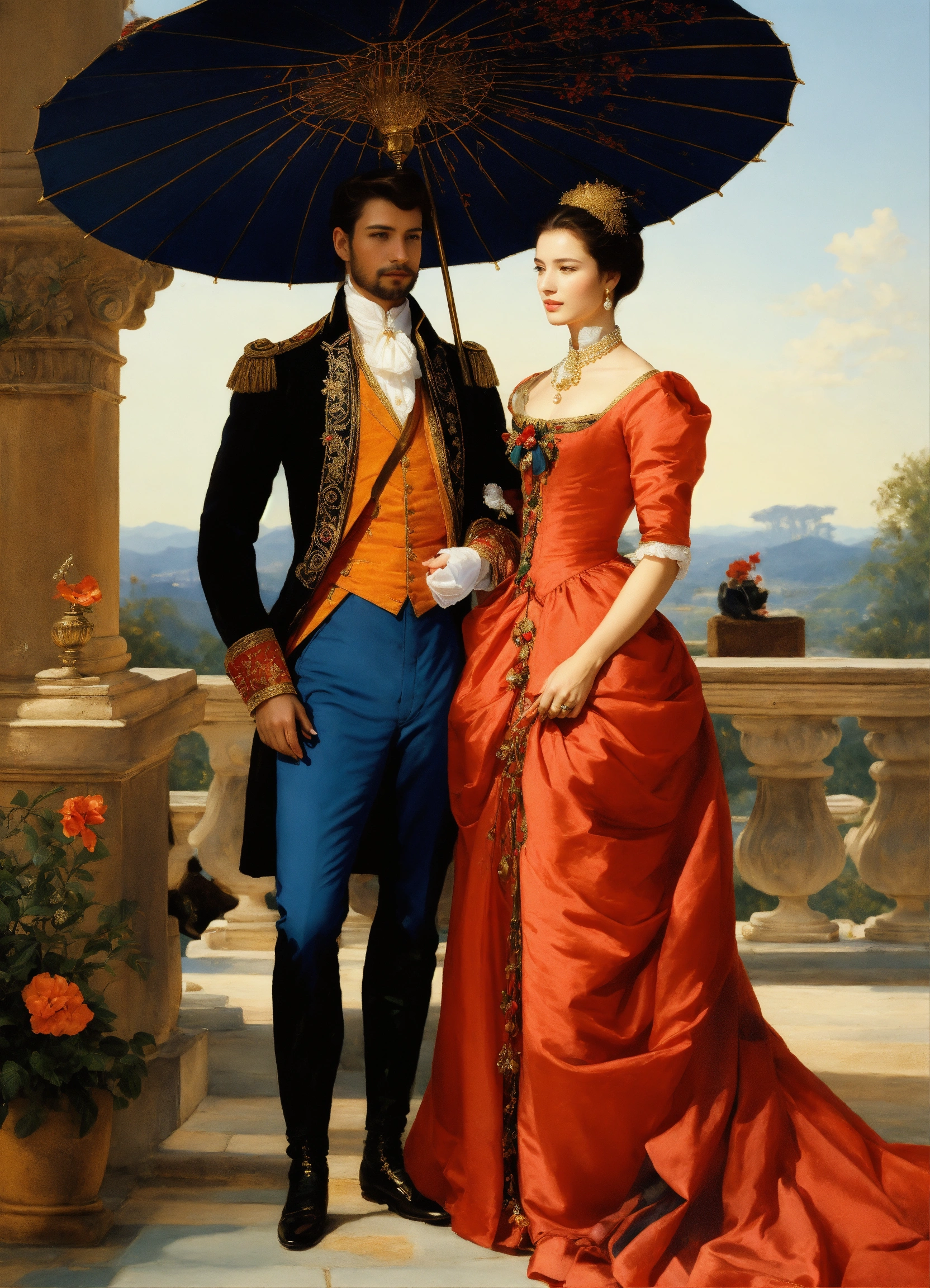 In this captivating portrait, a striking duo graces a terrace. visualize a tall, fair-skinned woman standing beside a shorter, sun-kissed man. she's resplendent in a grand black gown adorned with gleaming gold buttons, a gray collar, and vivid red cuffs. a pearl-studded cap conceals her brown hair, bestowing timeless elegance. adding a touch of nature's beauty, she cradles a vibrant sprig of orange blossoms in her right hand. meanwhile, the impeccably groomed man wields a crimson-red parasol, casting a protective and gallant aura around the lady. the scene is a masterpiece of grace, with fluted columns rising on the right and lush plants caressing their feet. beyond, a picturesque landscape unfolds beneath a serene blue sky, inviting us to explore this captivating world of elegance and allure.