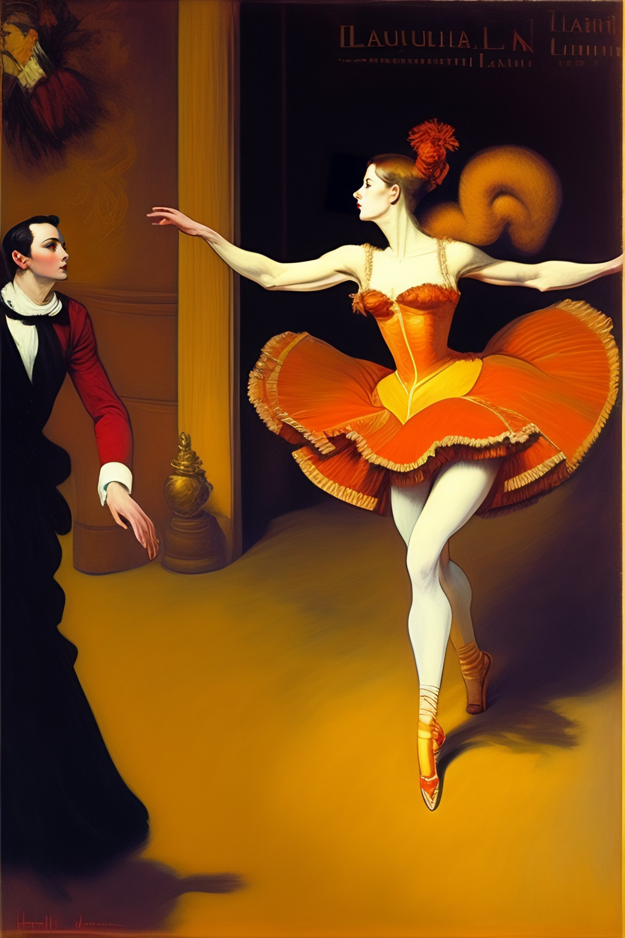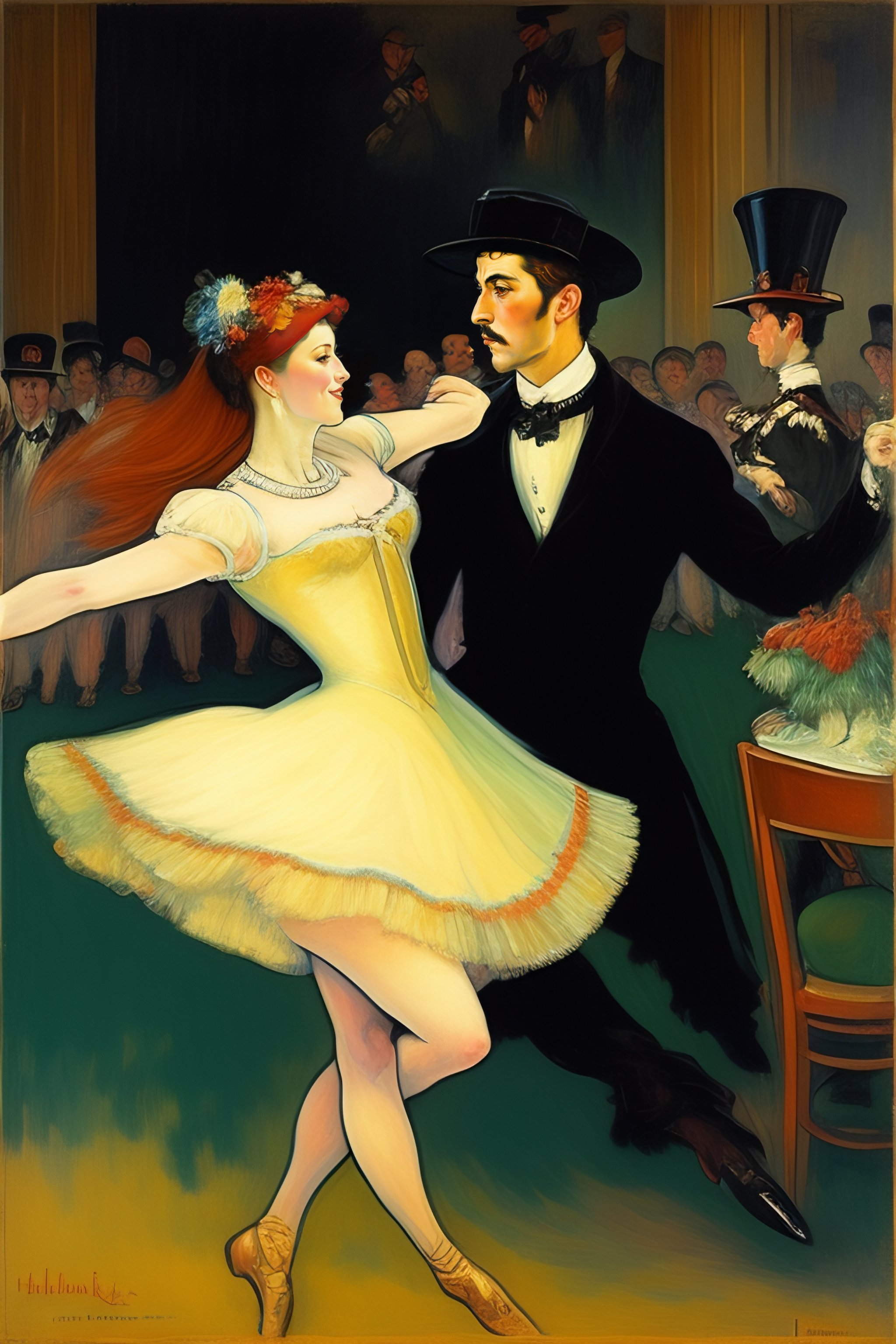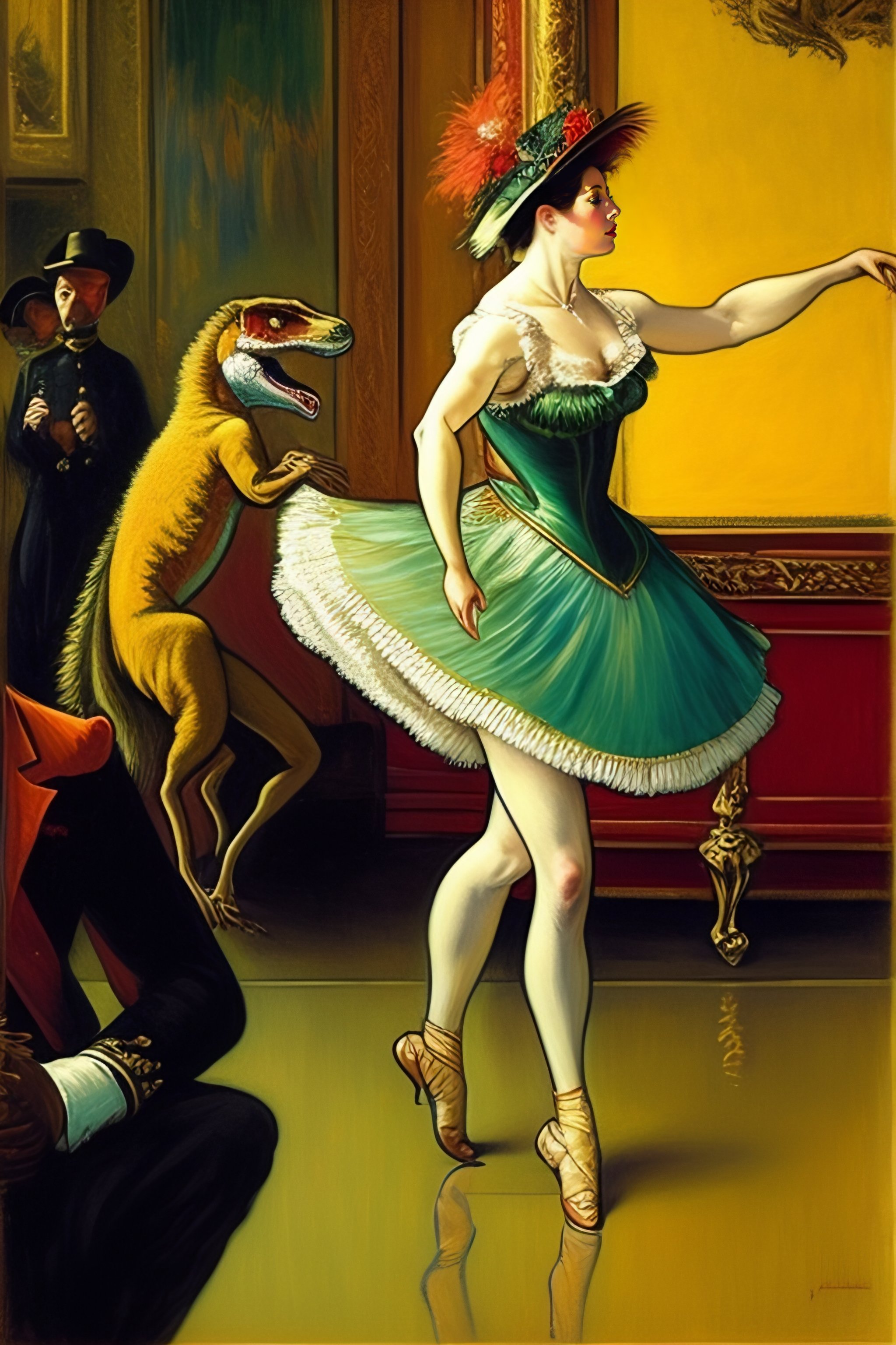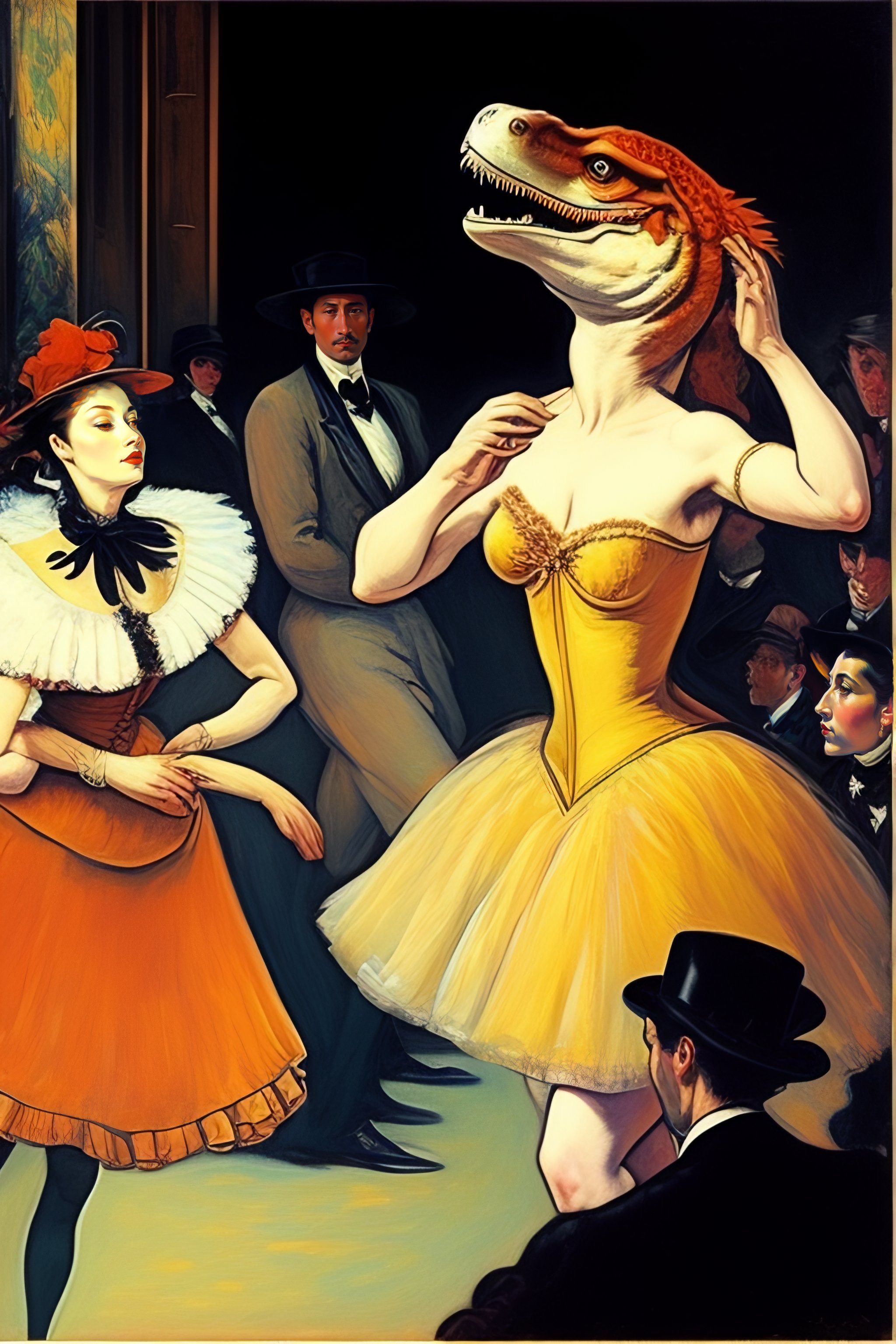 A painting of a dancer and a velociraptor dancing in a stage in the style of henri de toulouse-lautrec in paris with an audience of lemurs