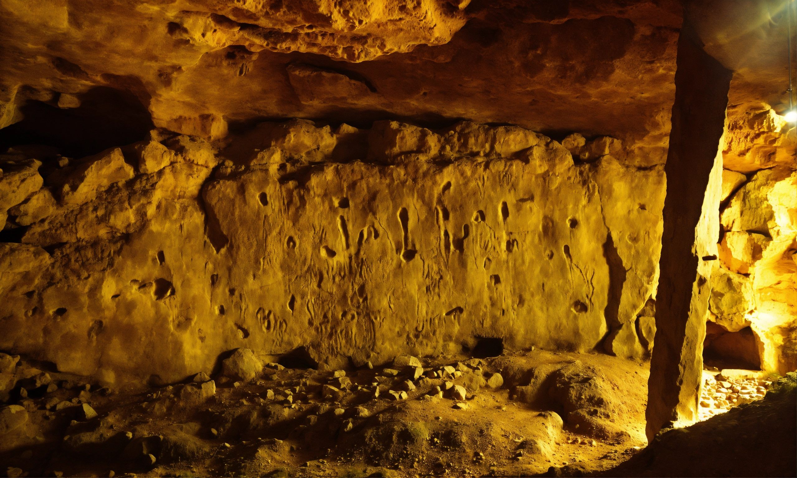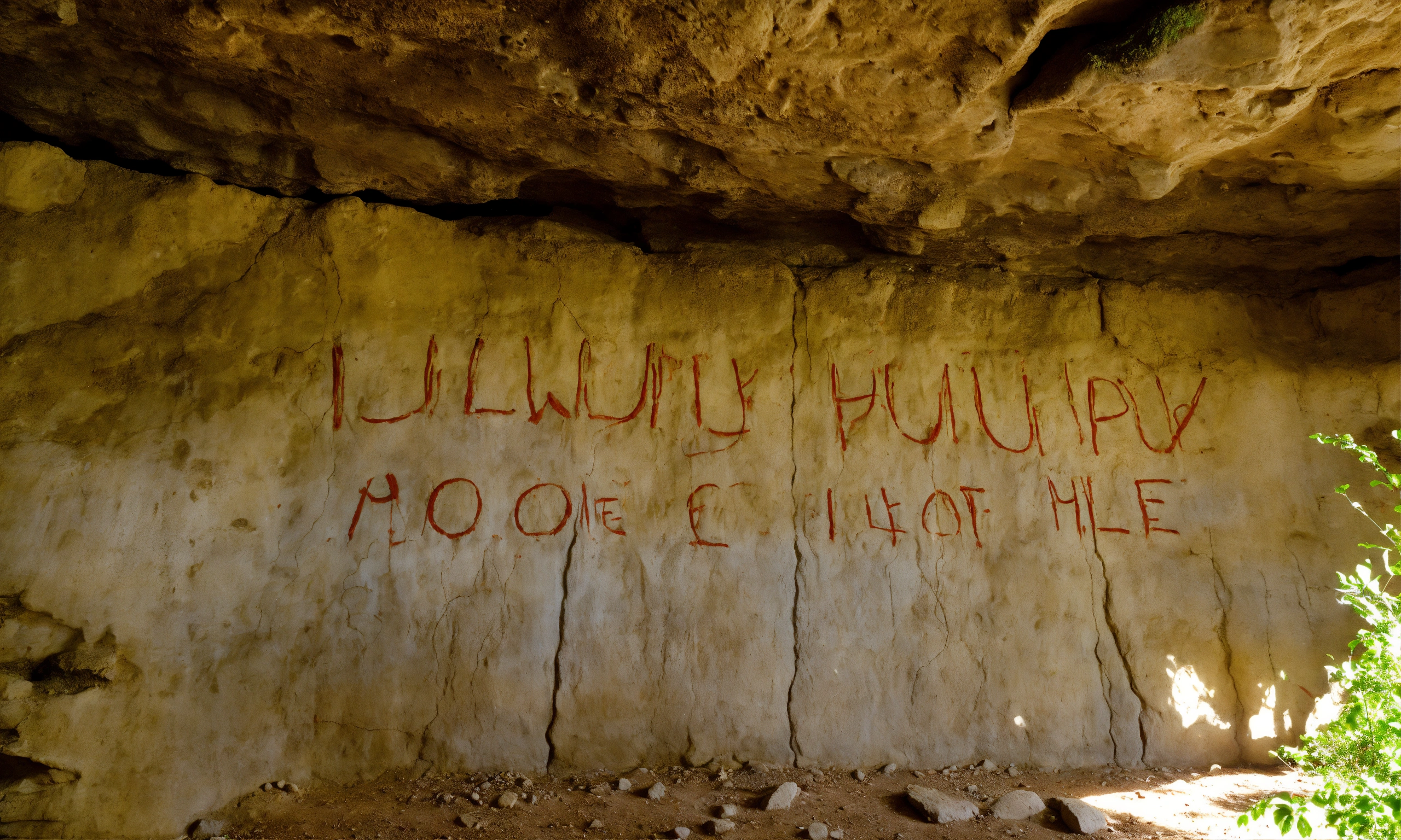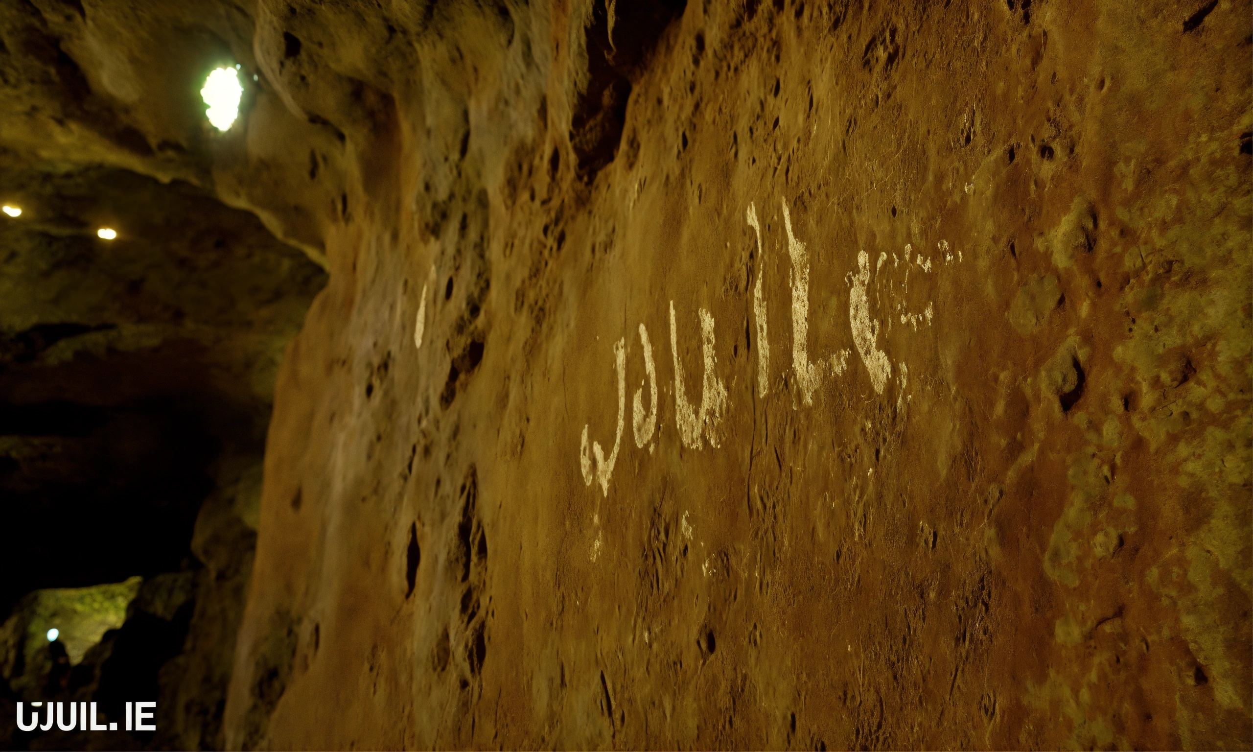 The inscription "julie" written on the walls of a prehistoric cave with handprints