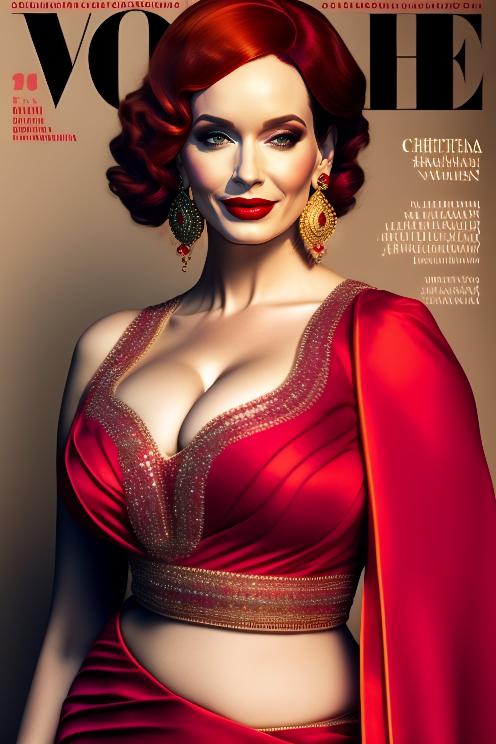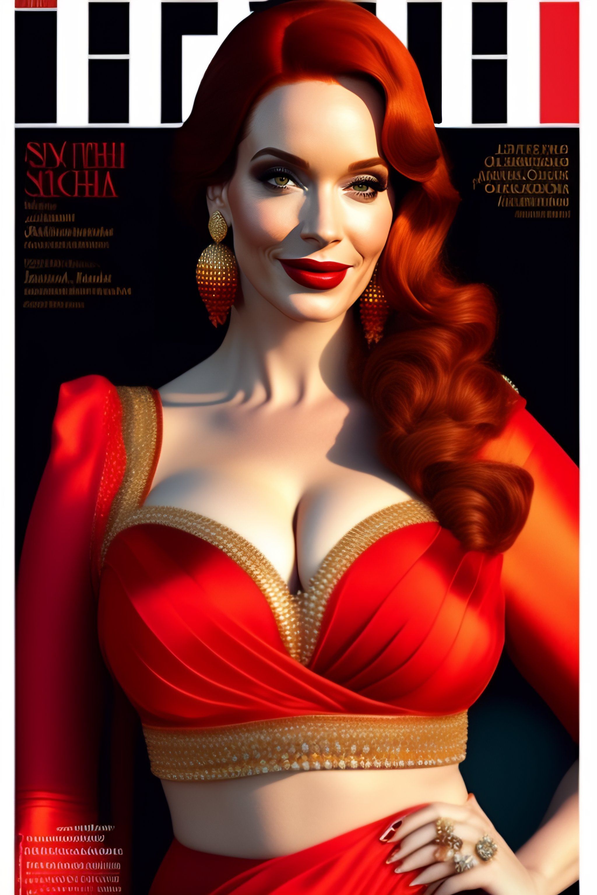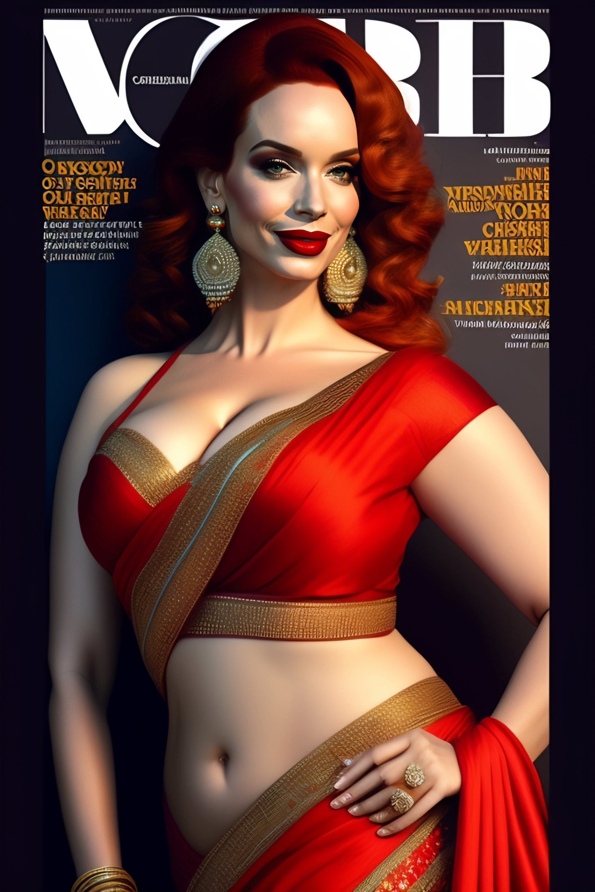 Christina hendricks in saree, navel and abs visible, very tall, hour glass waist, red lipstick, jewellery, posing, magazine cover, full body