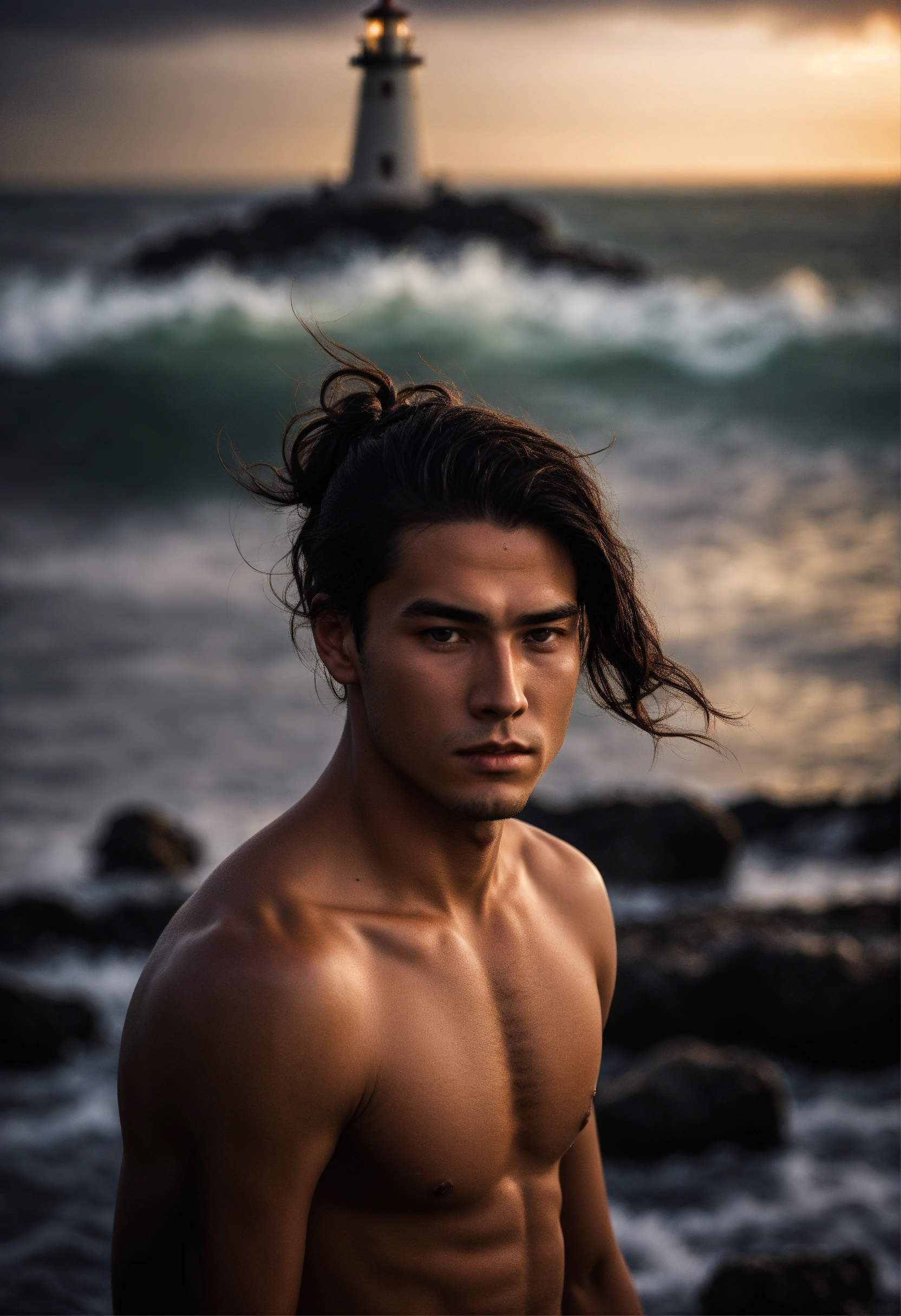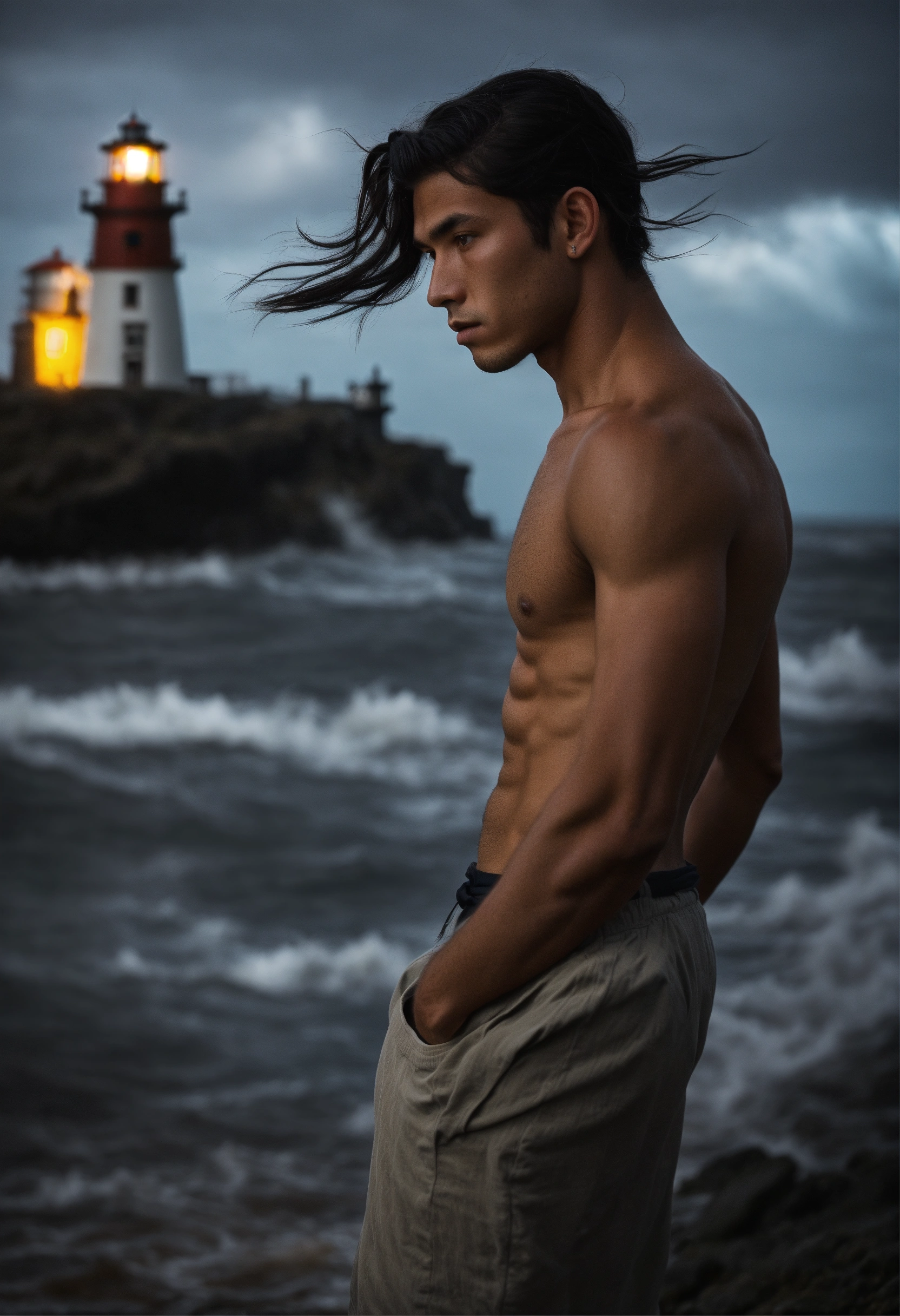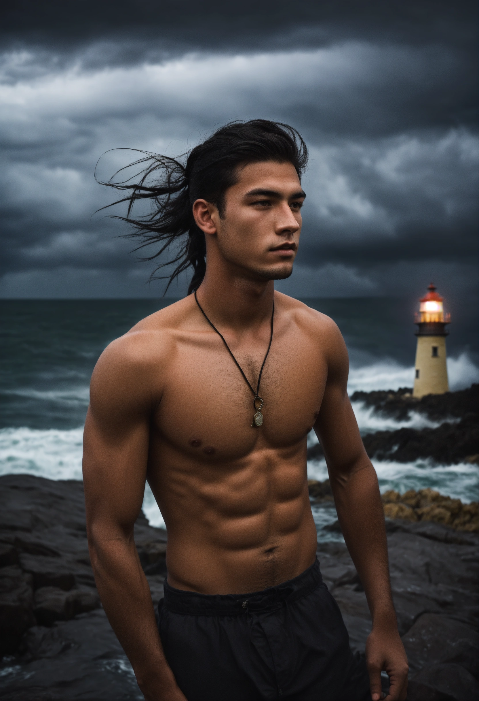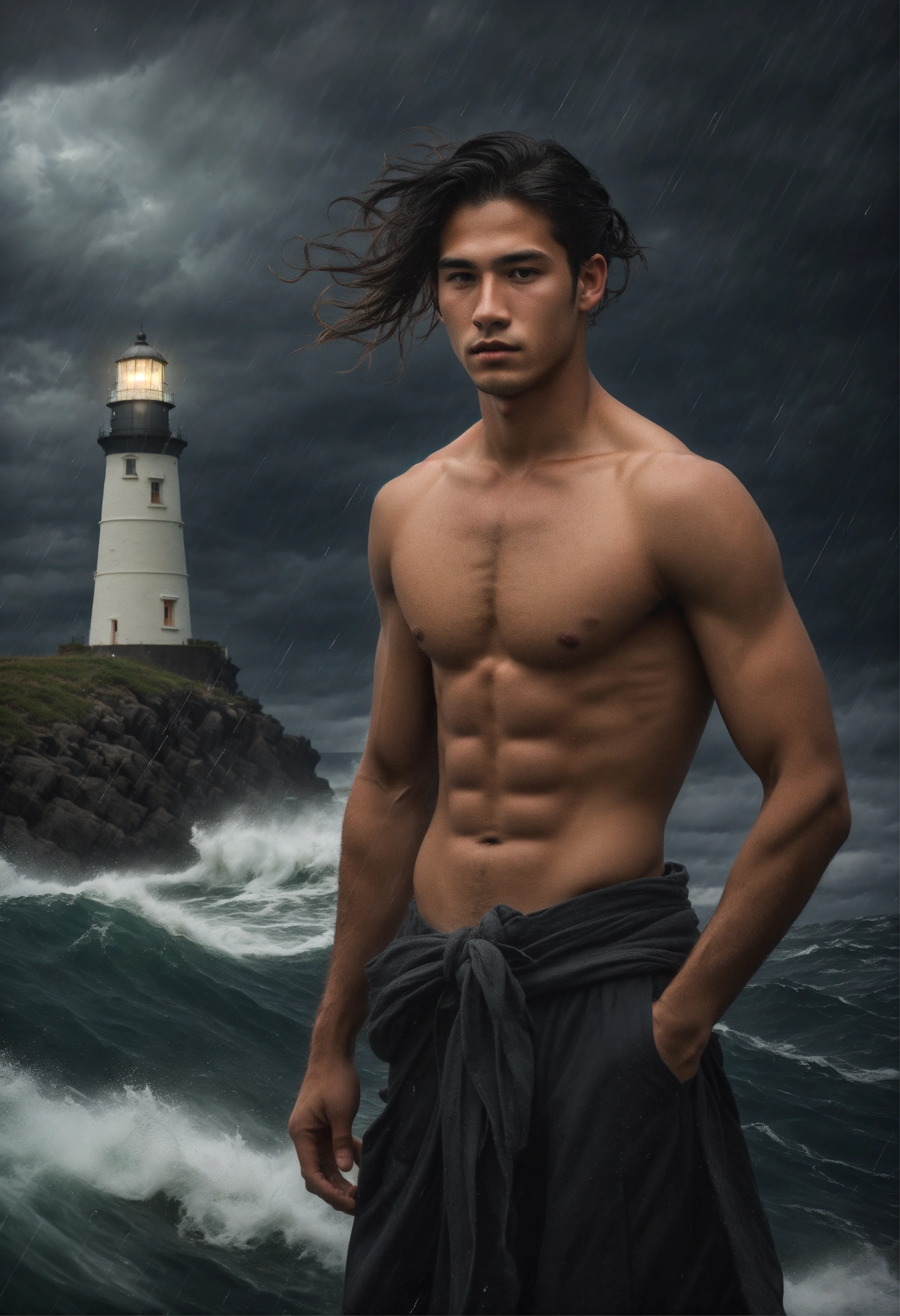 1910's 20 year old boy, tan skin, light eyes, shirtless, long black ponytail, by the dark ocean, in storm, lighthouse