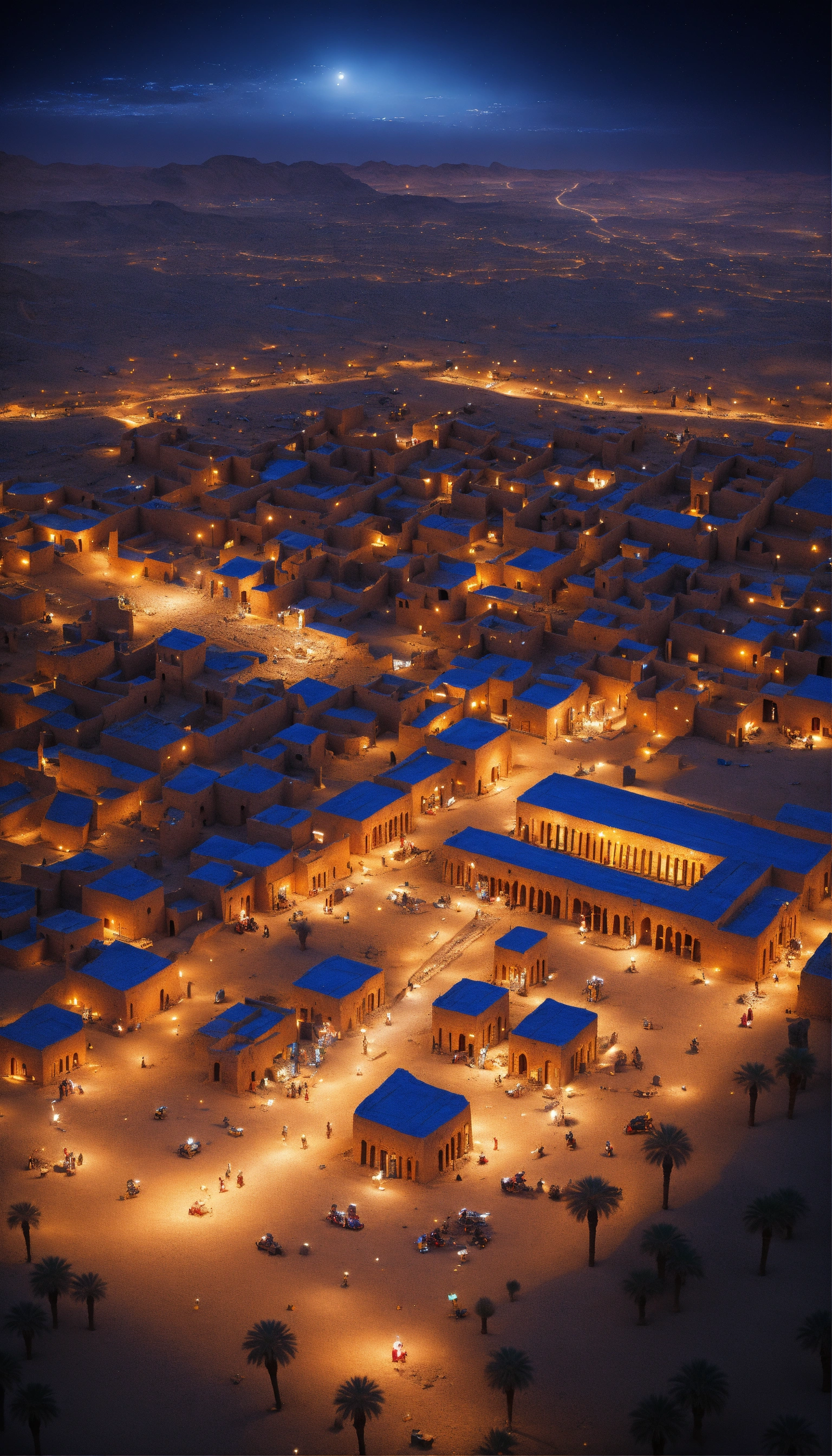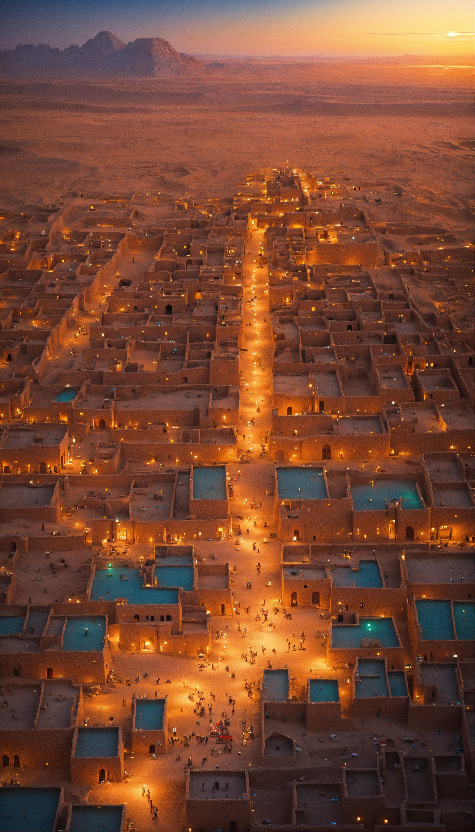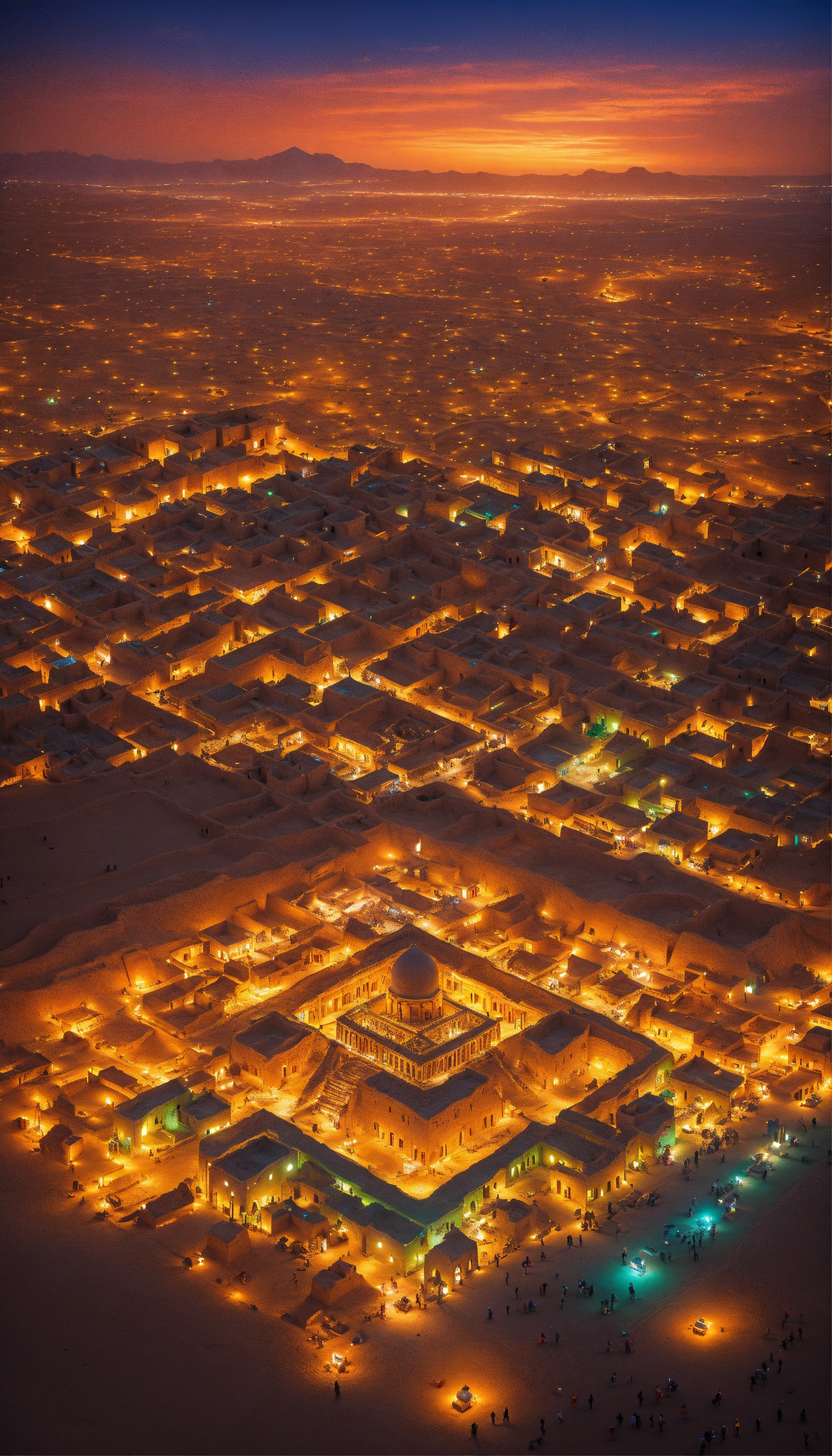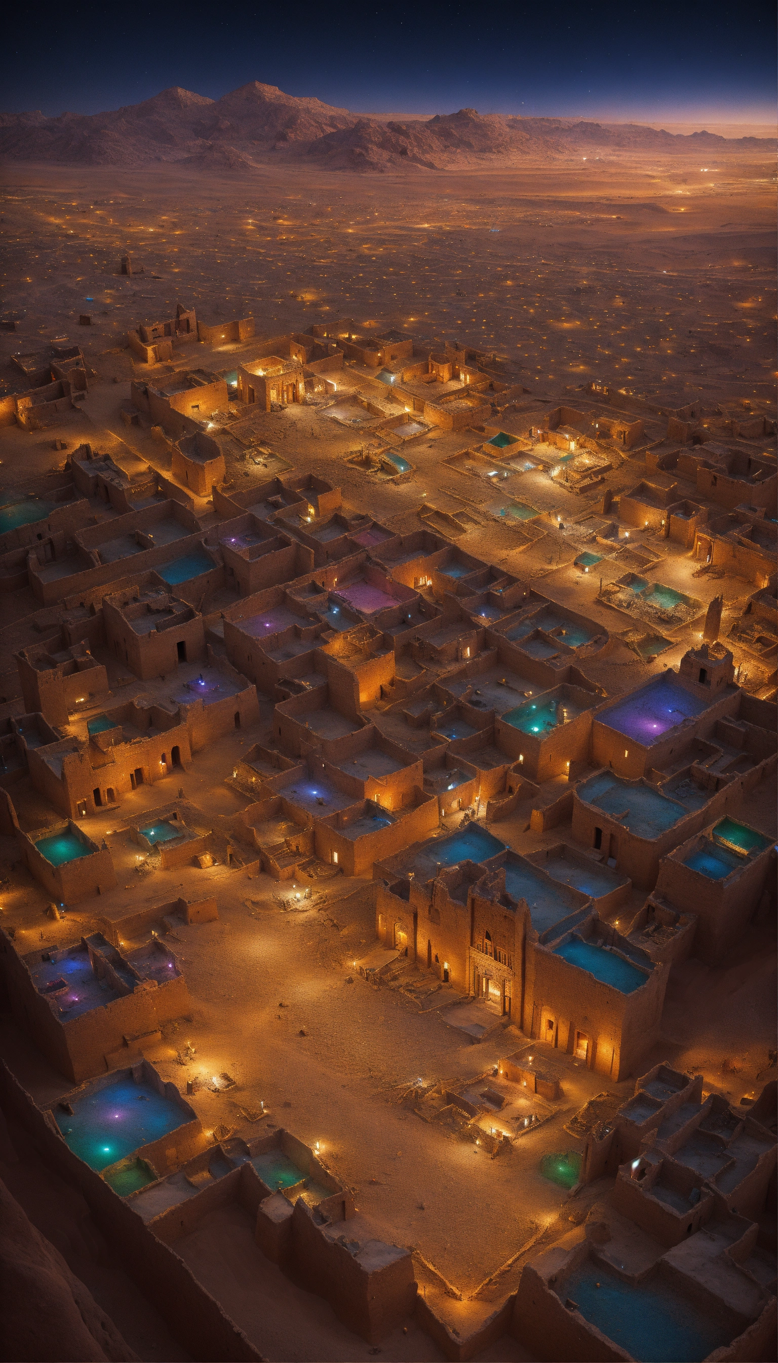 An aerial view of a city lit up at night, ancient persian city, colorful ancient egyptian city, built in the egyptian desert, in a major mesopotamian city, ancient city, ancient persian temple dungeon, colorful city in ancient egypt, city in desert, timbuktu, in a war - torn desert village, ancient city landscape, by robert jacobsen, tan