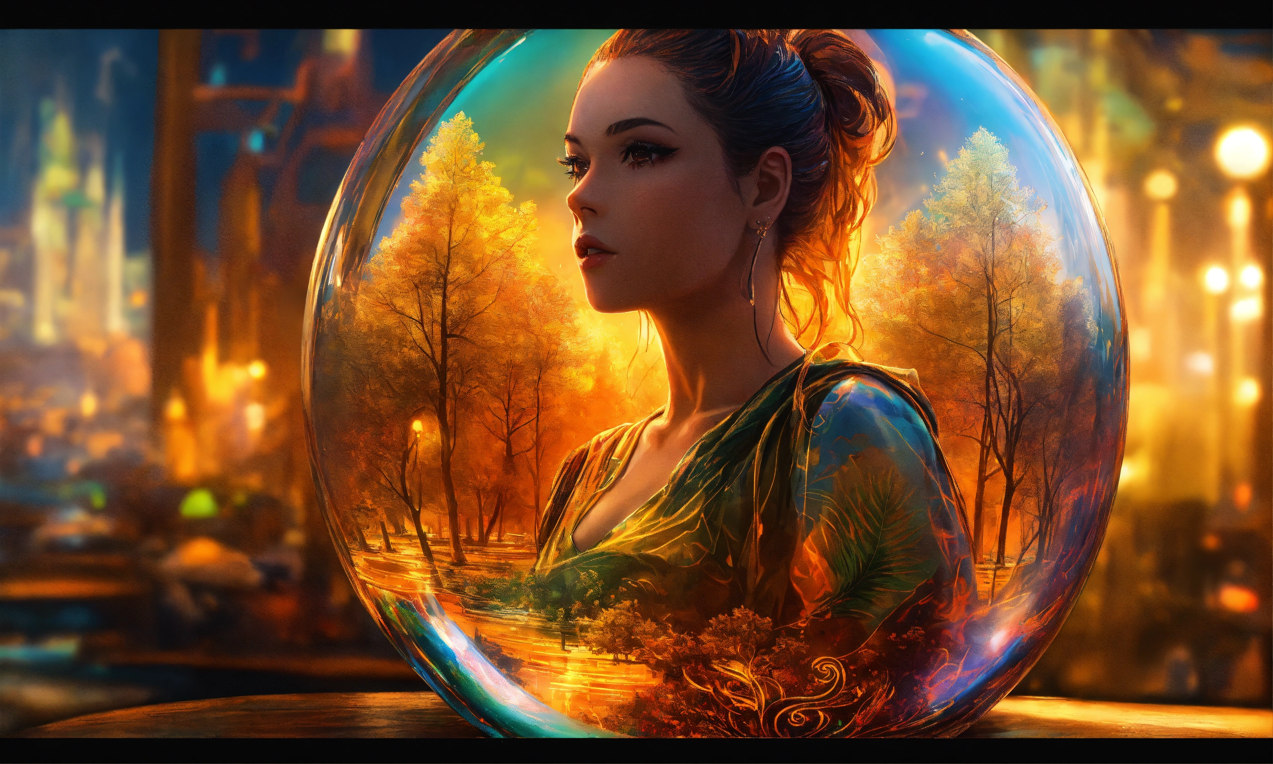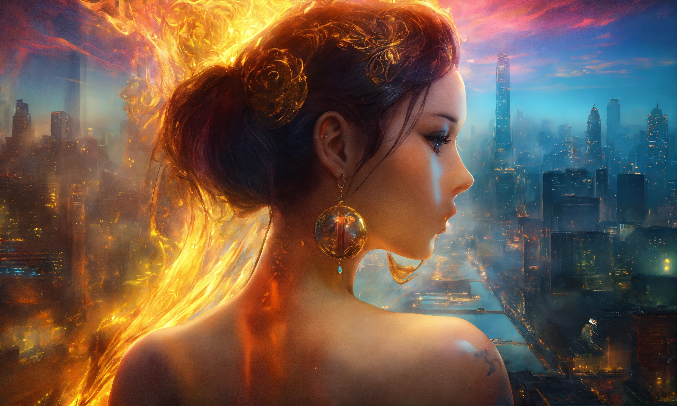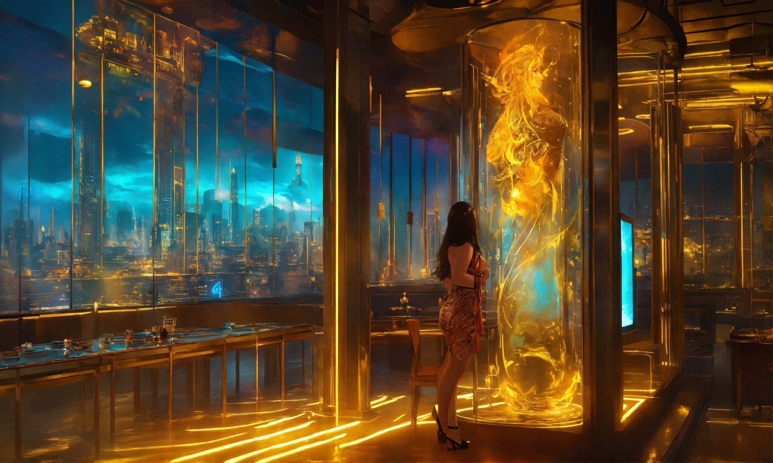 Girl, with digital tattoos in a glass mango filled, with neon smoke, very detailed, iredescent, wide shot, lots of water and reflections, super glossy oils and very realistic smoke patterns that resemble tall skyscrapers and giant oil and gold trees, beautiful female on a huge digital billboard, 9k, 16k, 32, 64k, 128k, real shadows, super deep camera lens