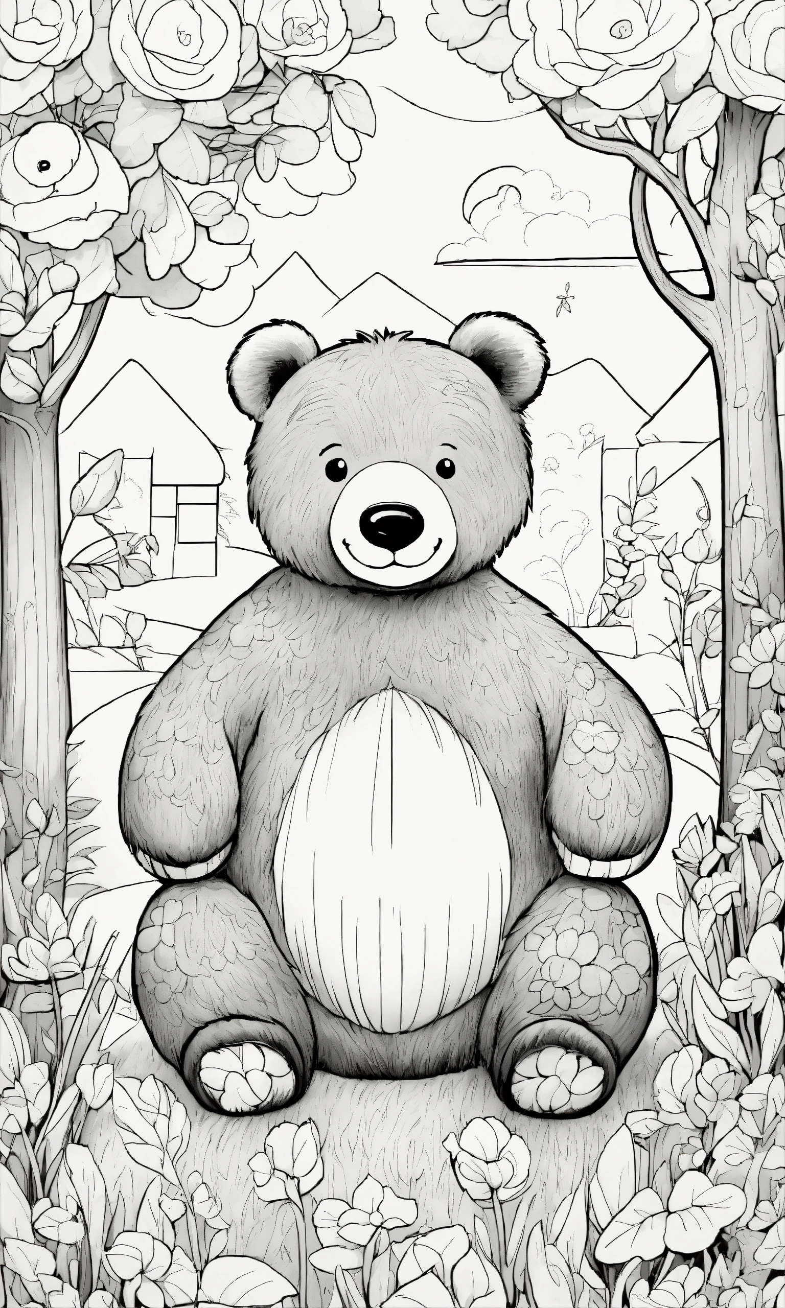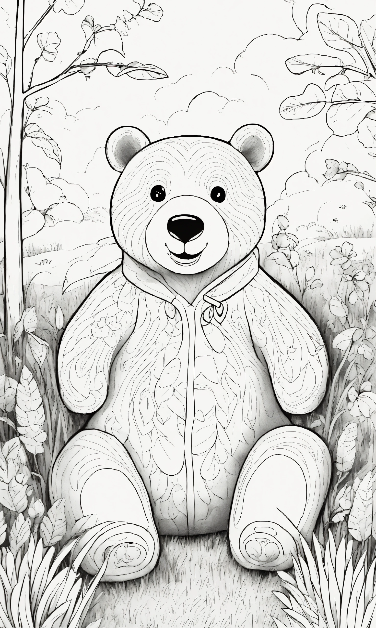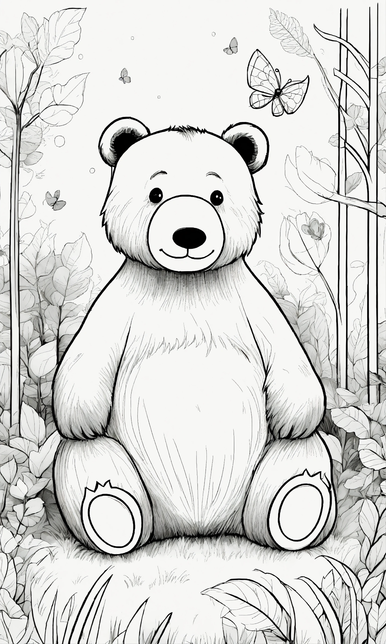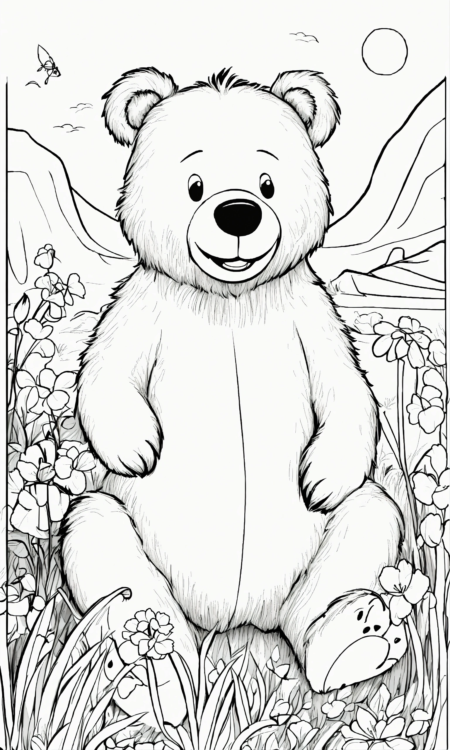 Super cute happy smiling bear sitting on grass, cartoon style, highly detailed, delicate children book illustration, vector line art, fairytale, artistic, minimalistic illustration, hand drawn doodle, digital drawing black and white coloring book page, --v 4