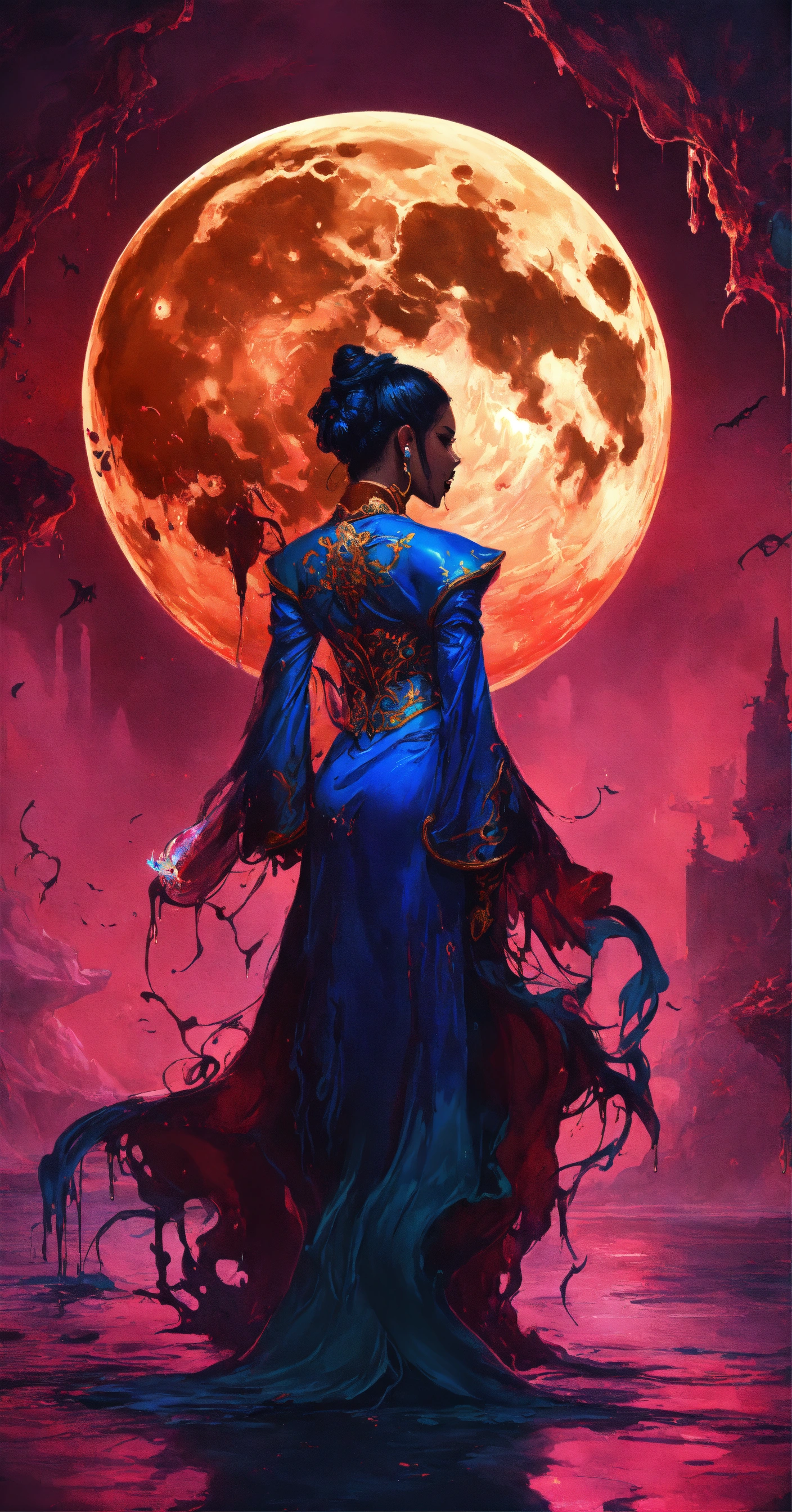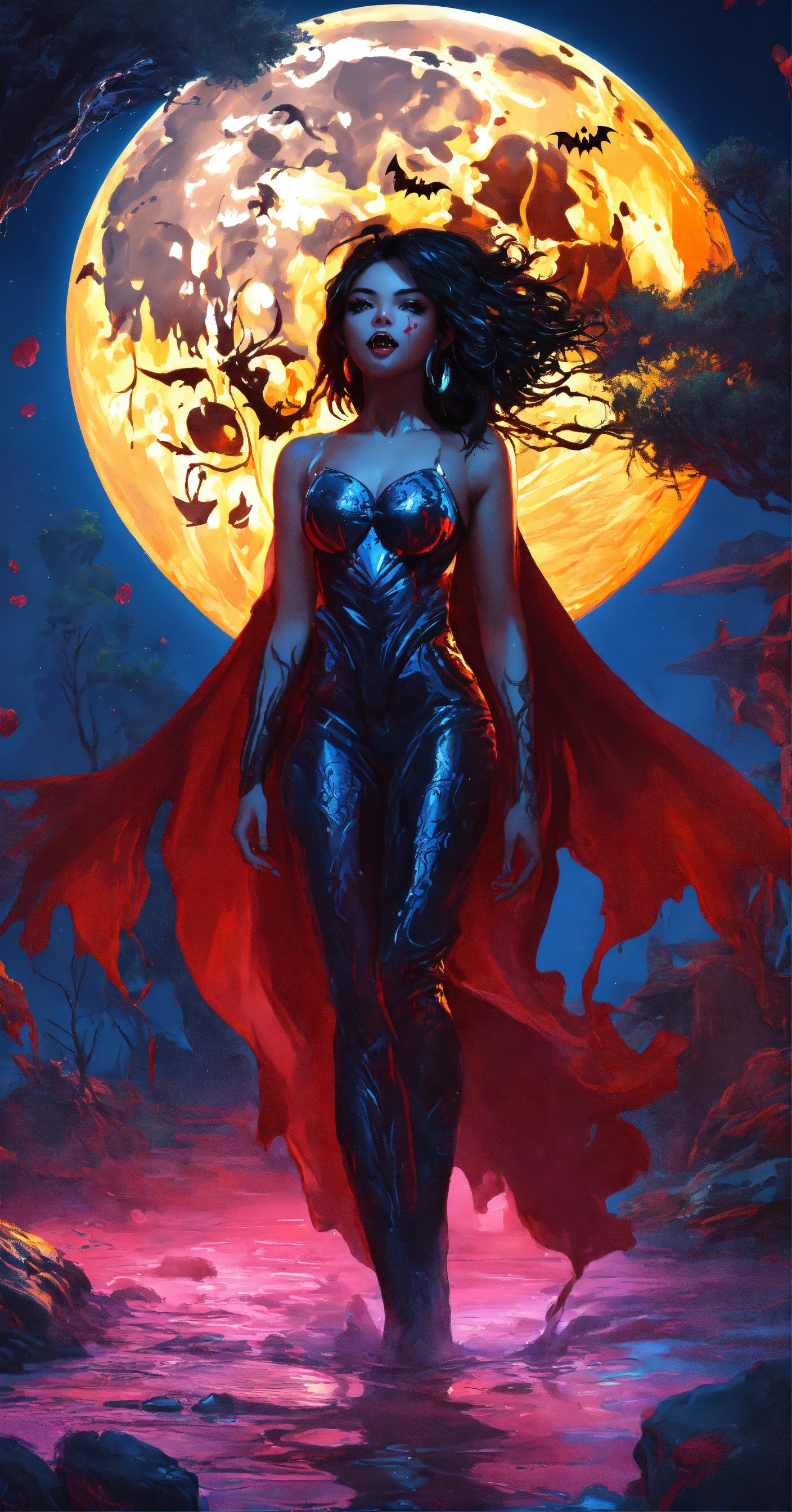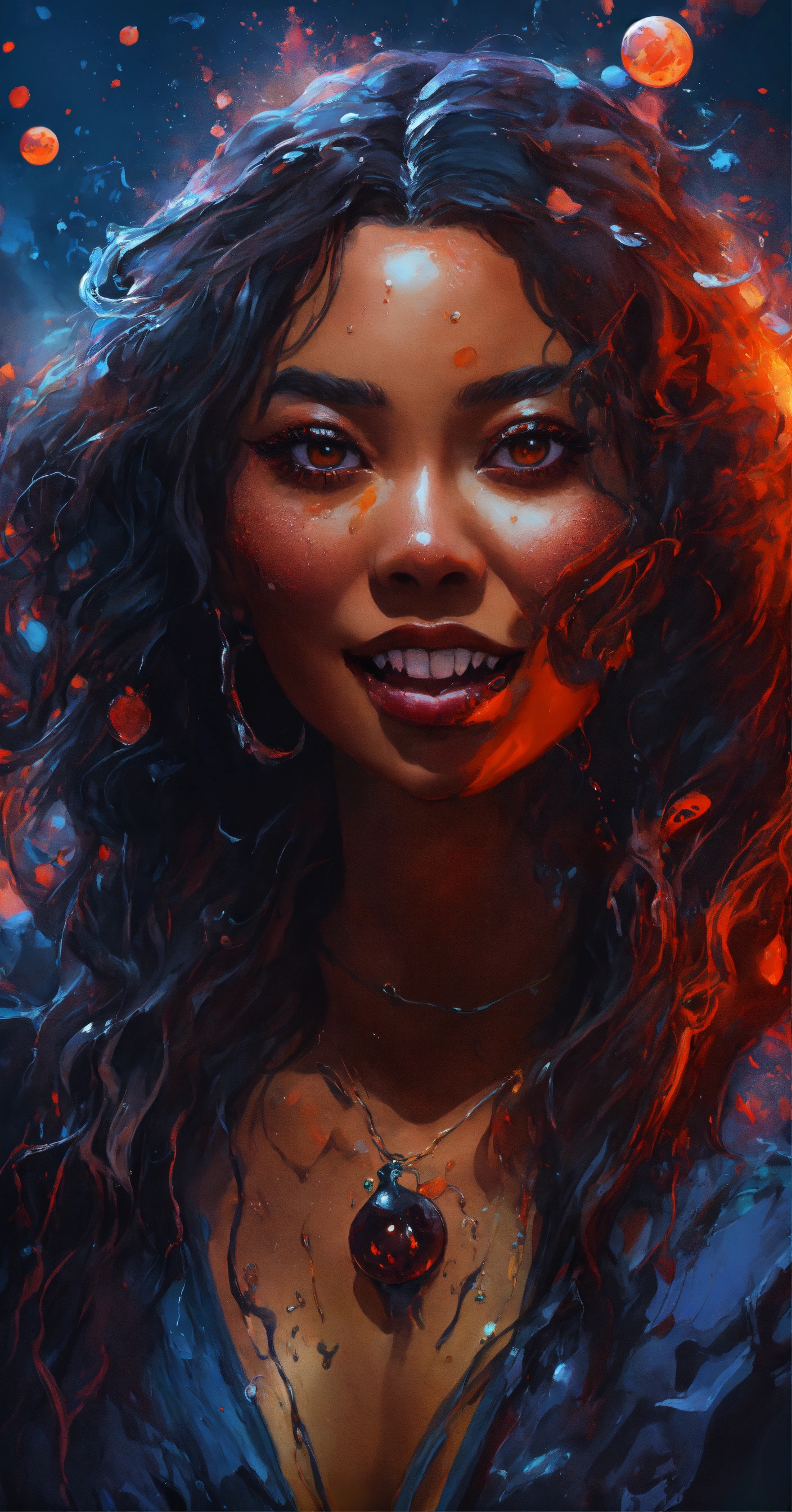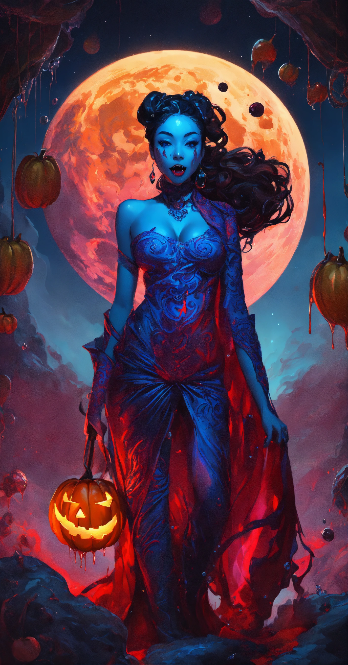 Splash art, a quirky liquid portrait of a hauntingly beautiful black asian vampire woman with fangs, splash style of paint, pixar style, halloween colors, hyper detailed intricately detailed, fantastical, intricate detail, splash screen, liquid, gooey, slime, splashy, fantasy, concept art, 8k resolution, masterpiece, melting, complex background, intricate detailed, dark colors, fantasy, concept art, digital art, intricate, oil on canvas, masterpiece, expert, insanely detailed, 8k resolution. full blue moon background at night