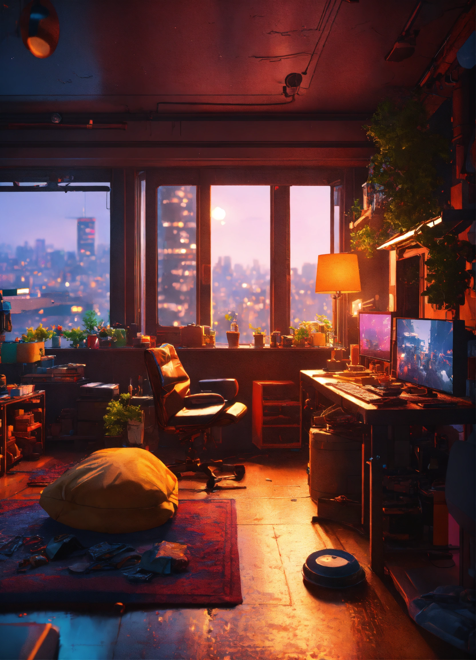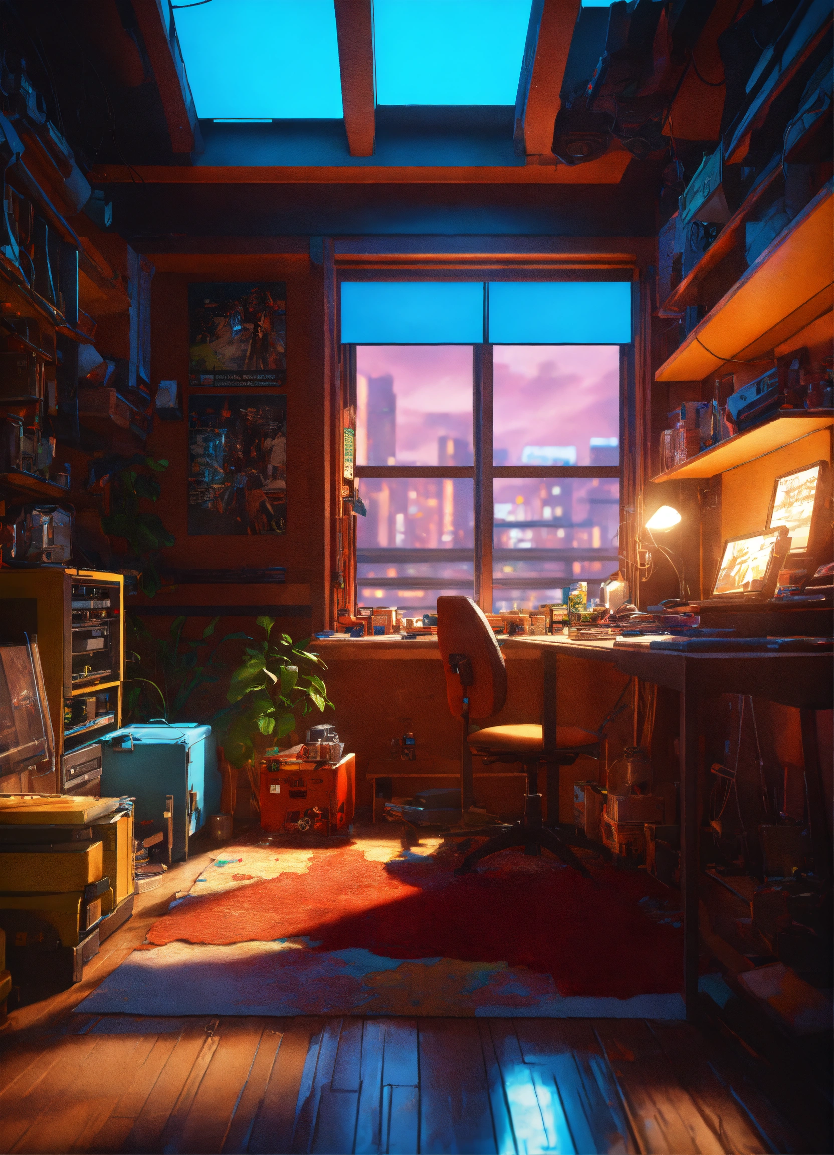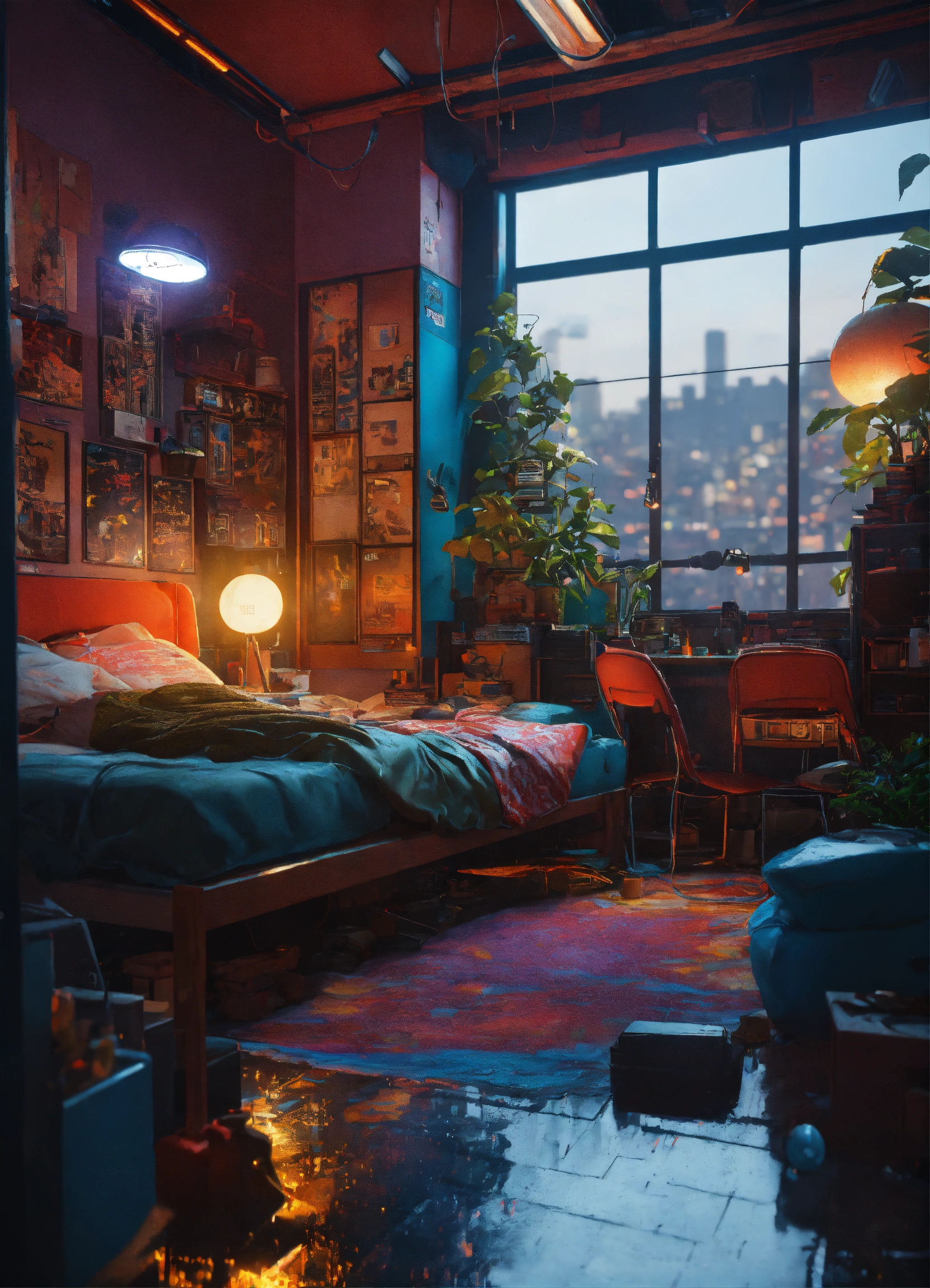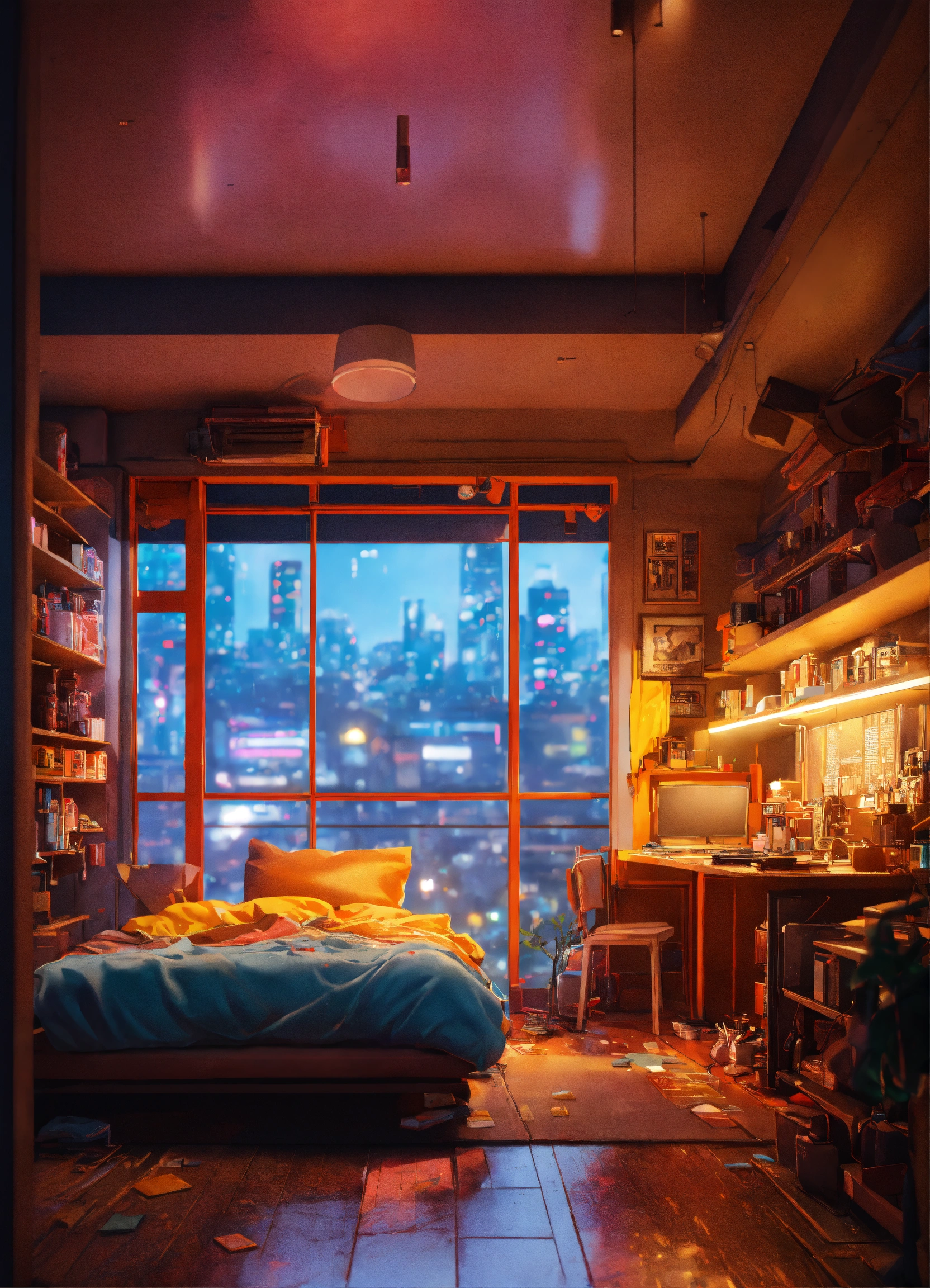 Messy room, unreal engine 5 render, gorgeous lighting, 8k render, realistic scenic render. detailed, cyberpunk room in tokyo, night, rainy, by herge, in the style of tin-tin comics, vibrant colors, detailed, ray tracing, sunny, attention to detail, 8k