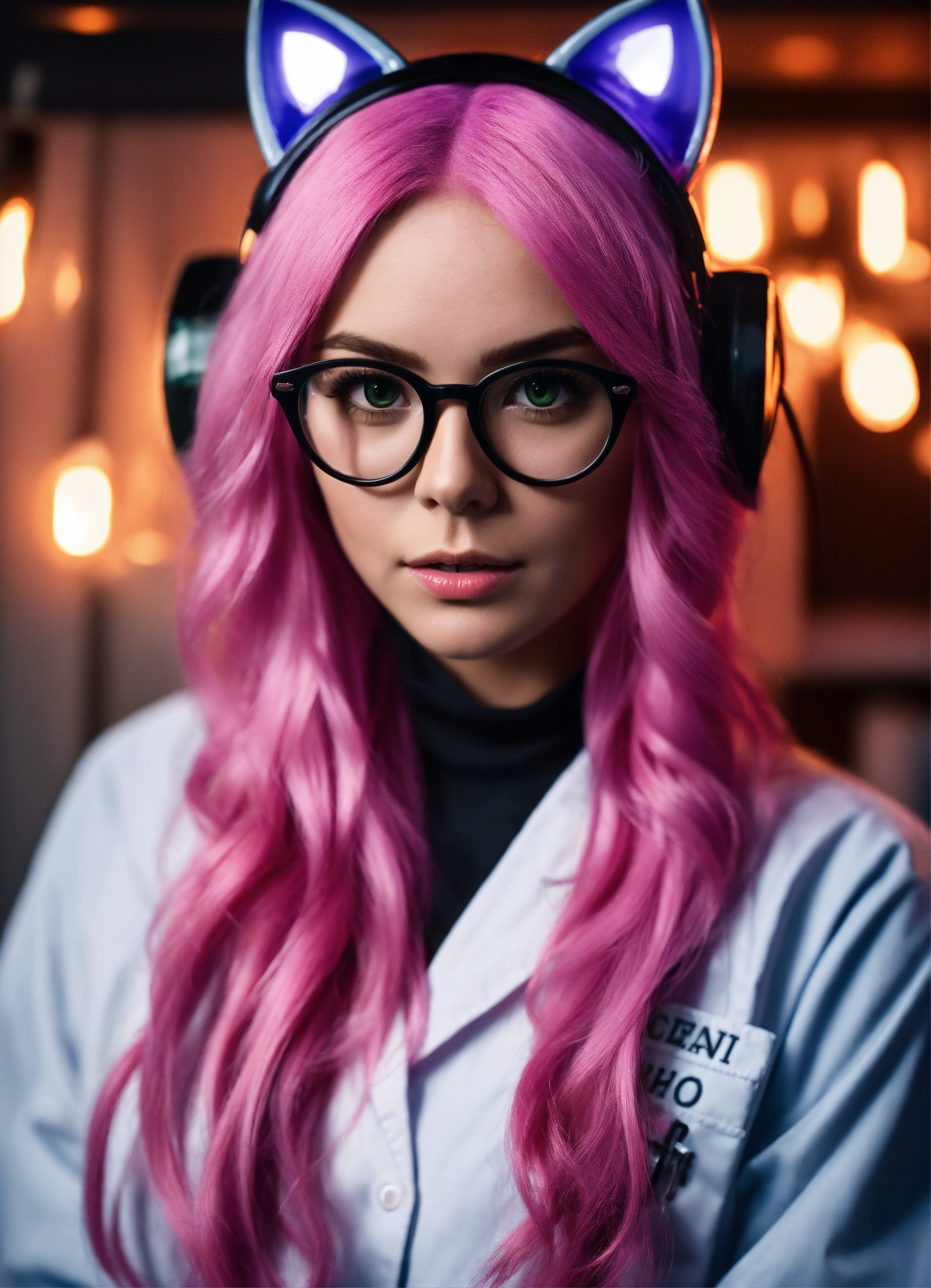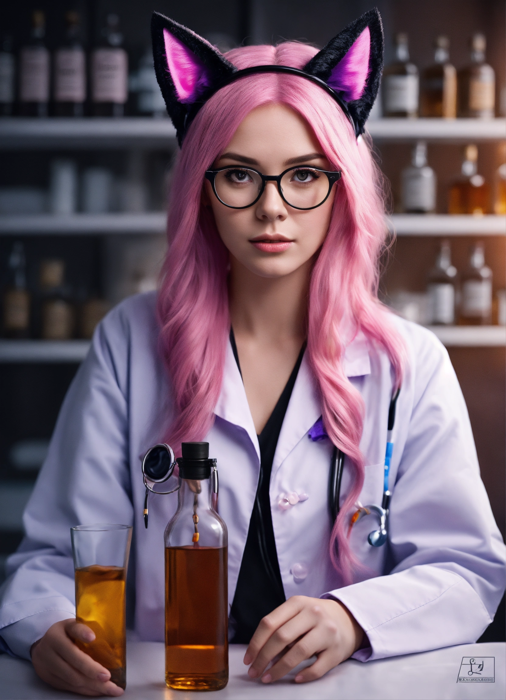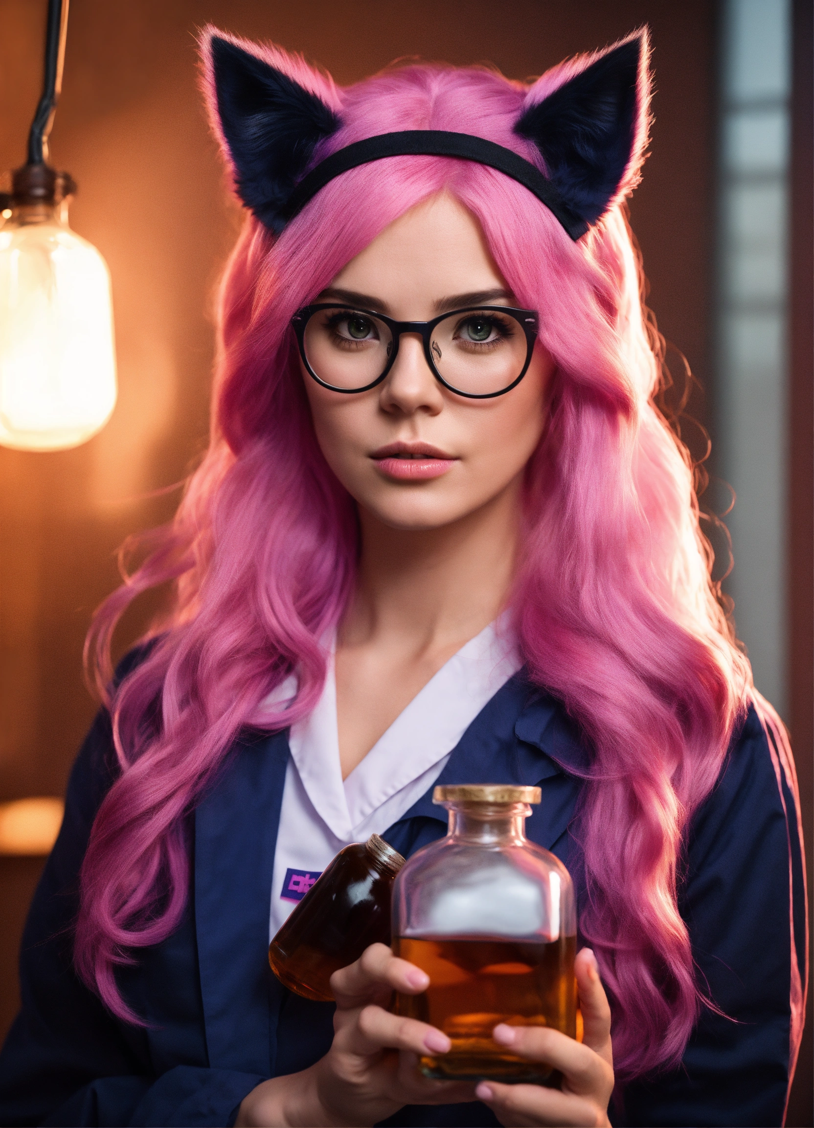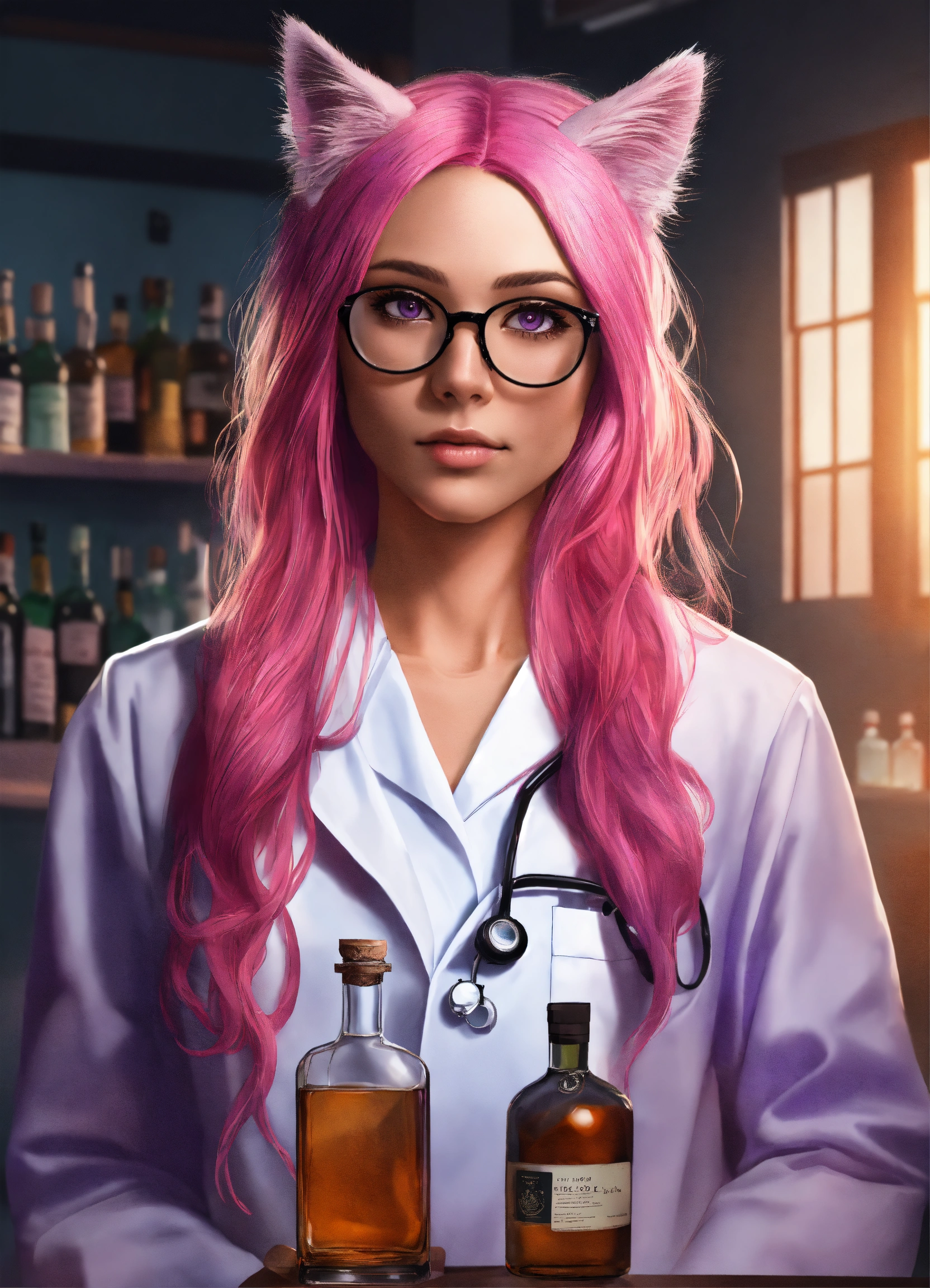 Female doctor, with long pink hair, with cat ears color black on her head, glasses and purple-pink eyes in hospital, human realistic style with whiskey bottle, 8k