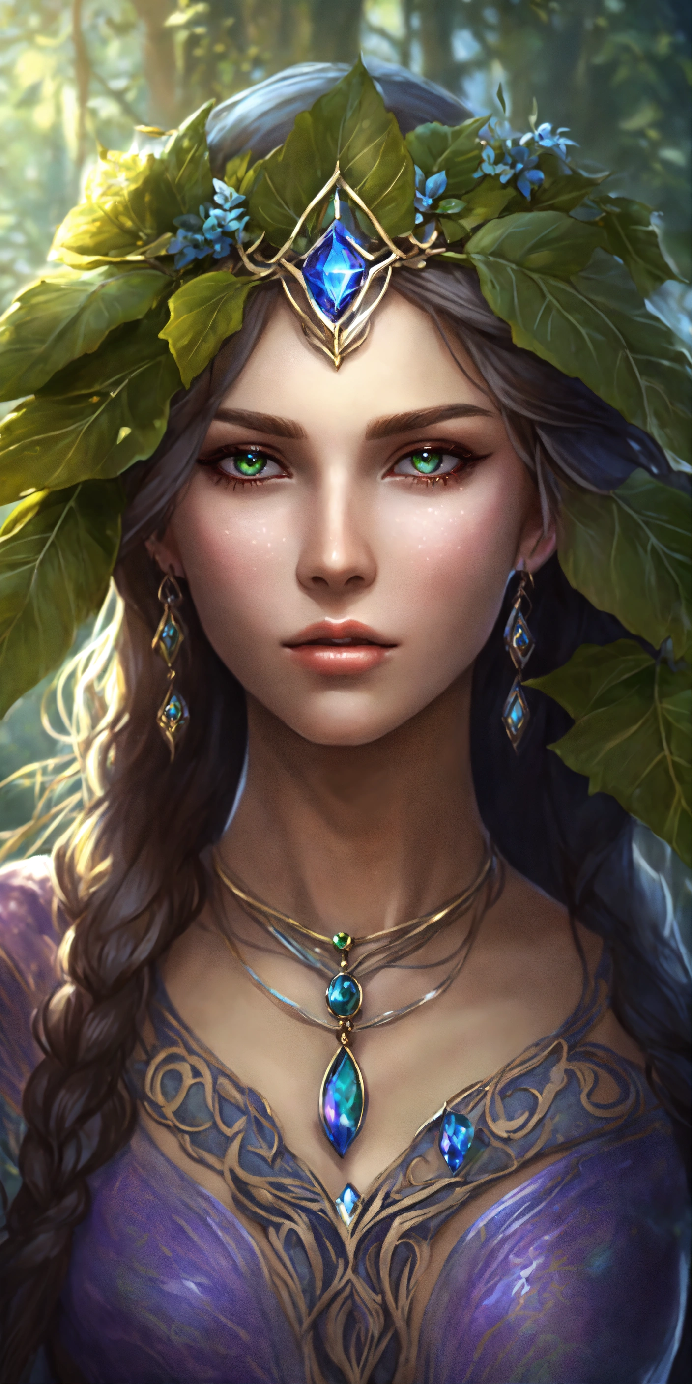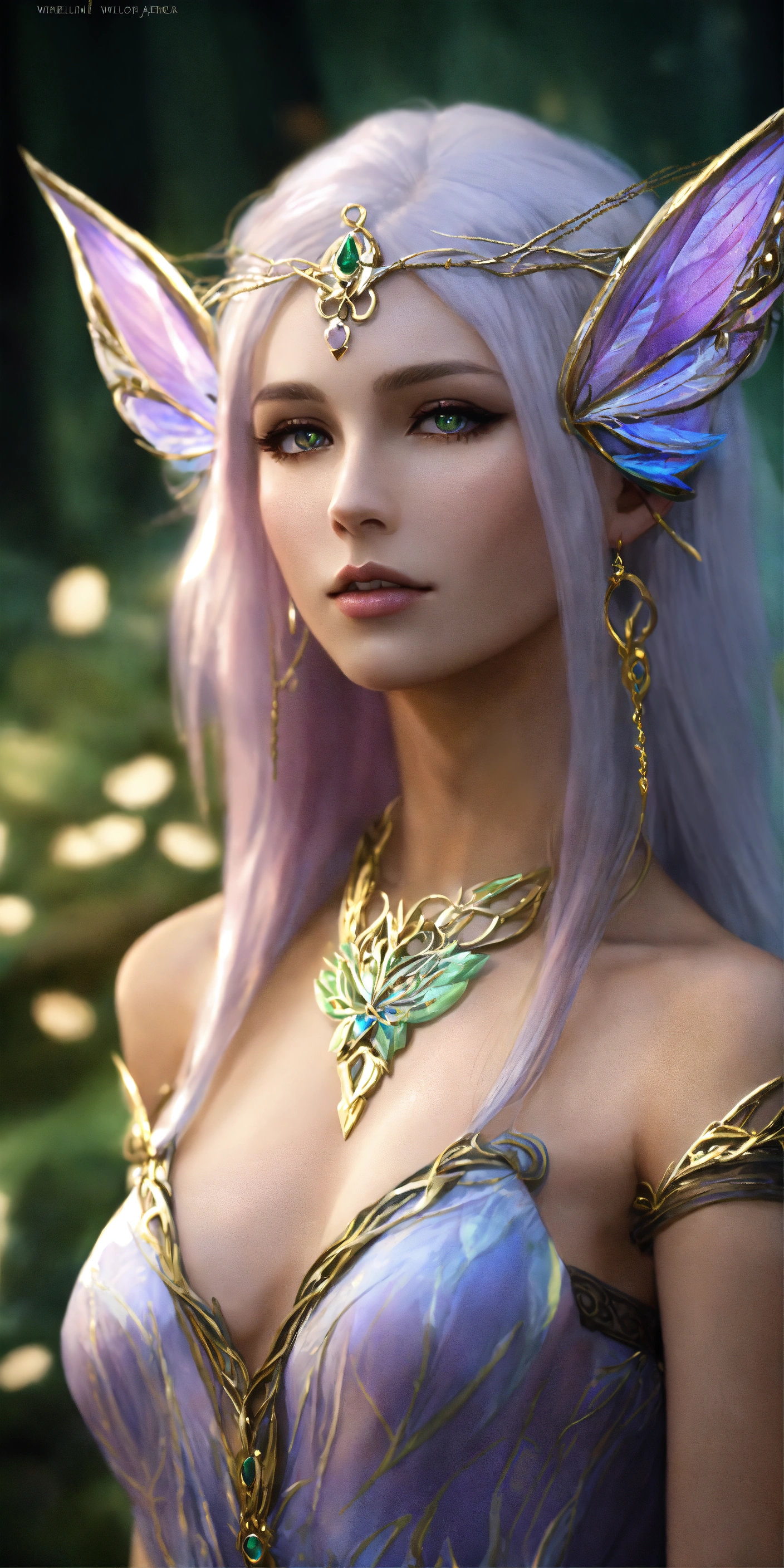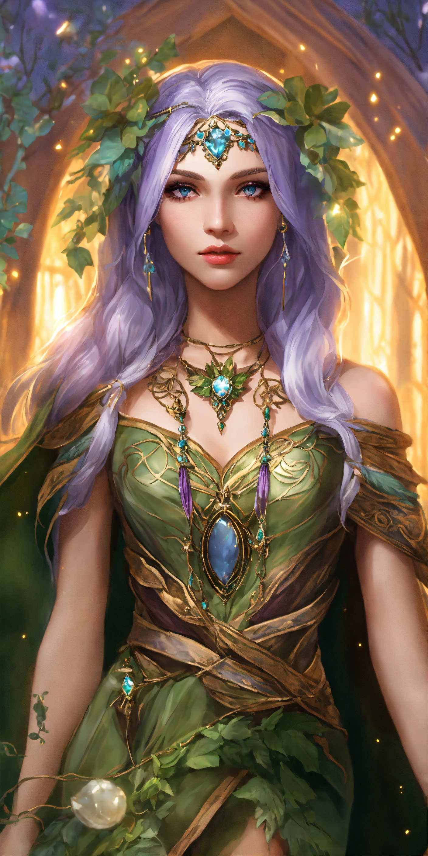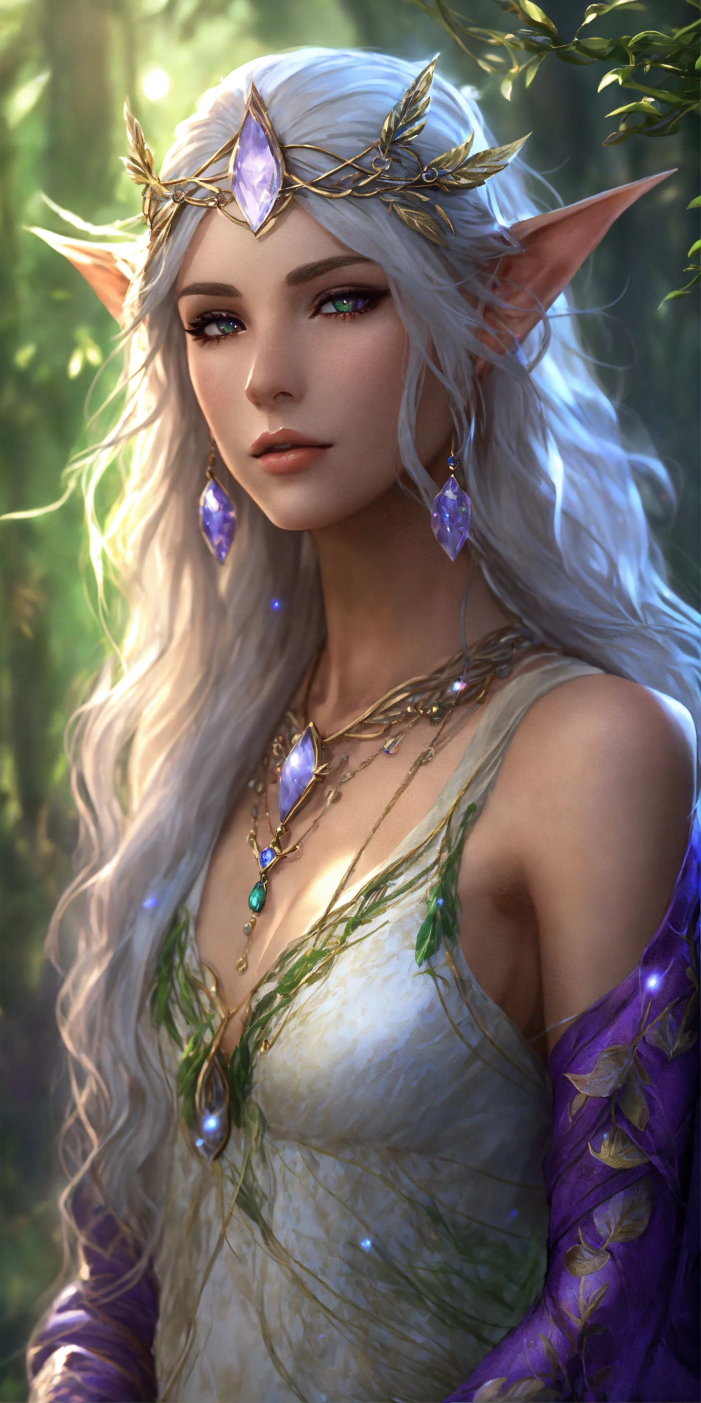 Eladrin elf of the feywild, young adult, slender and lithe bodyframe, aura of wisdom and serenity, pointed ears tapering elegantly to delicate tips, pale white complexion reminiscent of moonlight. her face is heart-shaped, with high prominent cheekbones, sculpted strong jawline, and a pert nose. her eyes are captivating, with violet purple eyes speckled with golden flecks resembling the starlit skies of the feywild, waist-length shimmering pearlescent silver hair. enchanted green jewelry and accessories made from magical plants grace her features. rings made from enchanted leaves encircle her fingers, and a necklace made of vines with a pendant carved from a feywild gemstone hangs around her neck. these accessories shimmer with an inner light, demonstrating her connection with the feywild's mystical energies, dress made of plants and feathers, 8k, realistic, full body