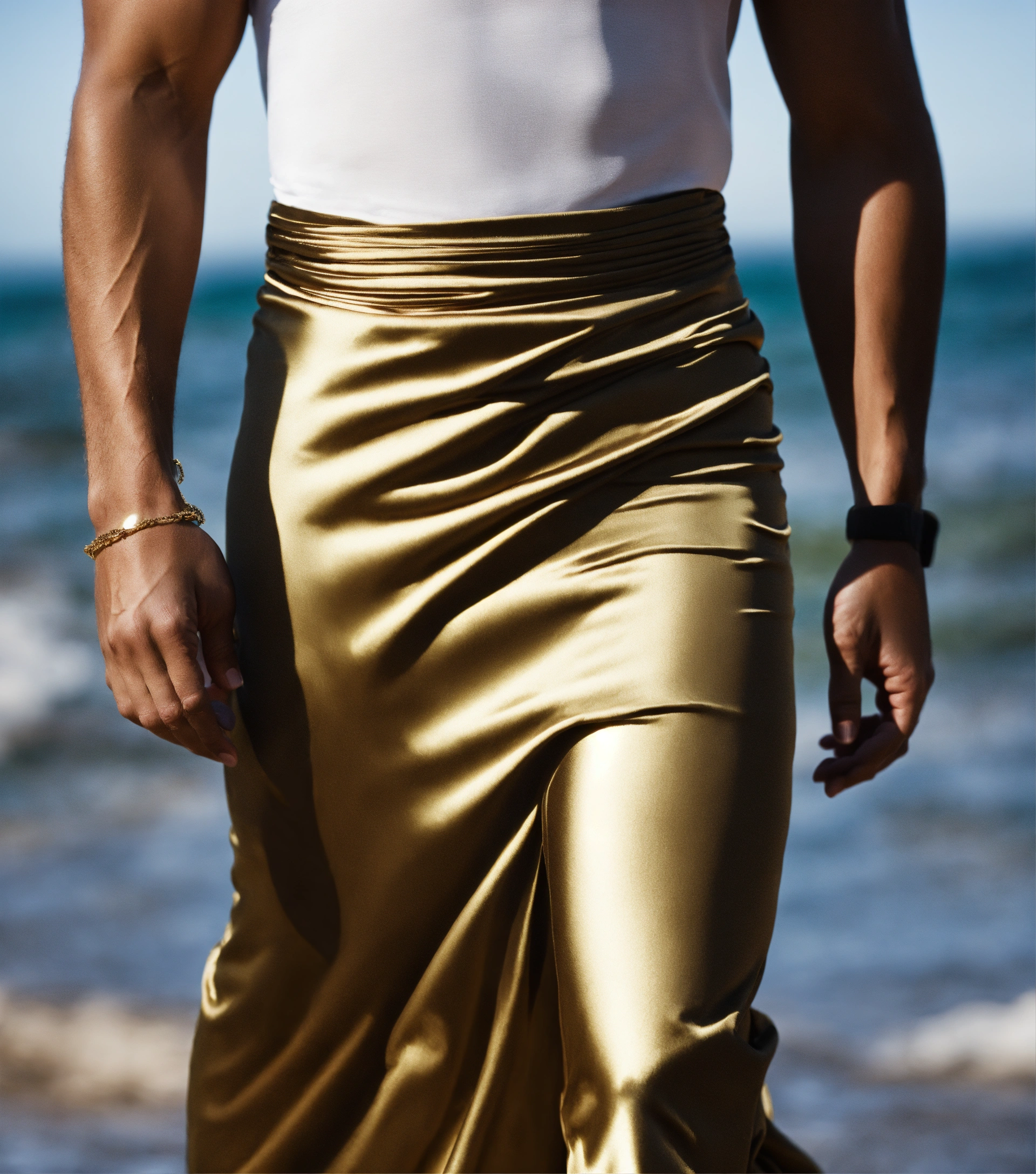 Man wearing satin shiny figure-hugging clingy pencil maxi skirt, pulled tight. close up. manly body outline straining through fabric. toned bulking godlike body. bu lge. ere ct. intimate. beach.