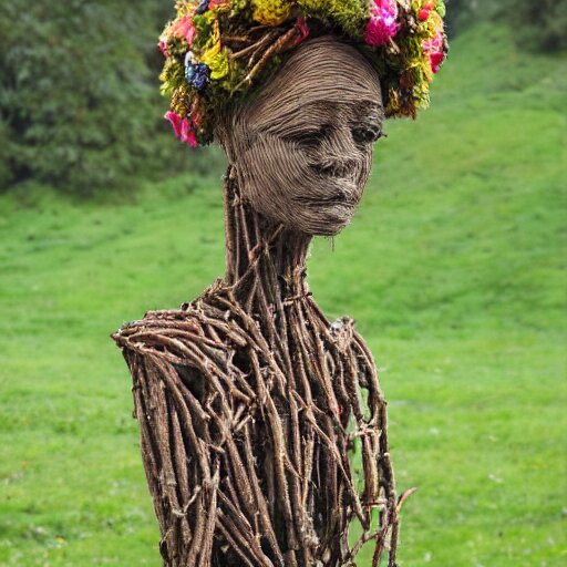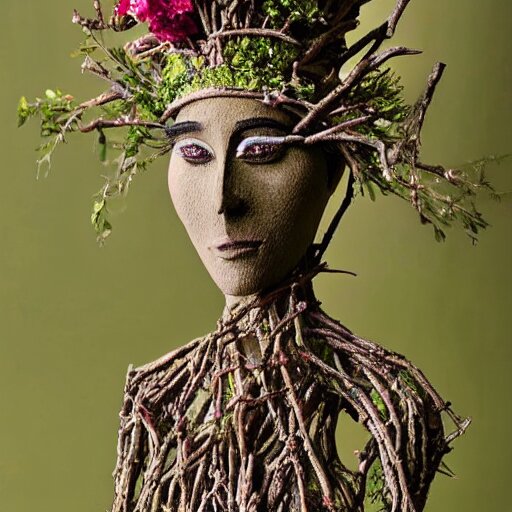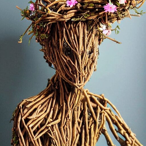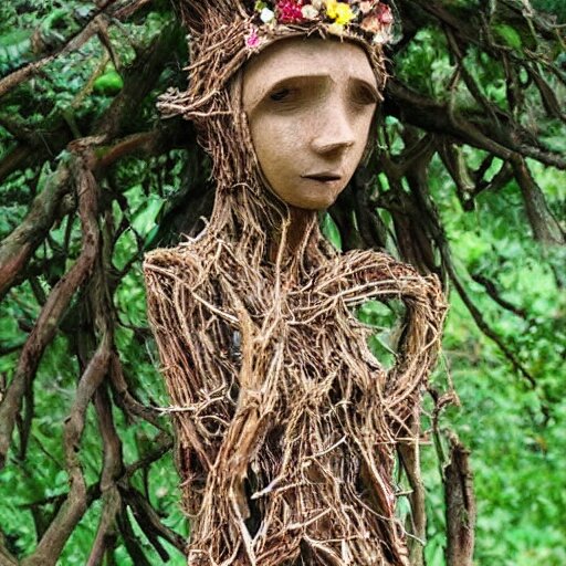 Anthropomorphic tree woman sculpture made from twigs wearing a crown made of flowers and leaves