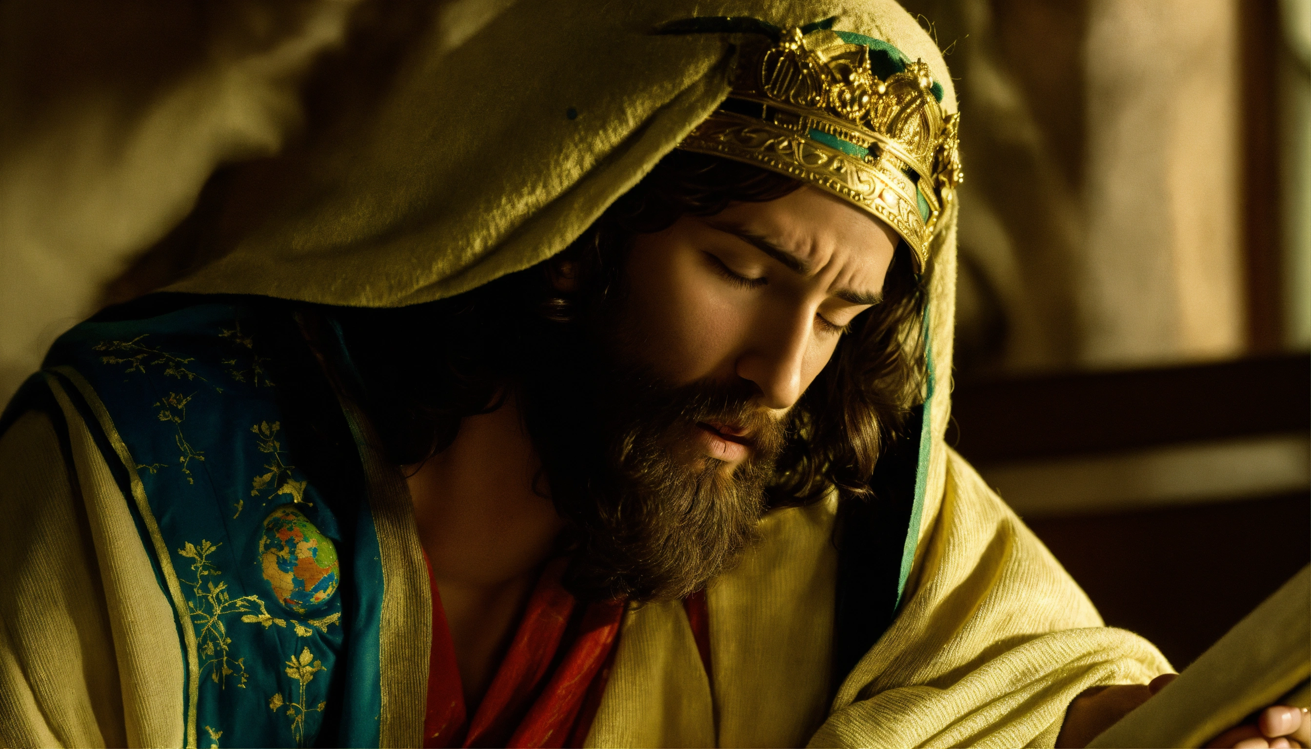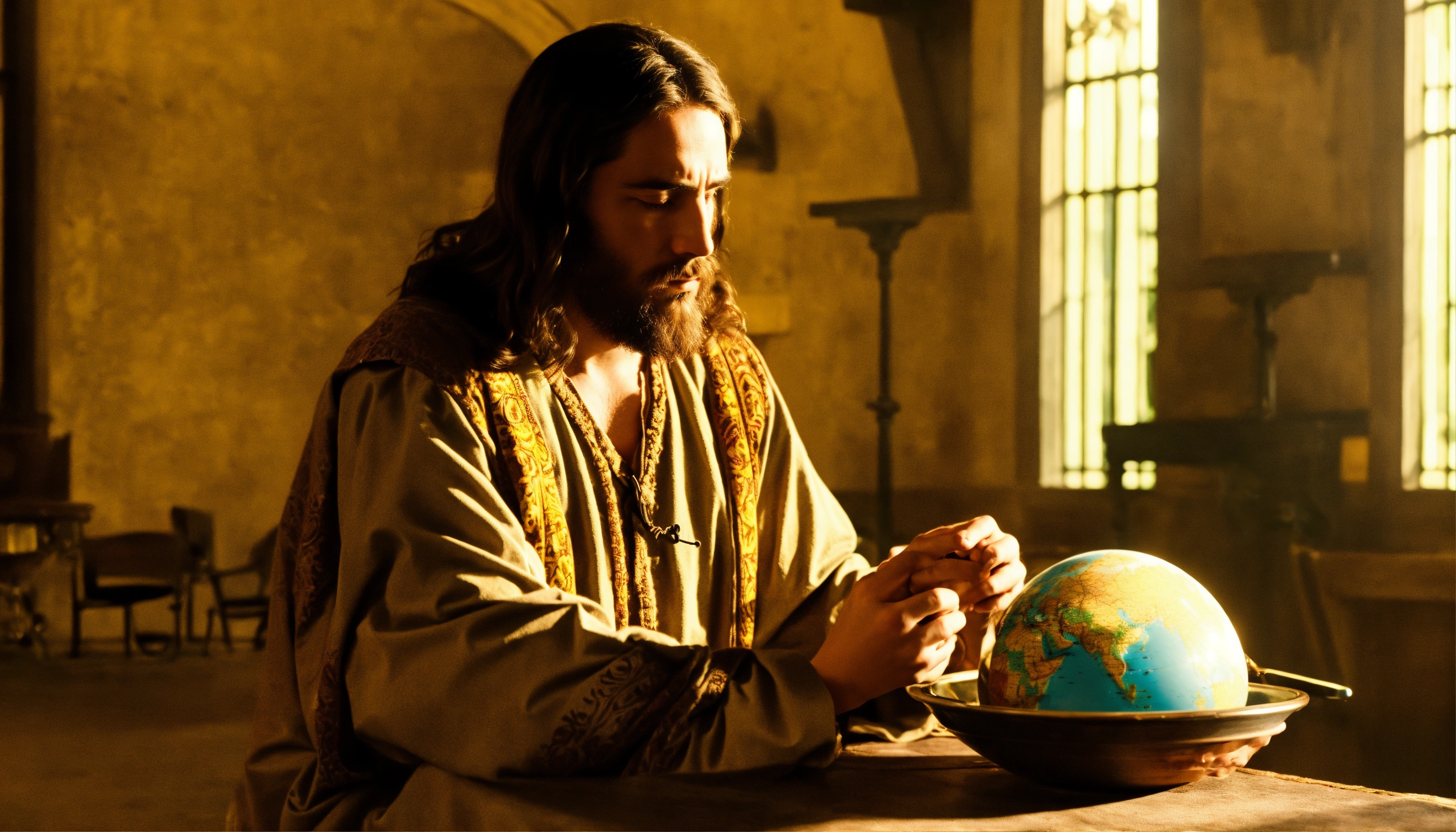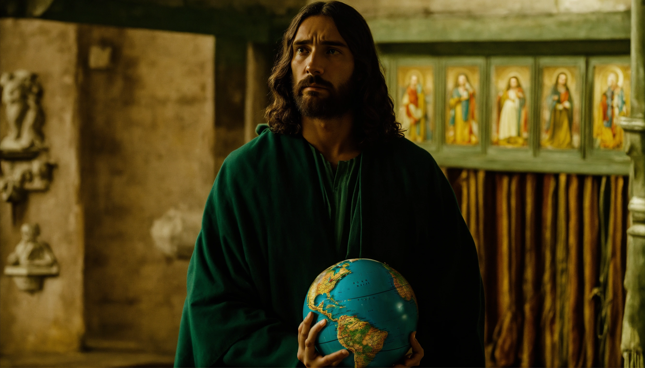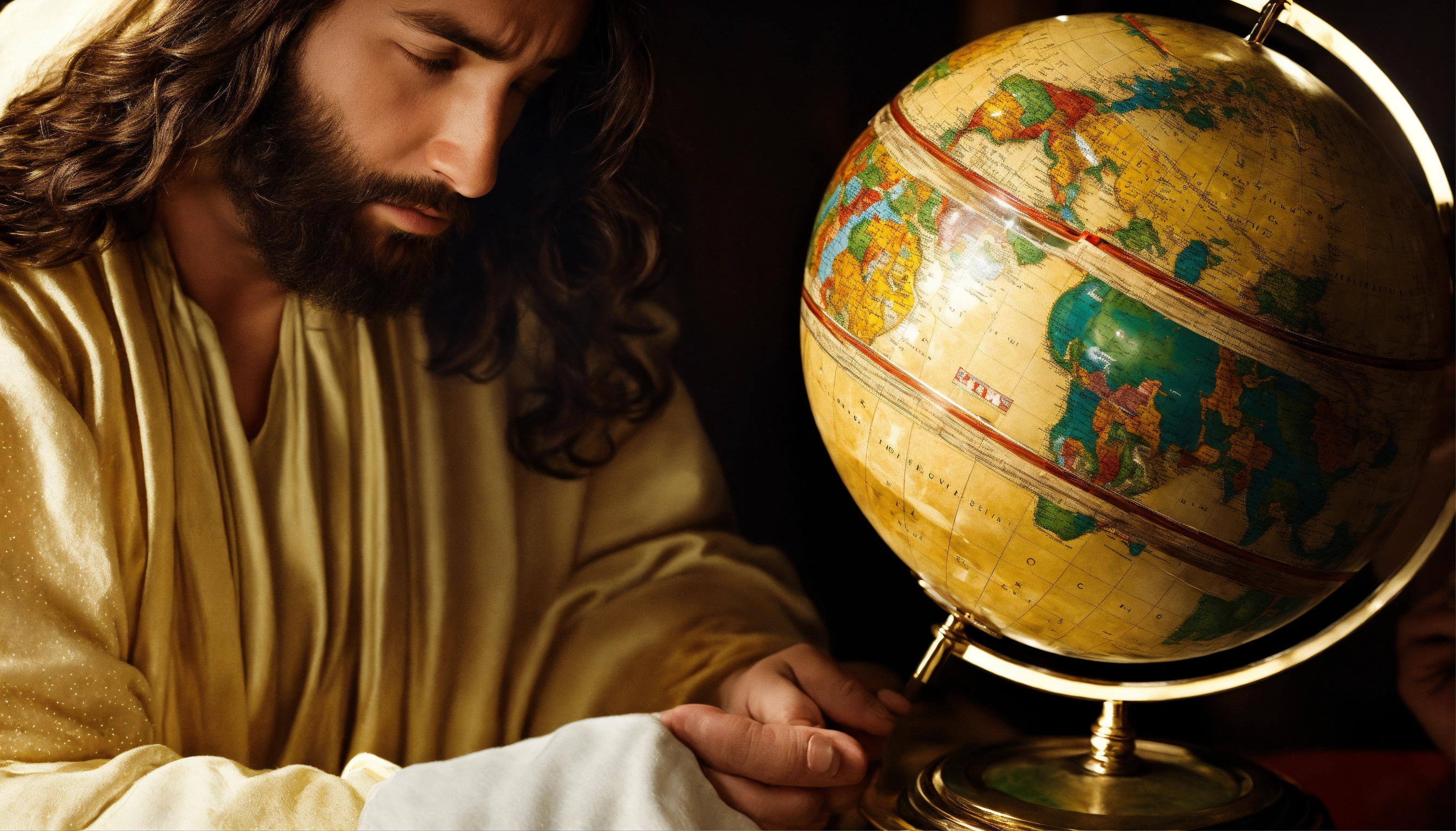 Jesus look at the globe in his hand with sad look