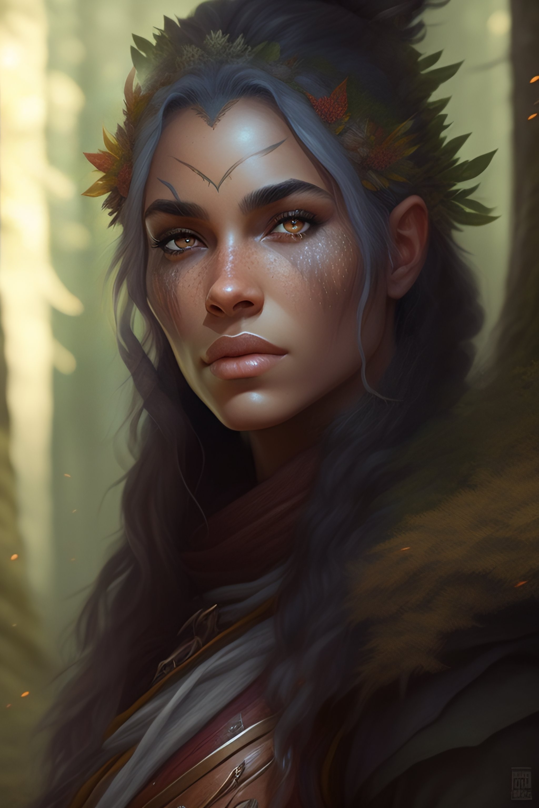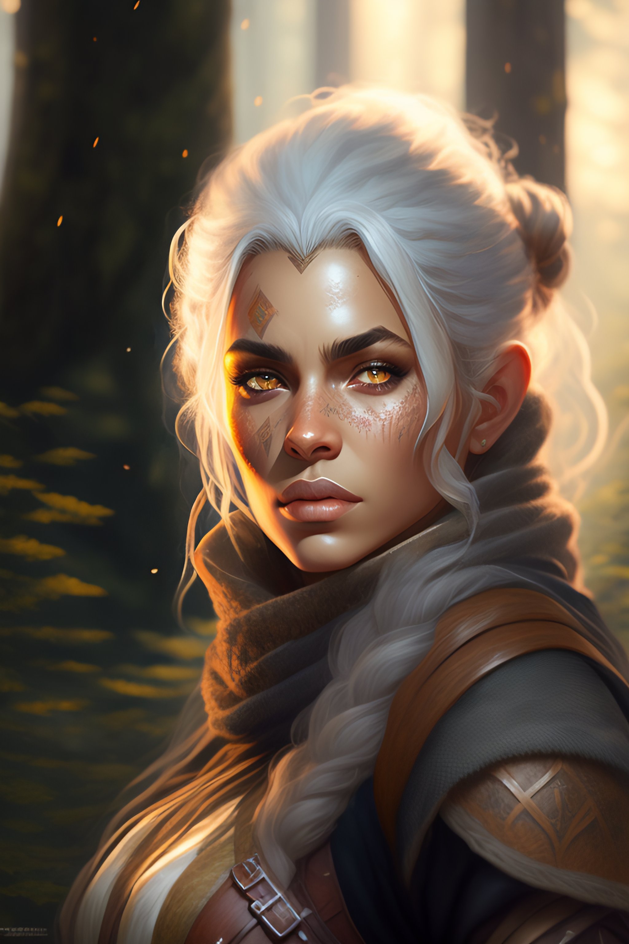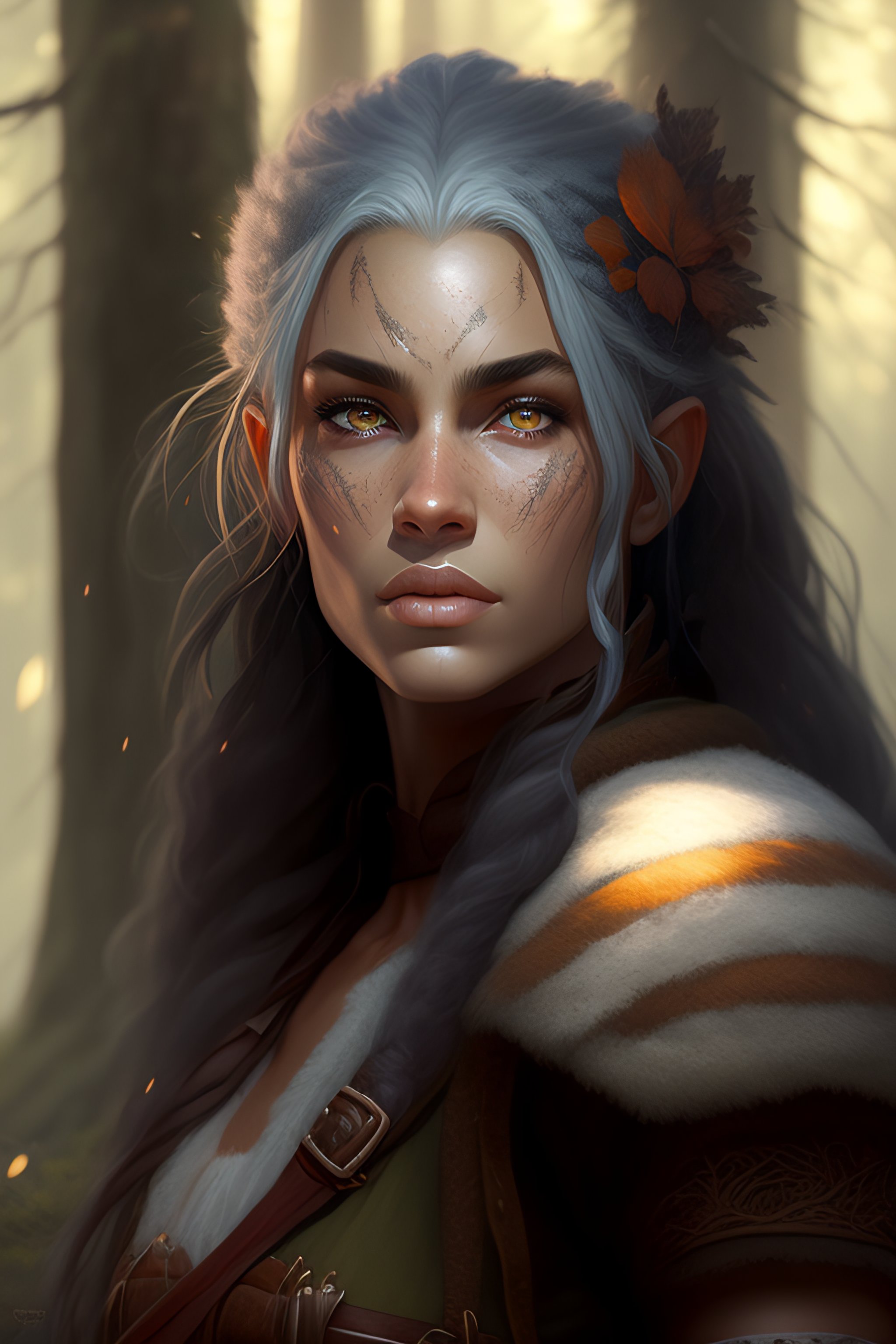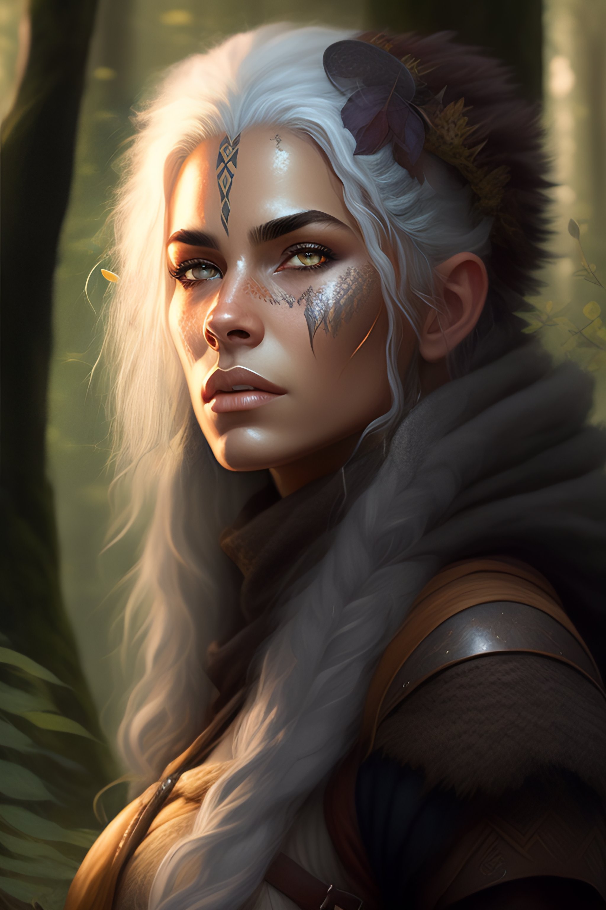 A short female, dwarf, druid, gray hair, face scars, heterochromia eyes, brown skin, summer forest, realistic, intricat, concept art, axe, by greg rutkowski