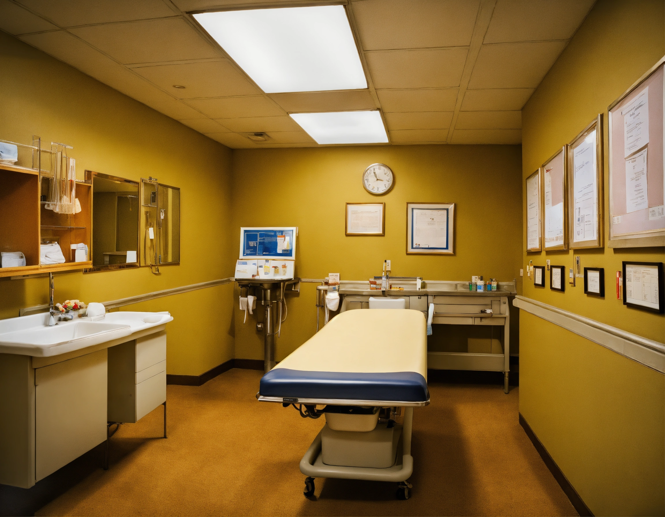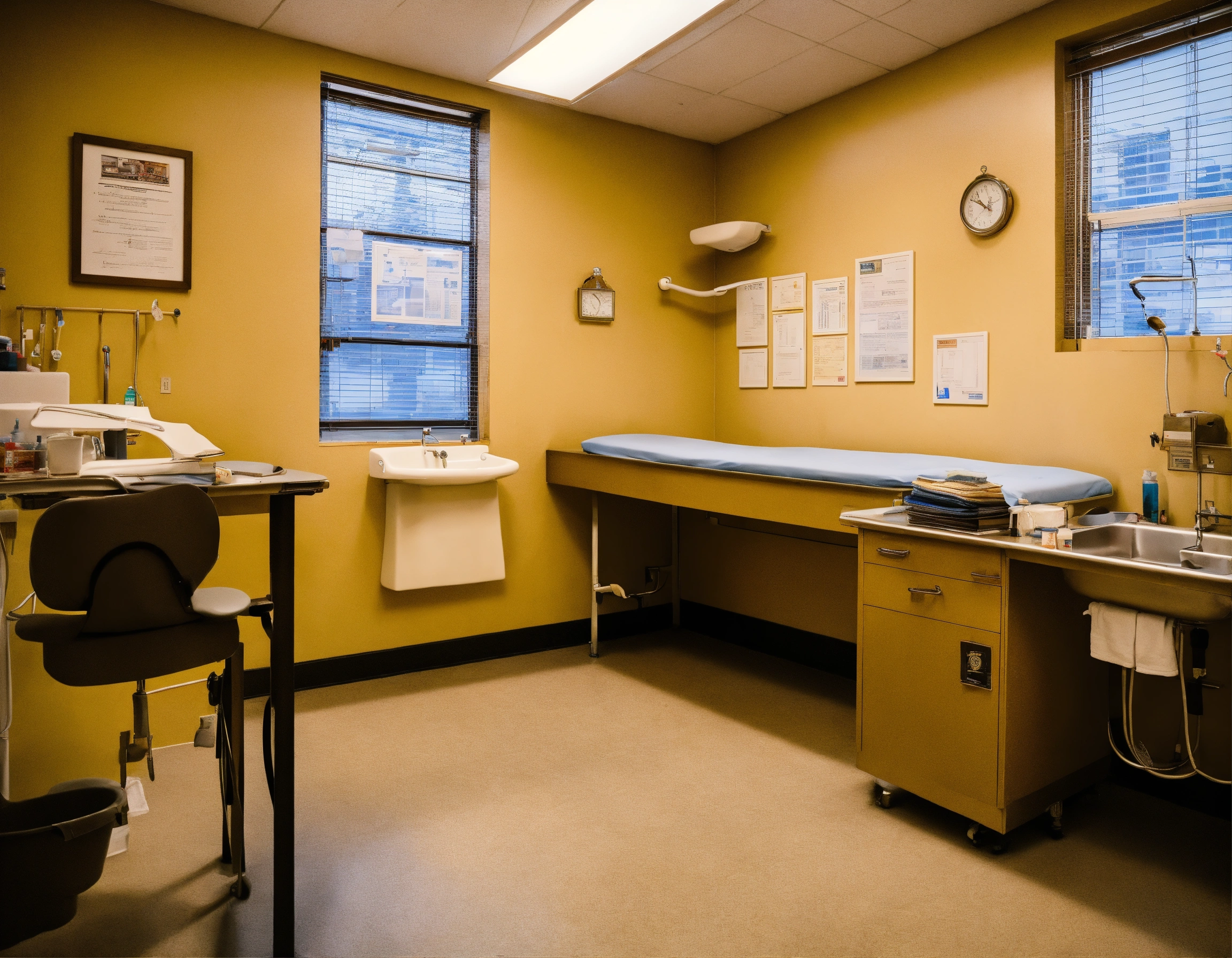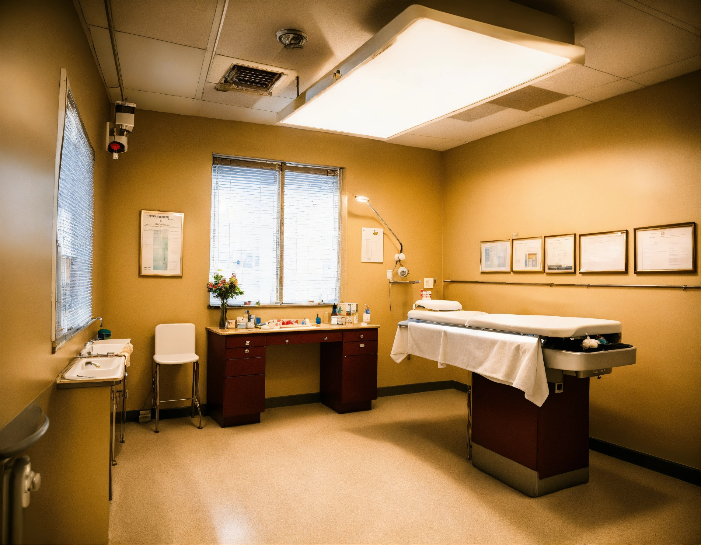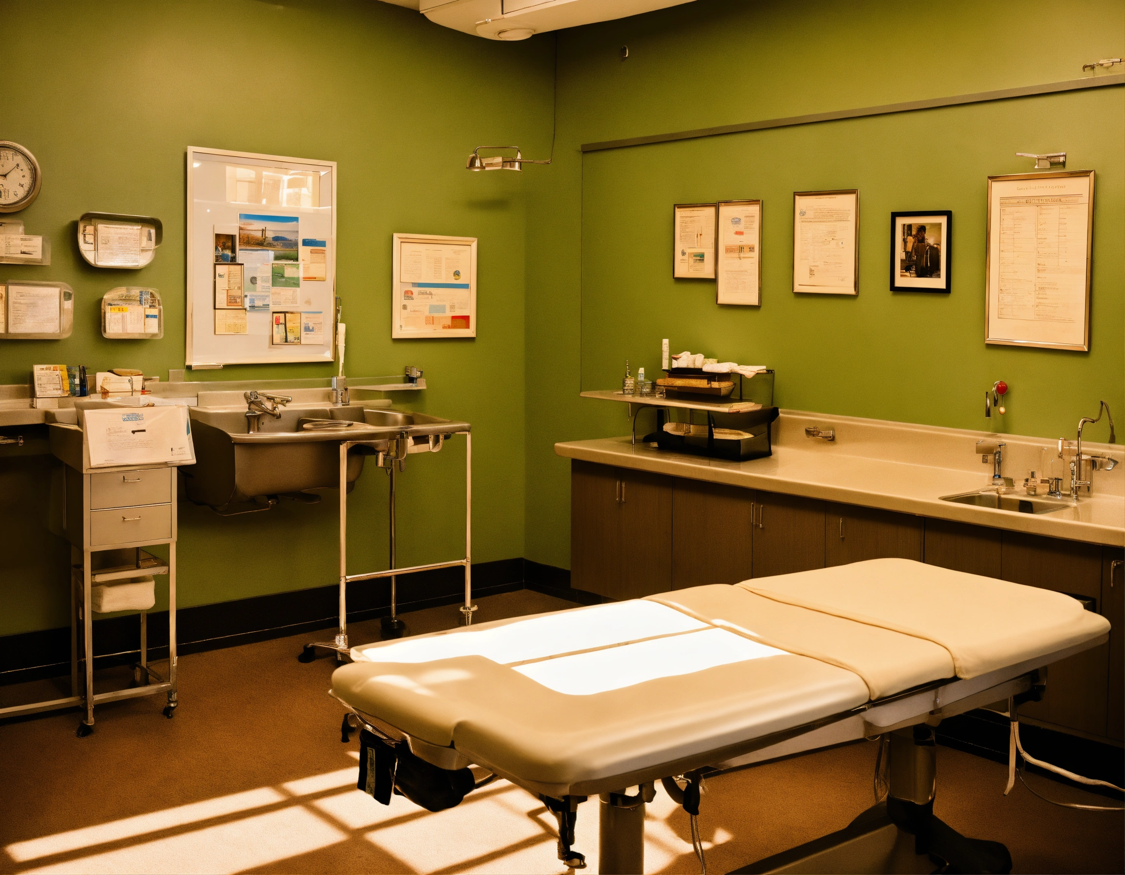 Empty doctor's examine room, photograph, friendly, nice lighting, exam table prominently featured, framed pictures on the wall, size charts, sink and cabinets