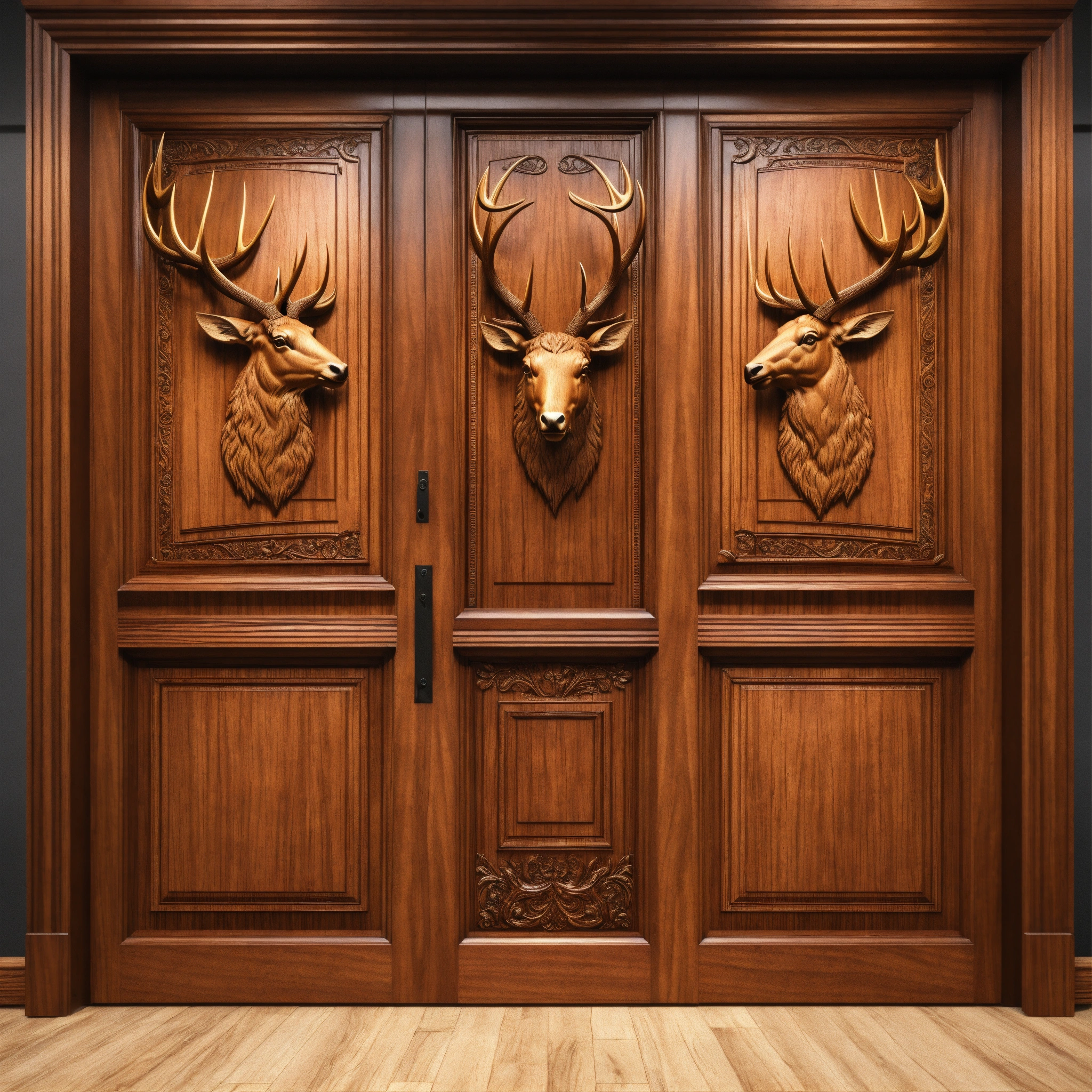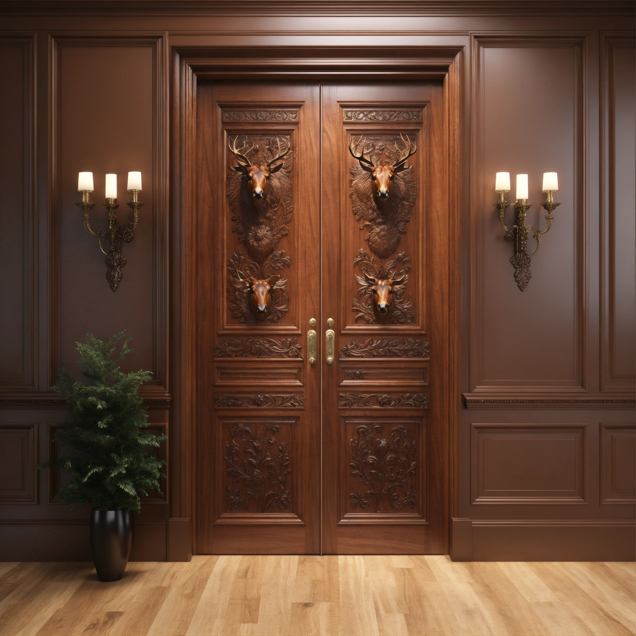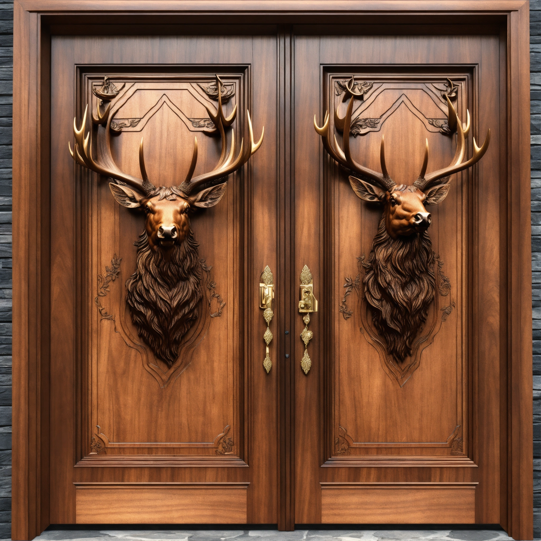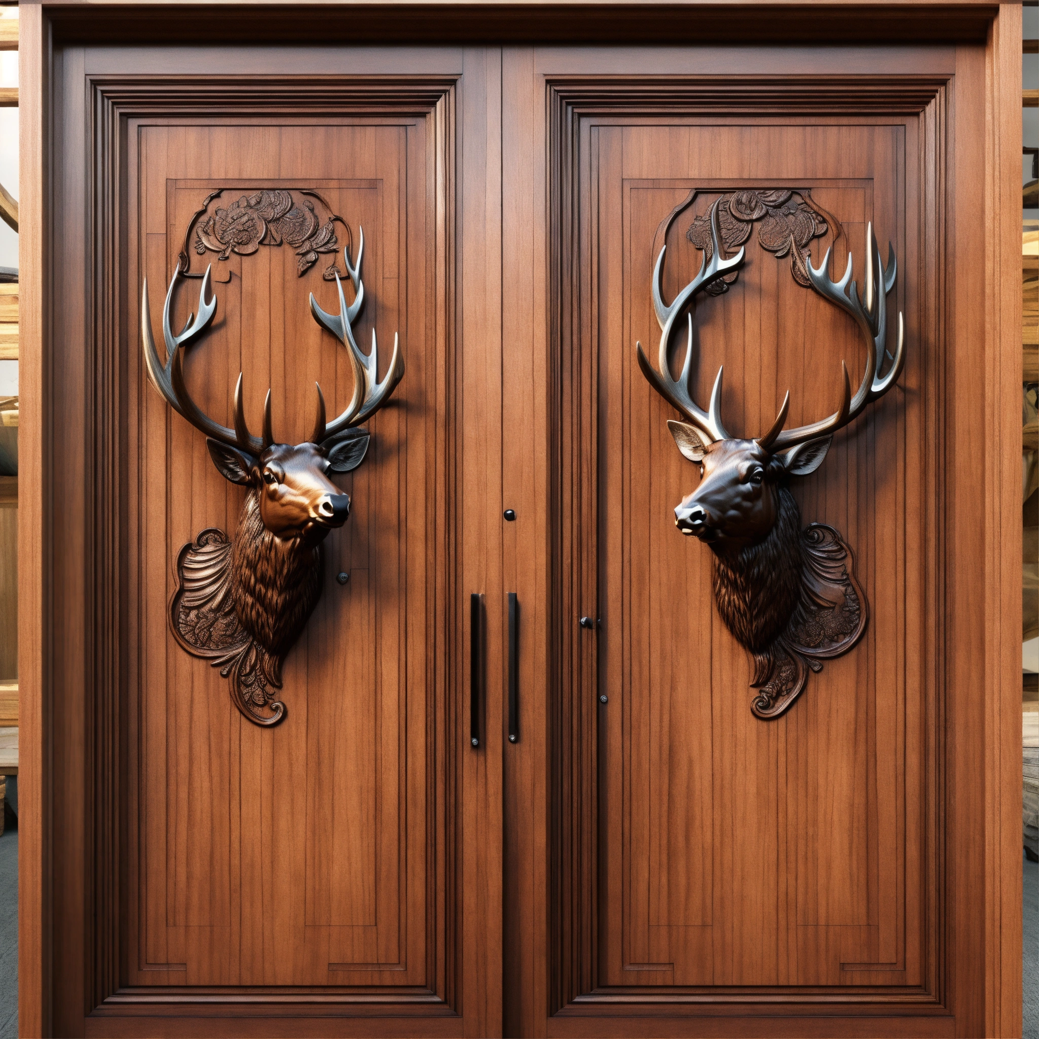 3d double doors engraved mahogany wood elk face and hyper realistic 8k