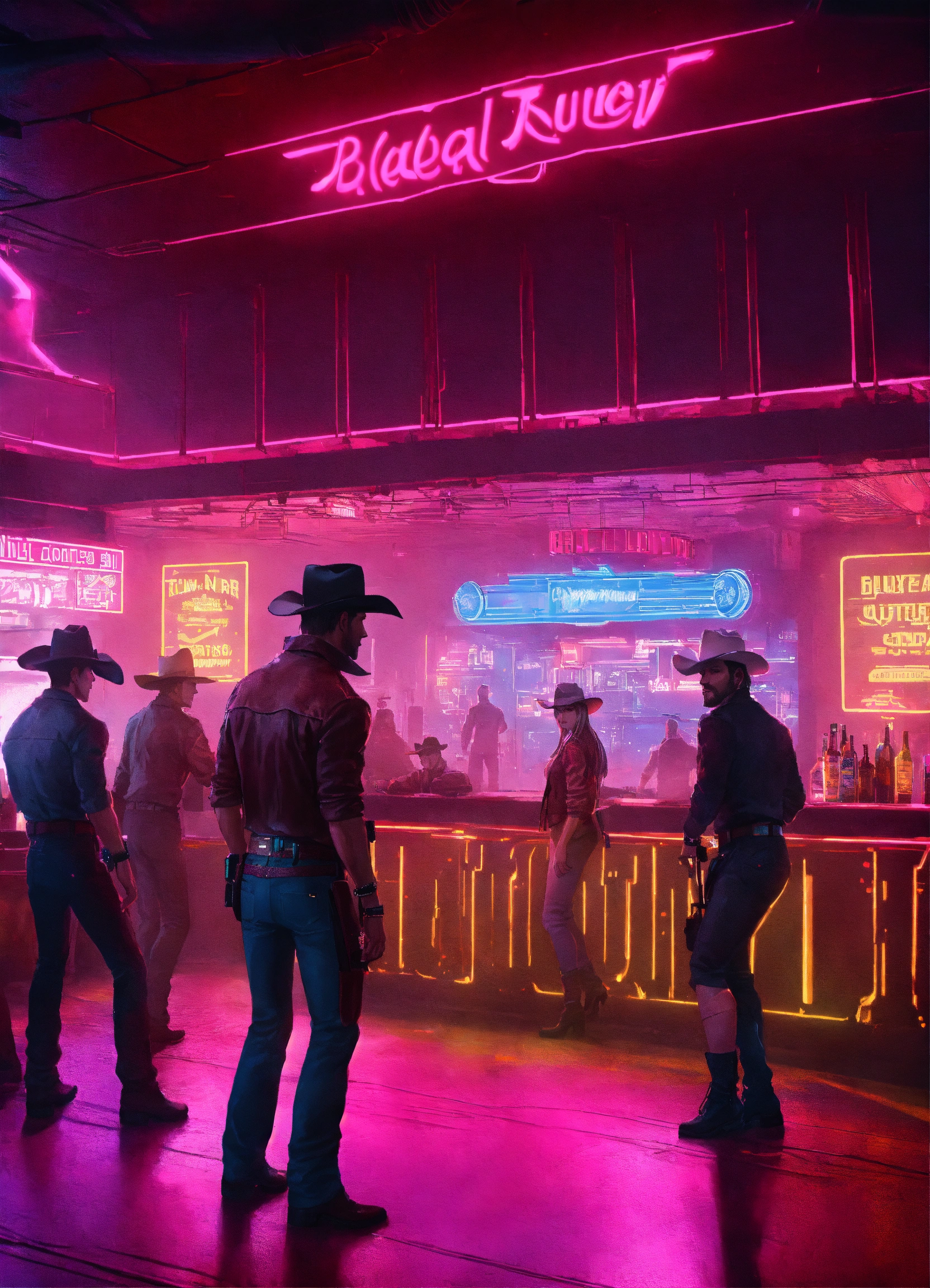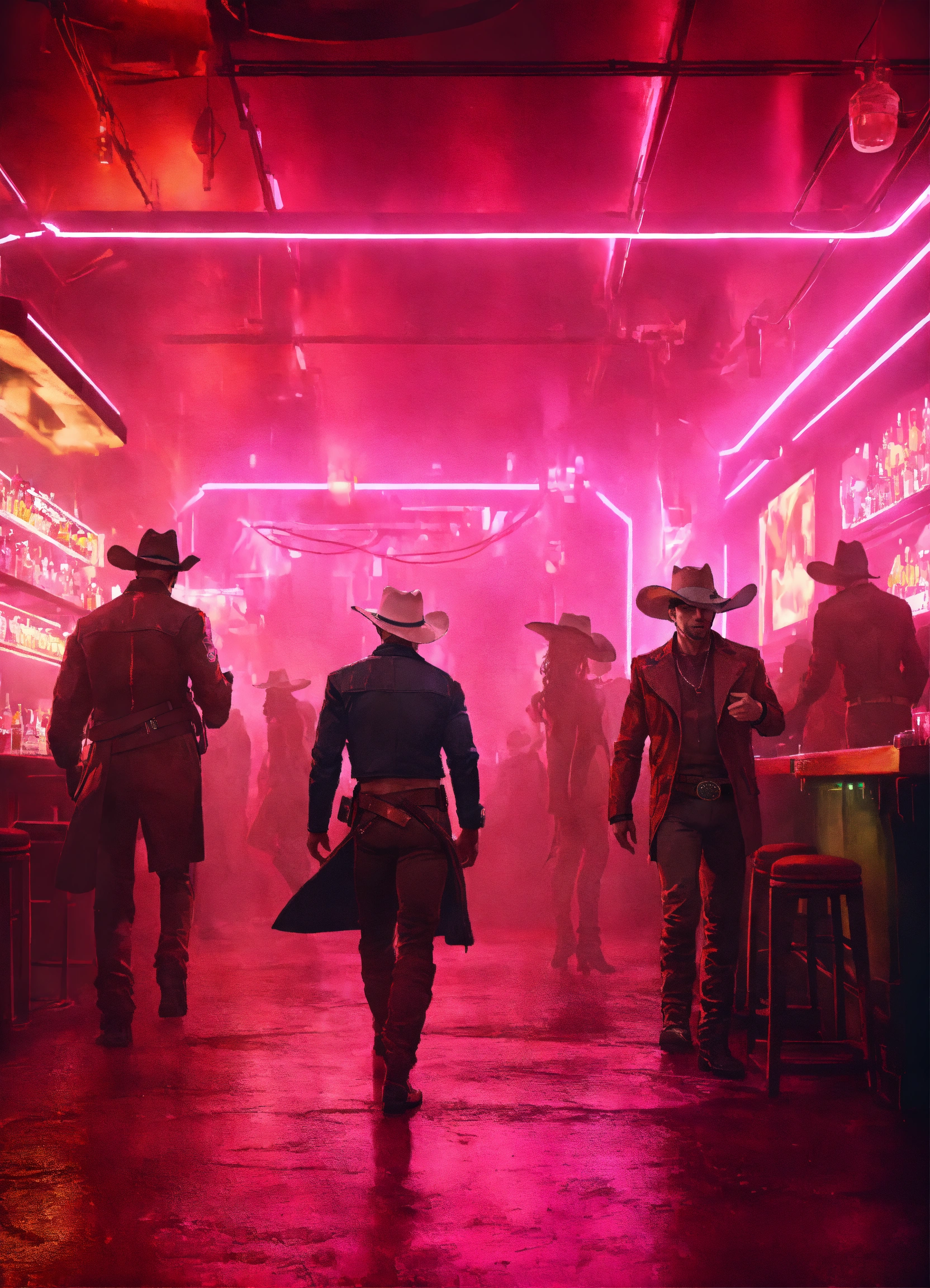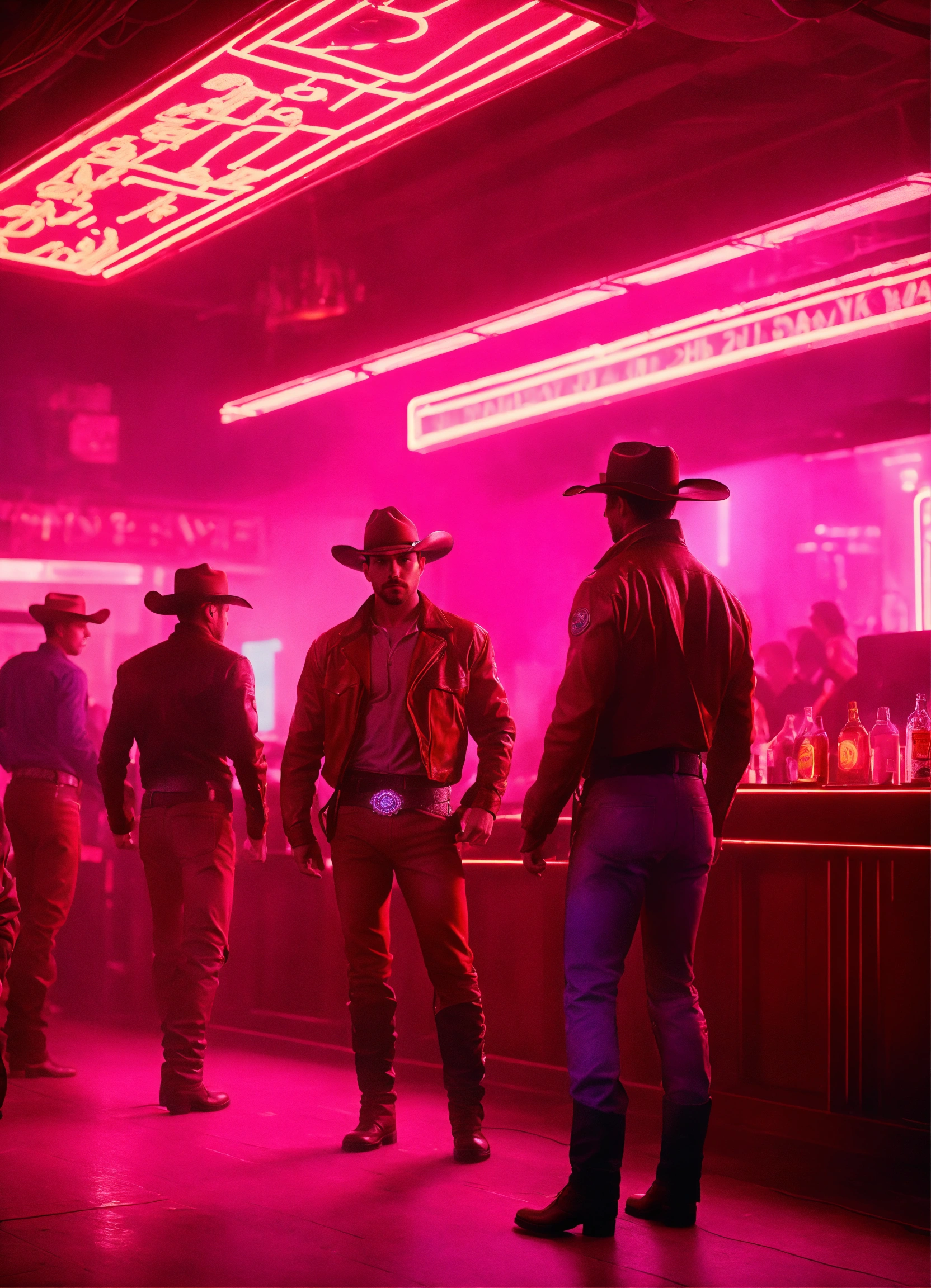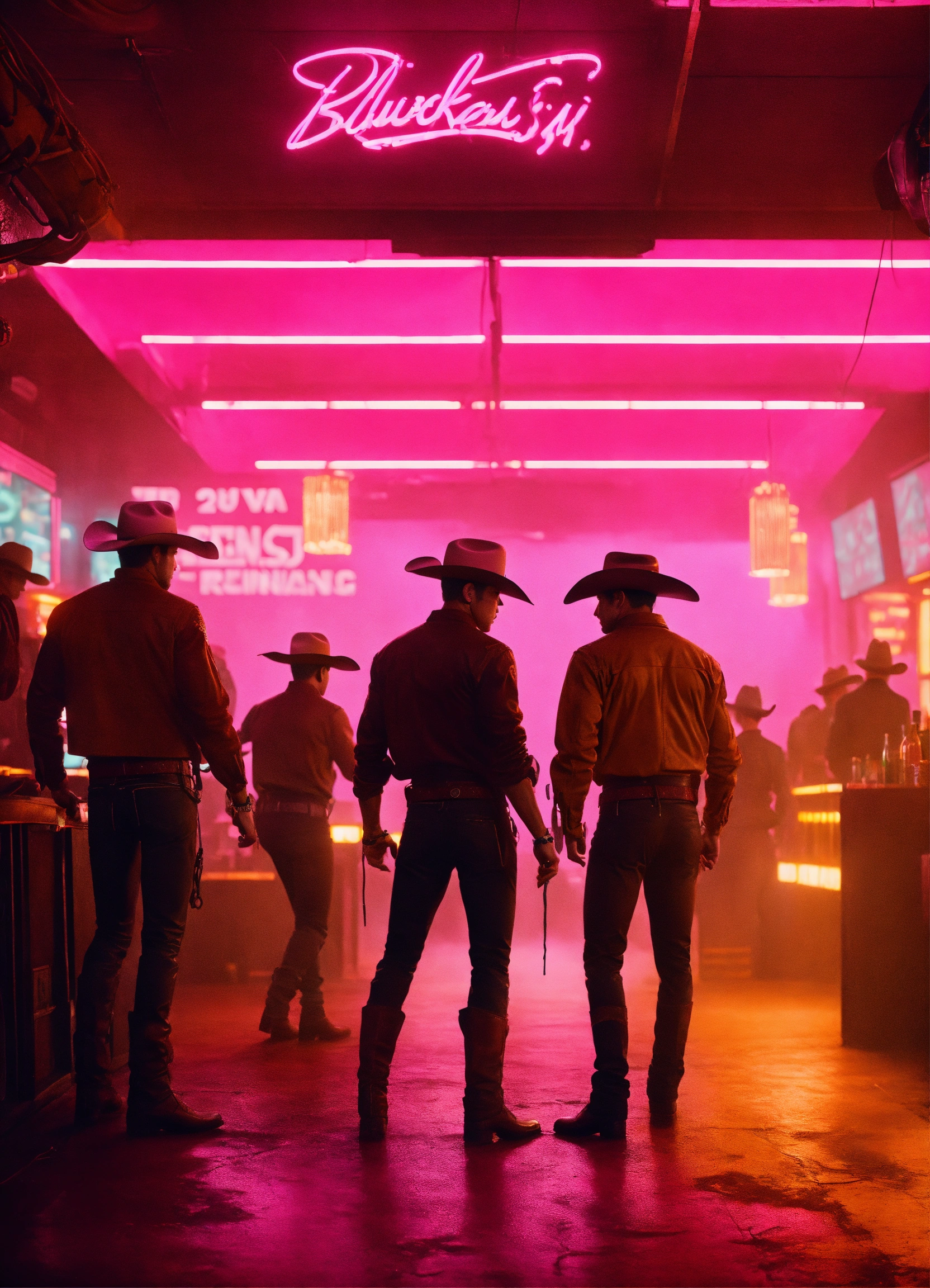Cowboys line-dancing in a cyberpunk bar, they wear light pink cowboy hats and light pink belt buckles, blade runner 2049, unreal engine