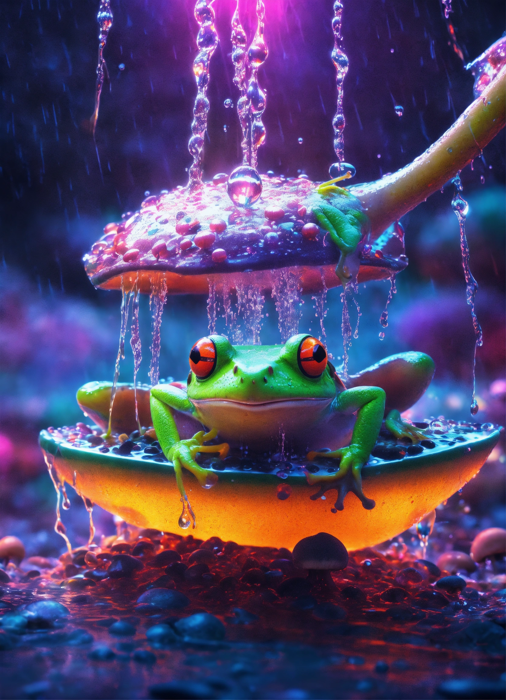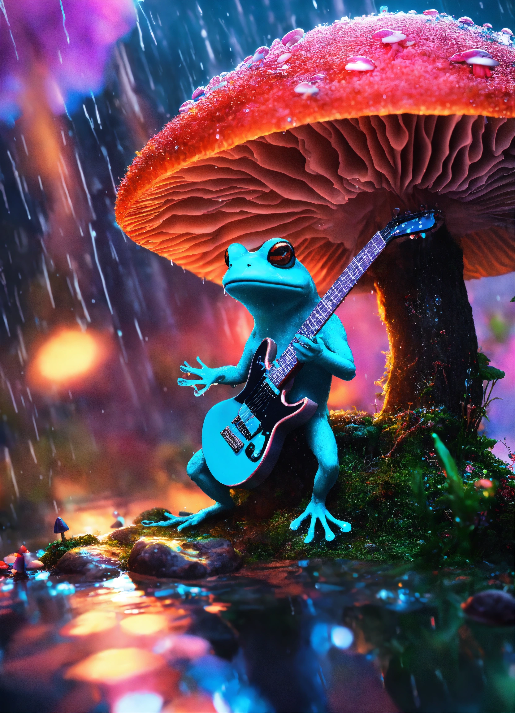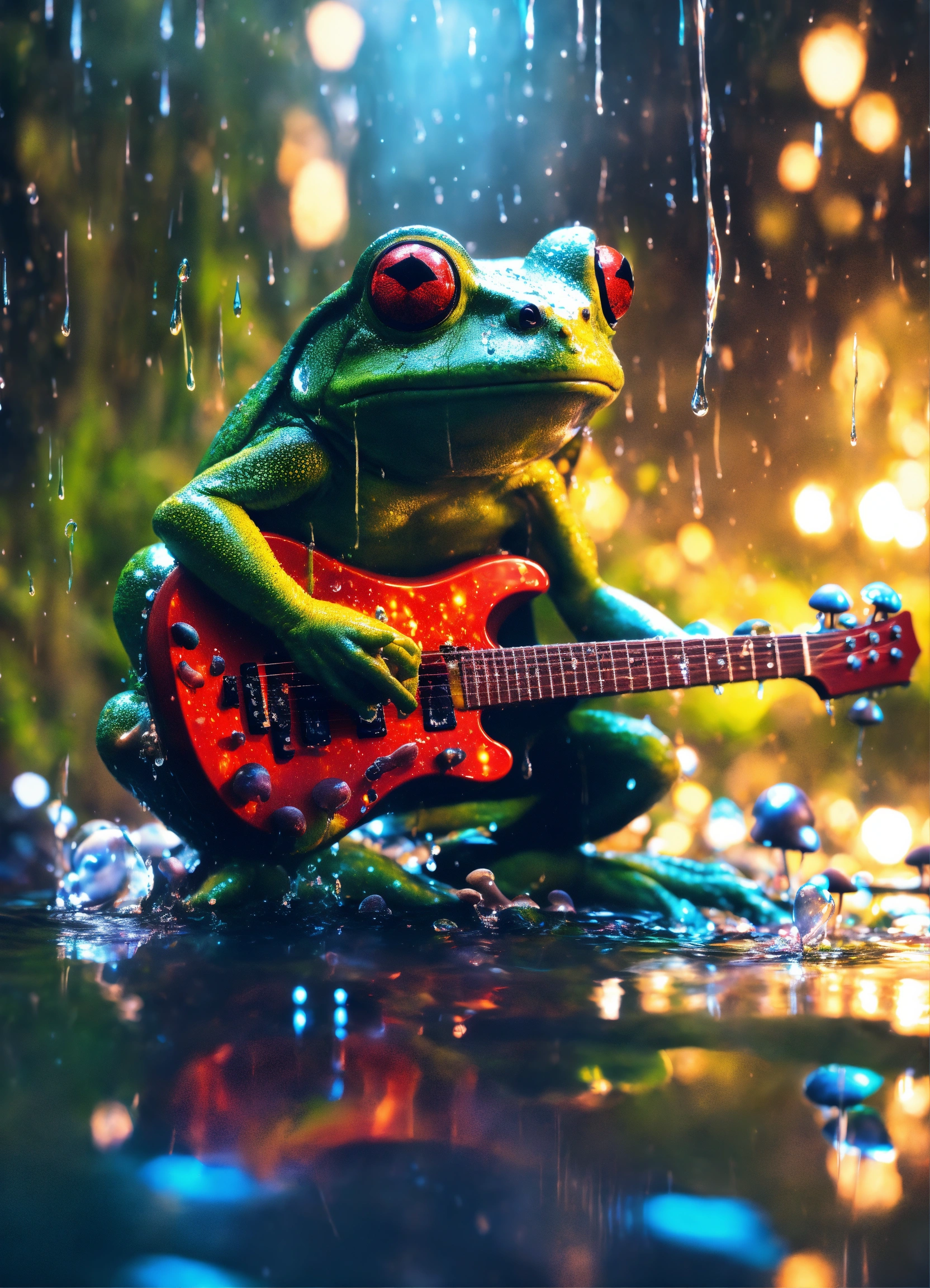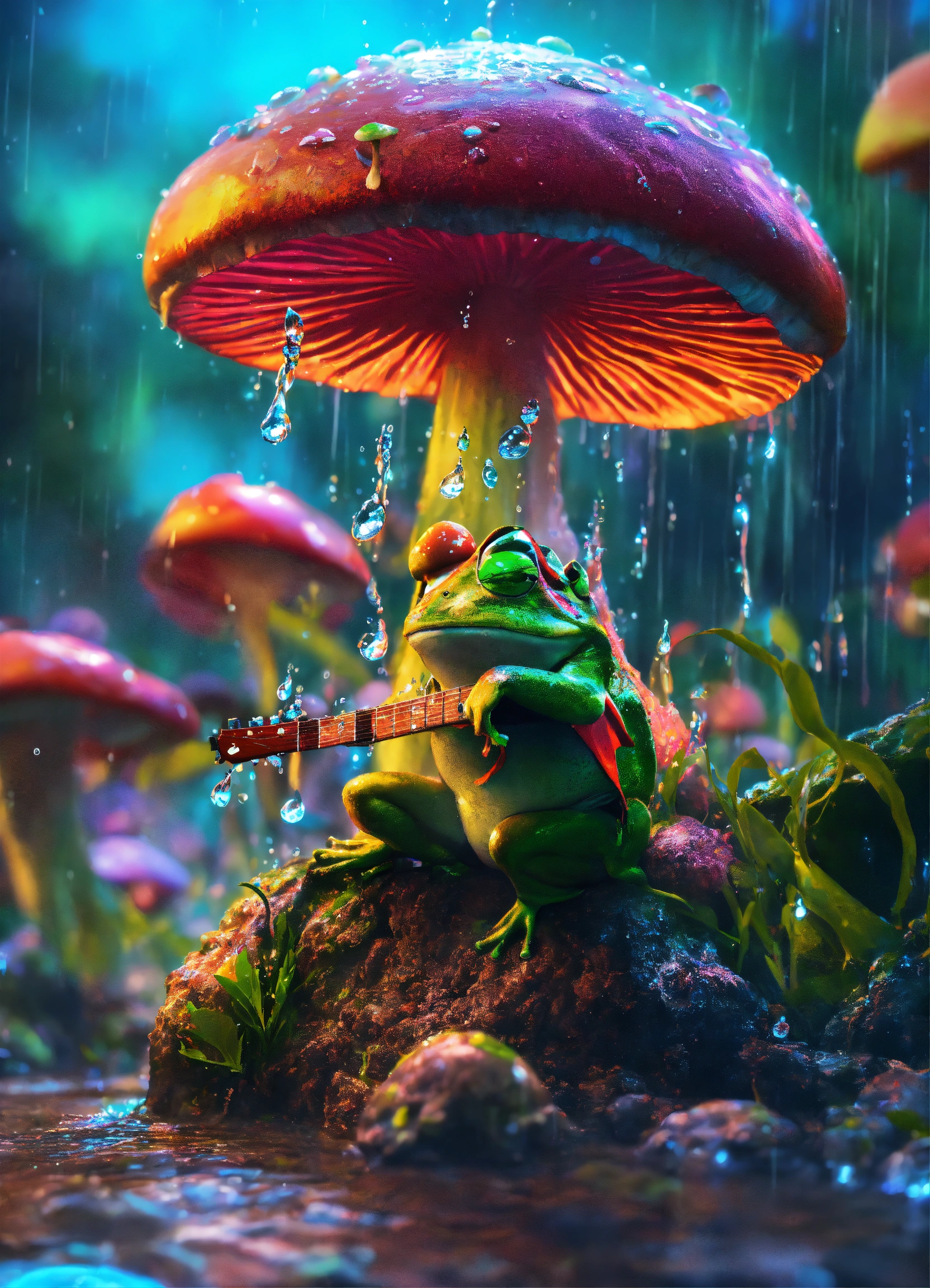 Fantasy frogcore electronic music, psytrance, rock, guitar, full energy, album cover, psychedelic, 8k, 3d, concept art, behance hd, action shot, mushrooms, the rain, splash water, water drop, show atmosphere